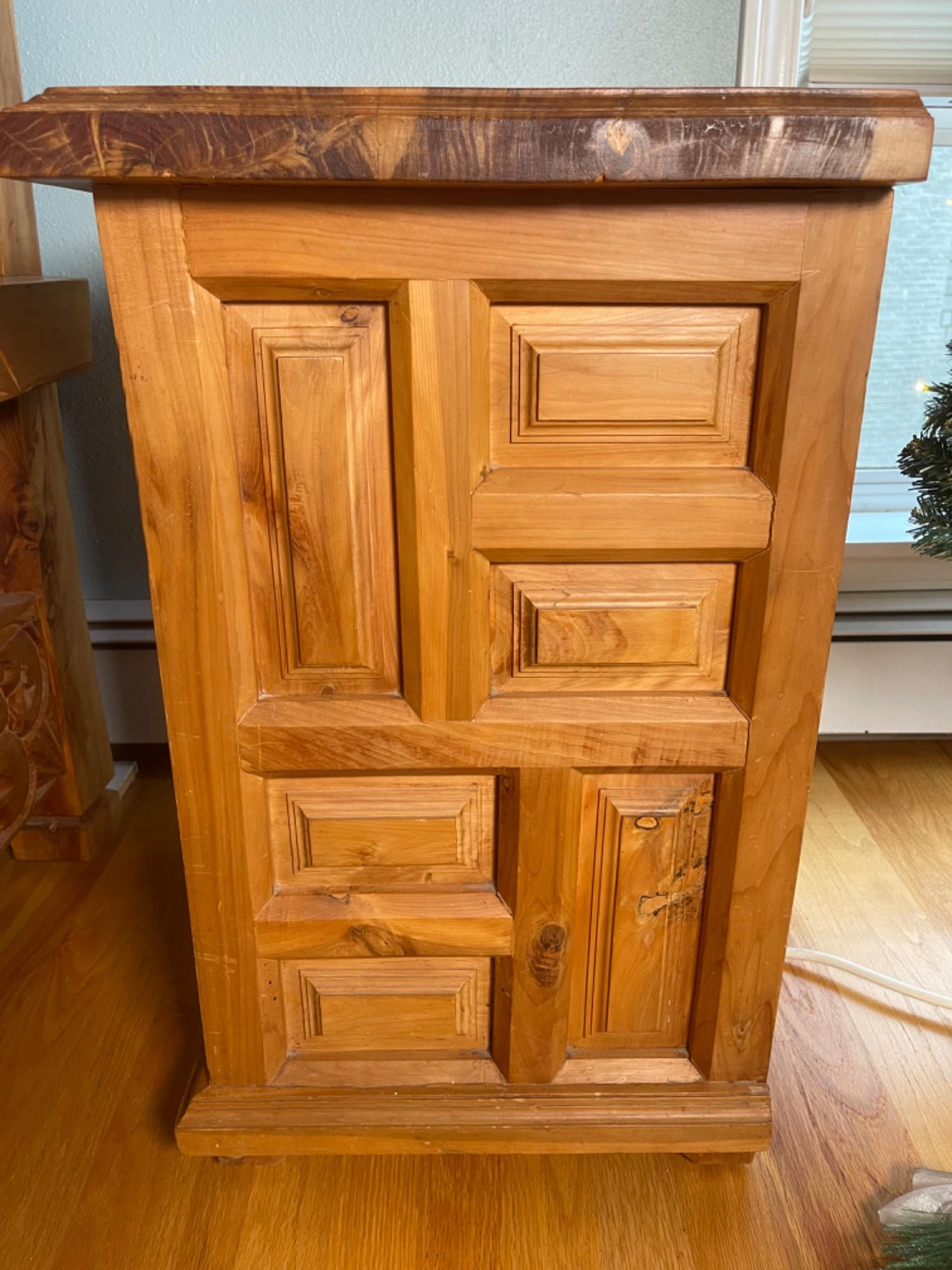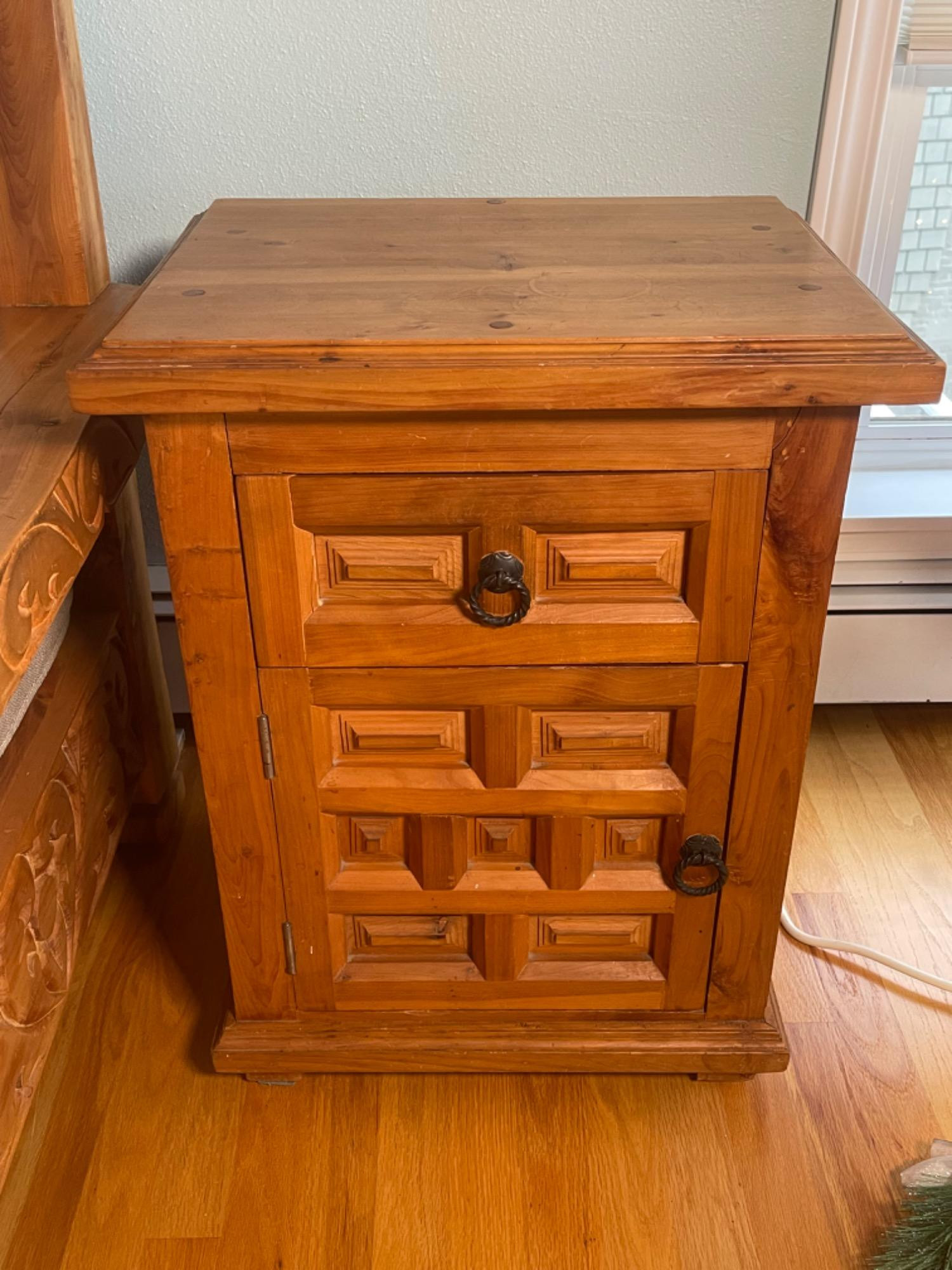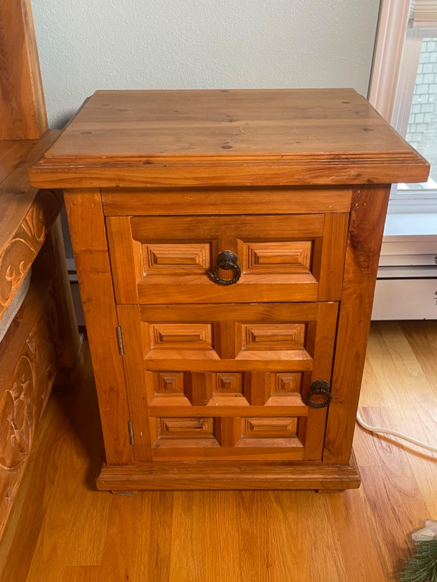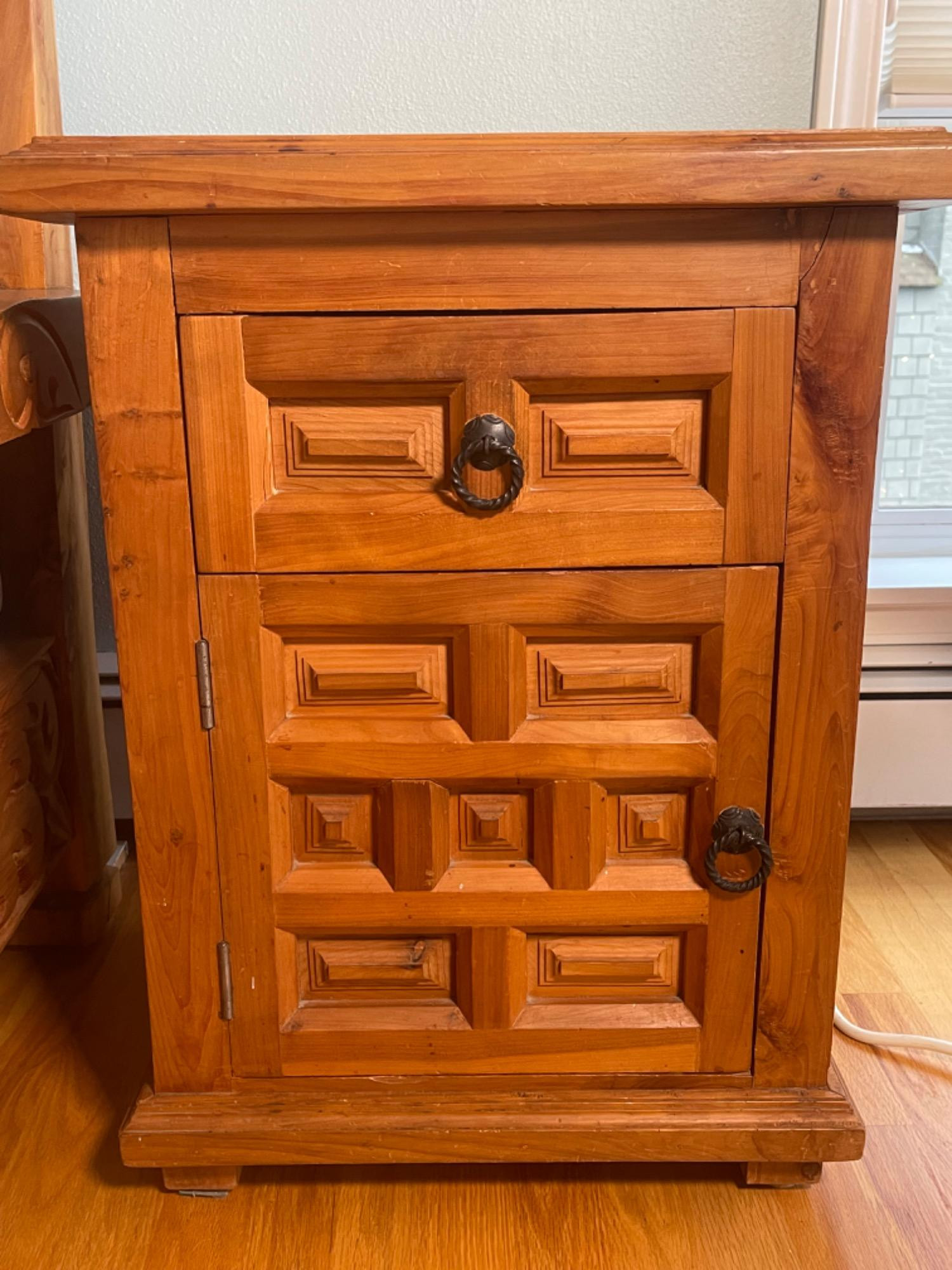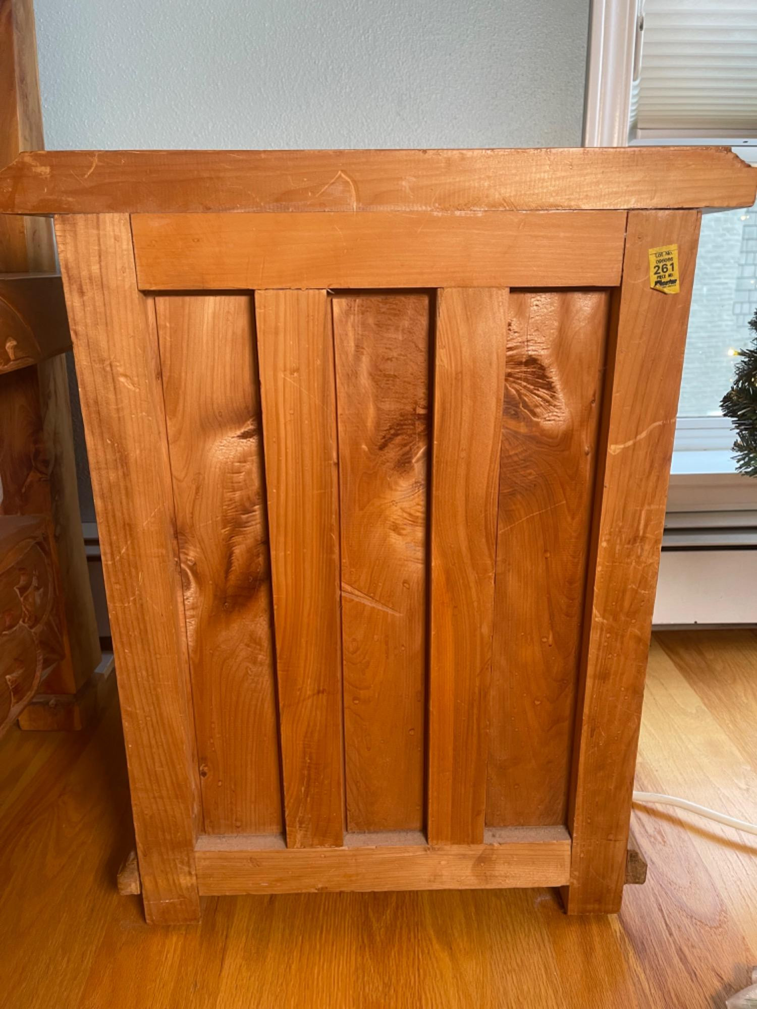 Vintage Hand Carved Solid Wood Side Table From Mexico This piece is solid wood so it is very HEAVY. You will need to make sure to bring the proper personnel and tools to safely remove this from property. Wood has multiple scratches, scuffs and stains, but is holding together beautifully.