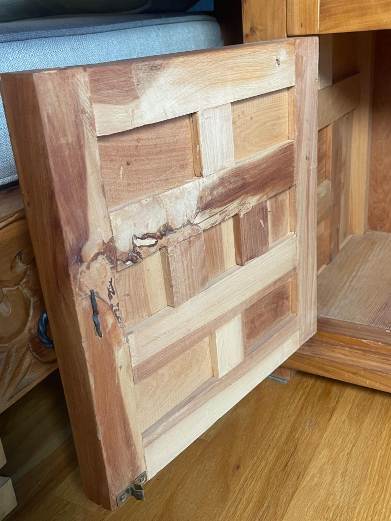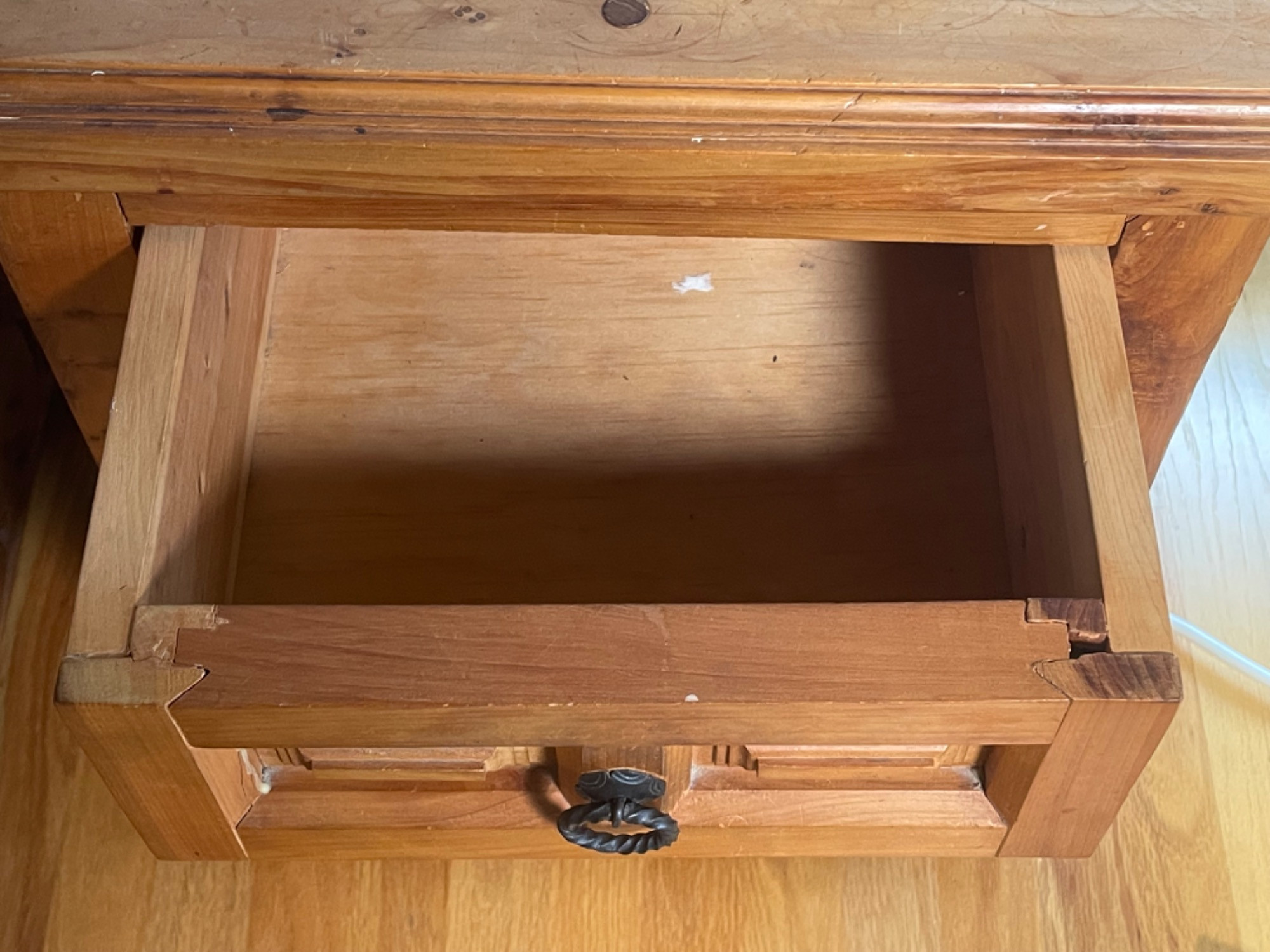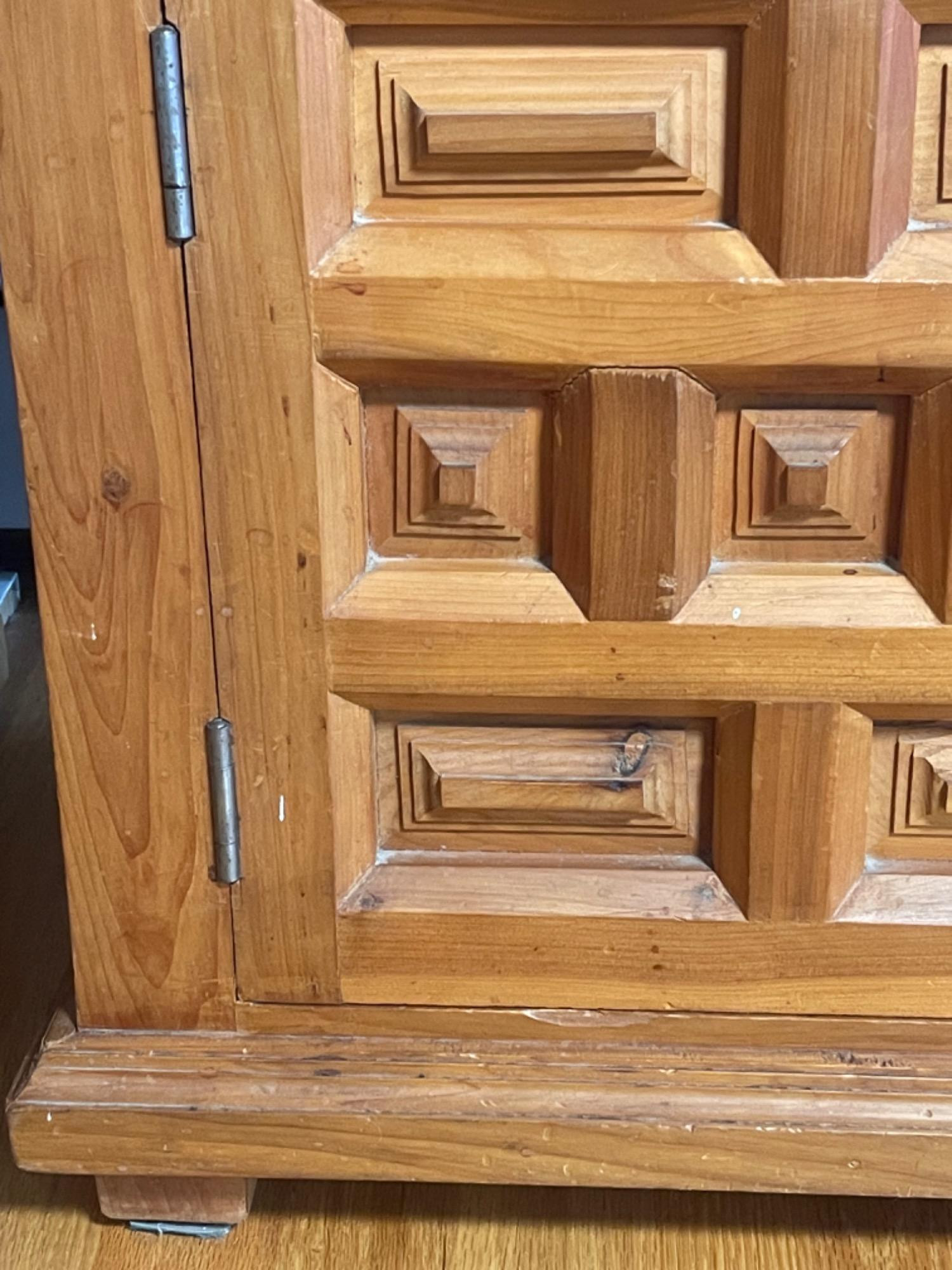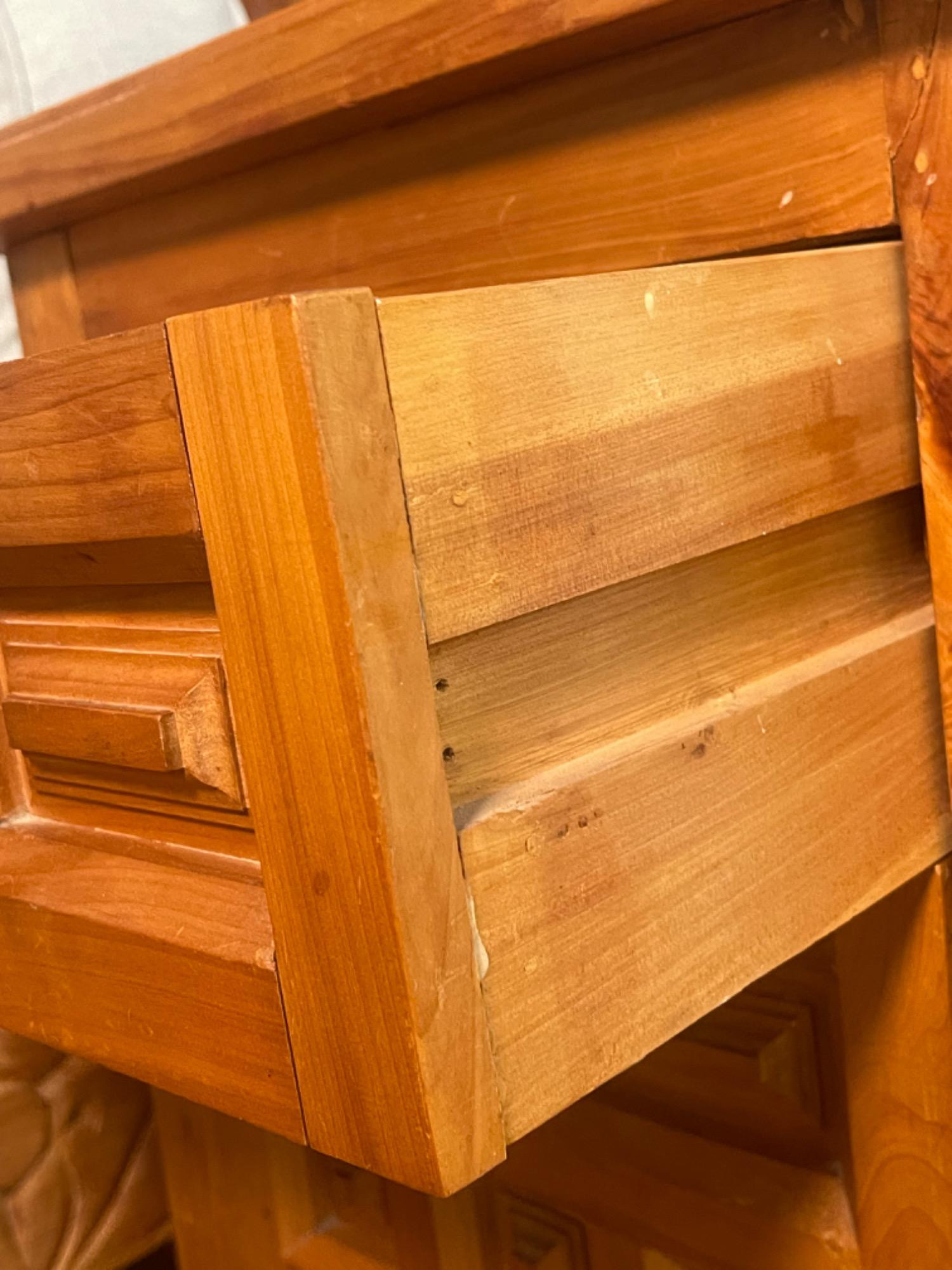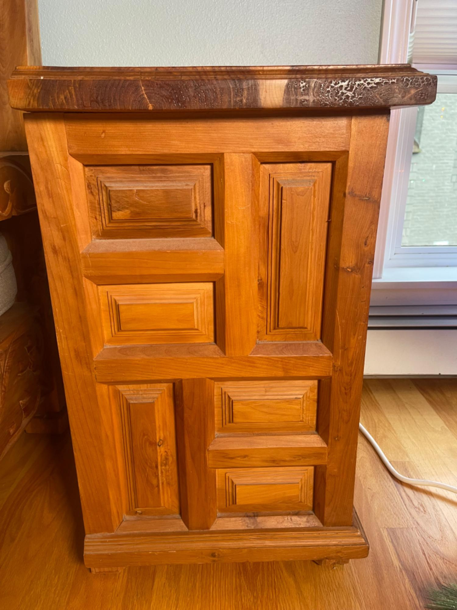 Vintage Hand Carved Solid Wood Side Table From Mexico This piece is solid wood so it is very HEAVY. You will need to make sure to bring the proper personnel and tools to safely remove this from property. Wood has multiple scratches, scuffs and stains, but is holding together beautifully.