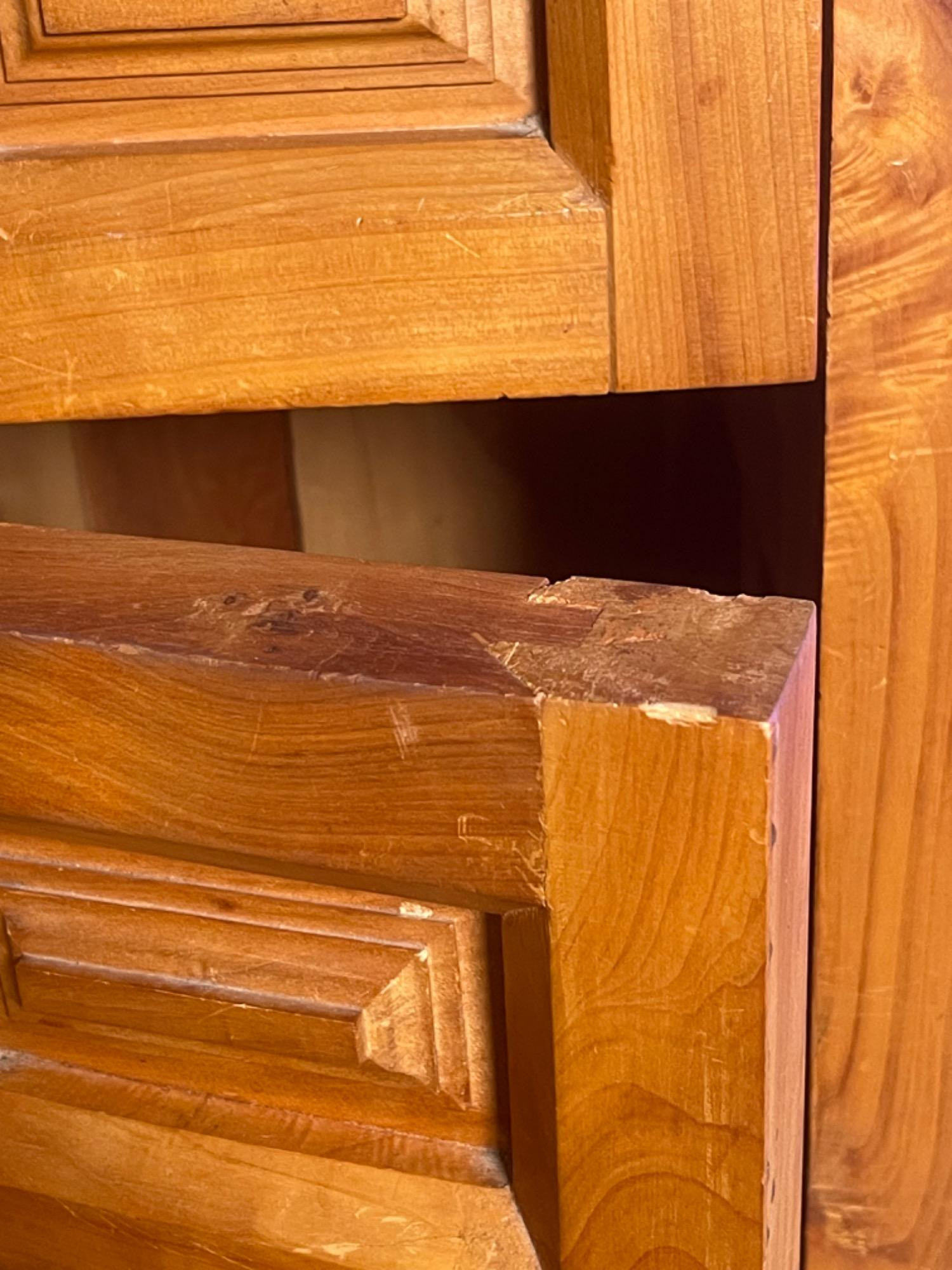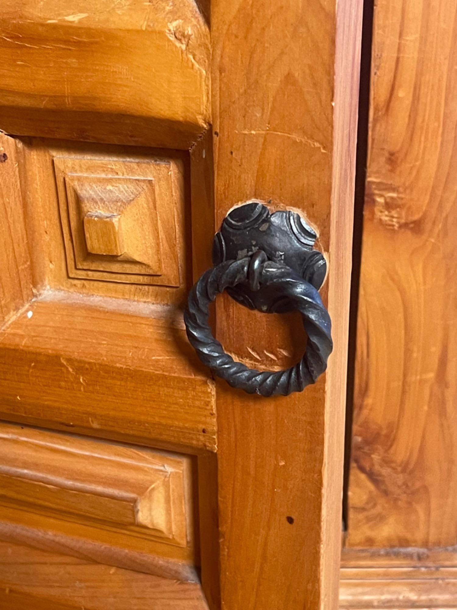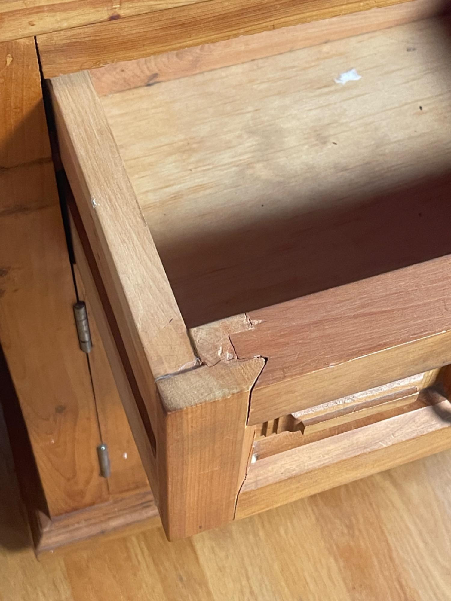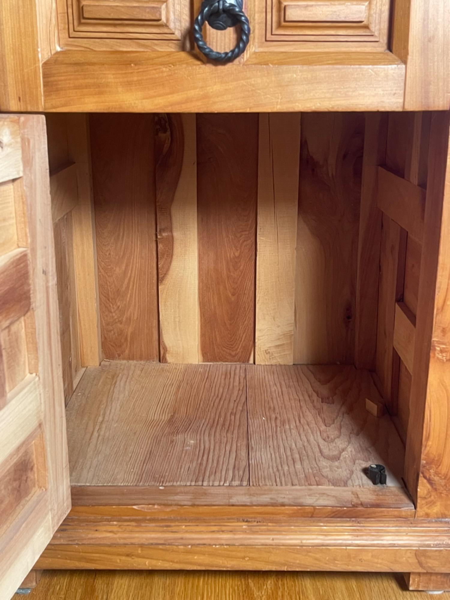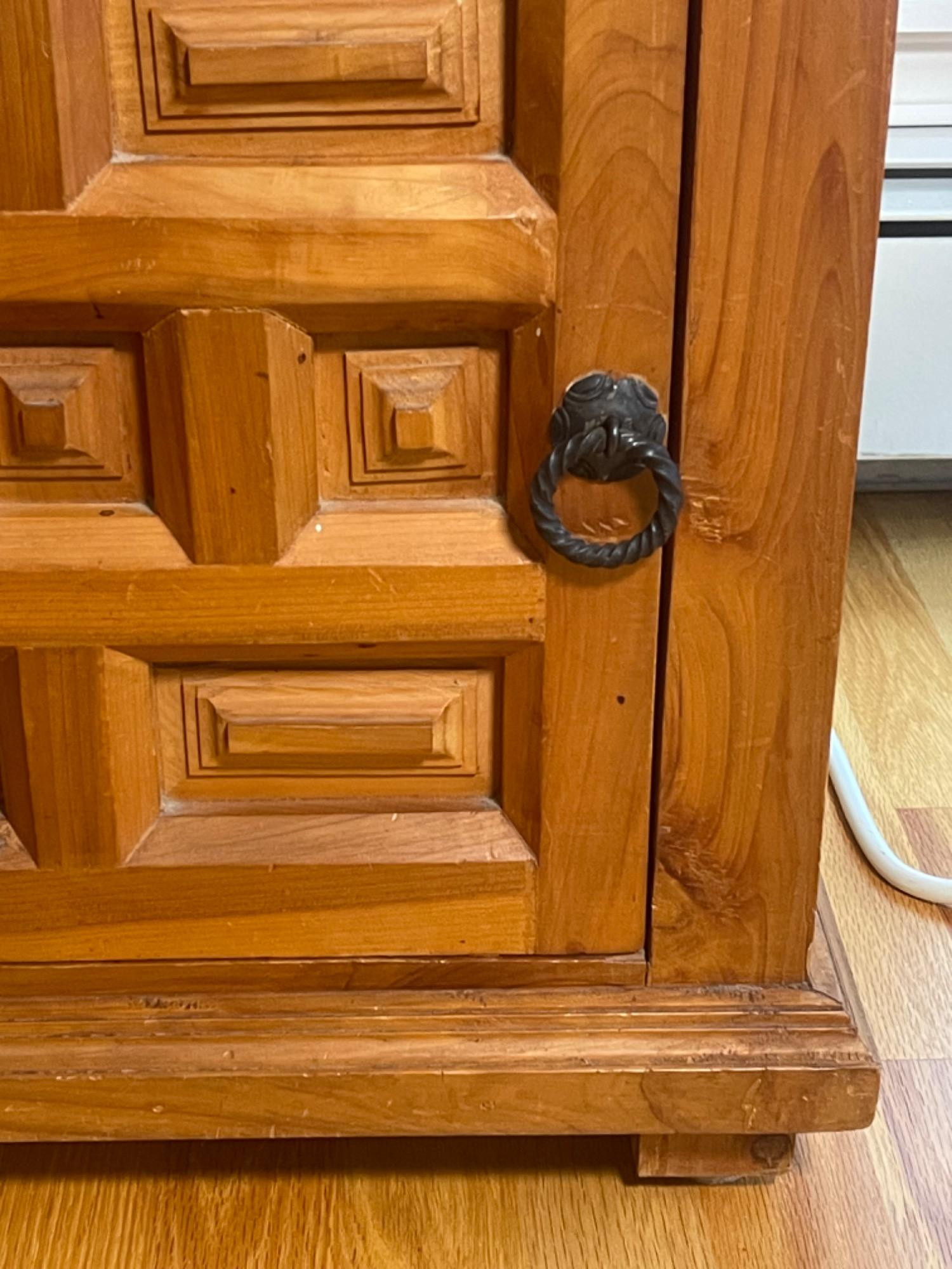 Vintage Hand Carved Solid Wood Side Table From Mexico This piece is solid wood so it is very HEAVY. You will need to make sure to bring the proper personnel and tools to safely remove this from property. Wood has multiple scratches, scuffs and stains, but is holding together beautifully.