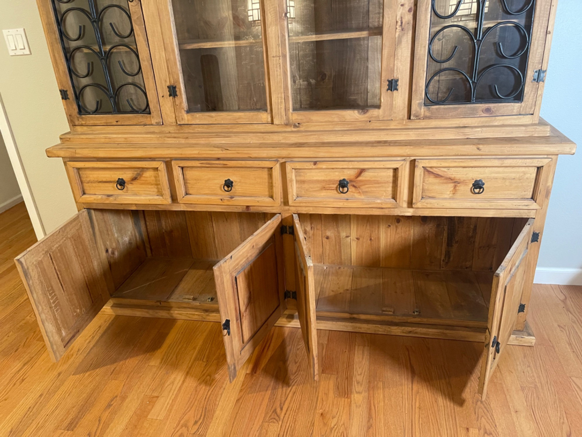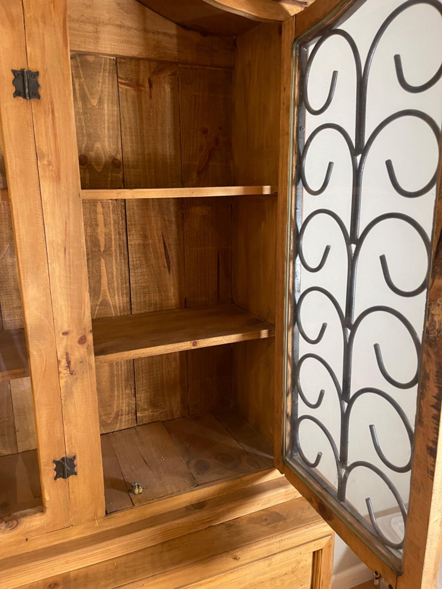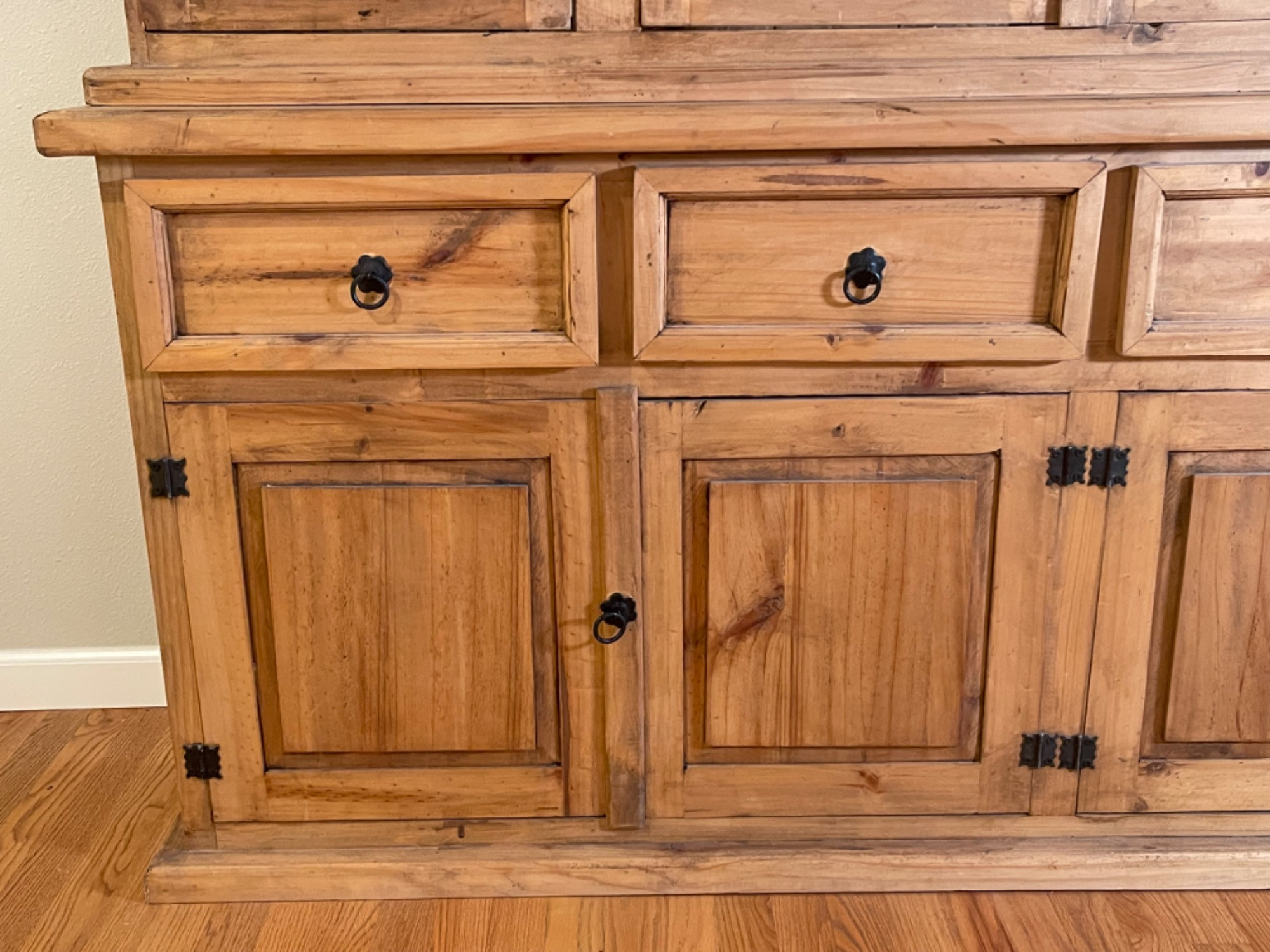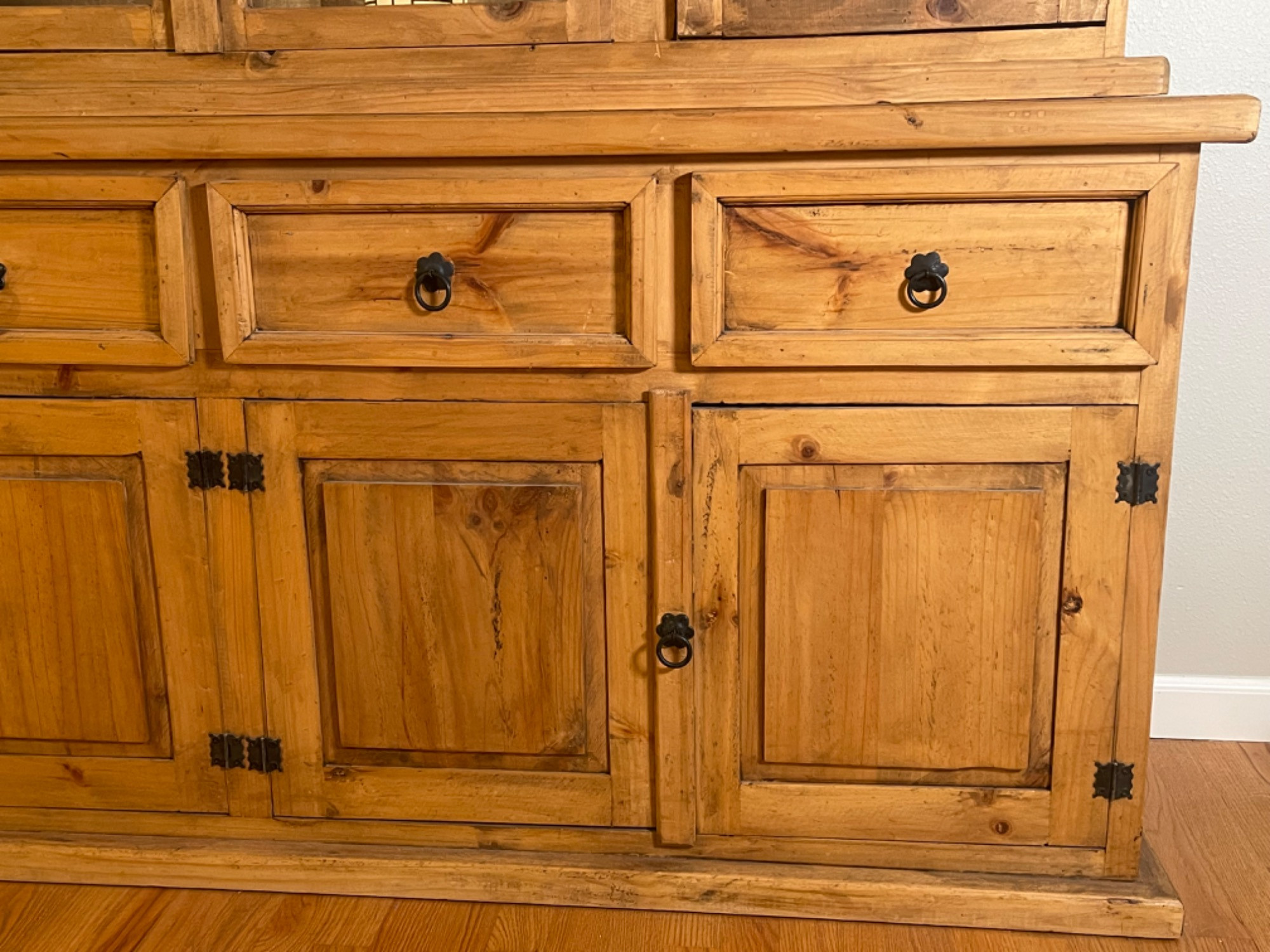 Large Rustic Wood Hutch One glass door sits slightly open, but could be fixed with a replacement piece. Wood has some scratches and scuffs from use but is in great condition.