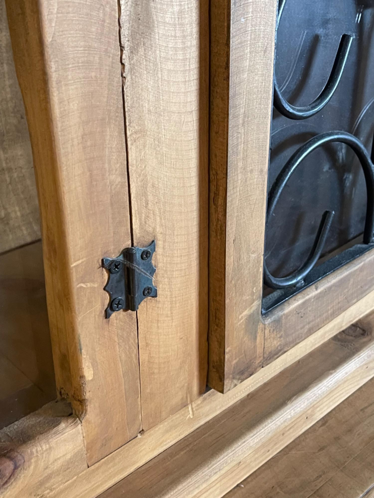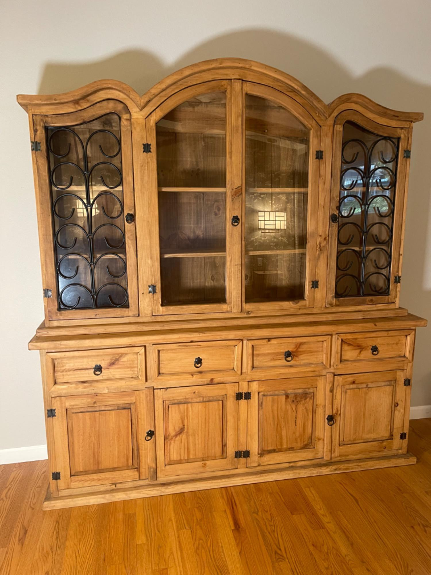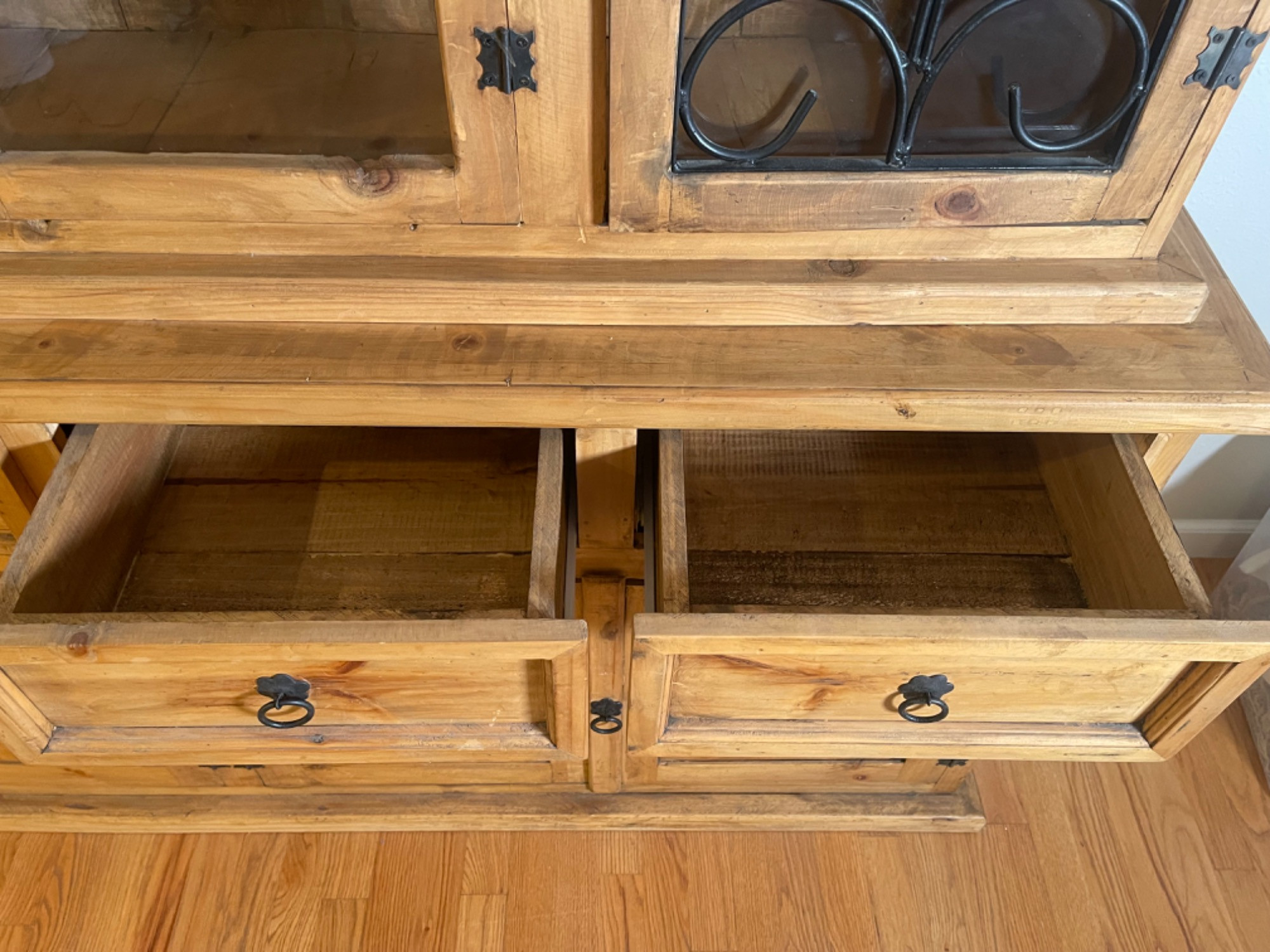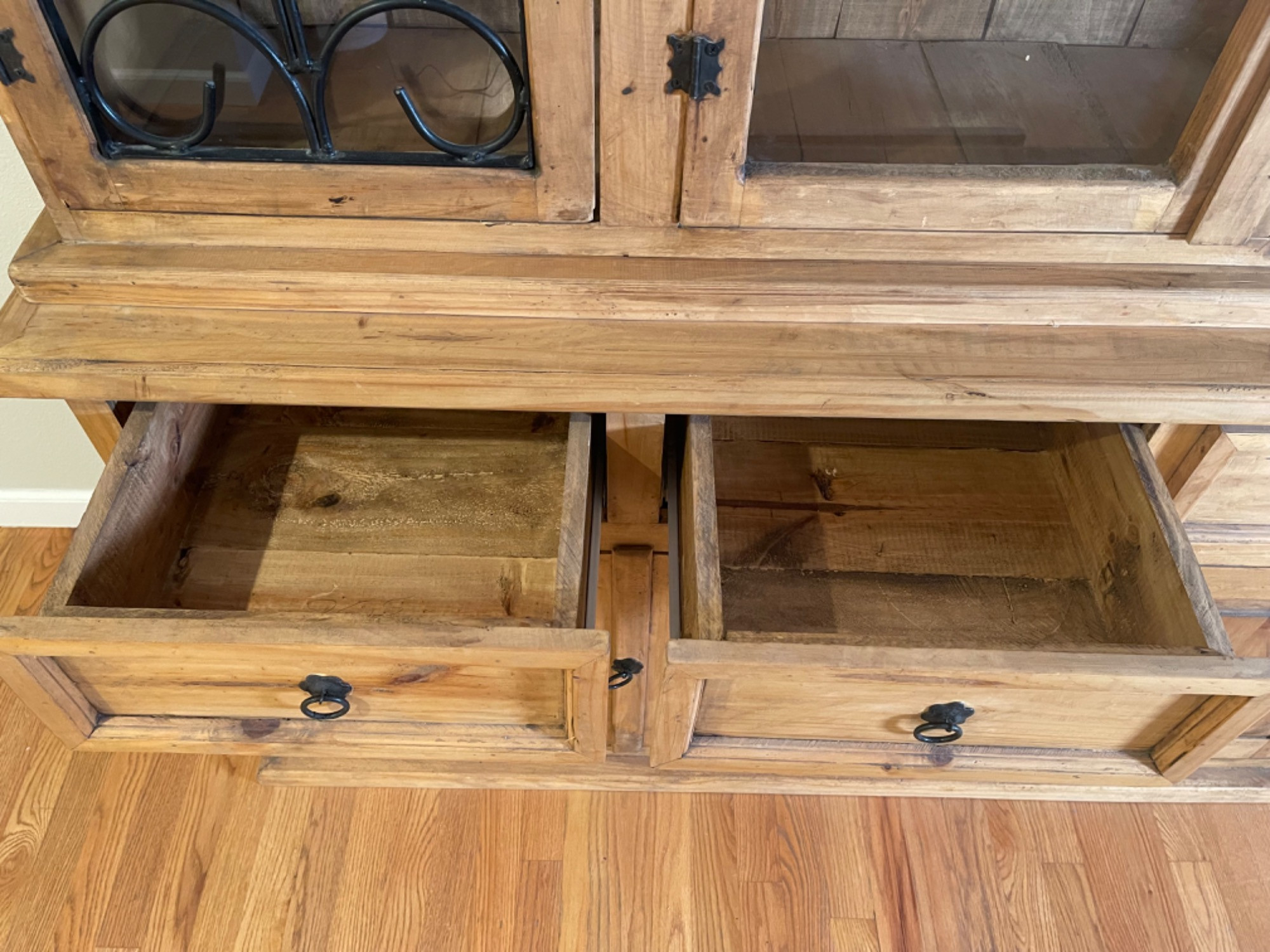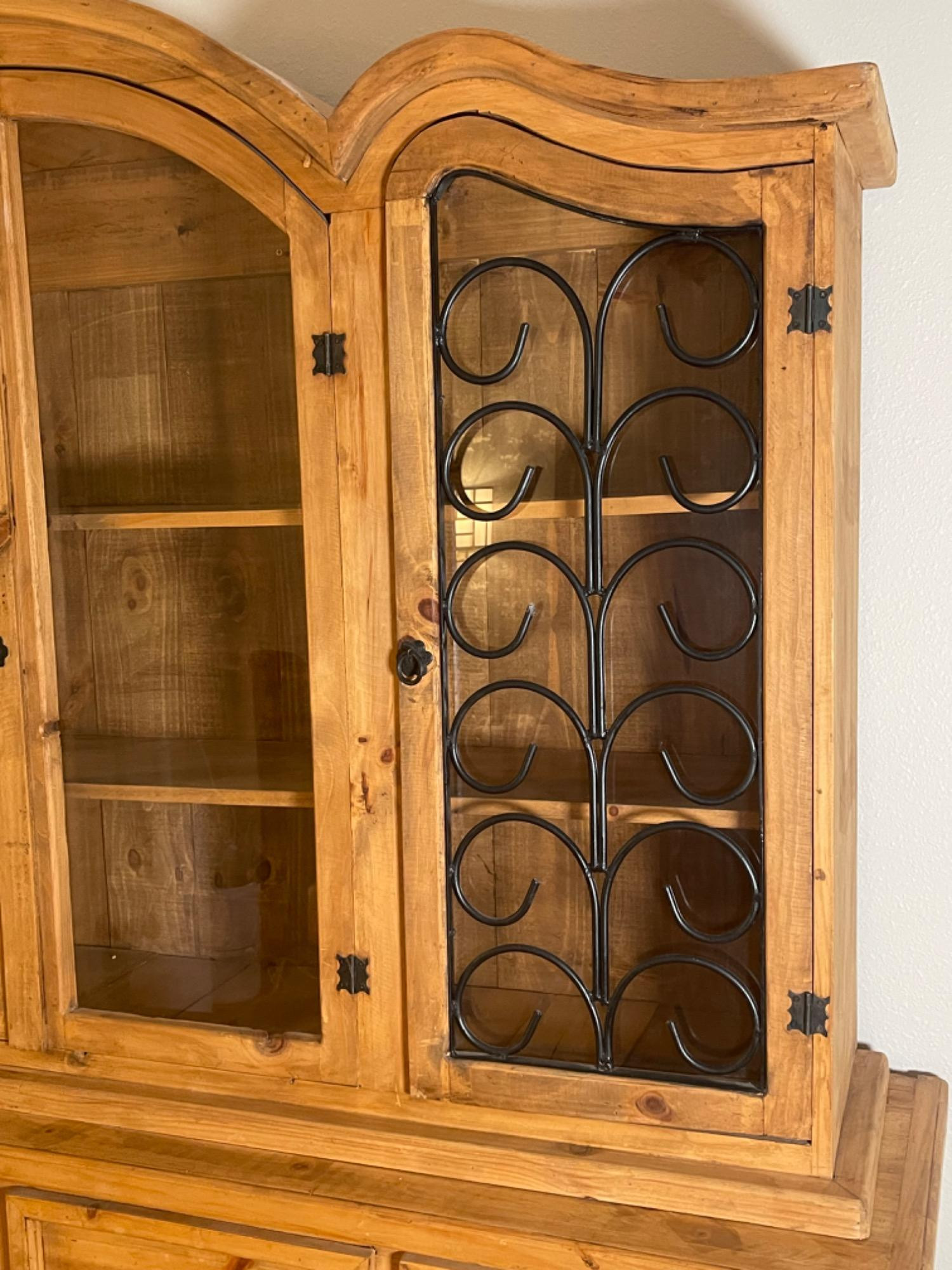 Large Rustic Wood Hutch One glass door sits slightly open, but could be fixed with a replacement piece. Wood has some scratches and scuffs from use but is in great condition.
