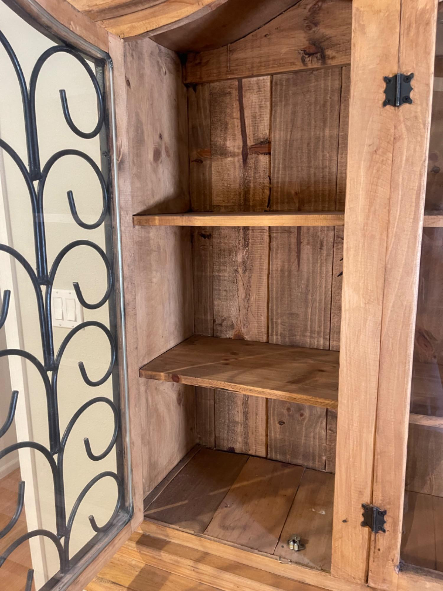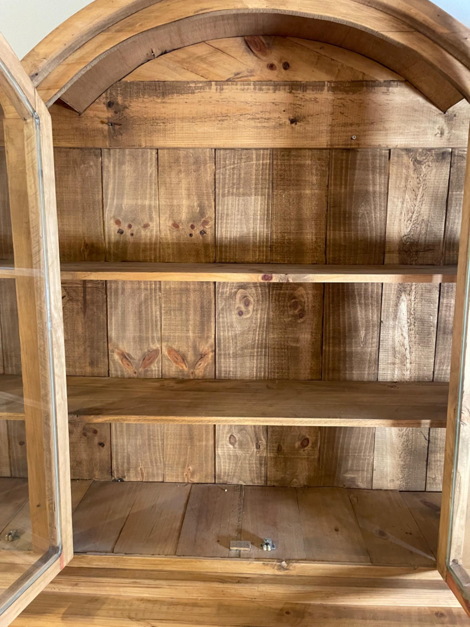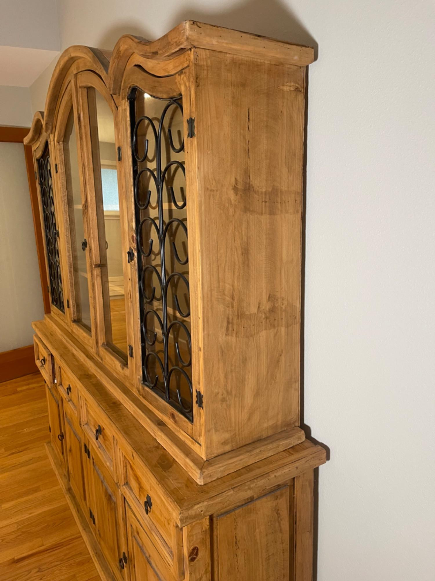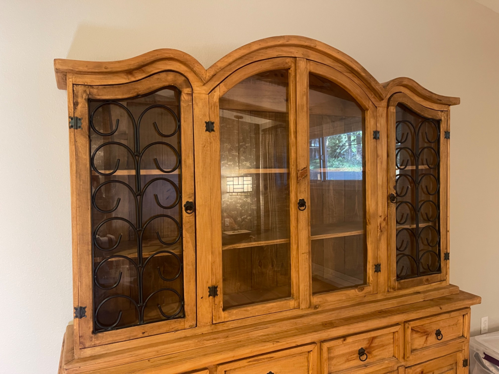Large Rustic Wood Hutch One glass door sits slightly open, but could be fixed with a replacement piece. Wood has some scratches and scuffs from use but is in great condition.
