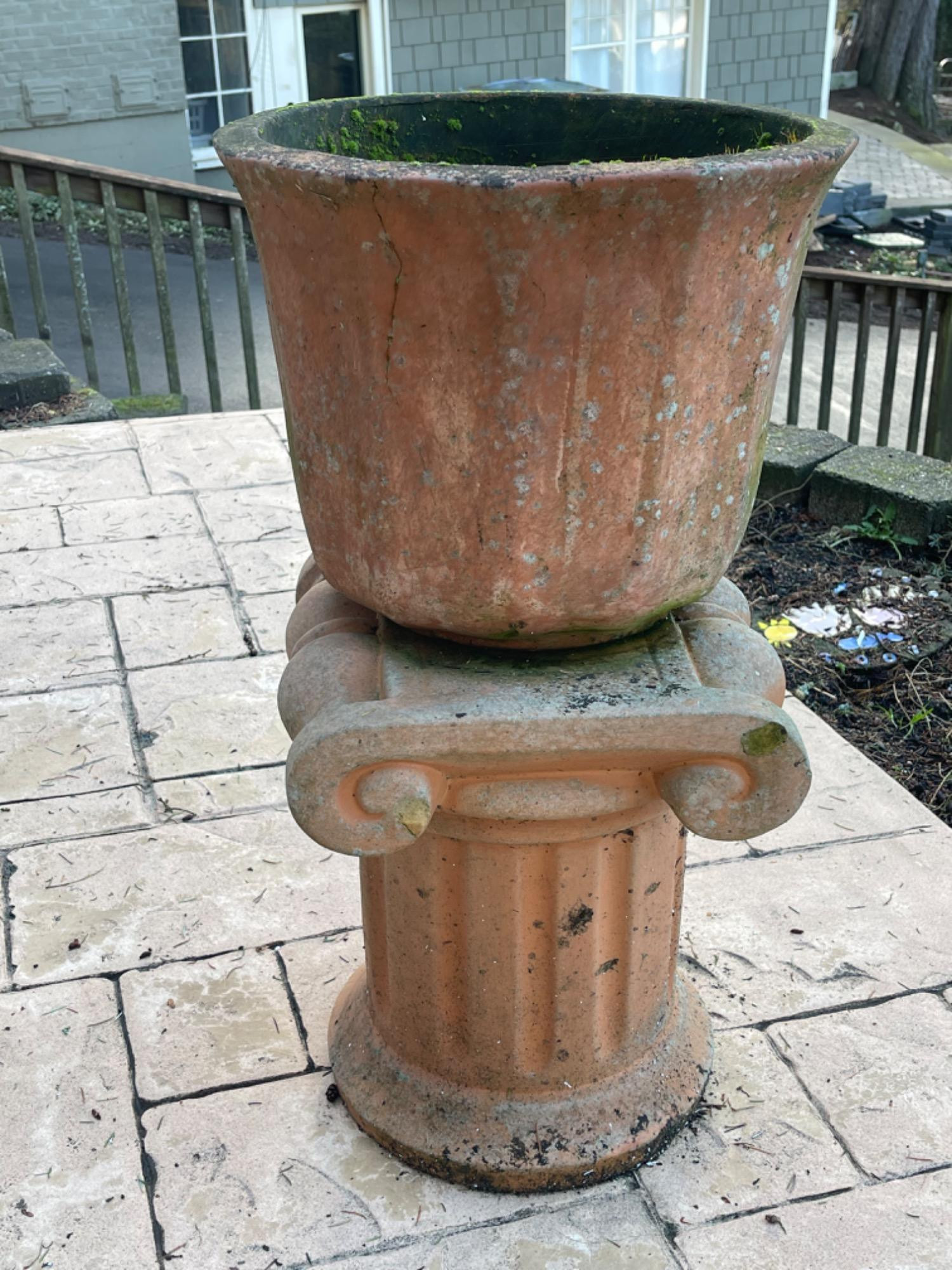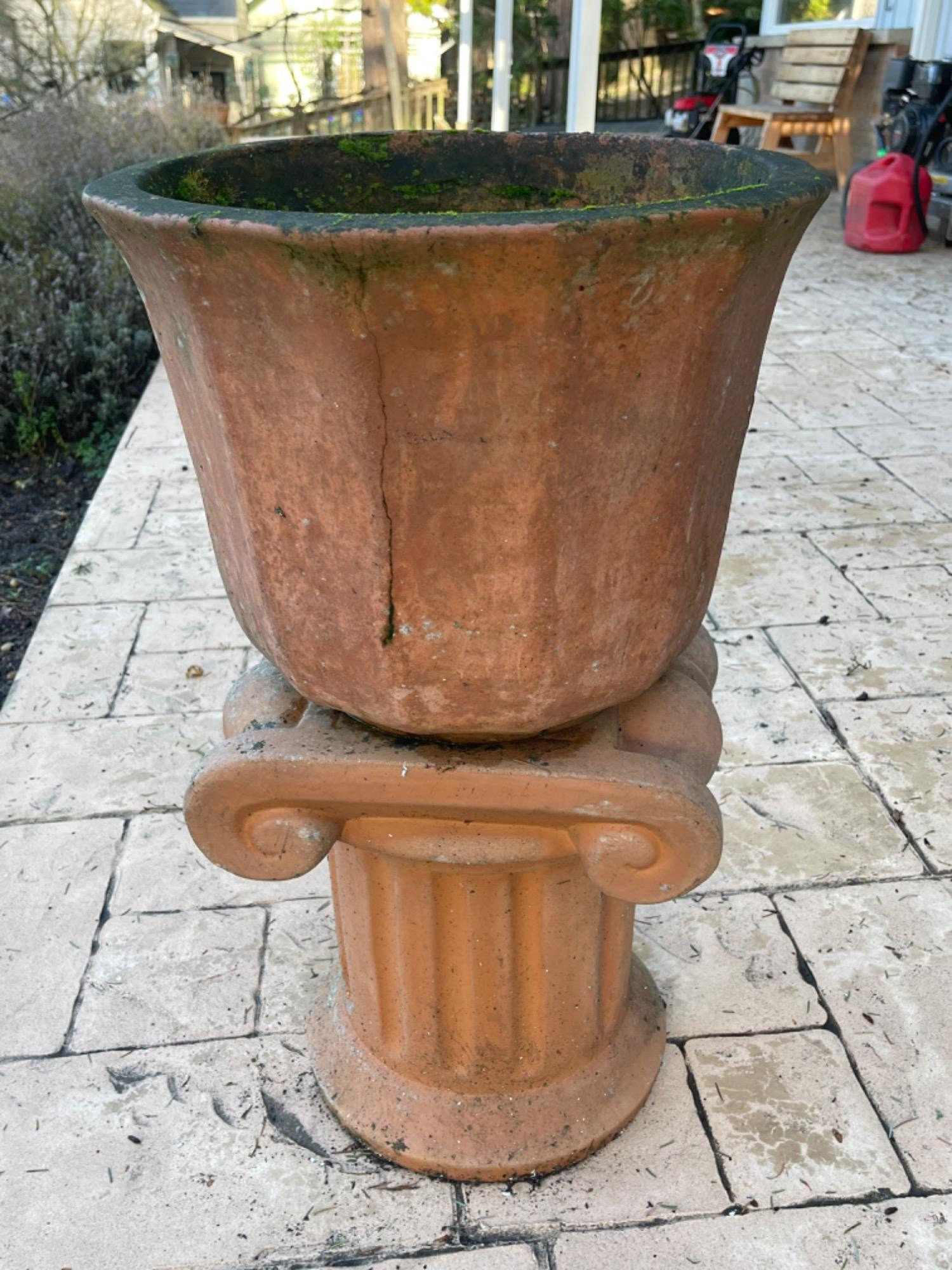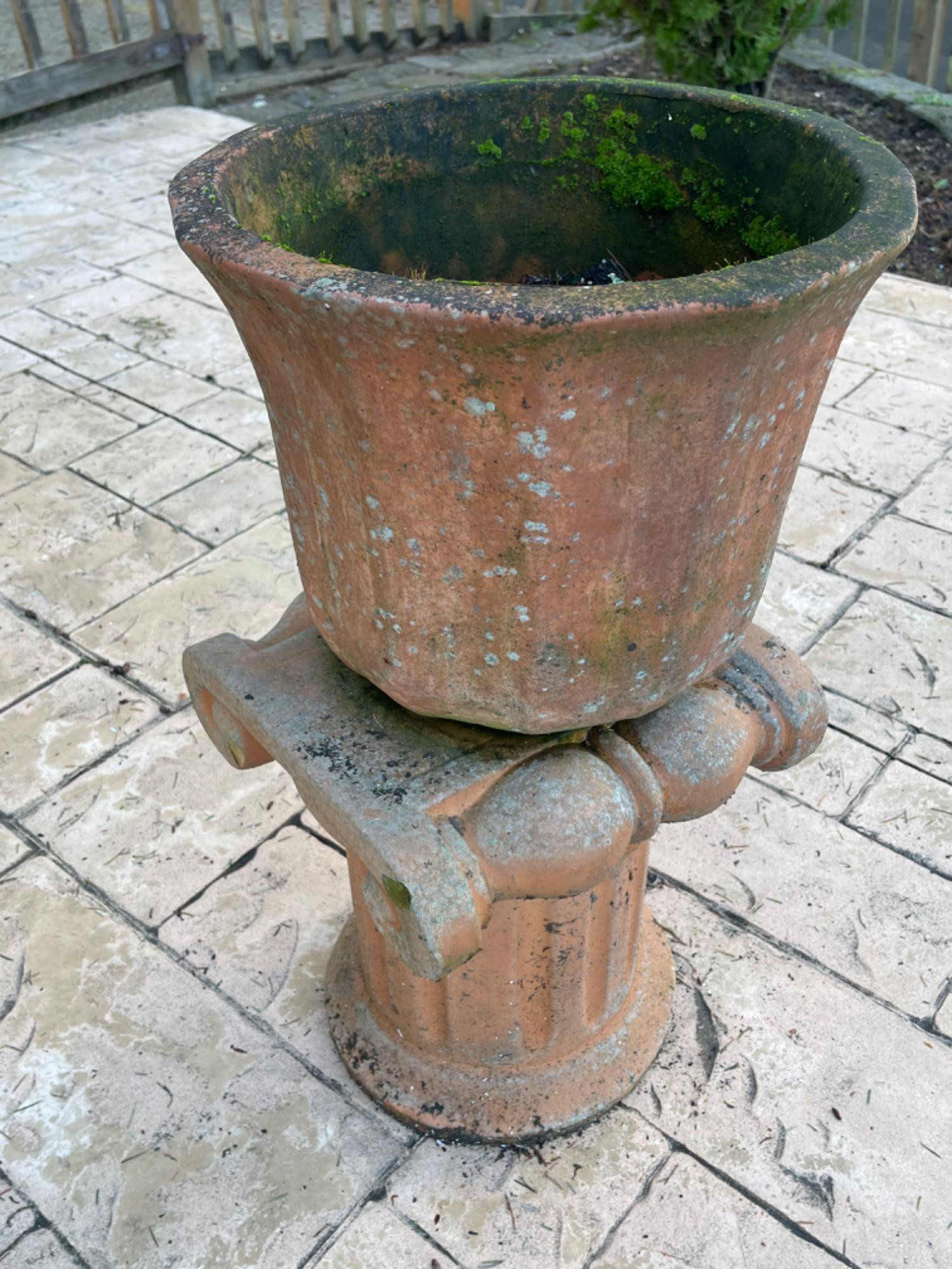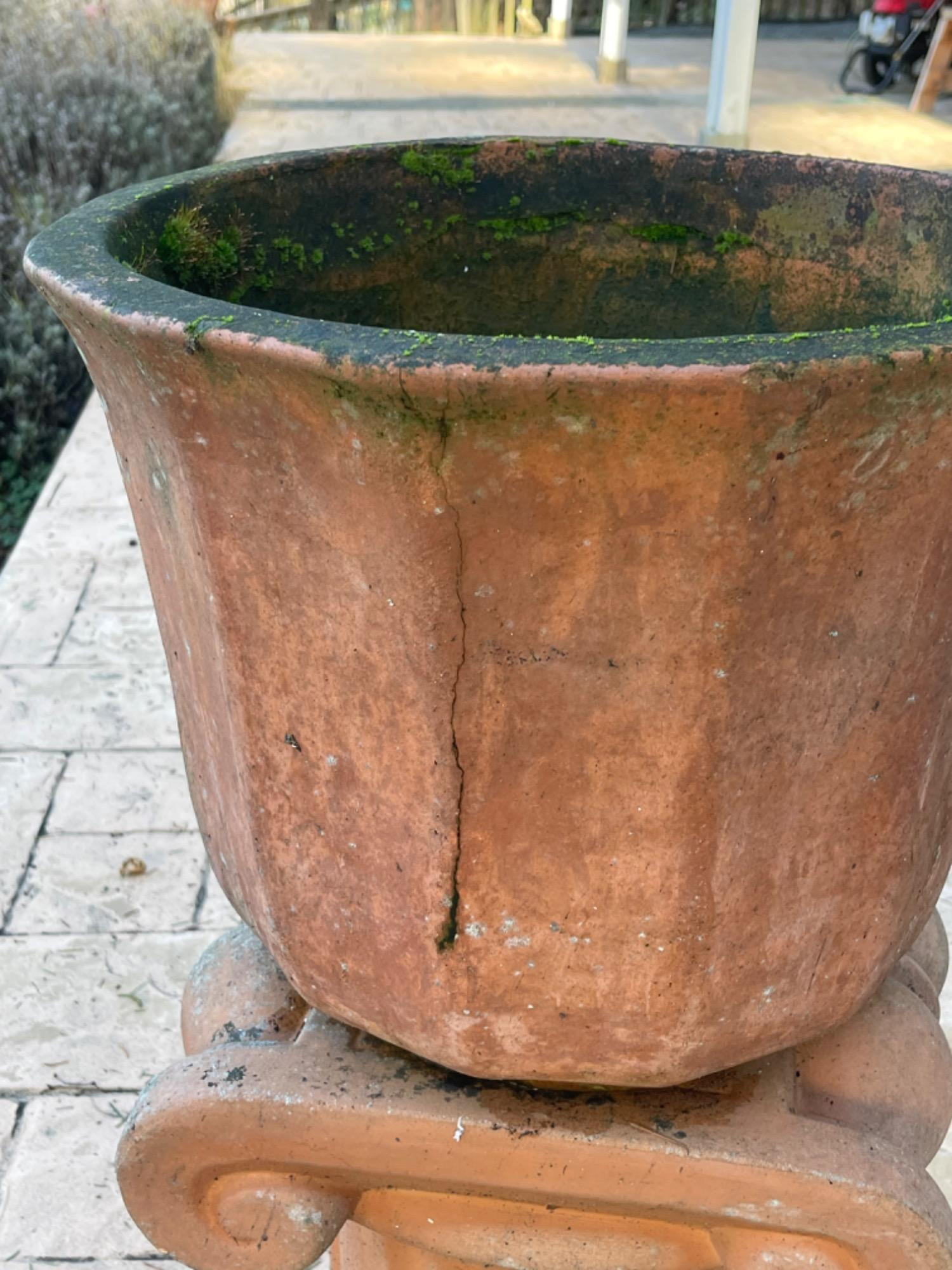 Four Terra Cotta Garden Pots All are very used and weathered, but sturdy and holding together well. Largest pedestal pot has some chips and cracking. Smallest: 11" H Largest: 28.5"