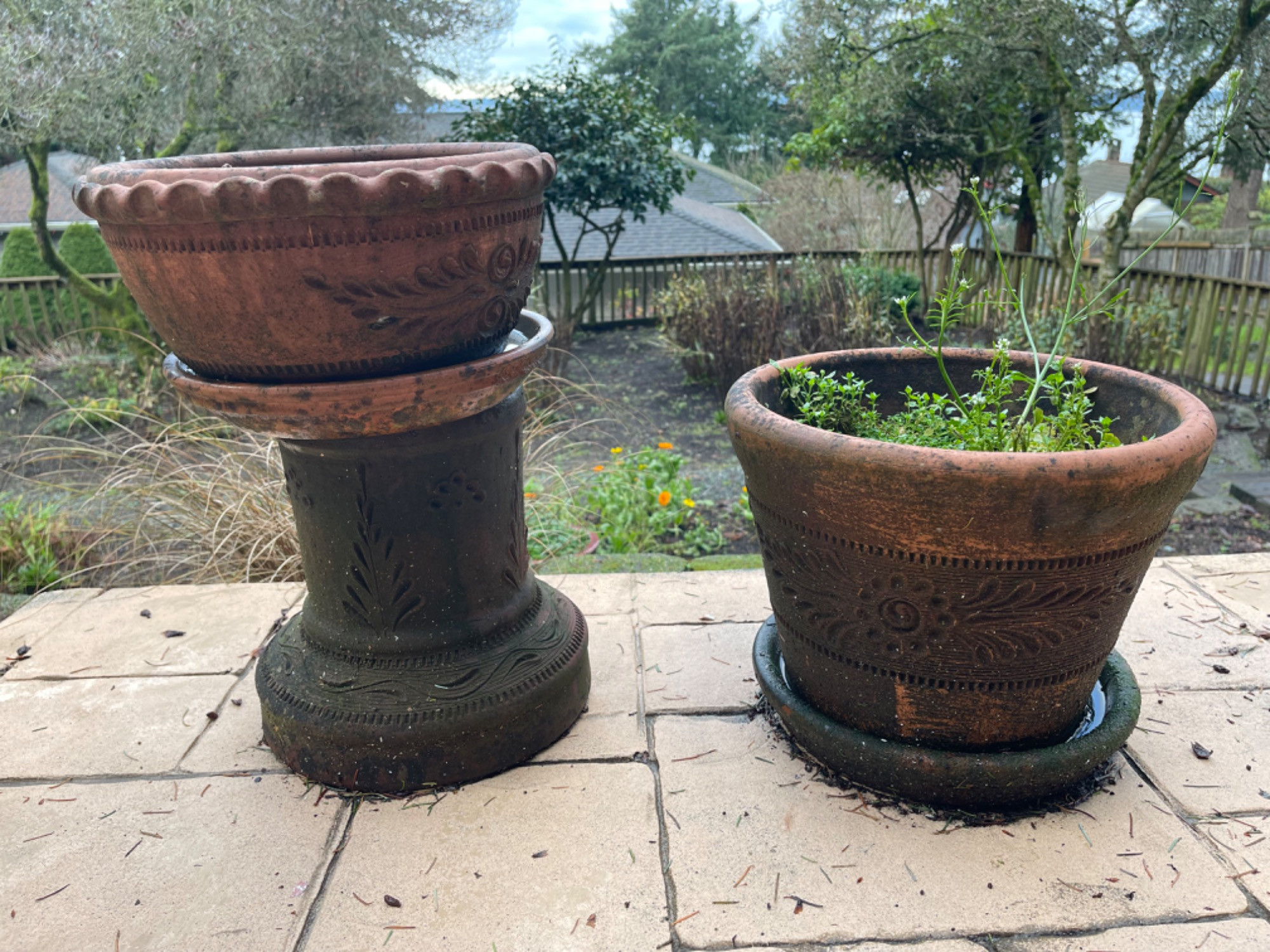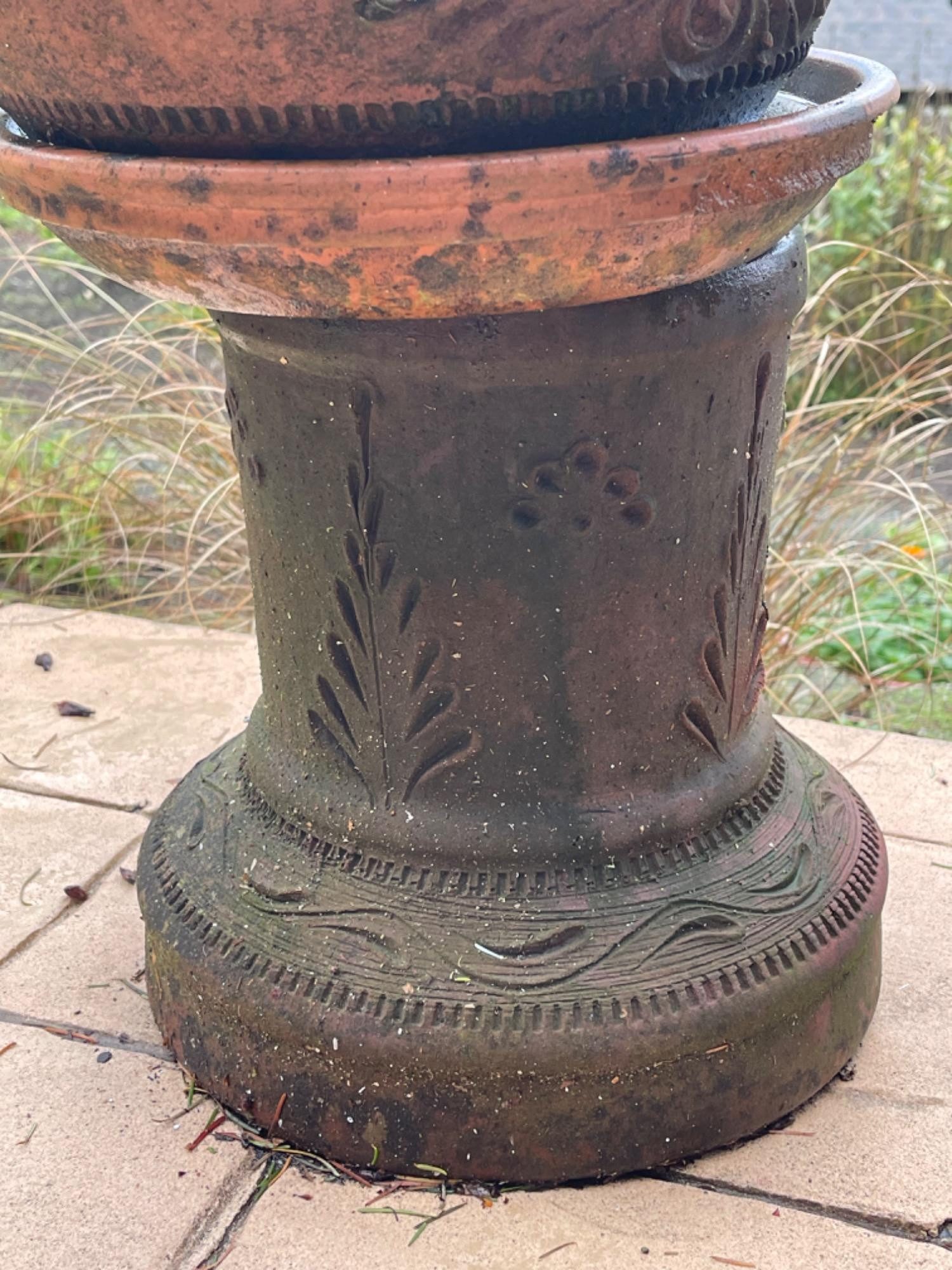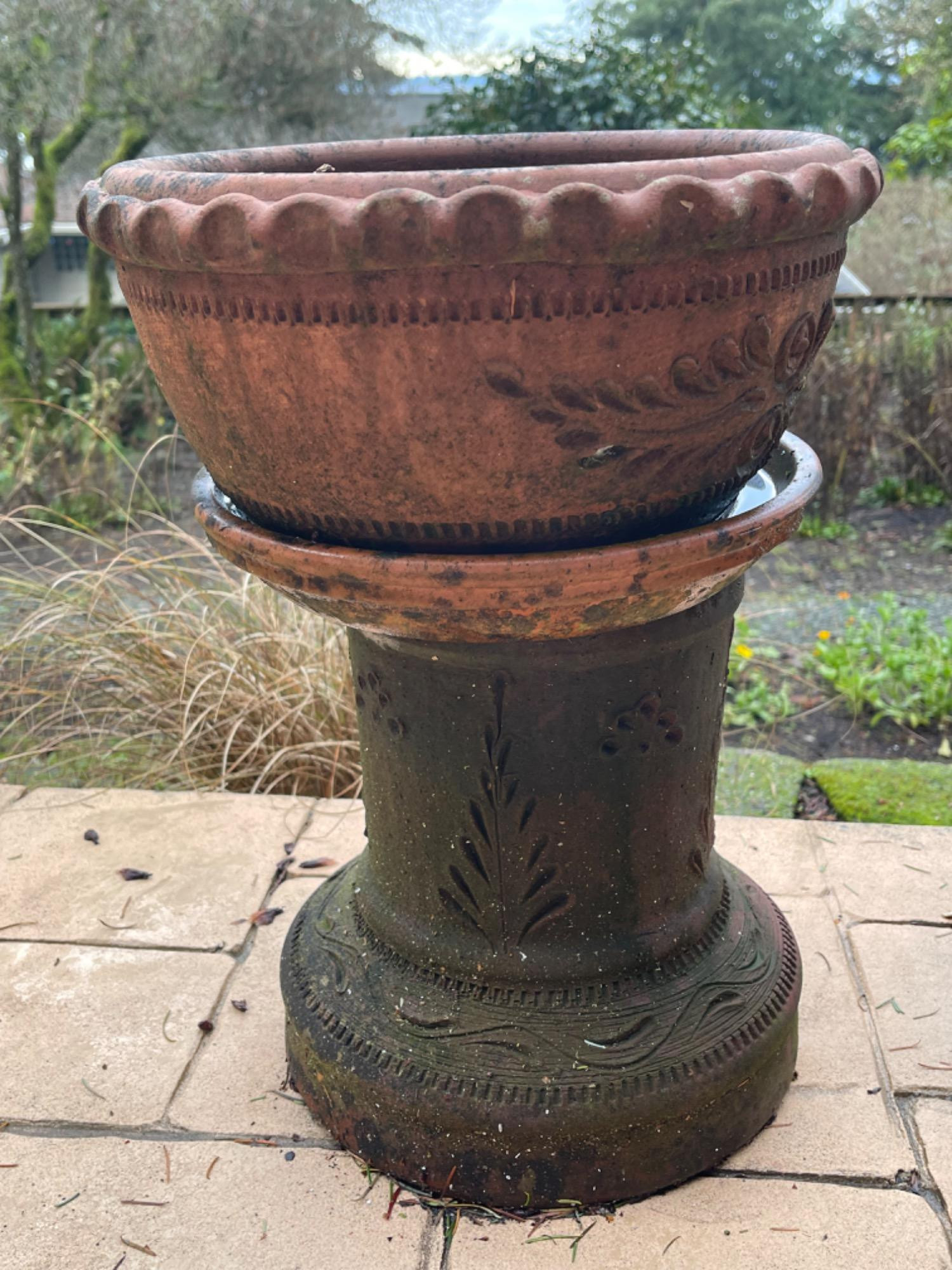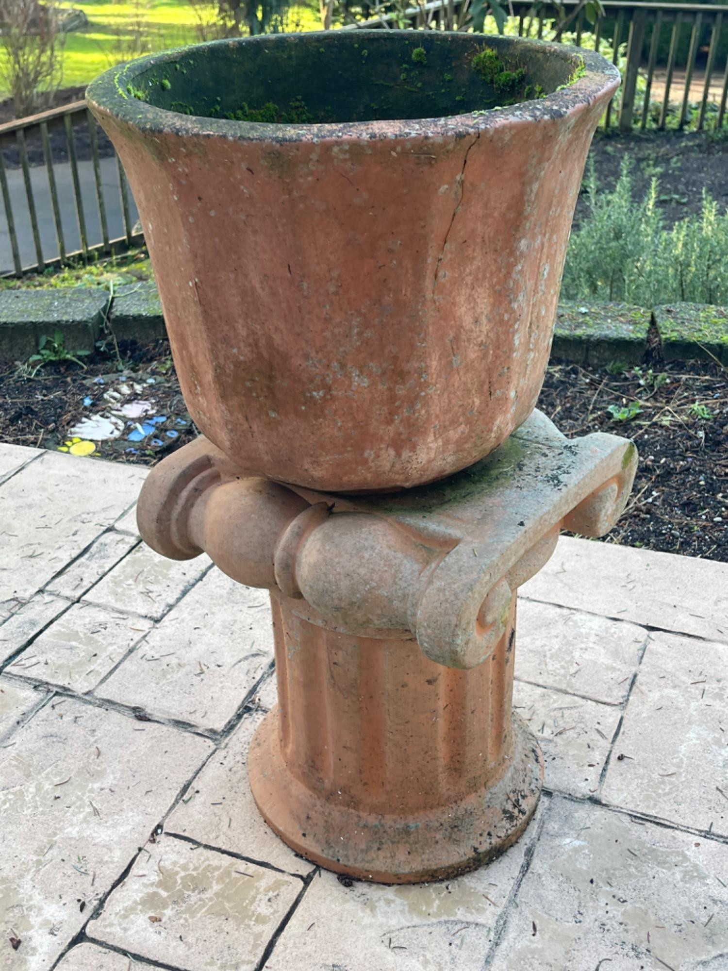 Four Terra Cotta Garden Pots All are very used and weathered, but sturdy and holding together well. Largest pedestal pot has some chips and cracking. Smallest: 11" H Largest: 28.5"