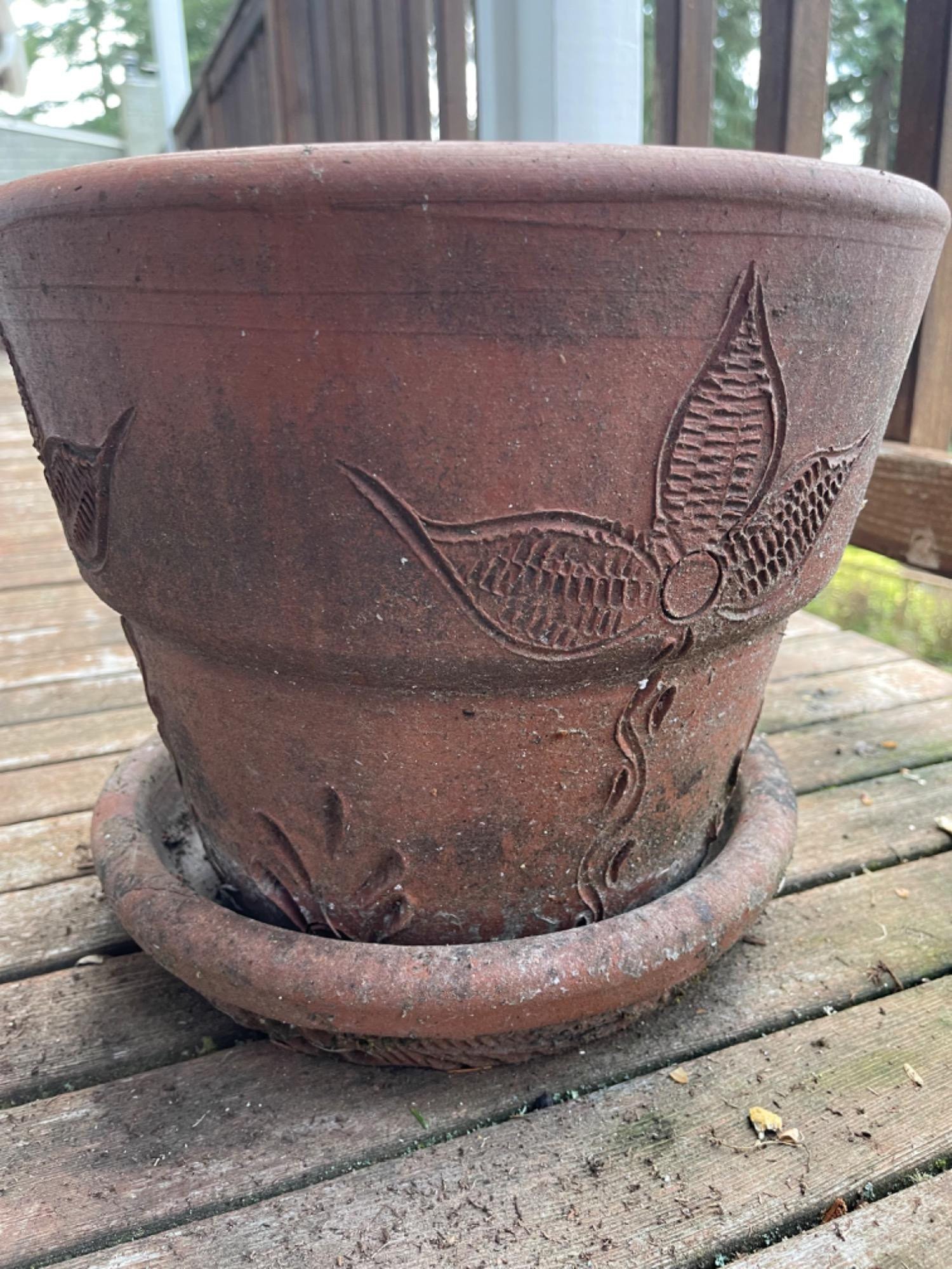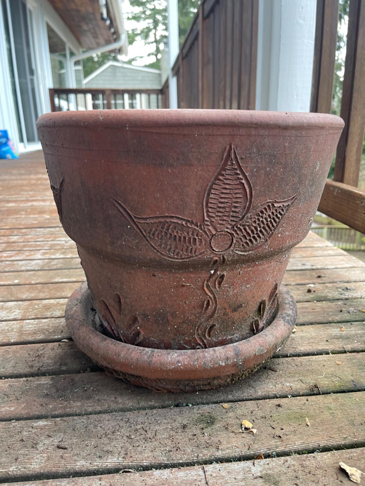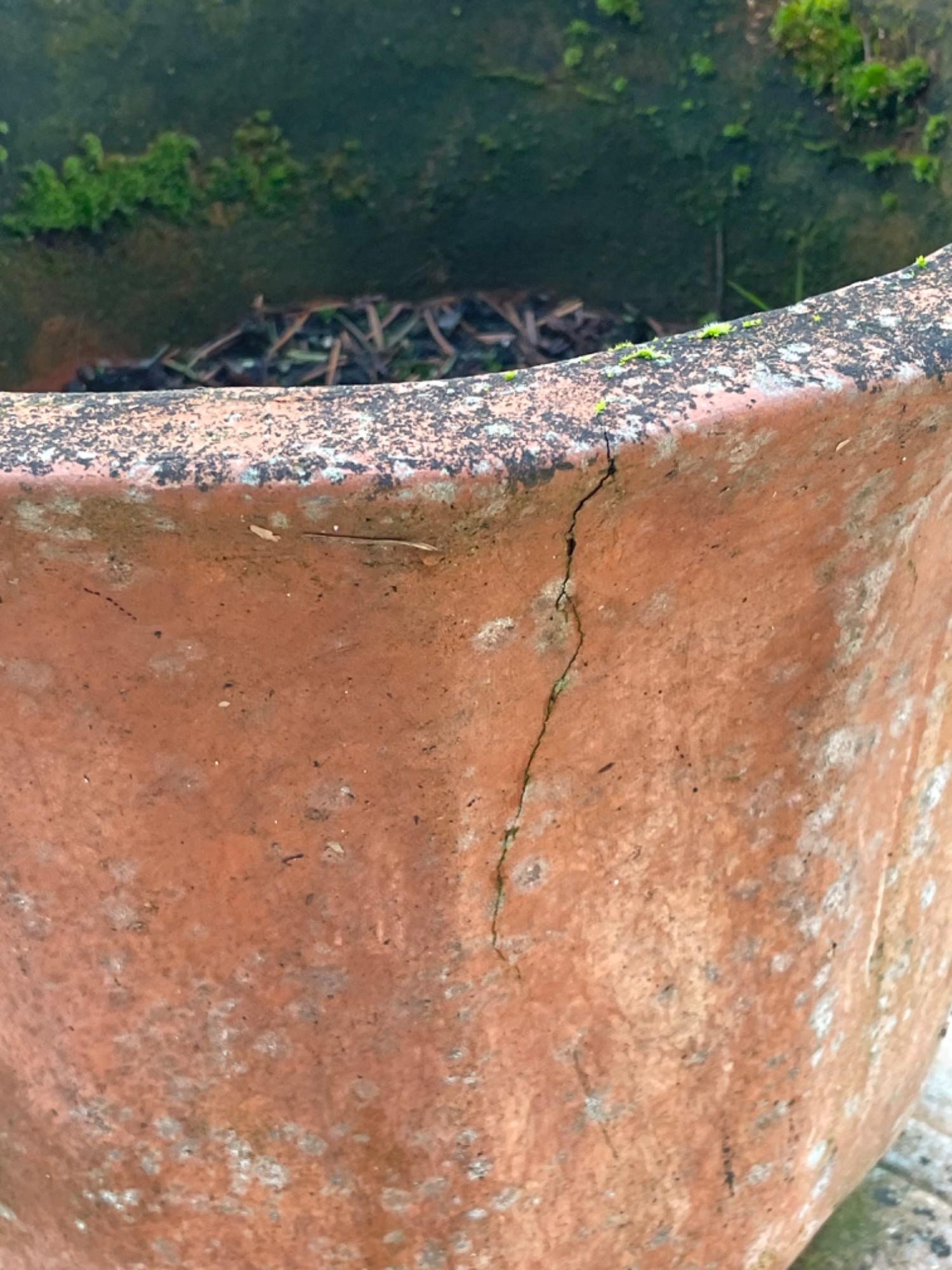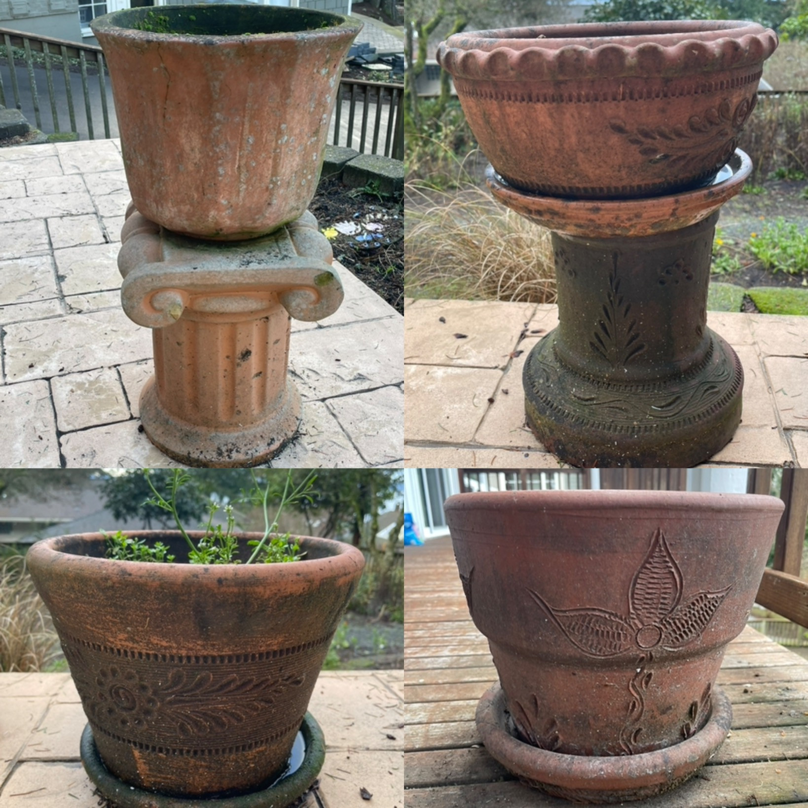 Four Terra Cotta Garden Pots All are very used and weathered, but sturdy and holding together well. Largest pedestal pot has some chips and cracking. Smallest: 11" H Largest: 28.5"
