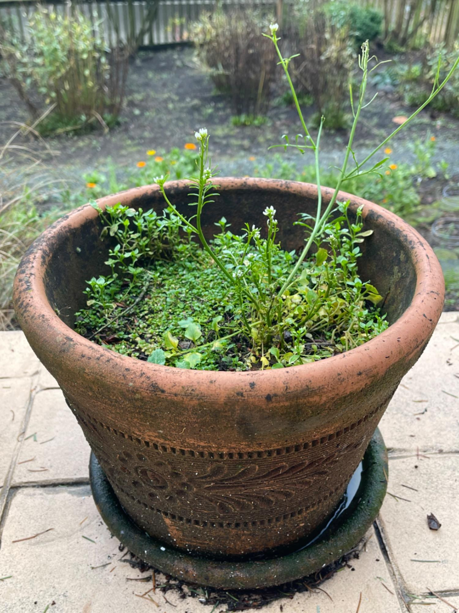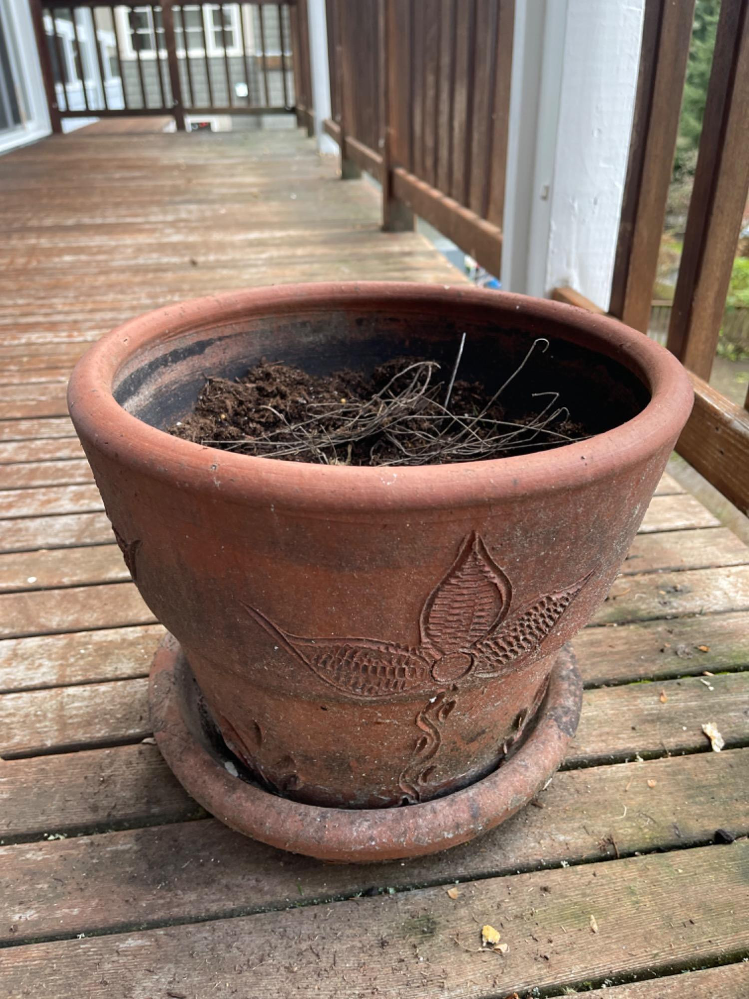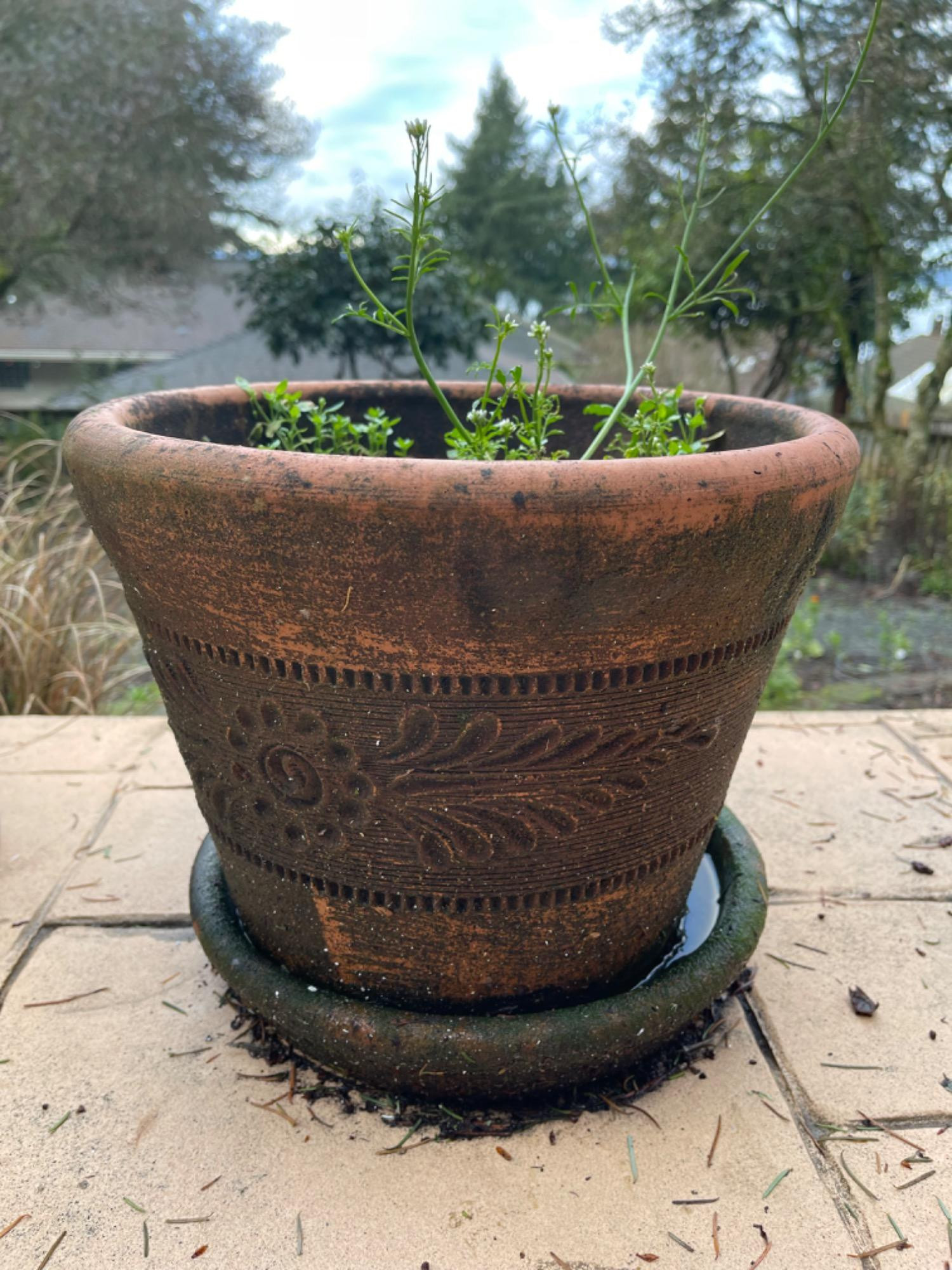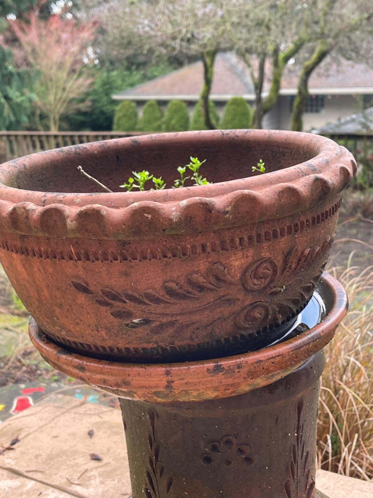 Four Terra Cotta Garden Pots All are very used and weathered, but sturdy and holding together well. Largest pedestal pot has some chips and cracking. Smallest: 11" H Largest: 28.5"