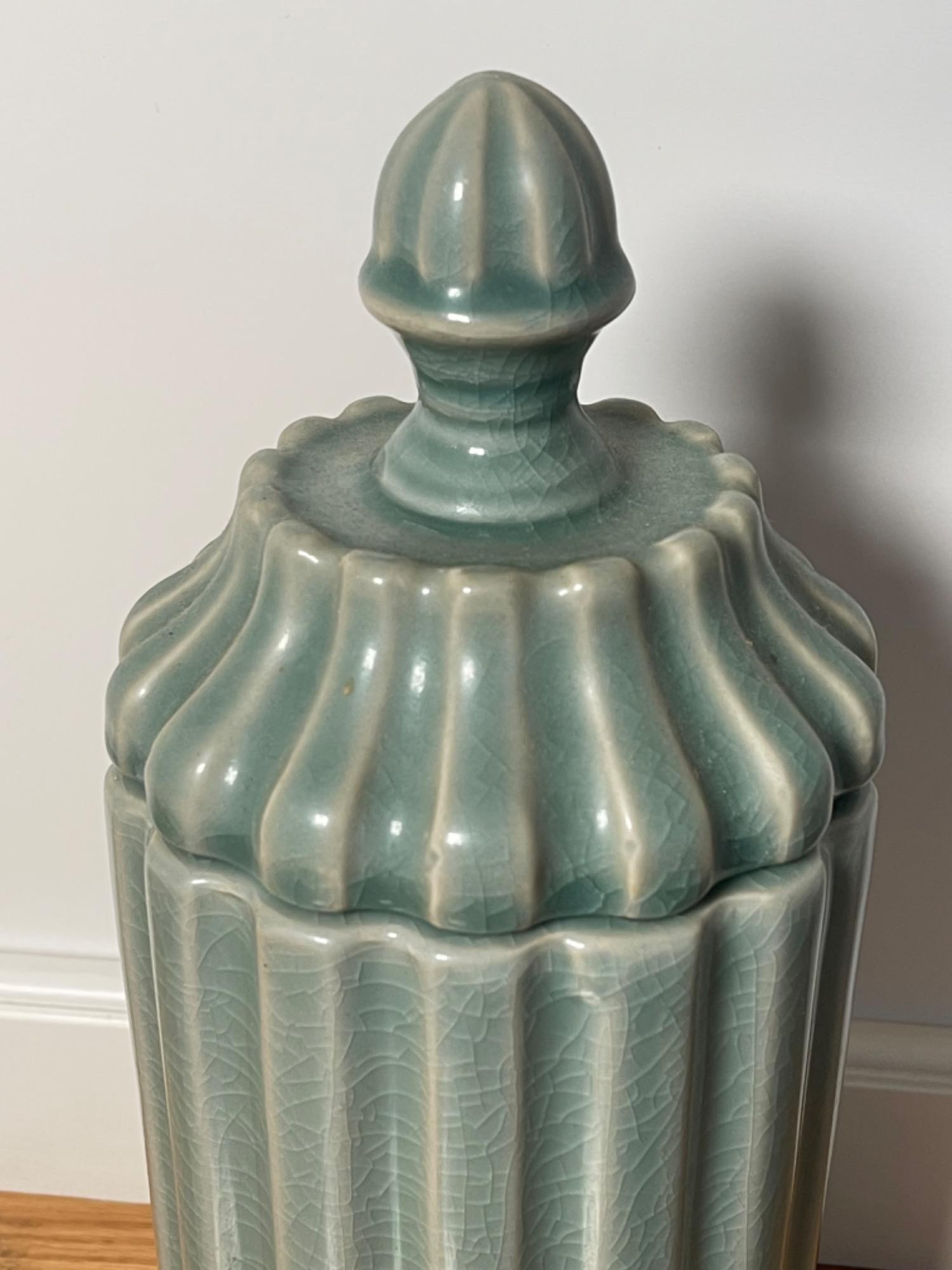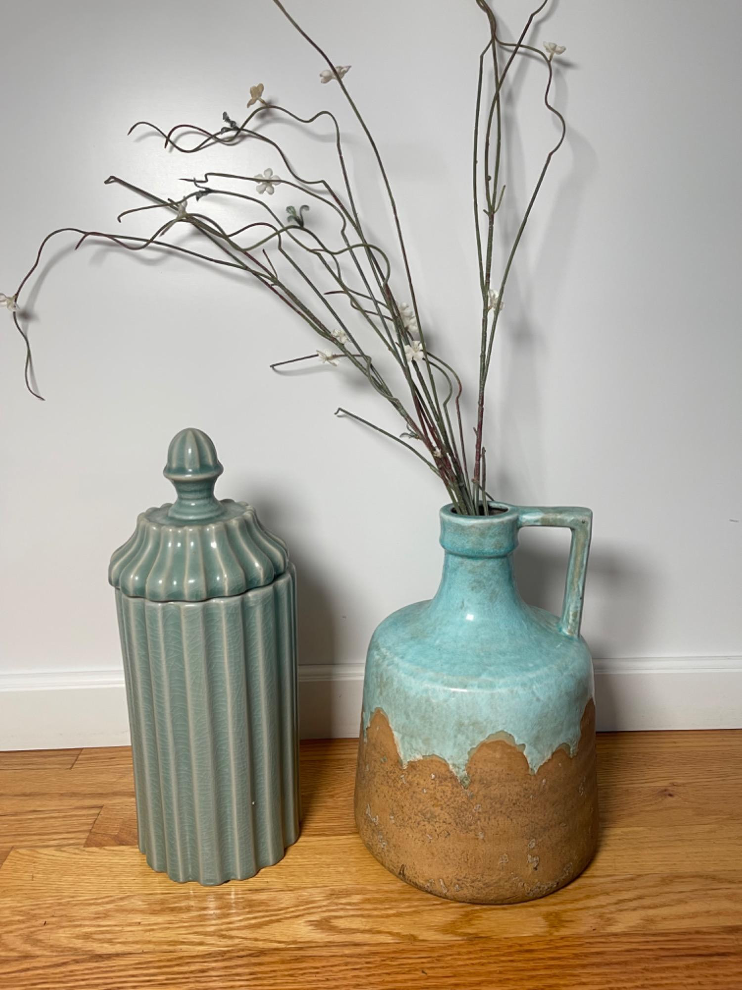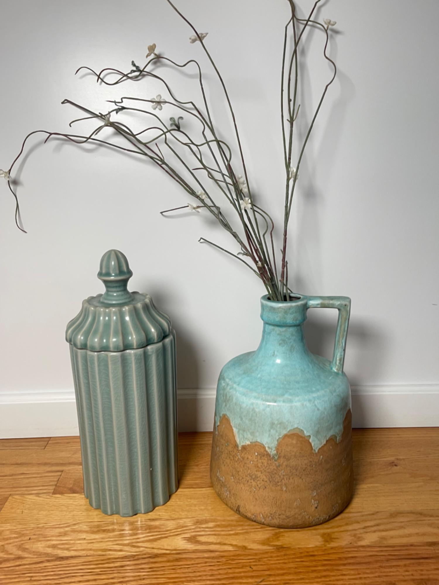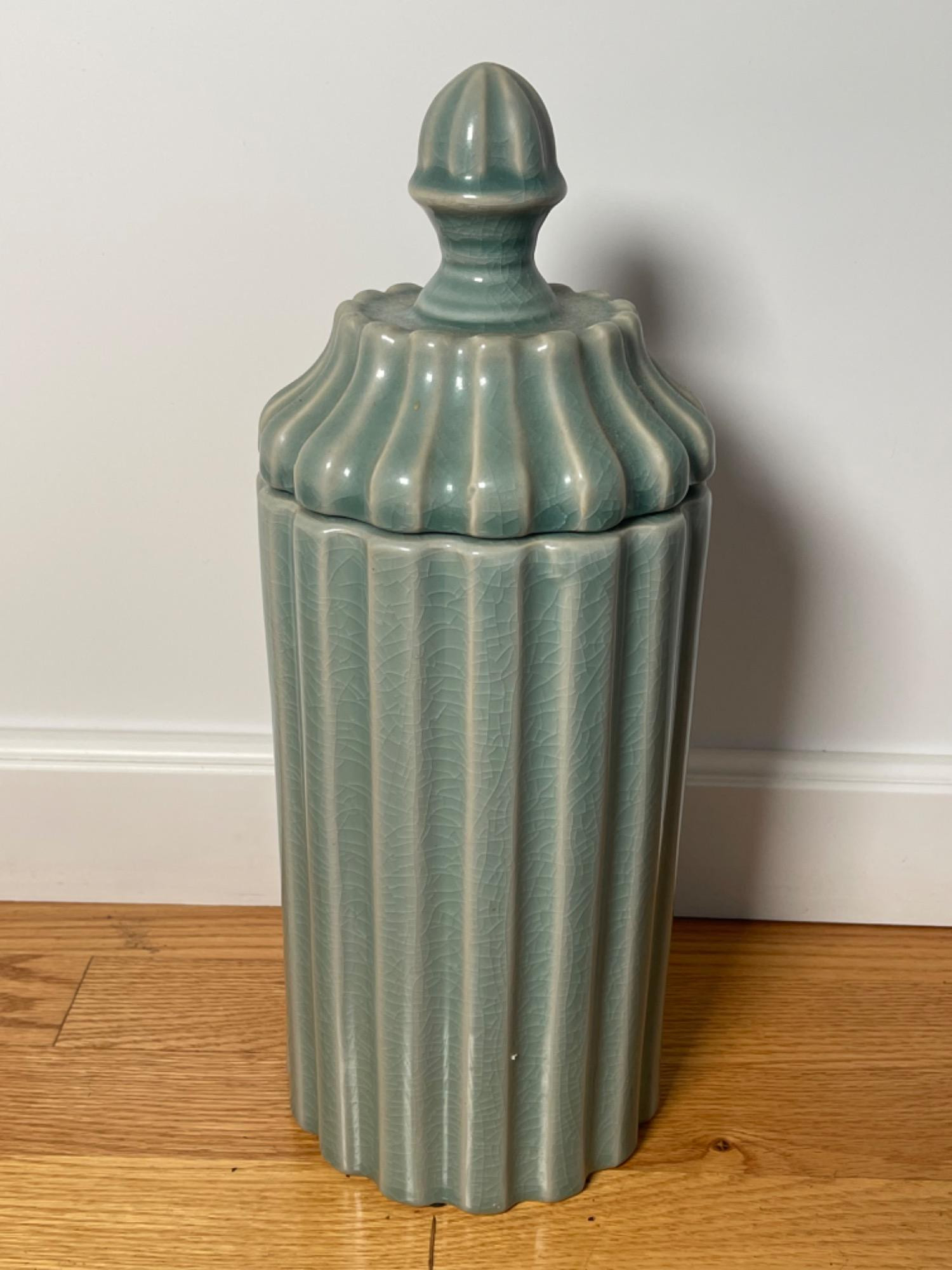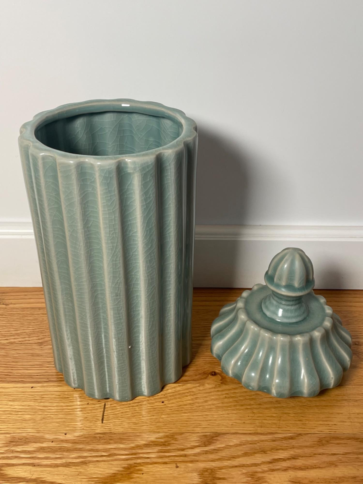Duo of Blue Ceramic Canister Decor Good used condition. Please see photos. Small: 12” H Large: 14.5” H