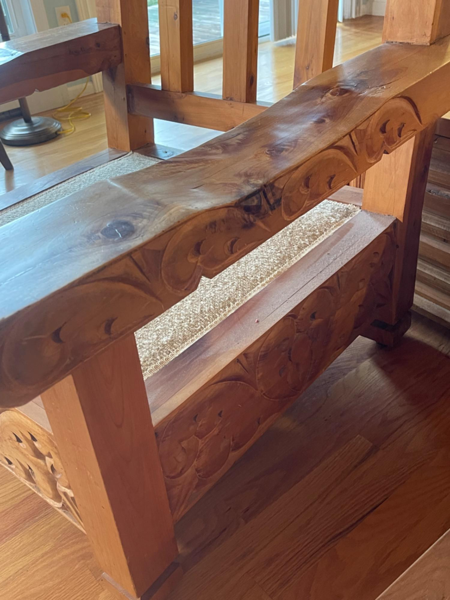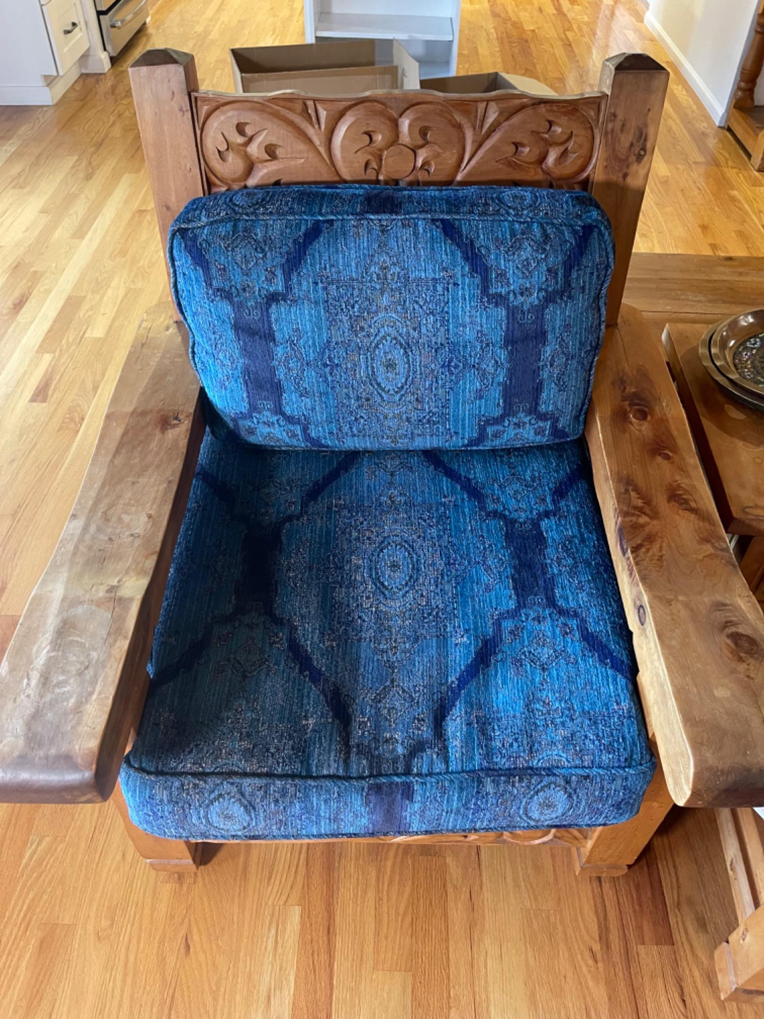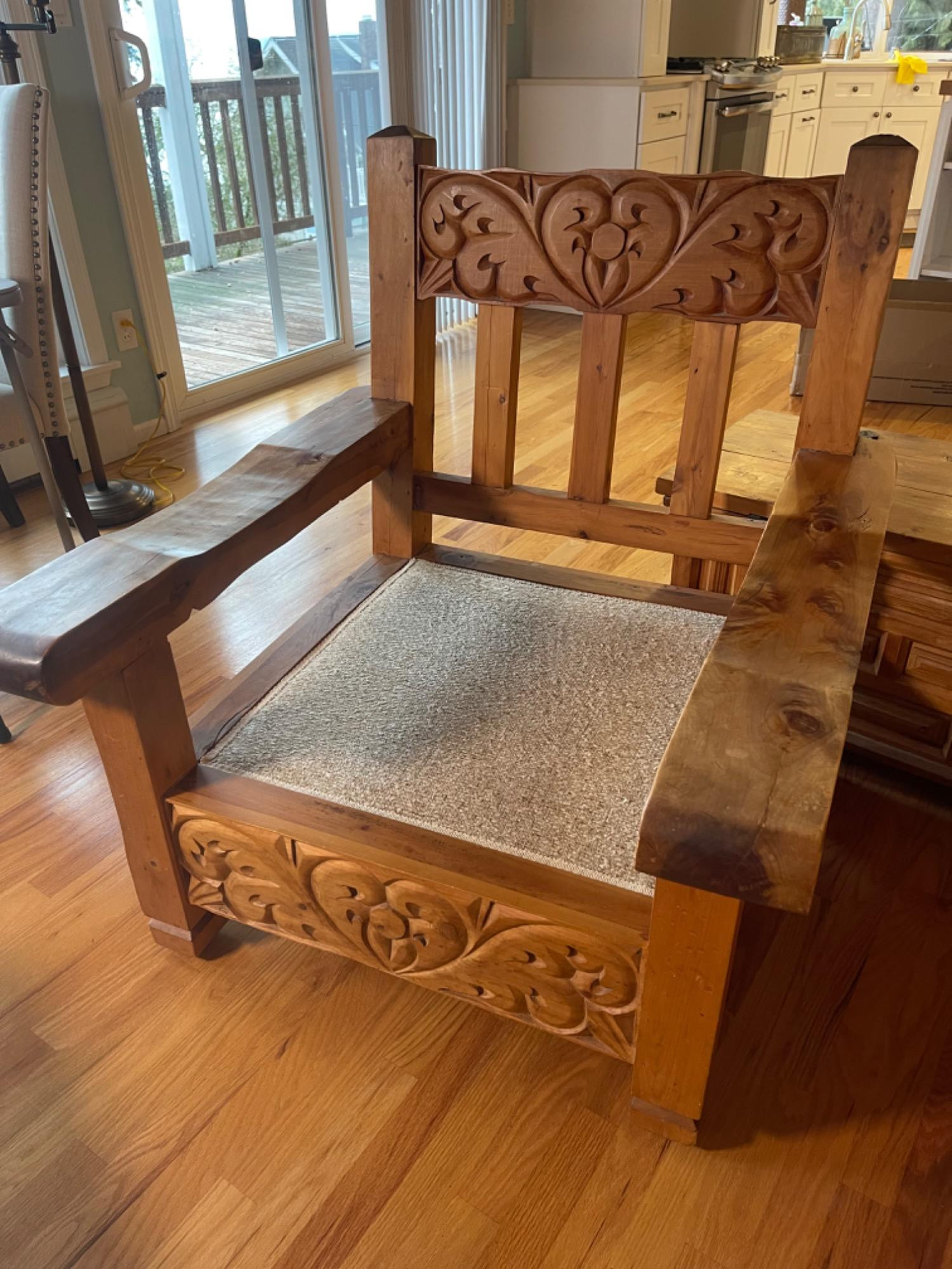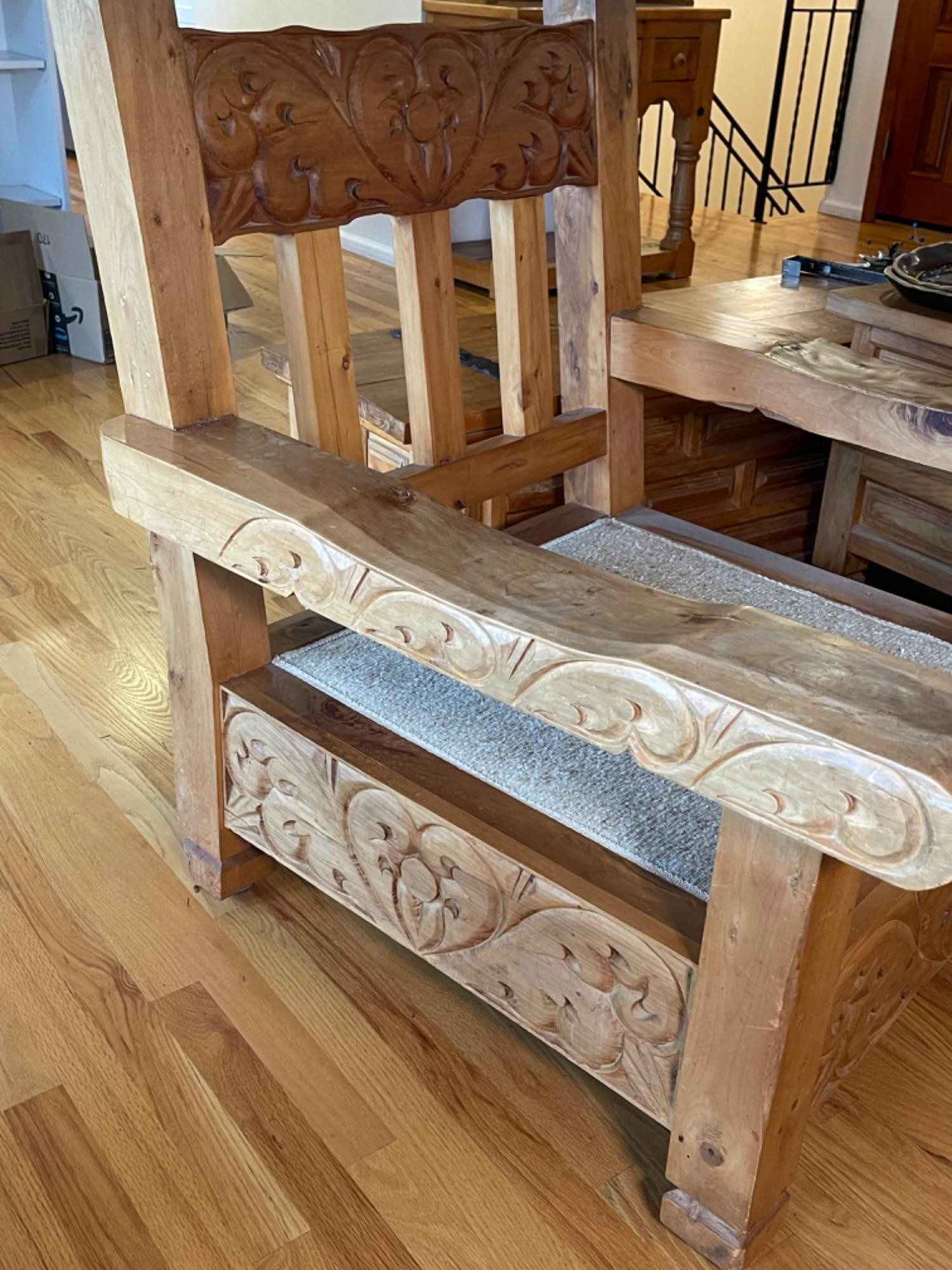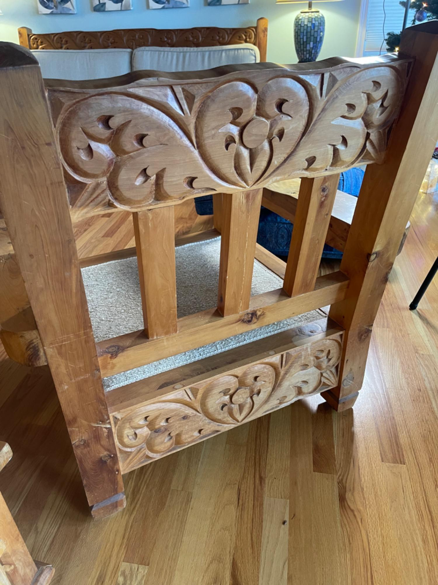 Vintage Hand Carved Solid Wood Chair From Mexico #1 This piece was brought up from Mexico and has passed through generations! There is some staining, scratches and splitting to wood from years of use. However, it is a well made piece that is holding together beautifully. Please see photos for proper representation of quality. Cushion is in good used condition.