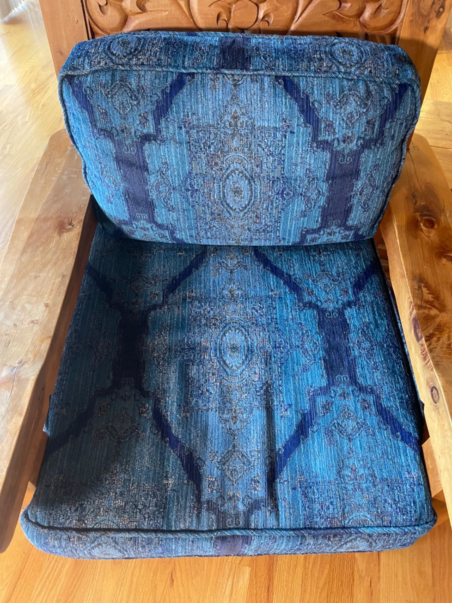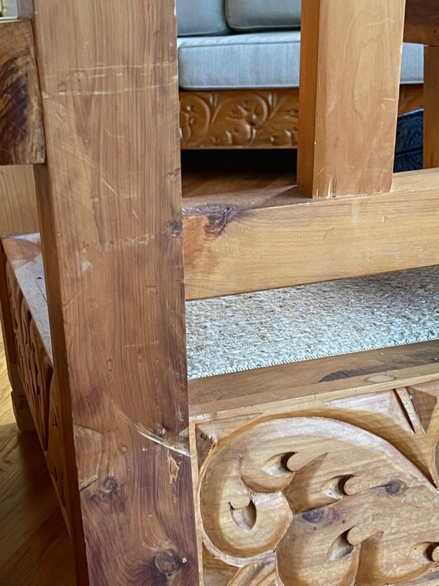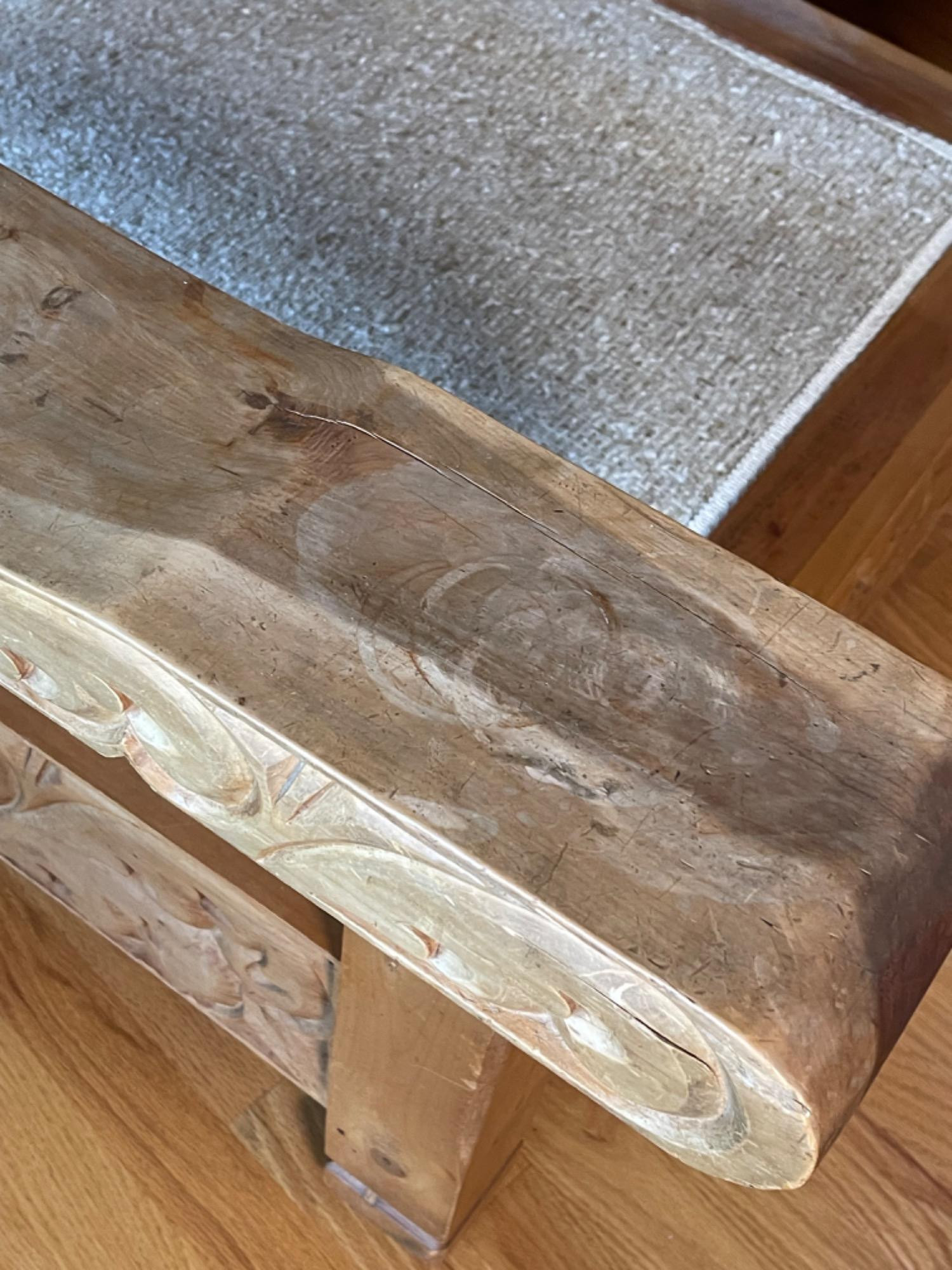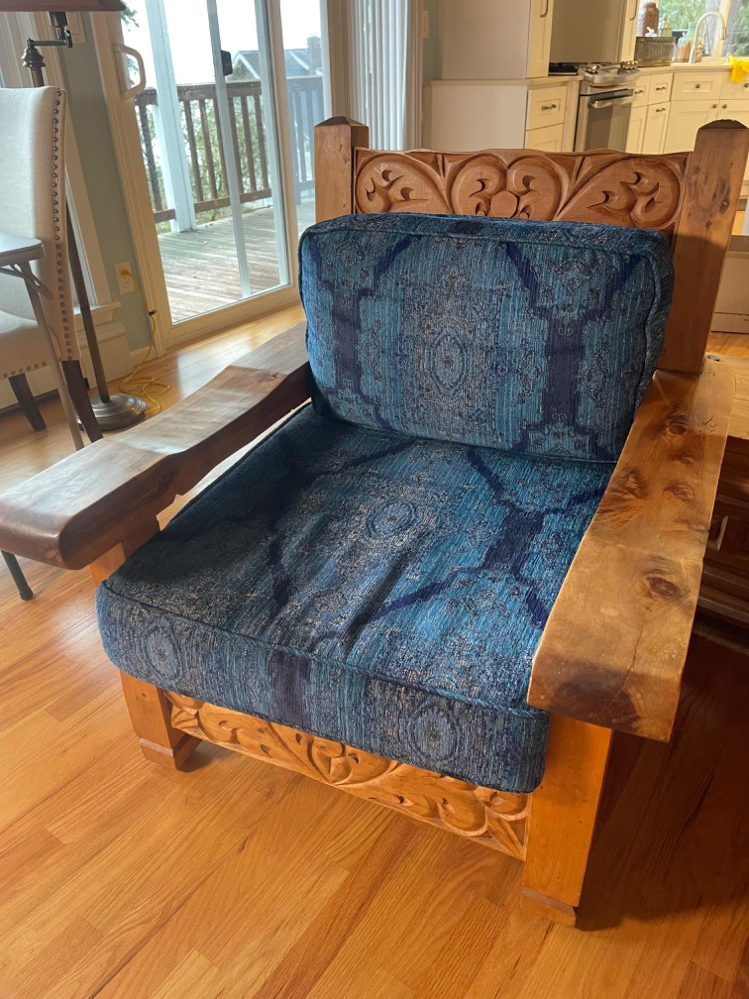 Vintage Hand Carved Solid Wood Chair From Mexico #1 This piece was brought up from Mexico and has passed through generations! There is some staining, scratches and splitting to wood from years of use. However, it is a well made piece that is holding together beautifully. Please see photos for proper representation of quality. Cushion is in good used condition.