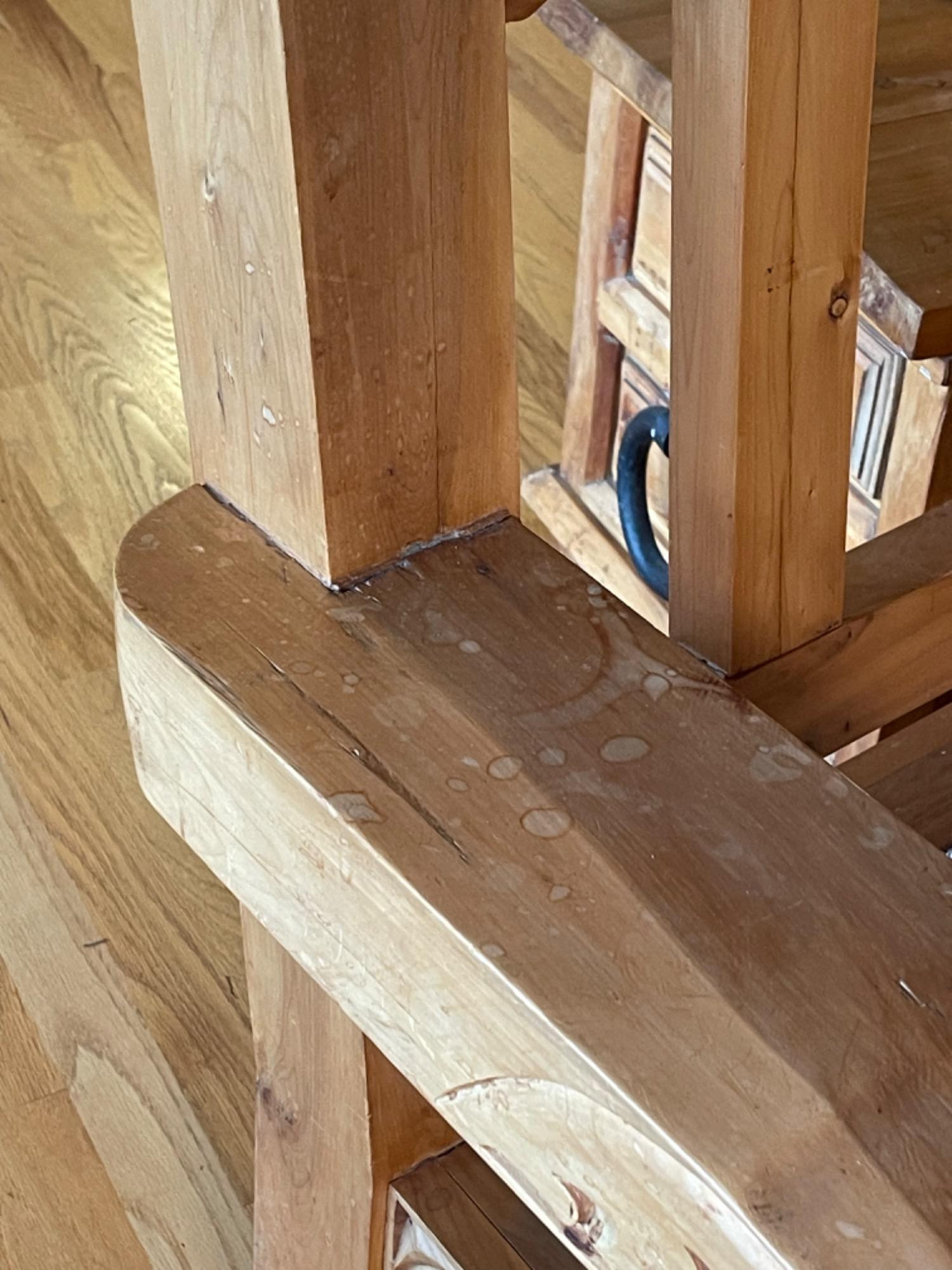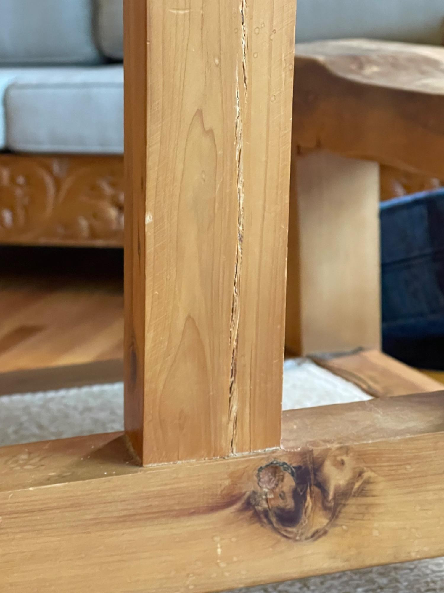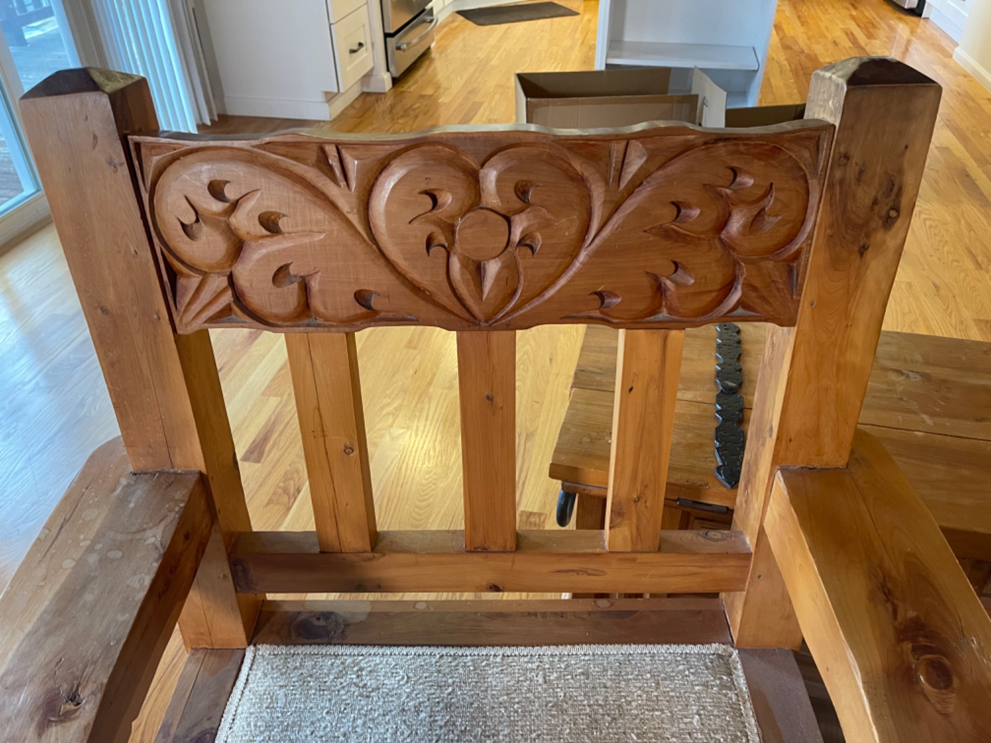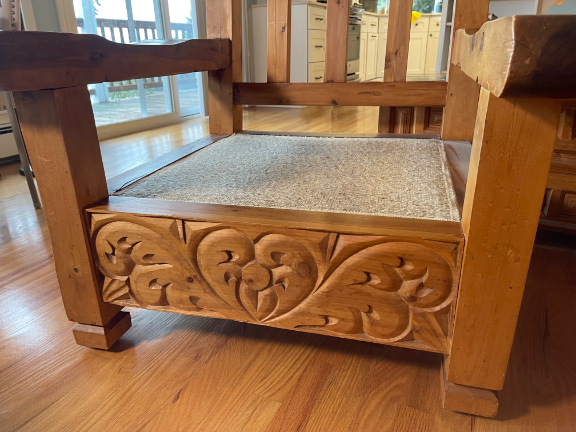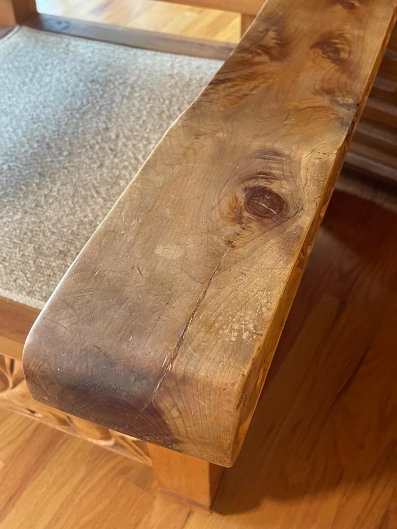 Vintage Hand Carved Solid Wood Chair From Mexico #1 This piece was brought up from Mexico and has passed through generations! There is some staining, scratches and splitting to wood from years of use. However, it is a well made piece that is holding together beautifully. Please see photos for proper representation of quality. Cushion is in good used condition.