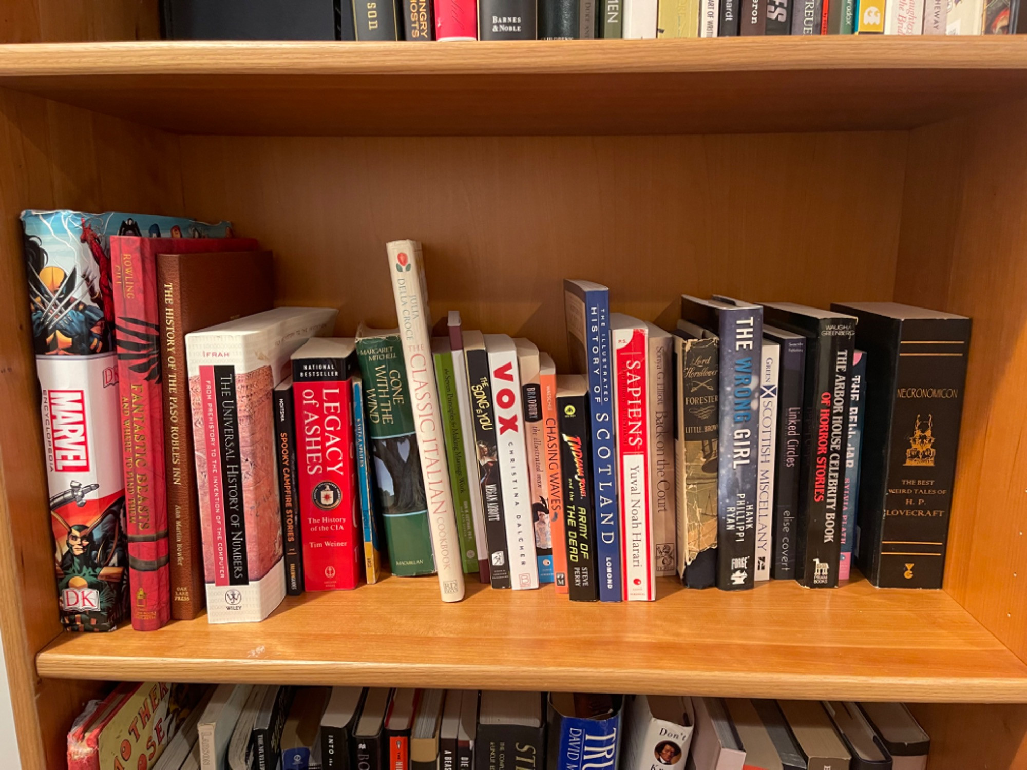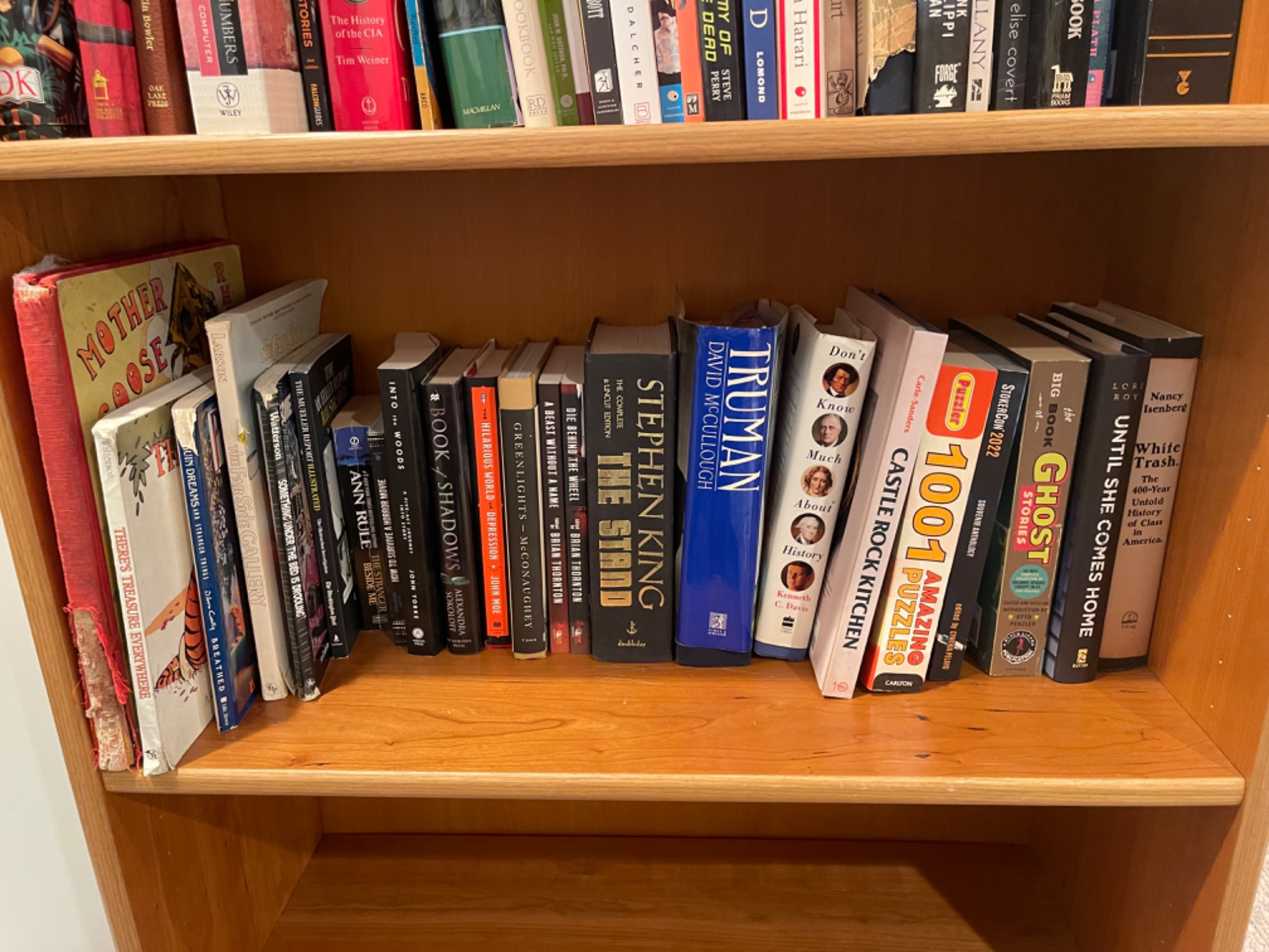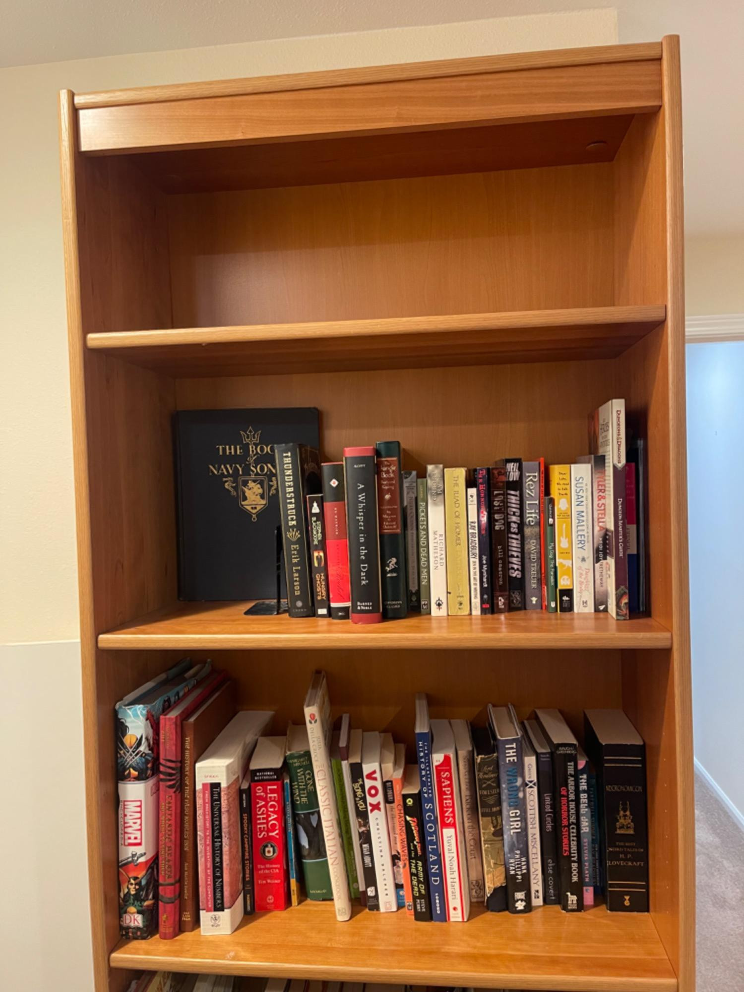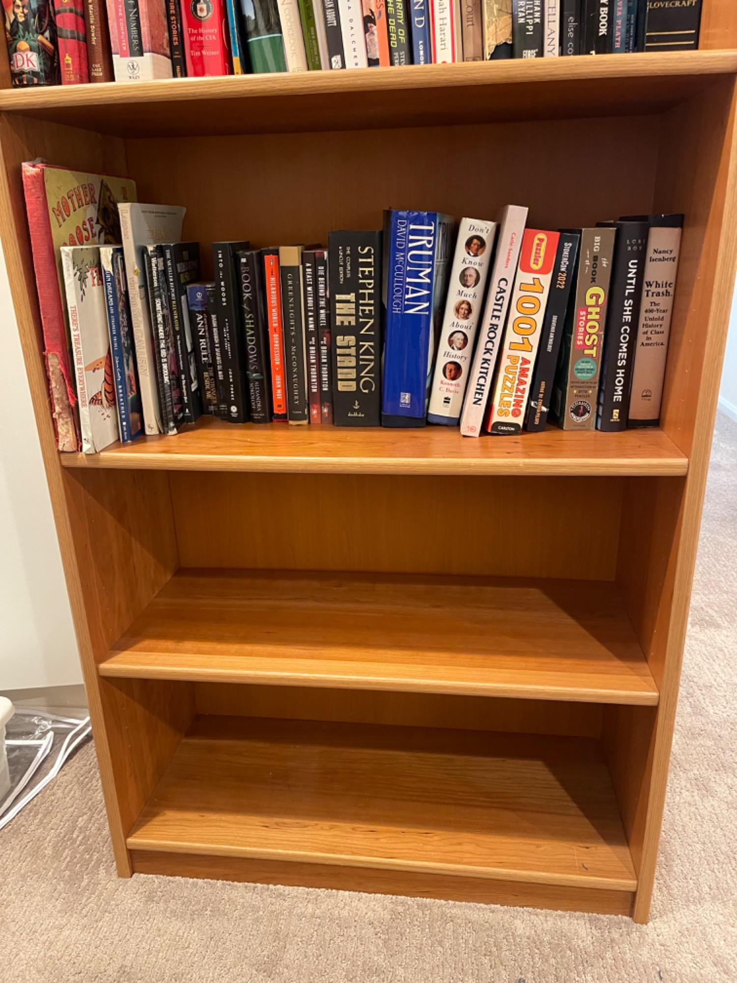 Tall Bookshelf and Books Bookshelf has some scratches and scuffs from years of use, but is in good sturdy condition. All books in photos are included in sale.