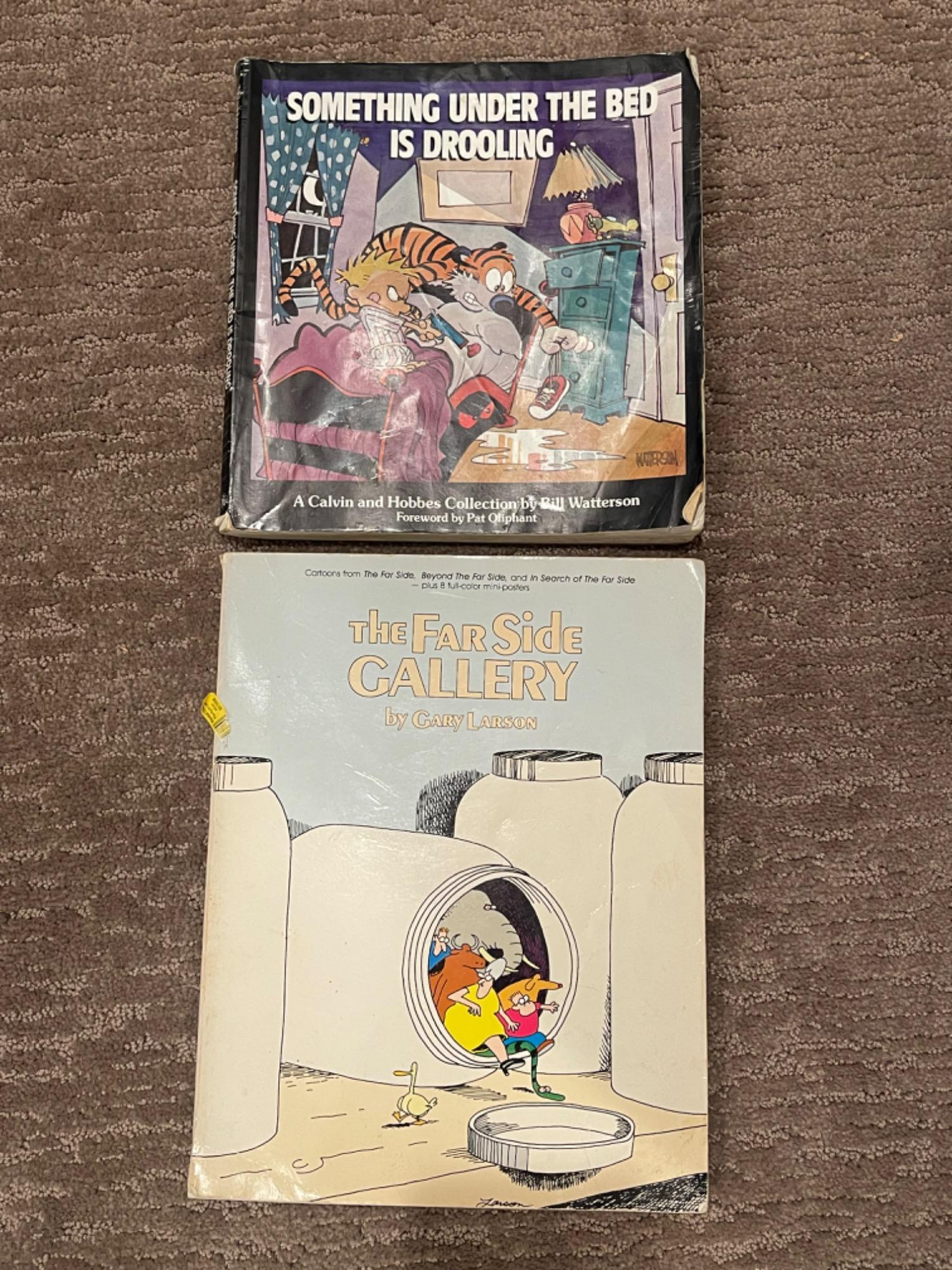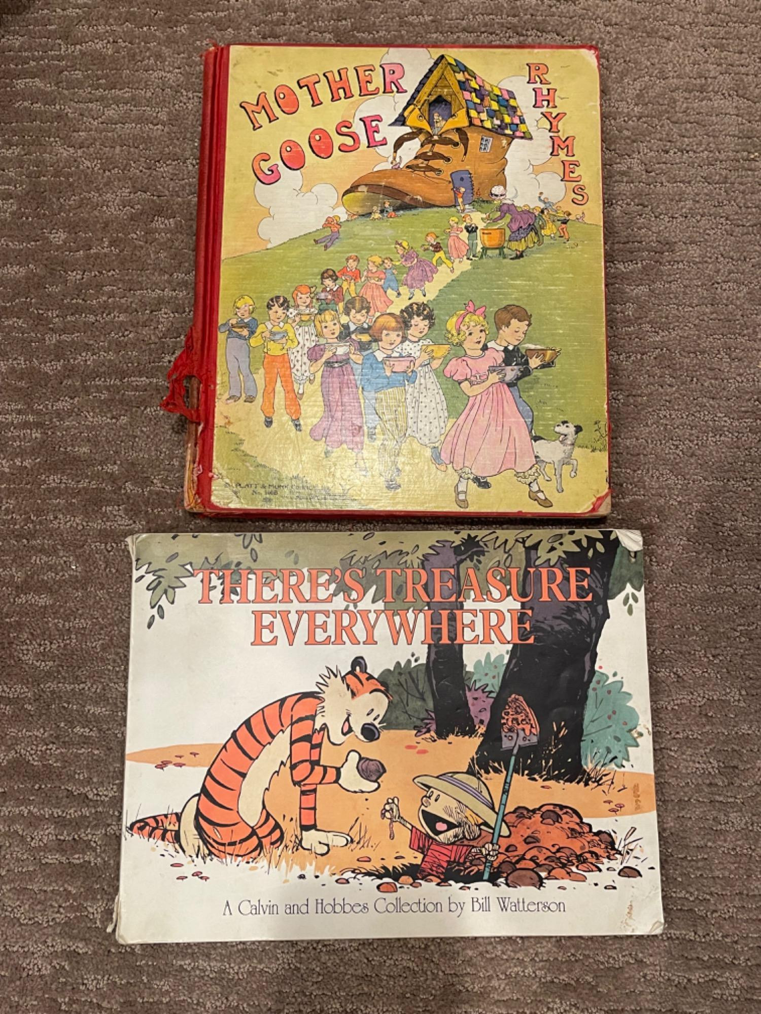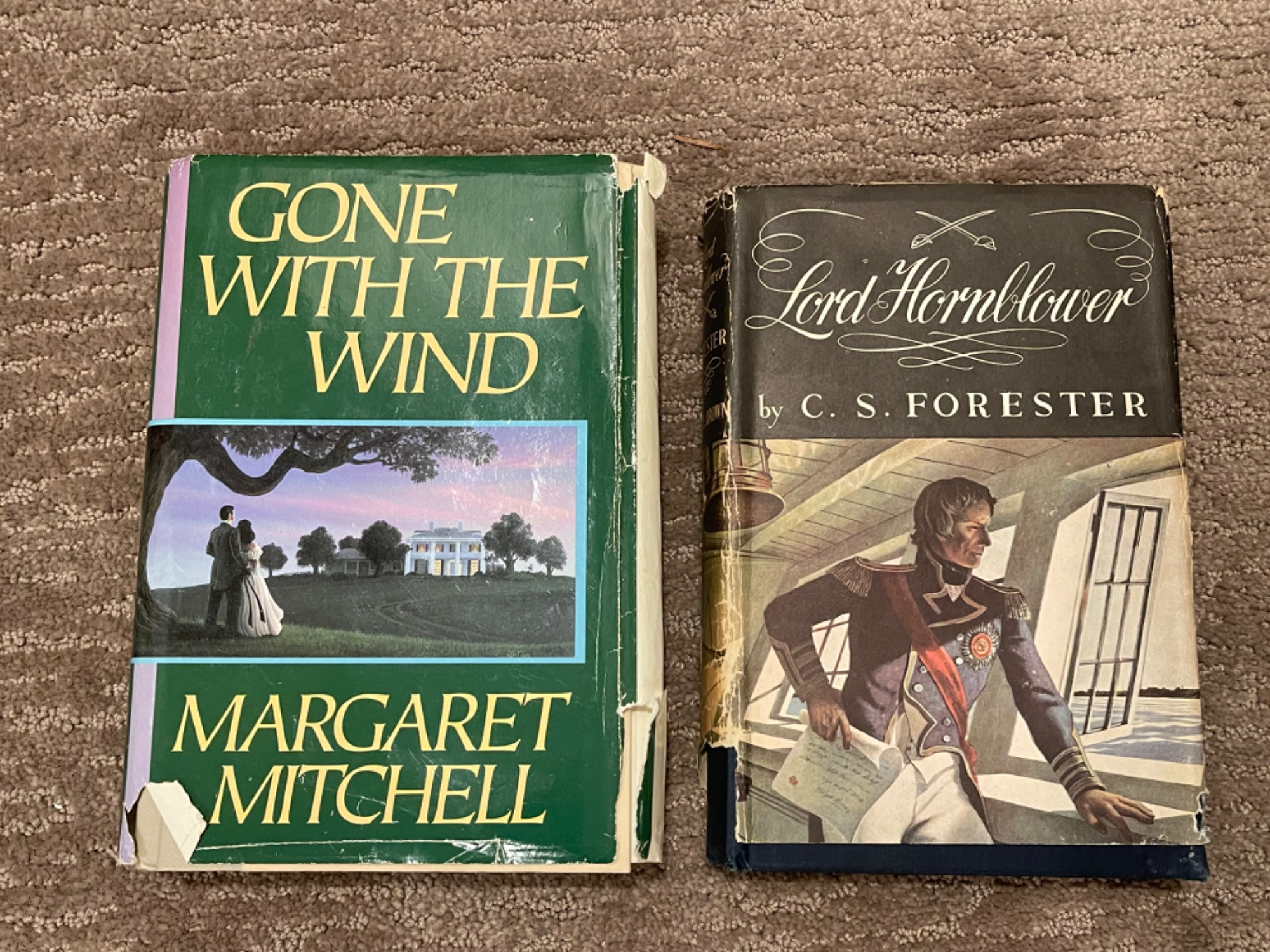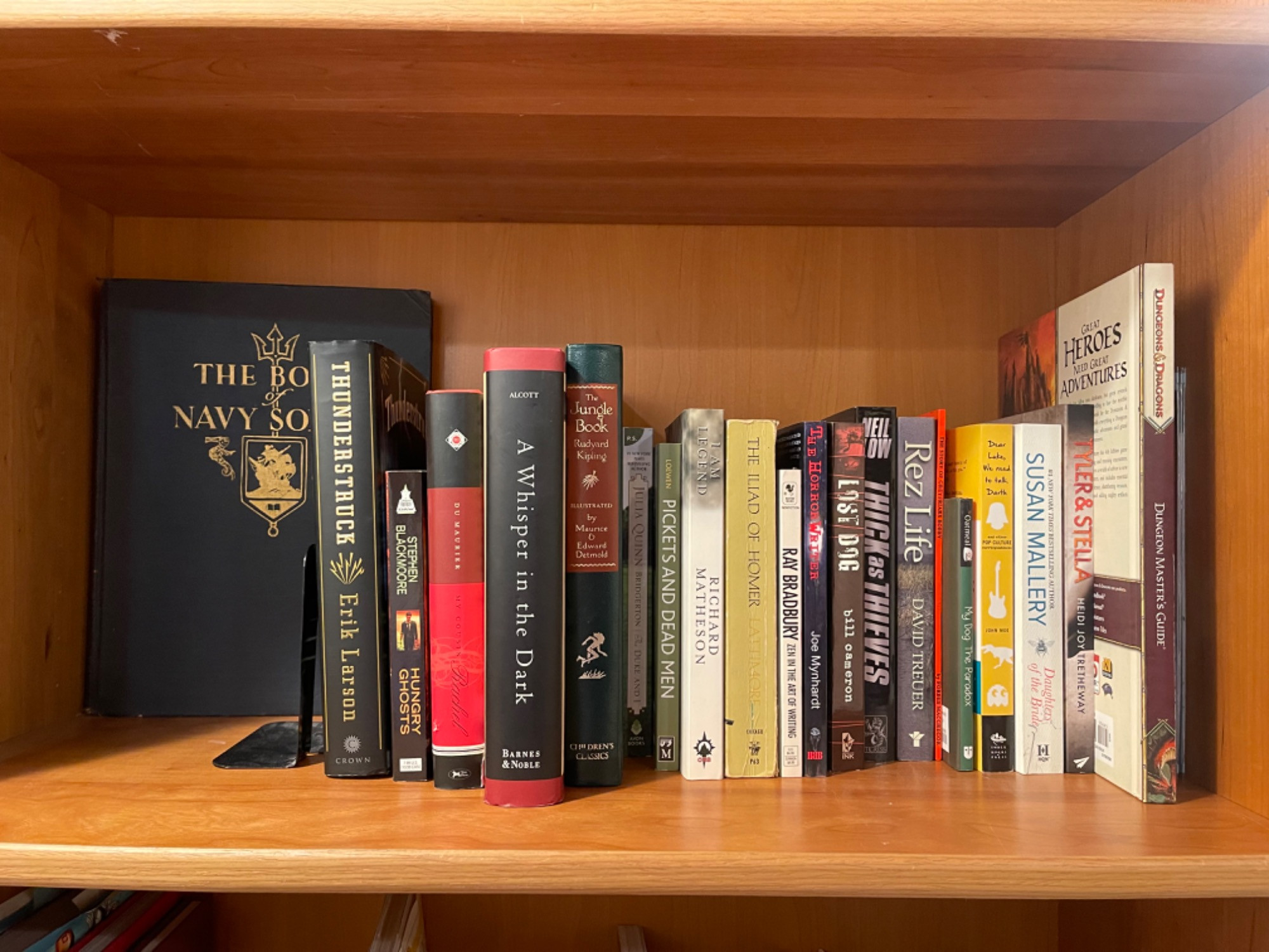 Tall Bookshelf and Books Bookshelf has some scratches and scuffs from years of use, but is in good sturdy condition. All books in photos are included in sale.