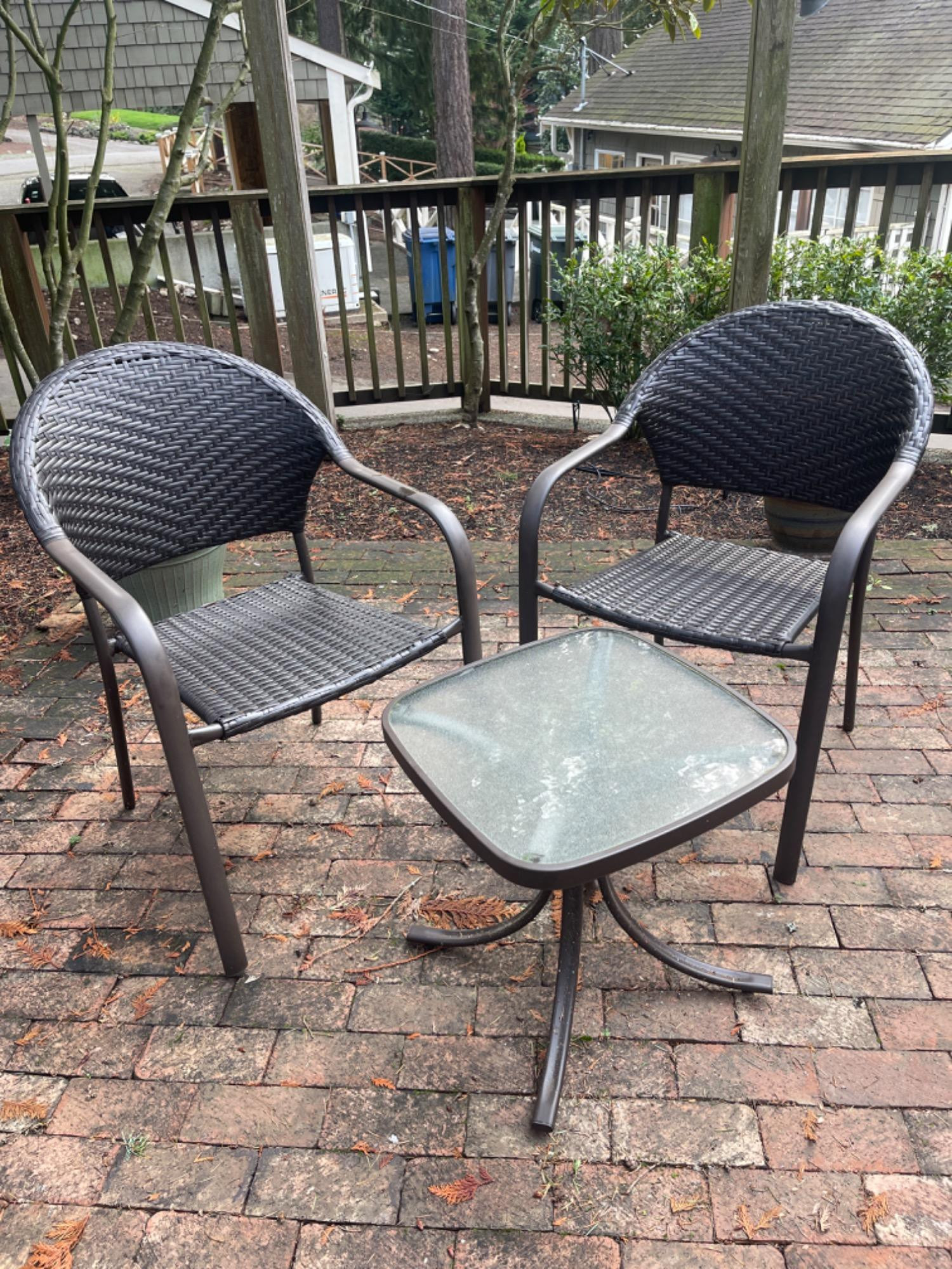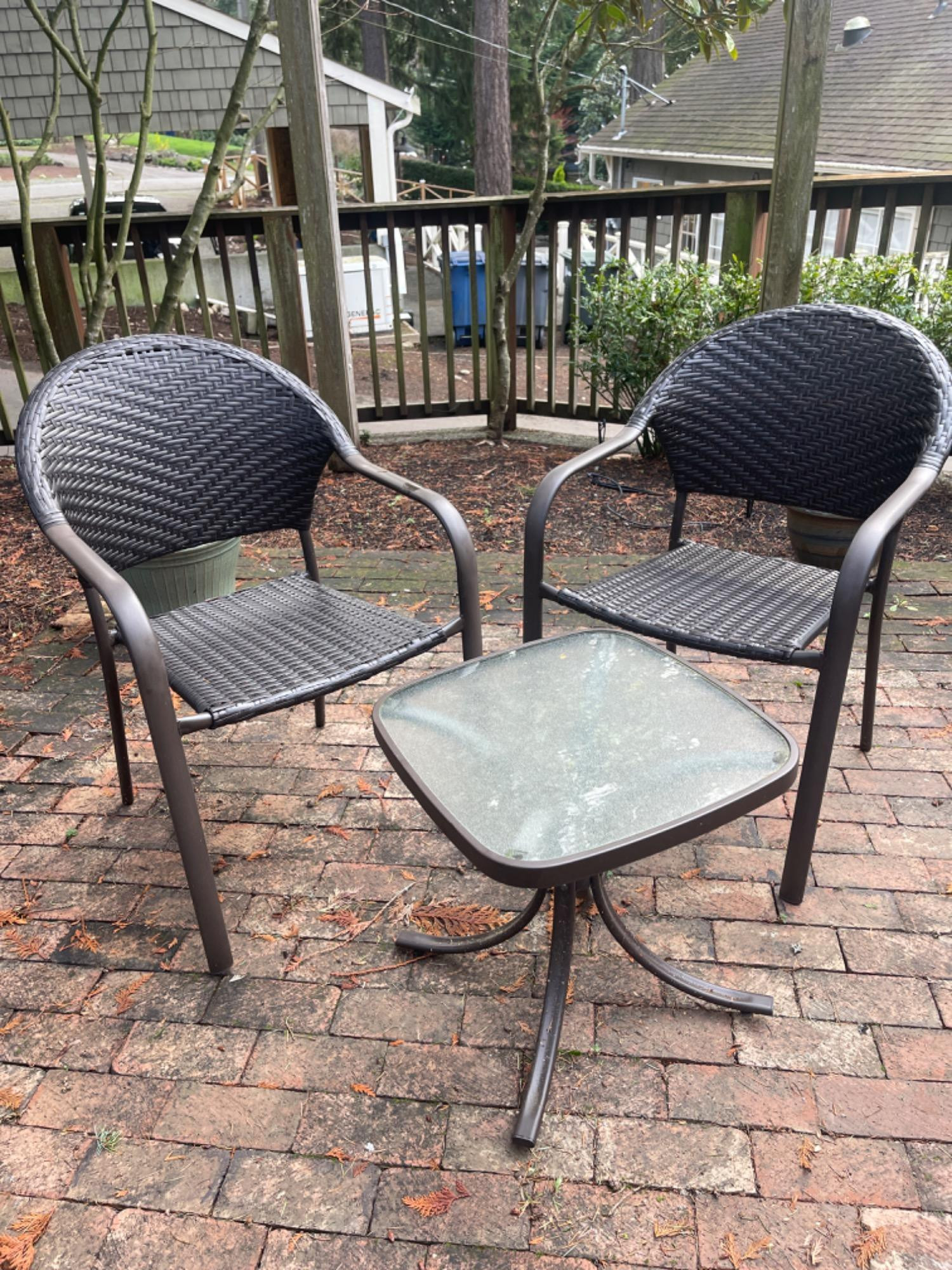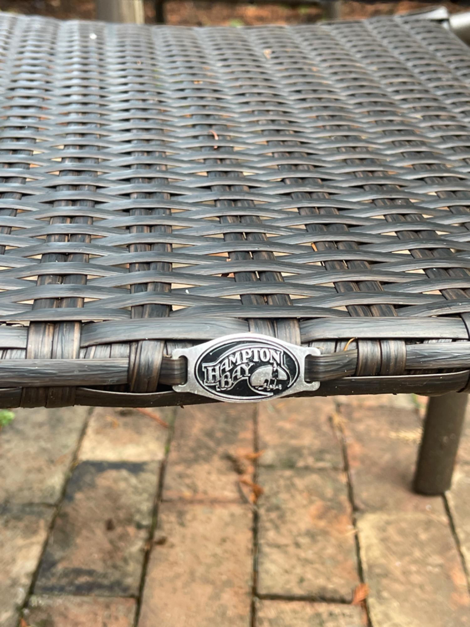 Hampton Bay Outdoor Table and Chairs All likely need a good deep cleaning, but are in good sturdy condition. Chairs: 22" L x 20" W x 33.5" H Table: 18" L x 18" W x 18" H