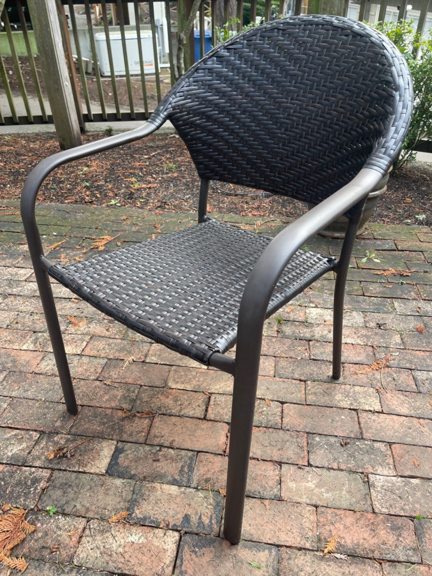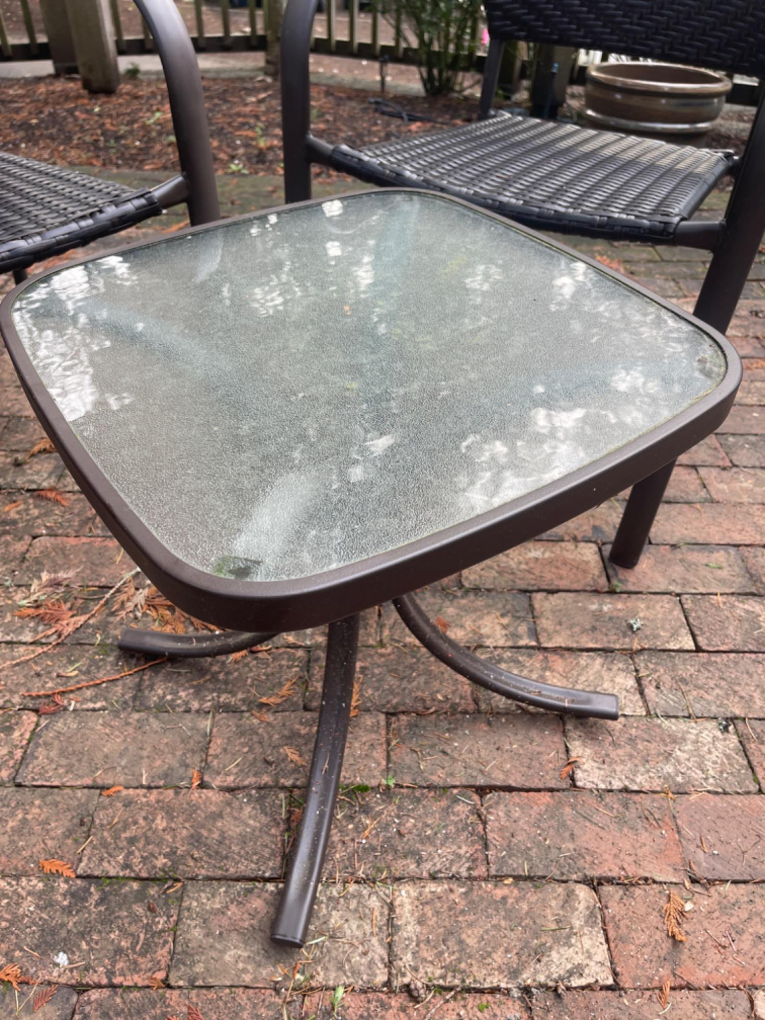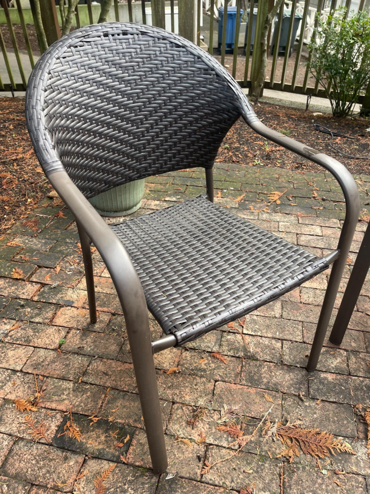 Hampton Bay Outdoor Table and Chairs All likely need a good deep cleaning, but are in good sturdy condition. Chairs: 22" L x 20" W x 33.5" H Table: 18" L x 18" W x 18" H