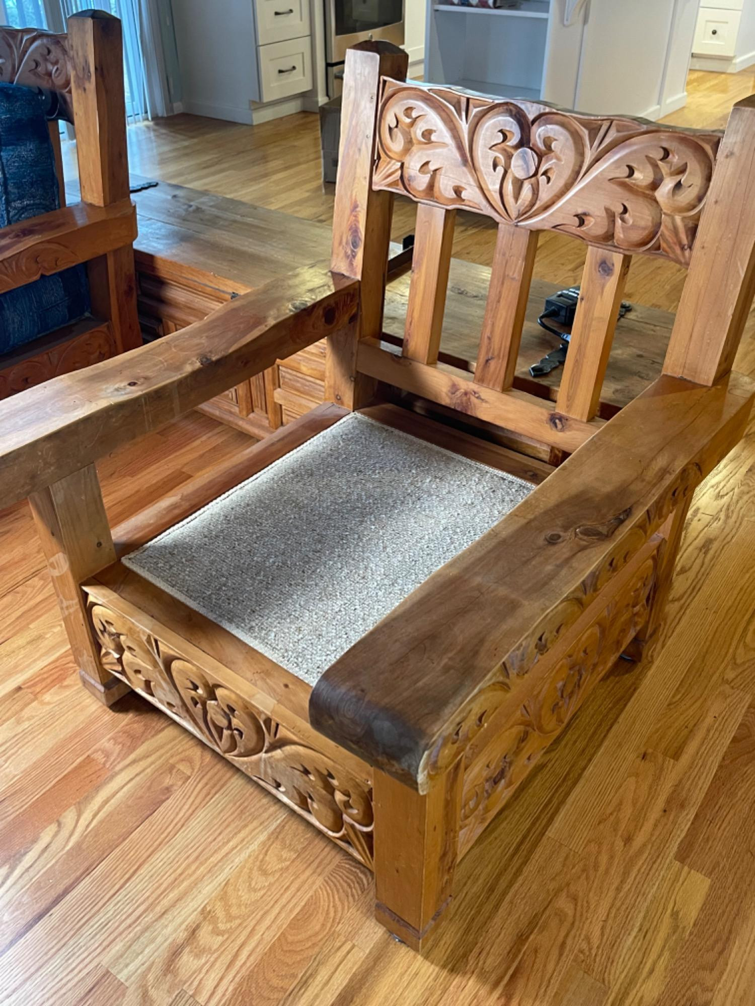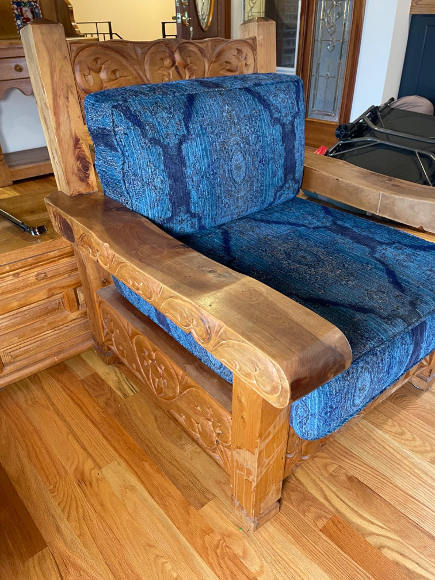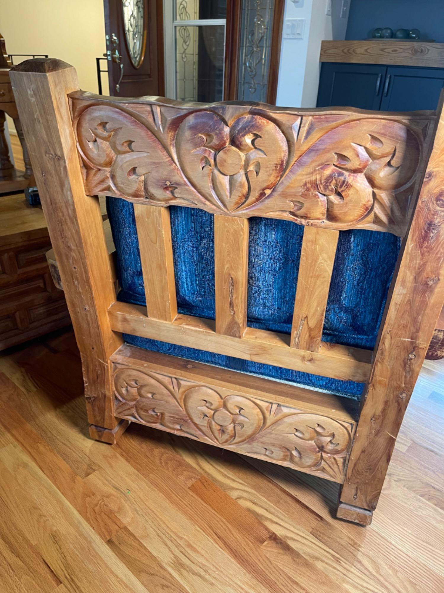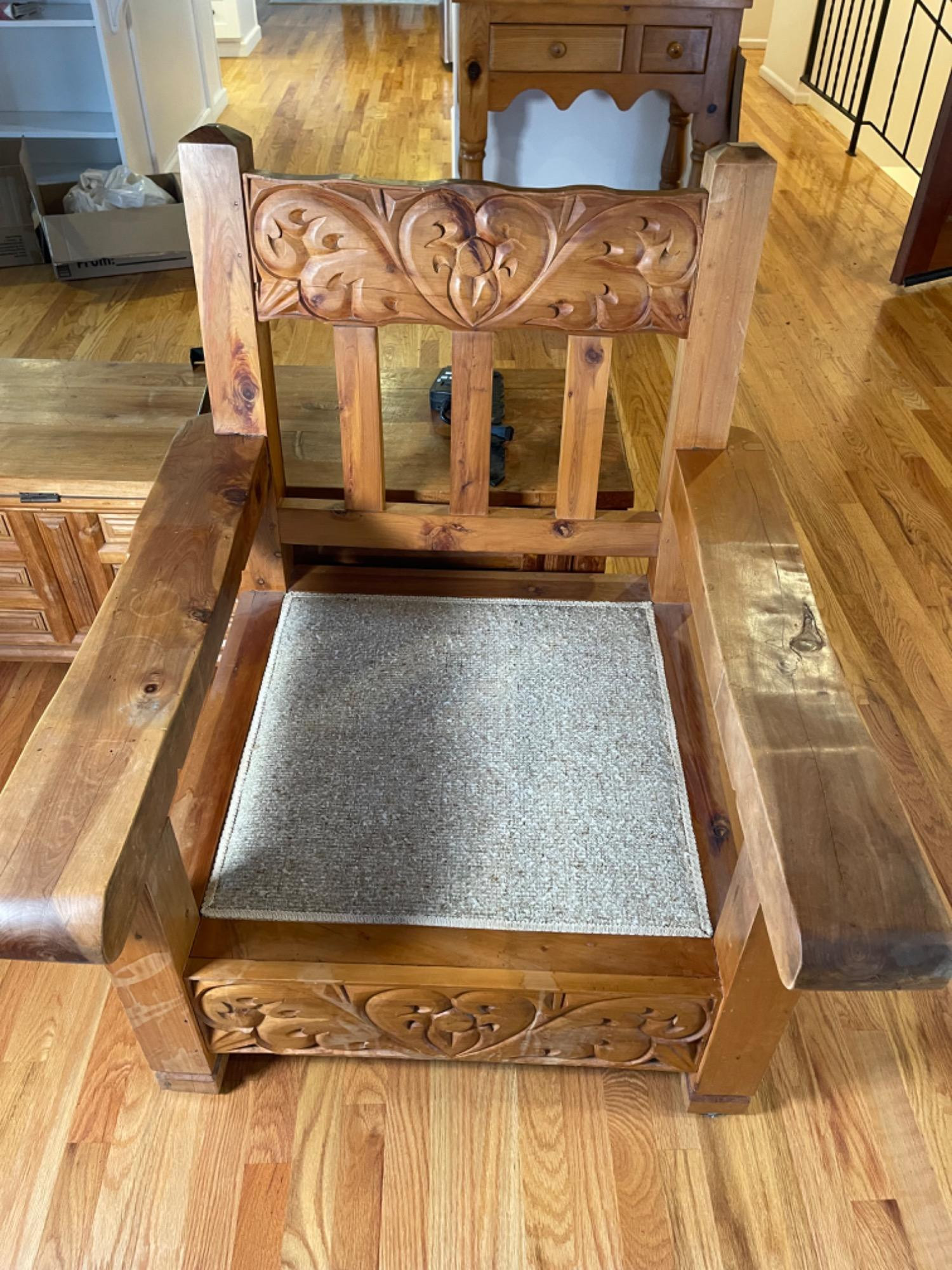 Vintage Hand Carved Solid Wood Chair From Mexico #2 This piece was brought up from Mexico and has passed through generations! There is some staining, scratches and splitting to wood from years of use. However, it is a well made piece that is holding together beautifully. Please see photos for proper representation of quality. Cushion is in good used condition.