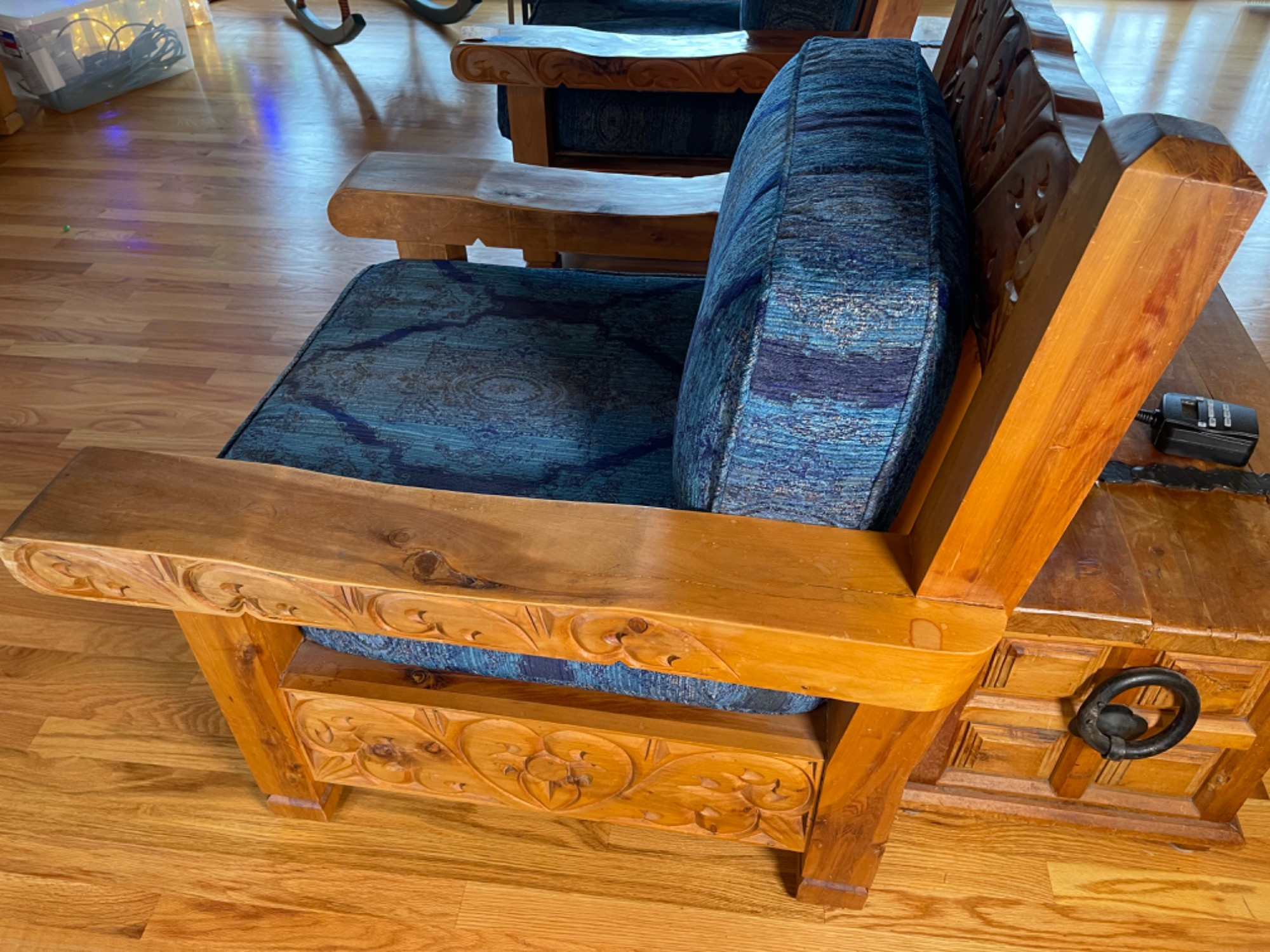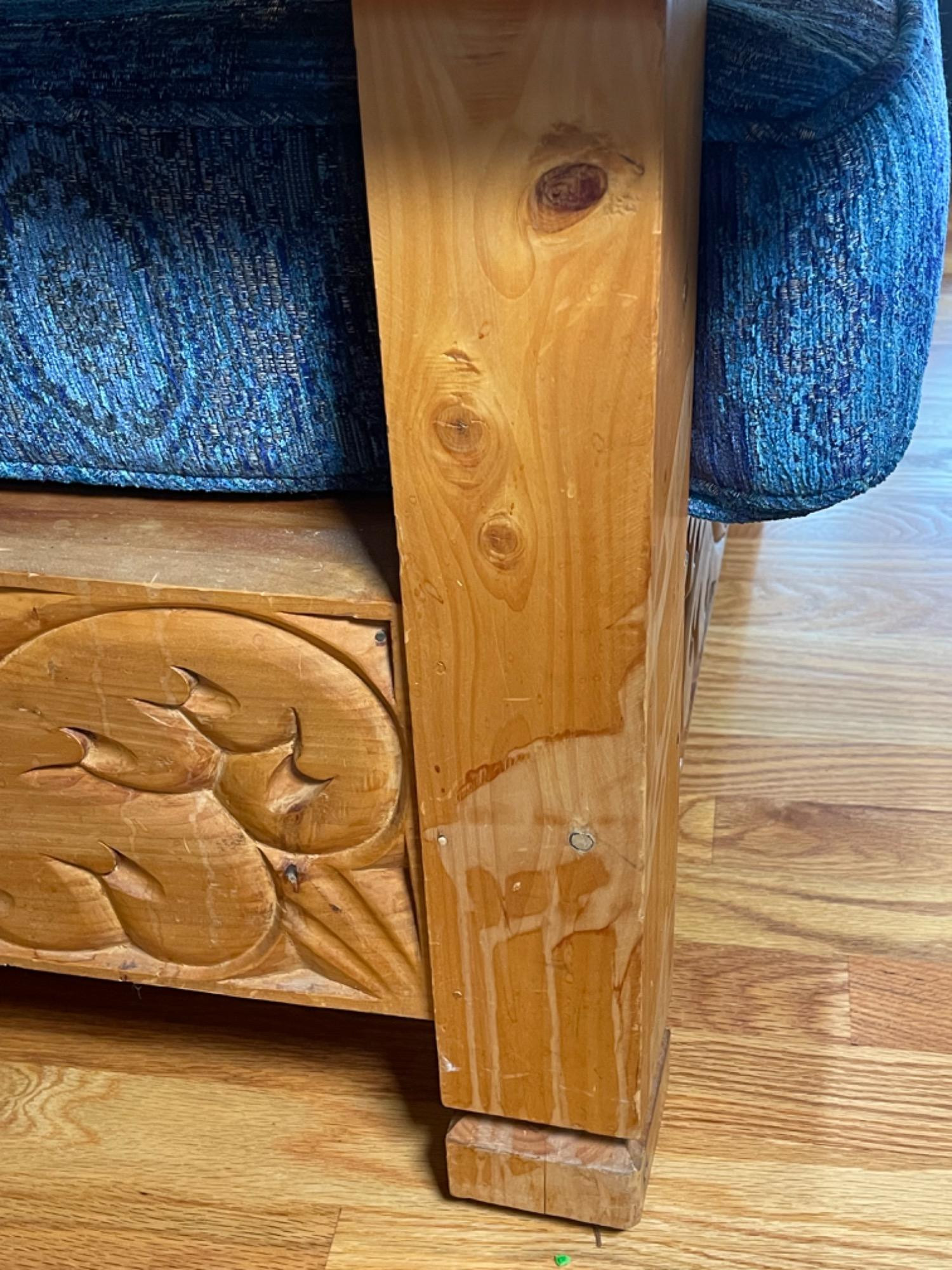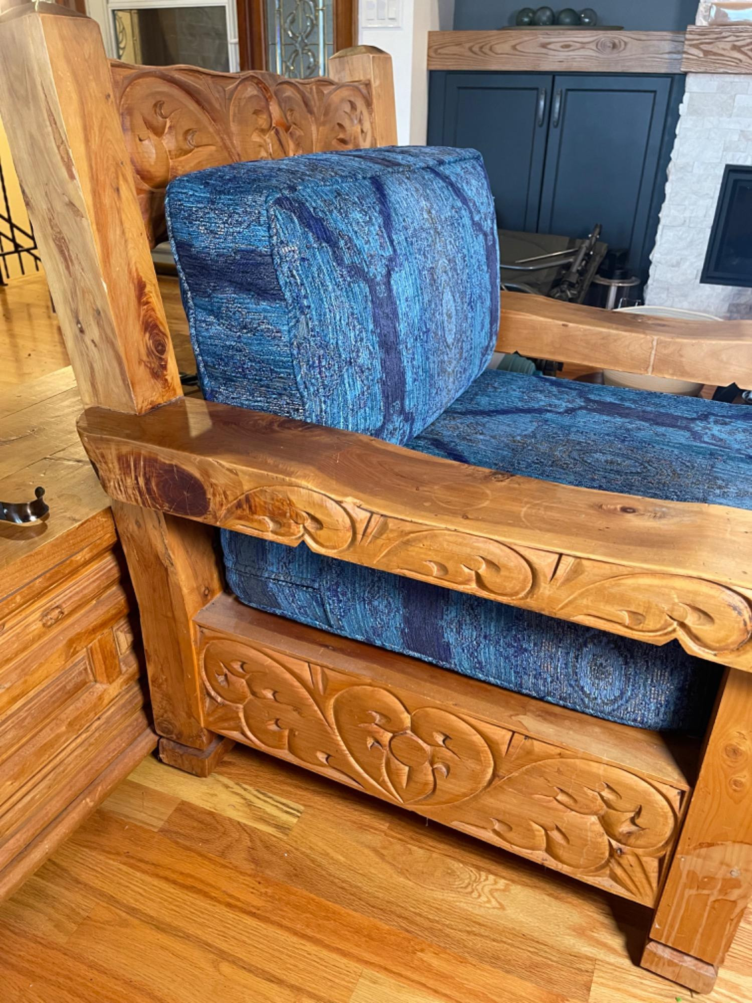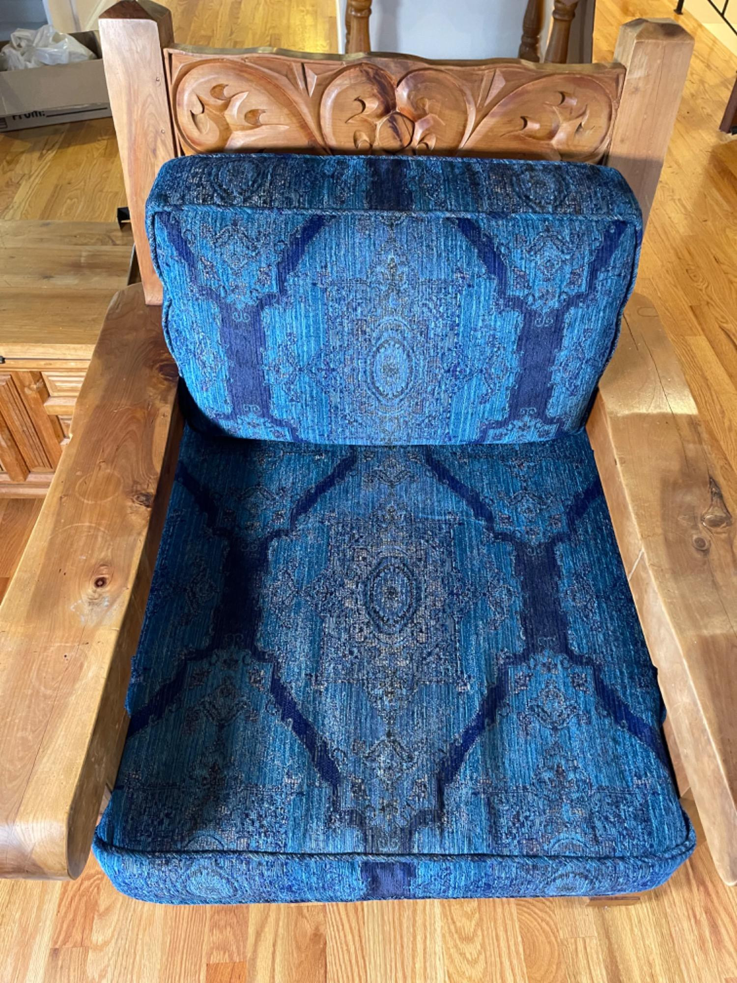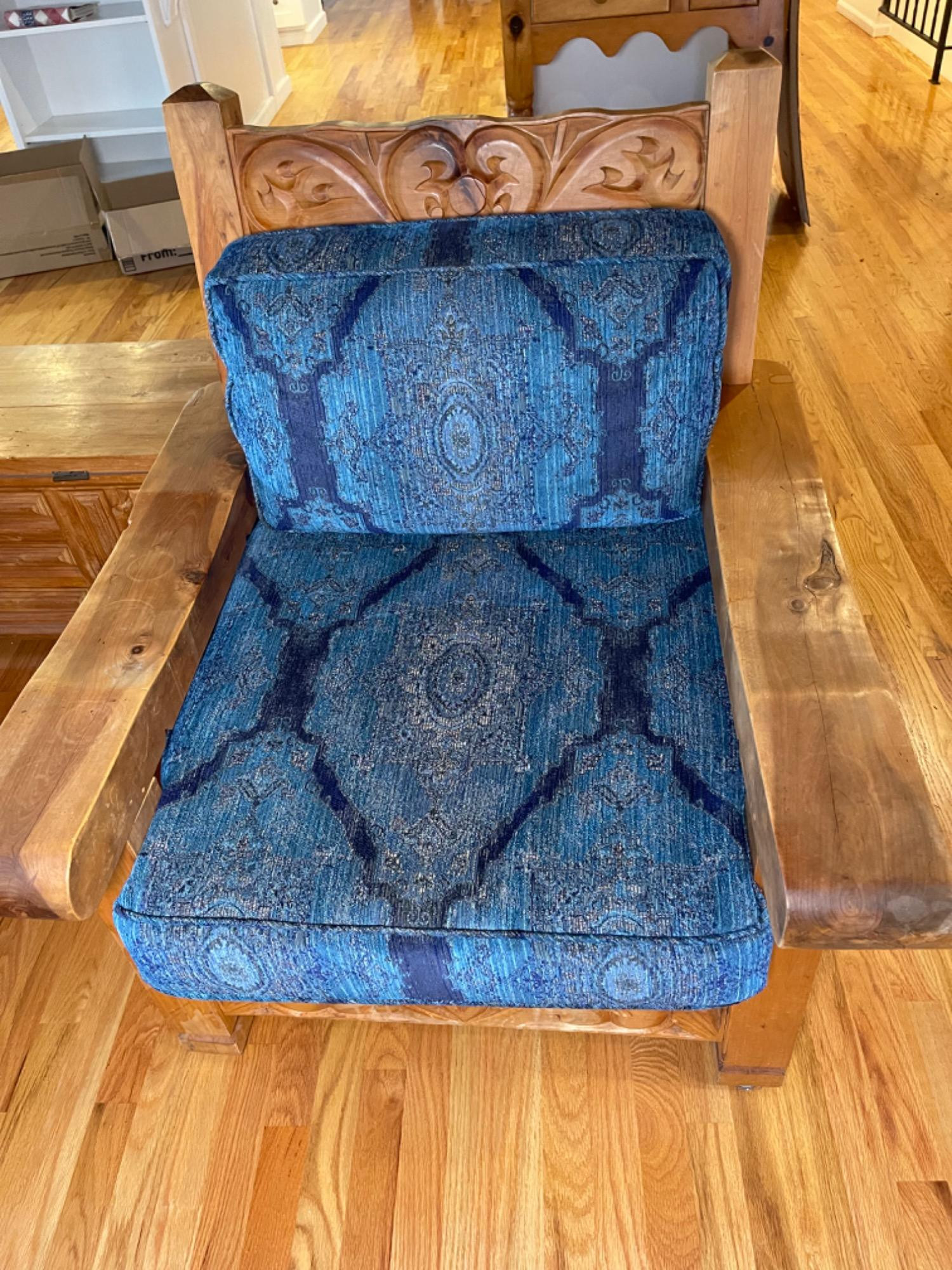 Vintage Hand Carved Solid Wood Chair From Mexico #2 This piece was brought up from Mexico and has passed through generations! There is some staining, scratches and splitting to wood from years of use. However, it is a well made piece that is holding together beautifully. Please see photos for proper representation of quality. Cushion is in good used condition.