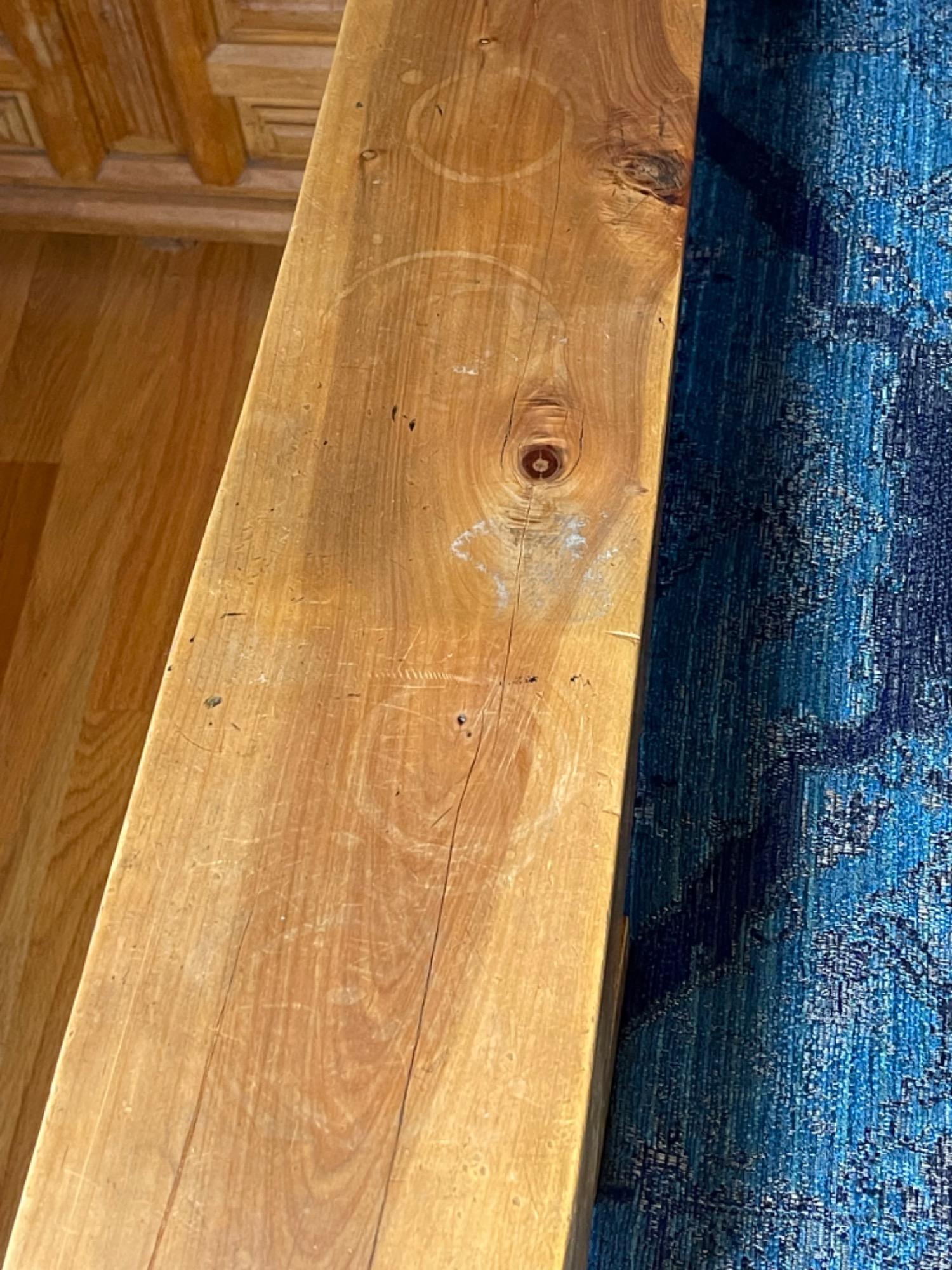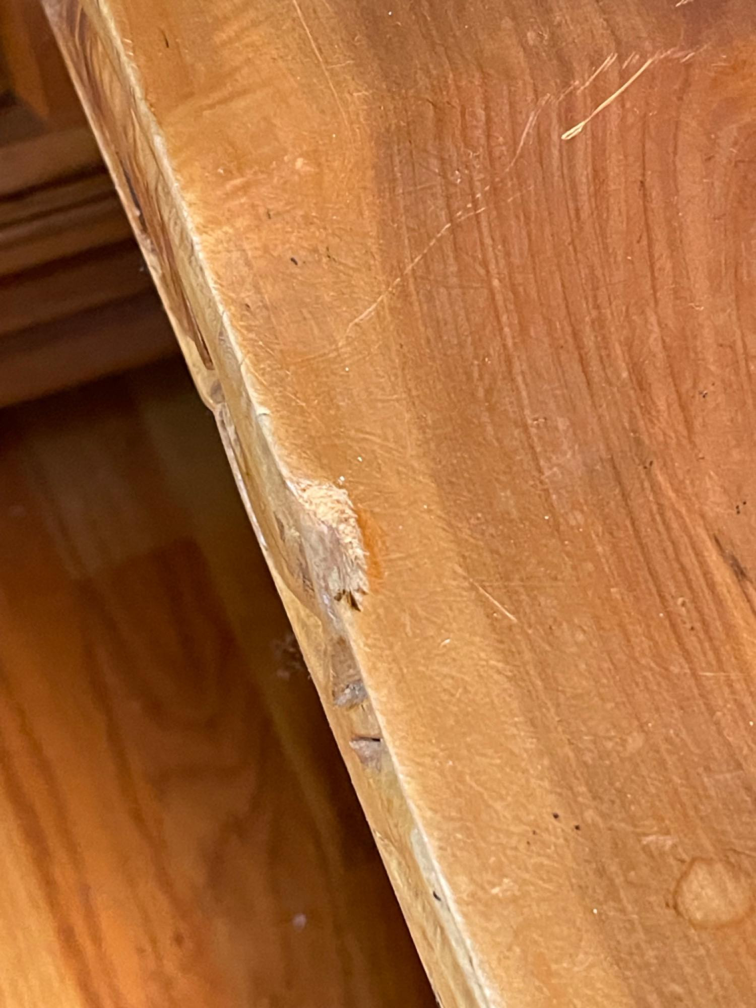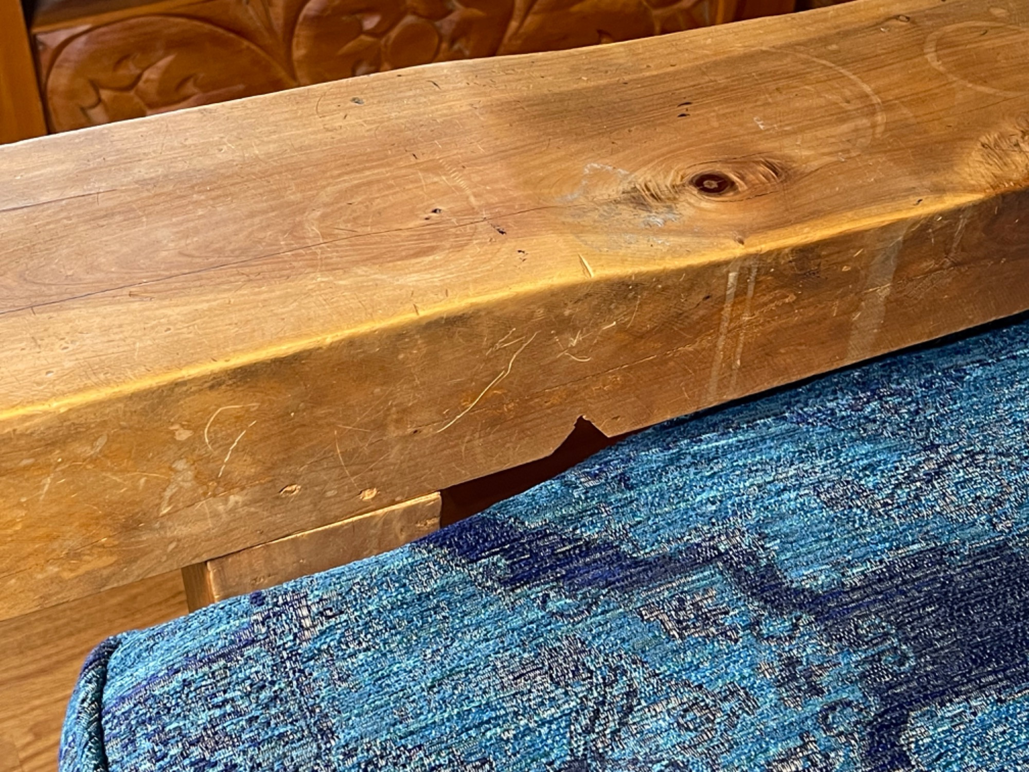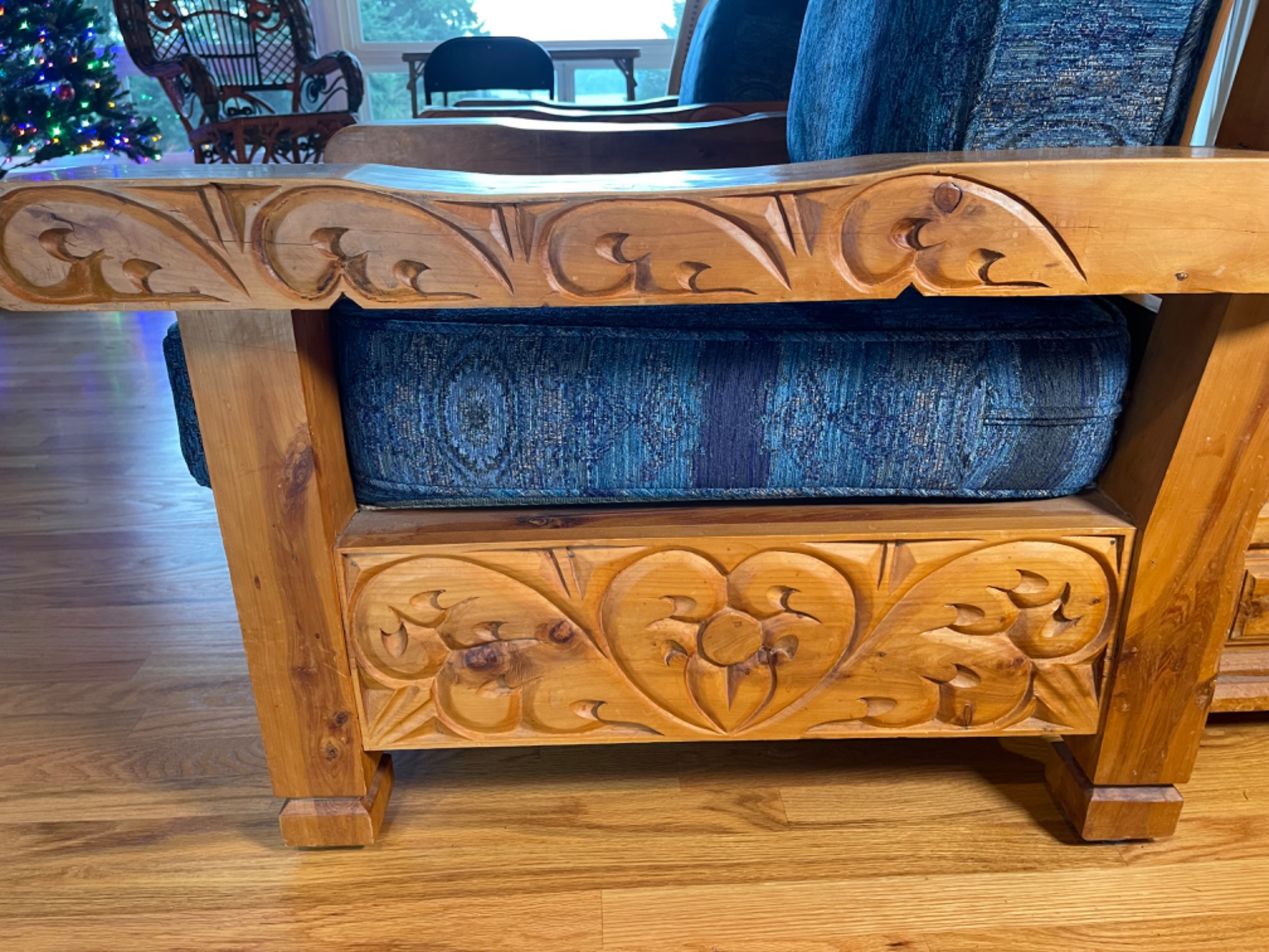 Vintage Hand Carved Solid Wood Chair From Mexico #2 This piece was brought up from Mexico and has passed through generations! There is some staining, scratches and splitting to wood from years of use. However, it is a well made piece that is holding together beautifully. Please see photos for proper representation of quality. Cushion is in good used condition.