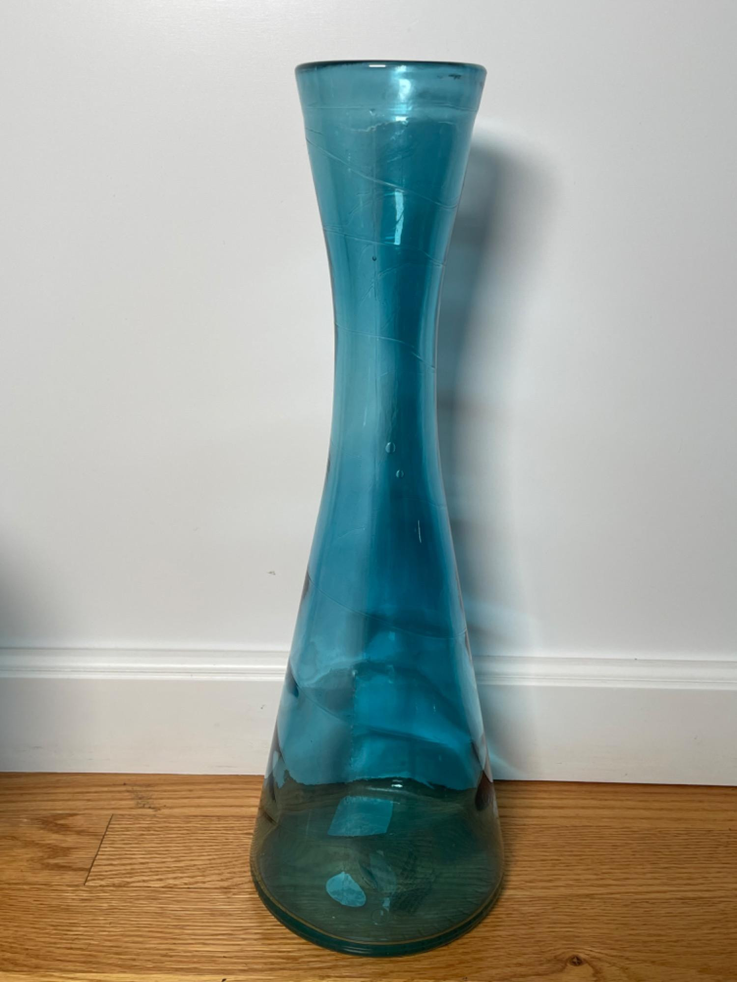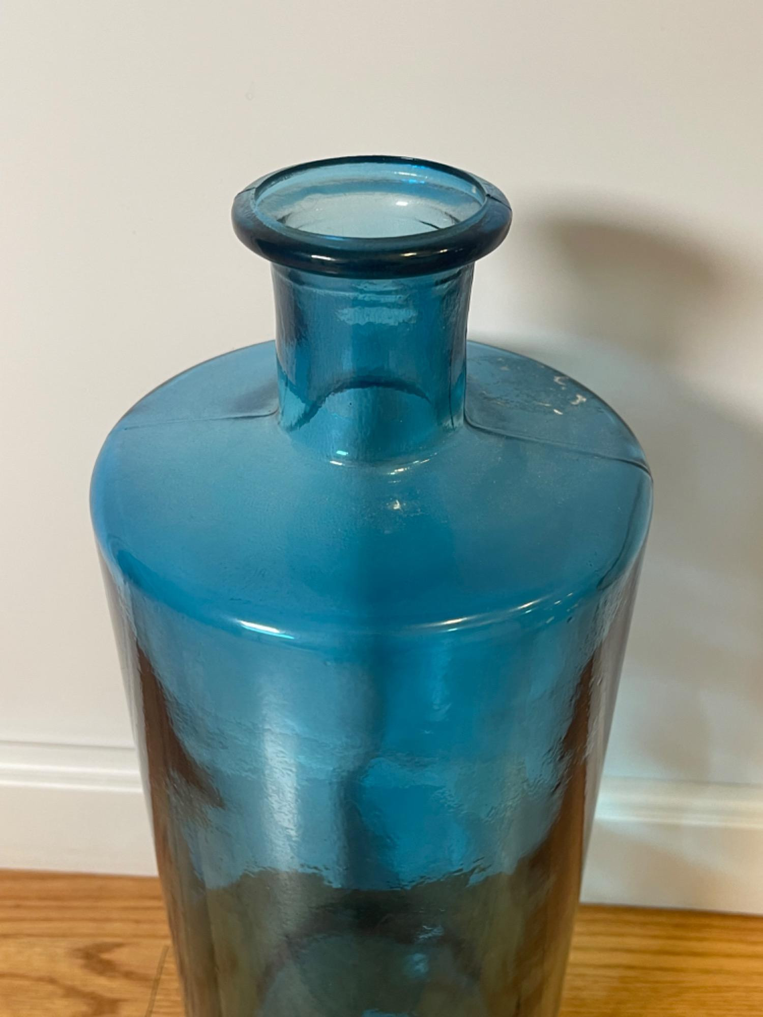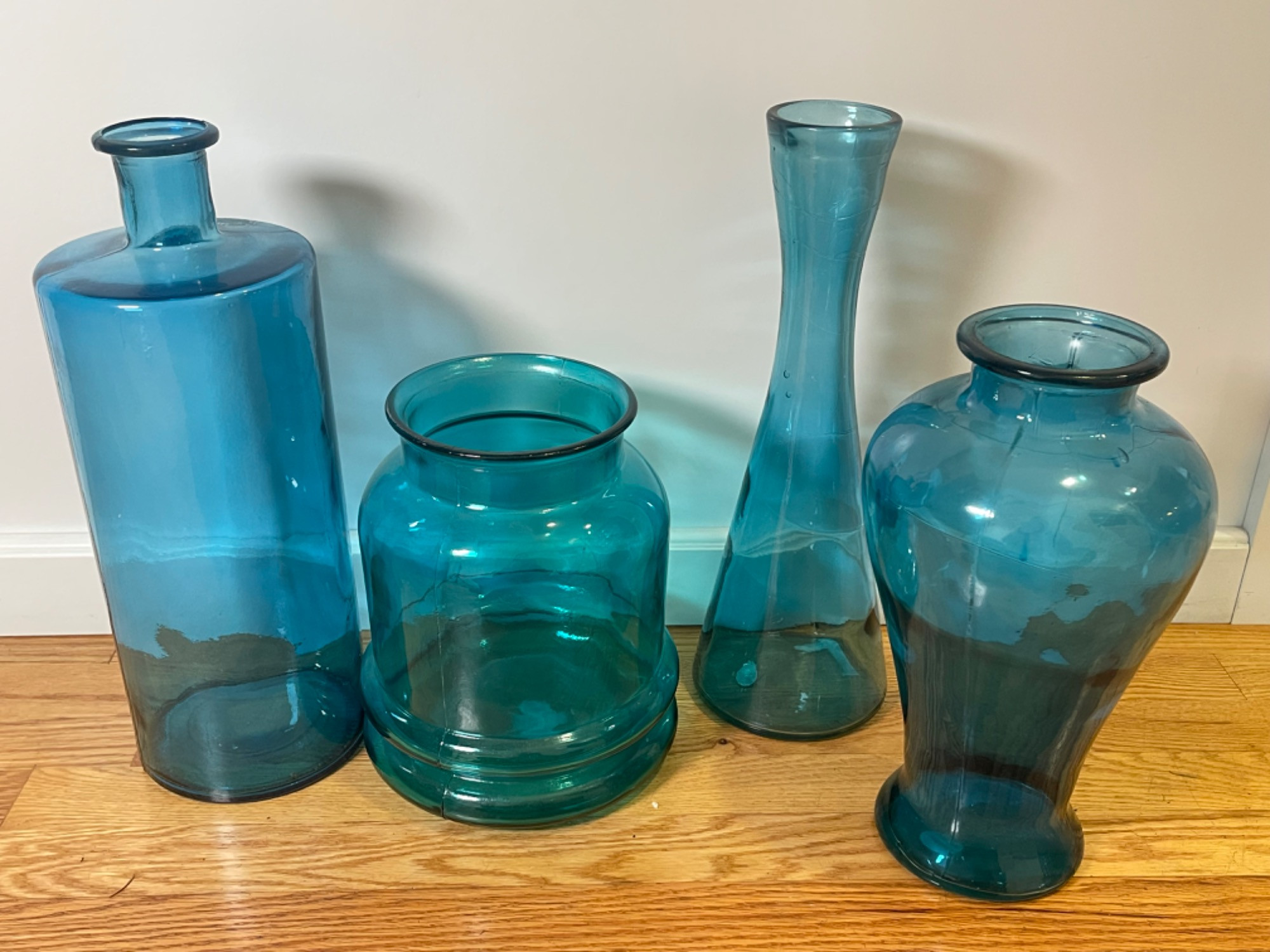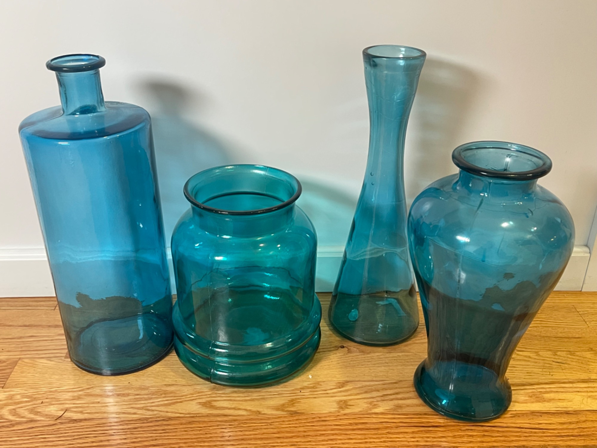 Beautiful Blue Glass Vase Decor All have some scratches and scuffs, but are in good condition. Smallest: 10" H Largest: 16" H