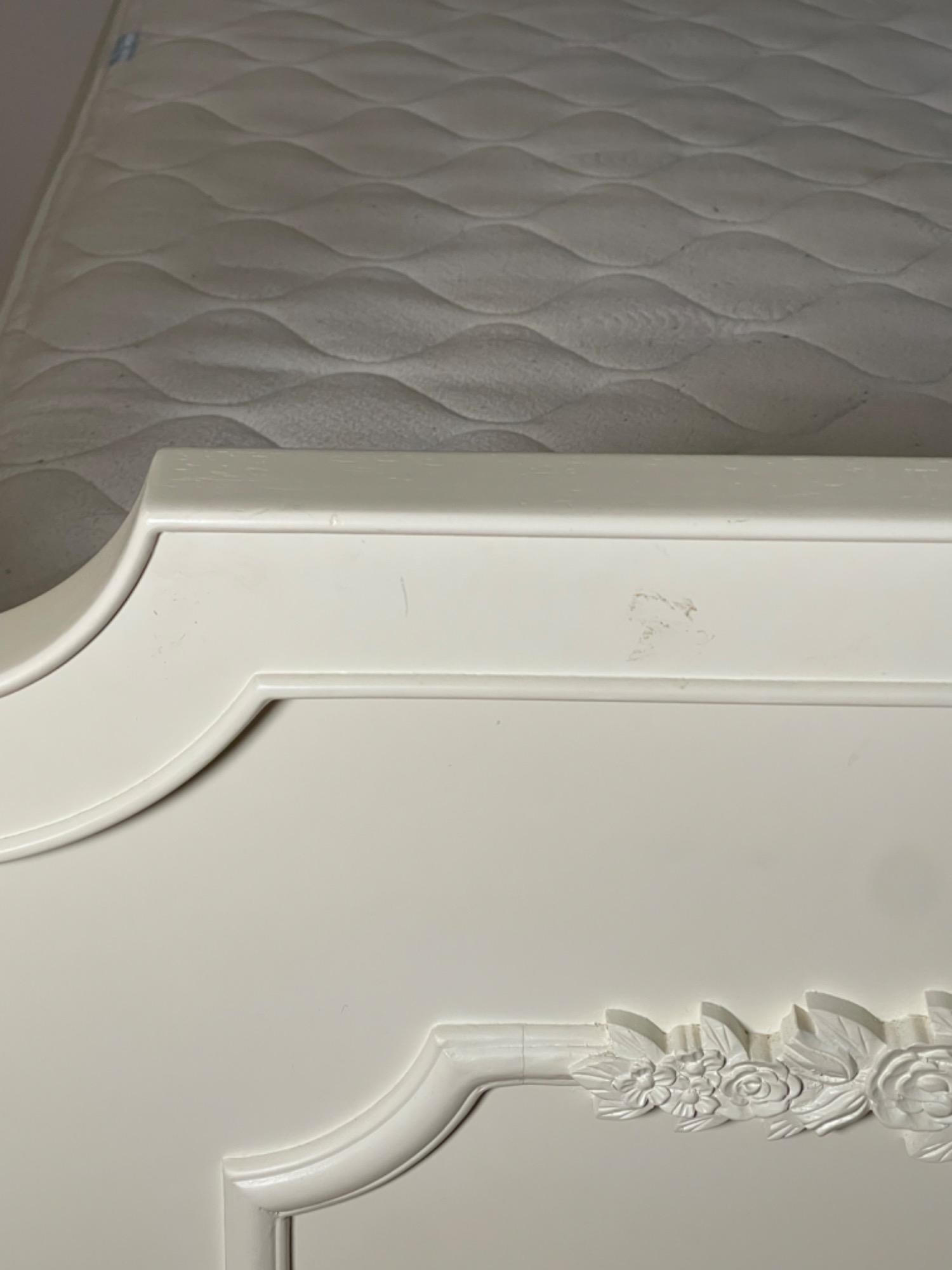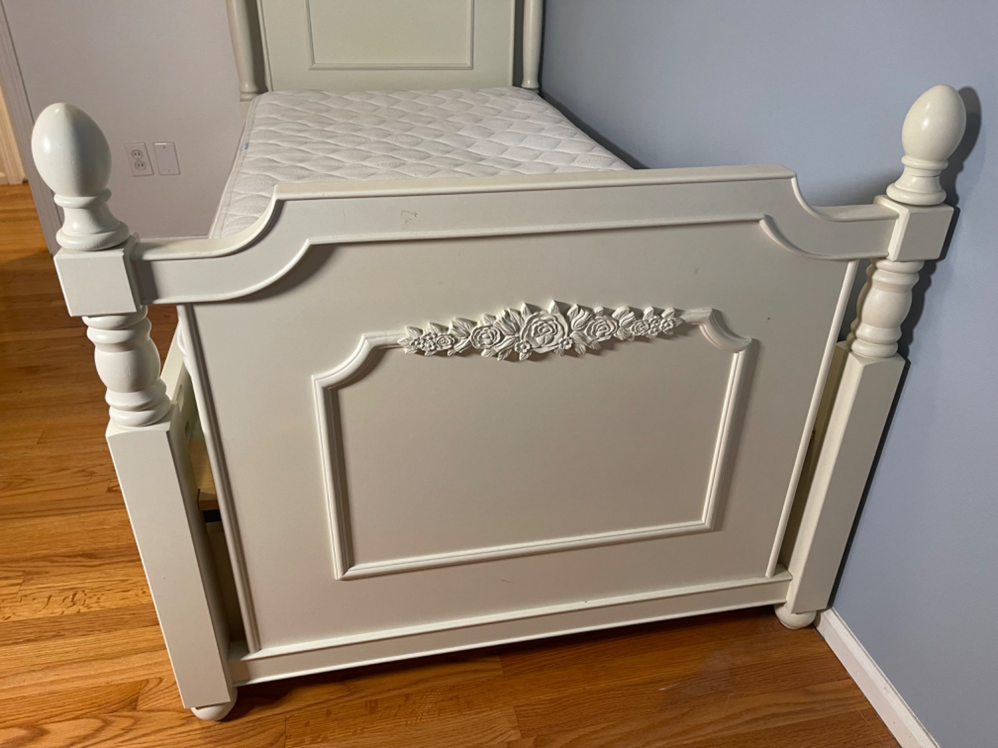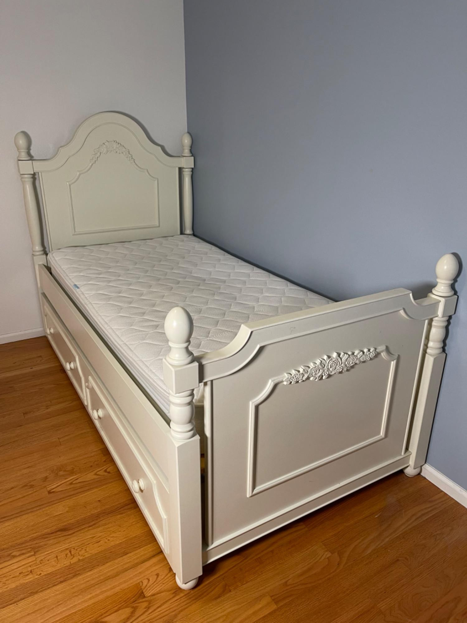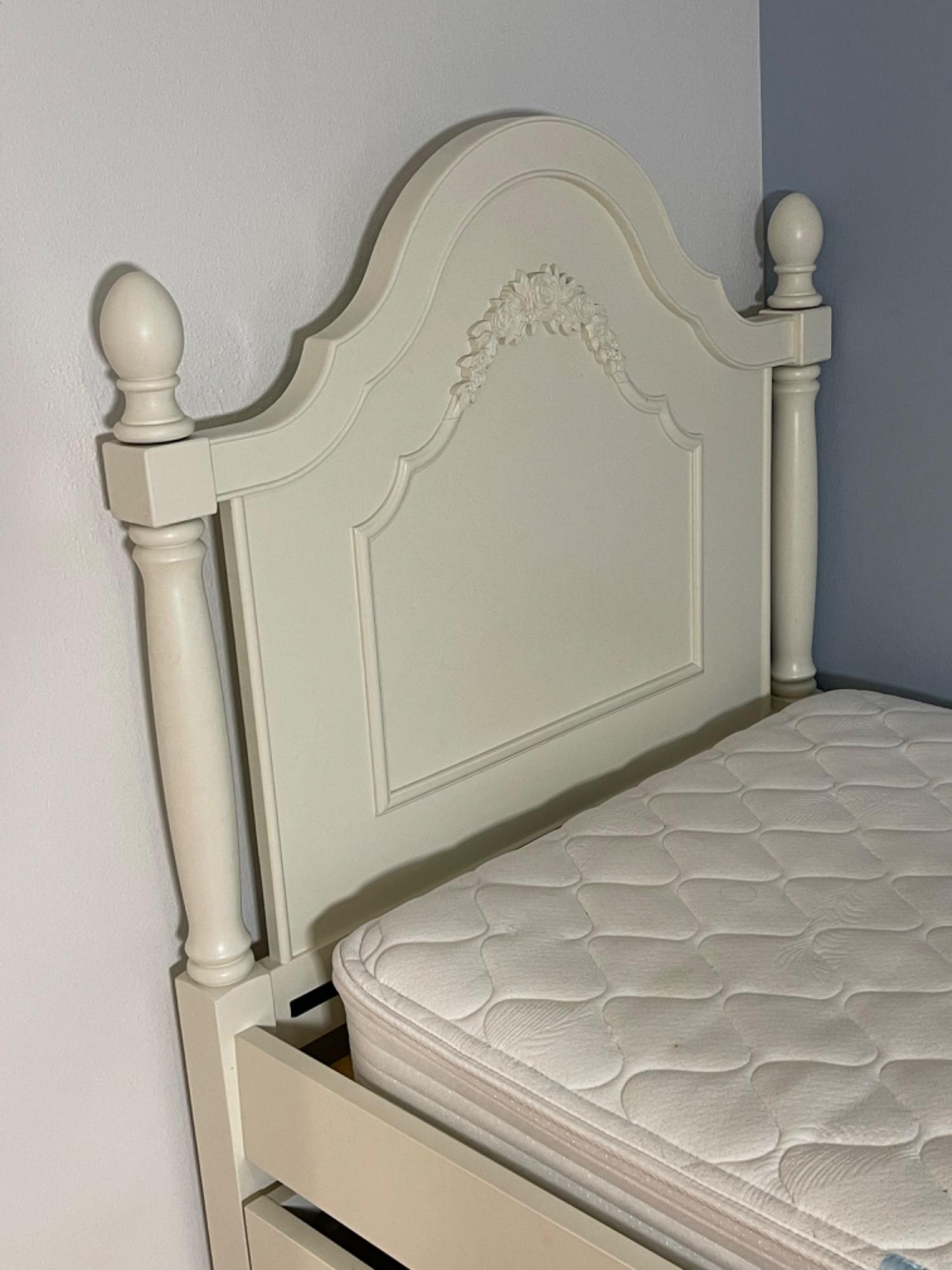 White Twin Trundle Bed and Mattress Only one mattress included. Mattress is in good used condition. Frame has many scuffs and scratches to paint, but is sturdy. Good used condition. Headboard measurements: 41.5" W x 53" H