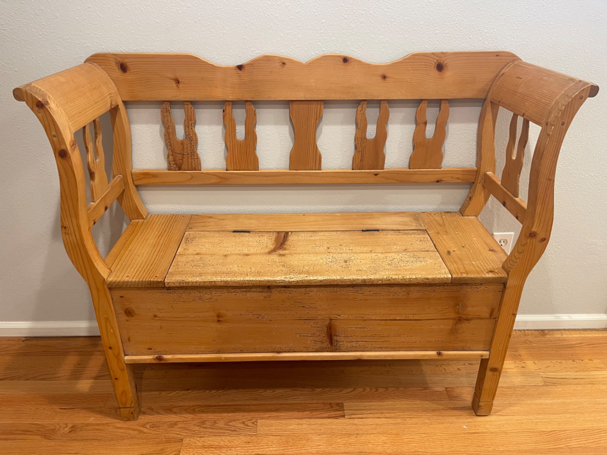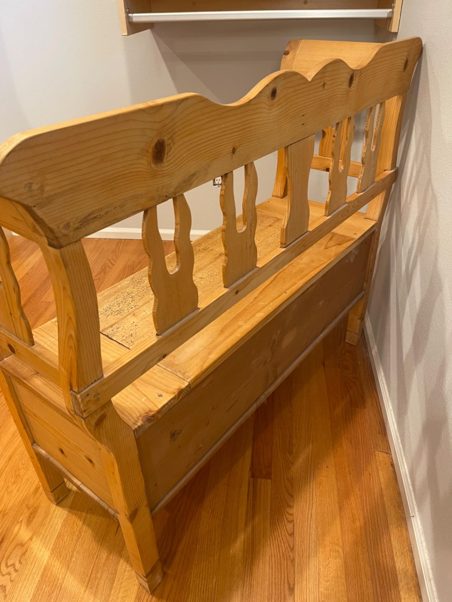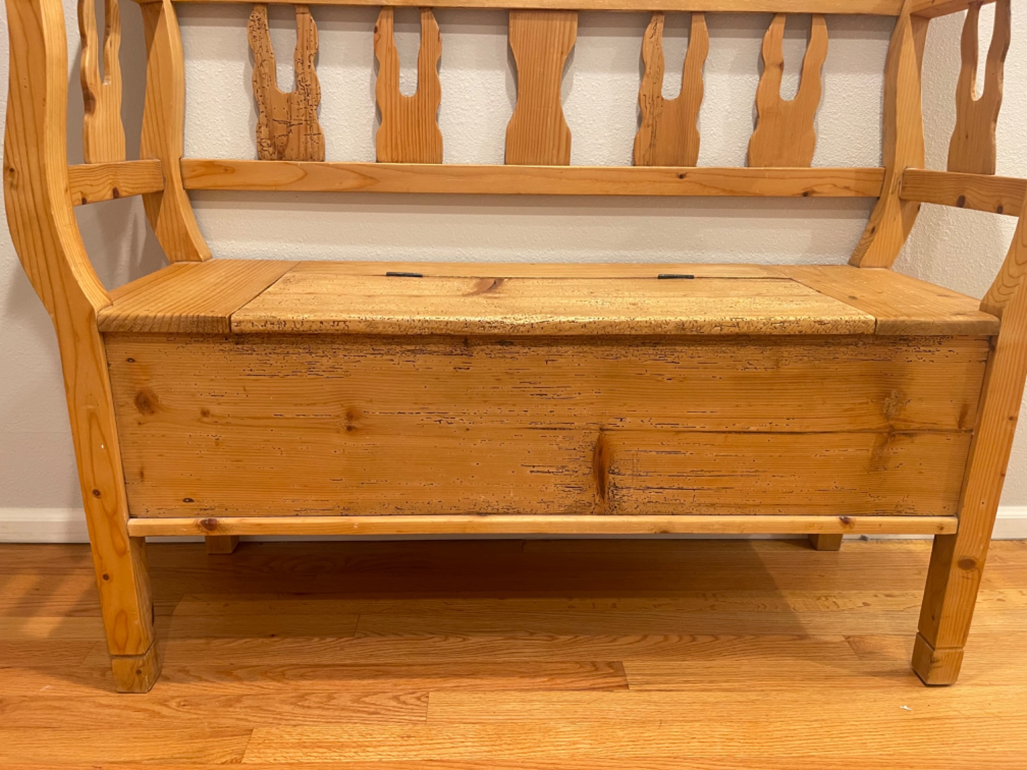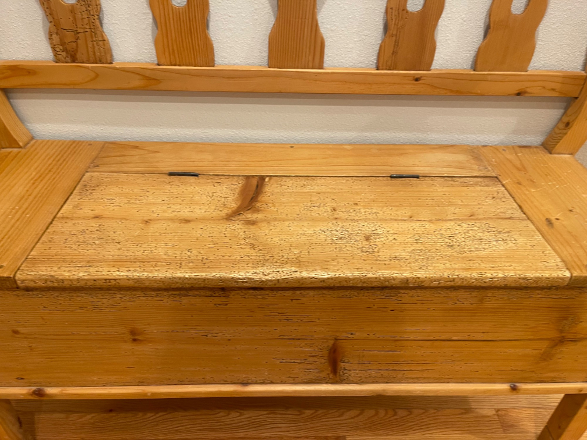 Vintage Rustic Wood Storage Bench Very worn and used. Wood has multiple scratches, scuffs and dents. However, bench is holding together beautifully.