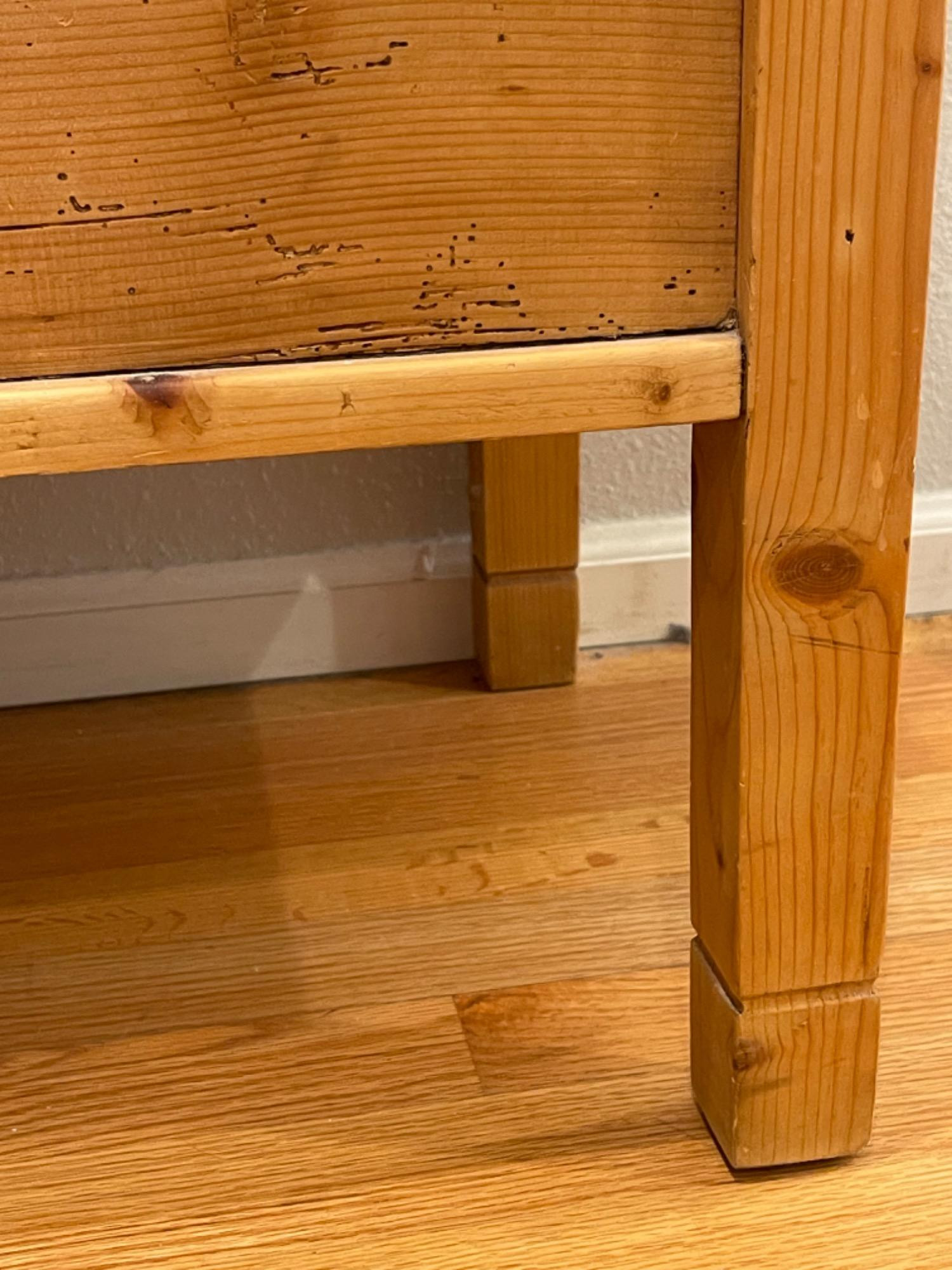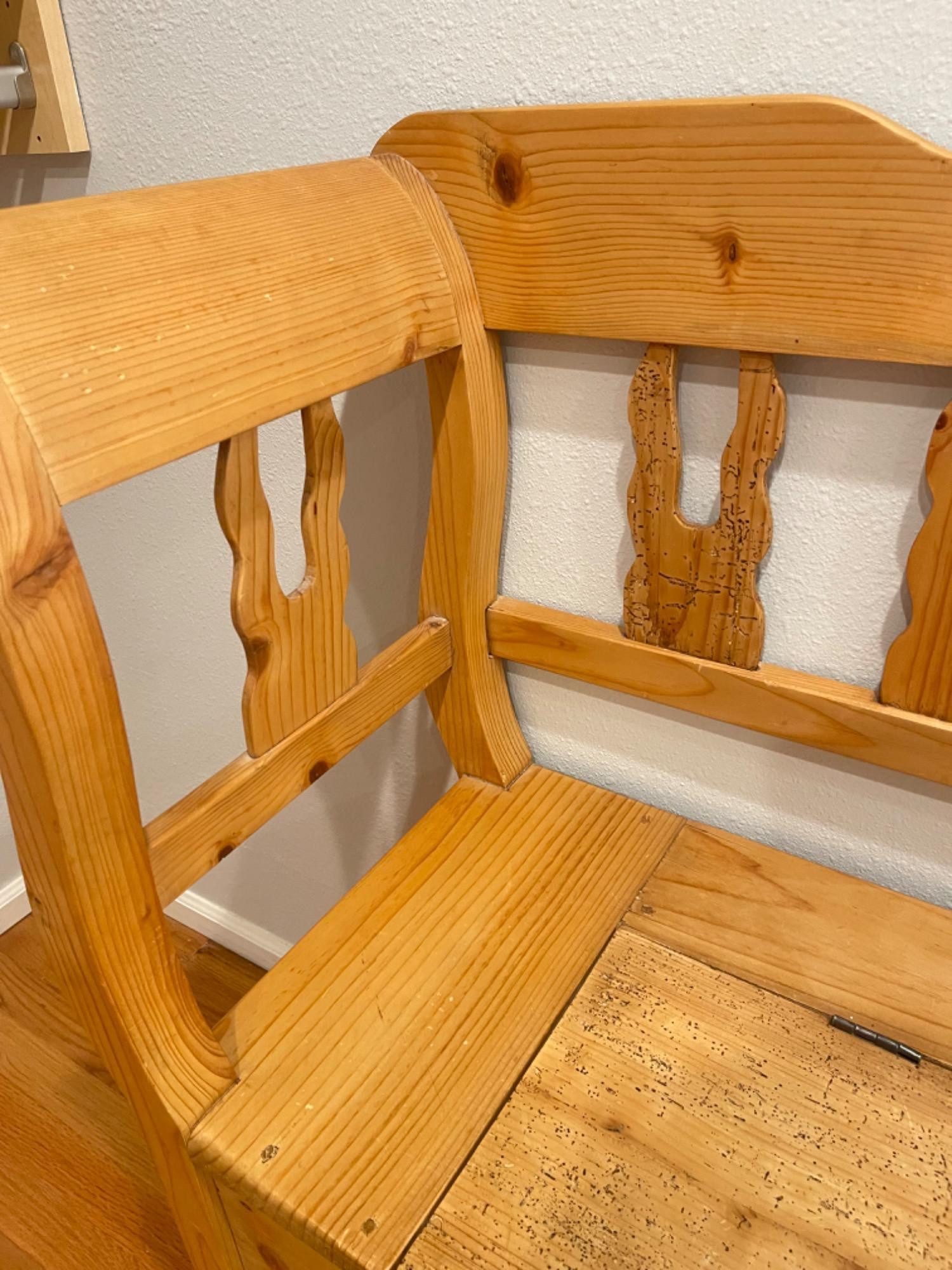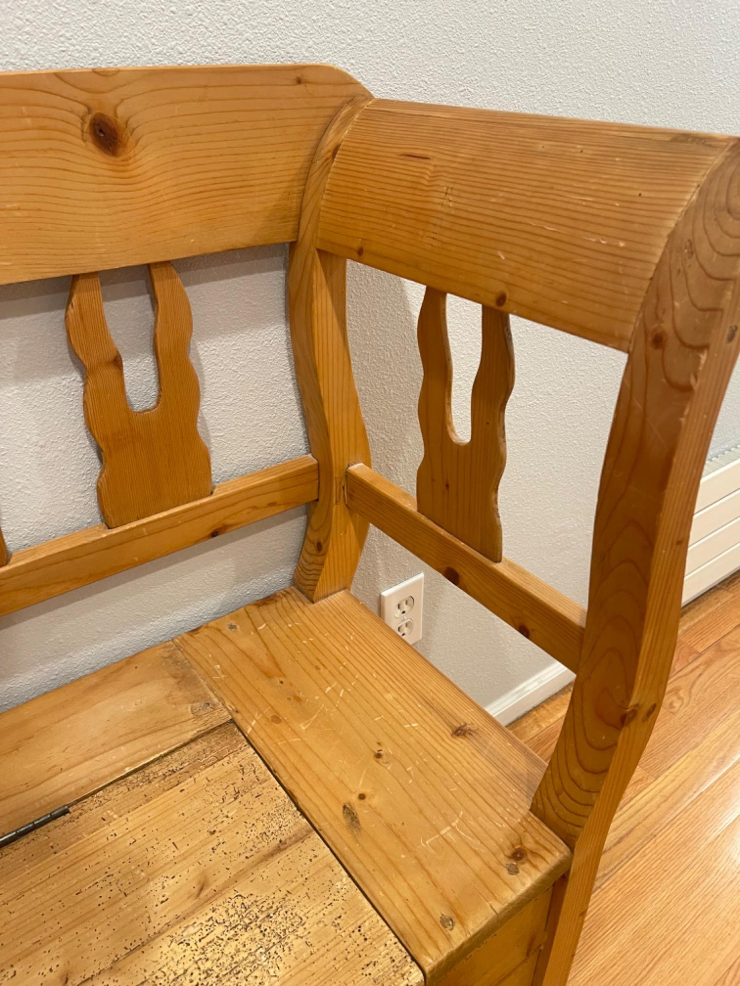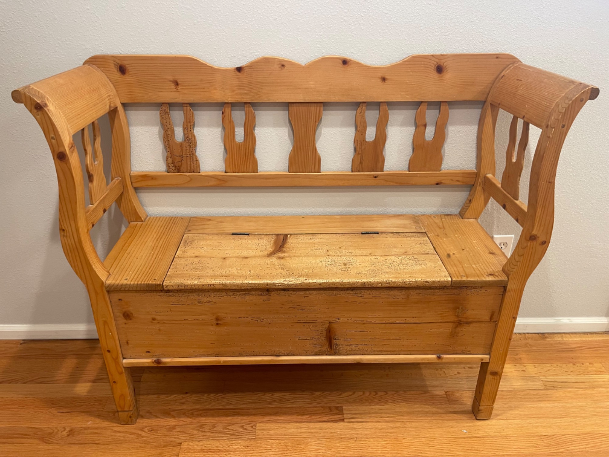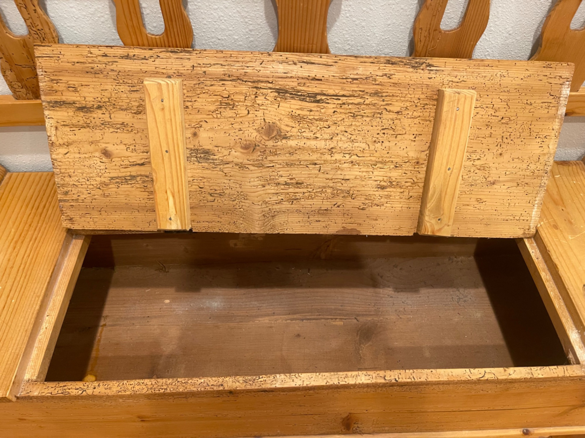 Vintage Rustic Wood Storage Bench Very worn and used. Wood has multiple scratches, scuffs and dents. However, bench is holding together beautifully.