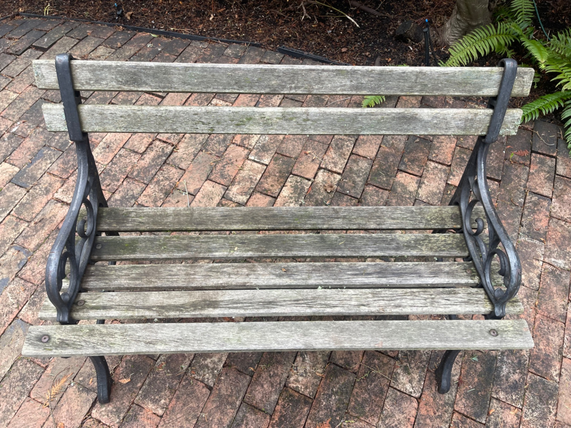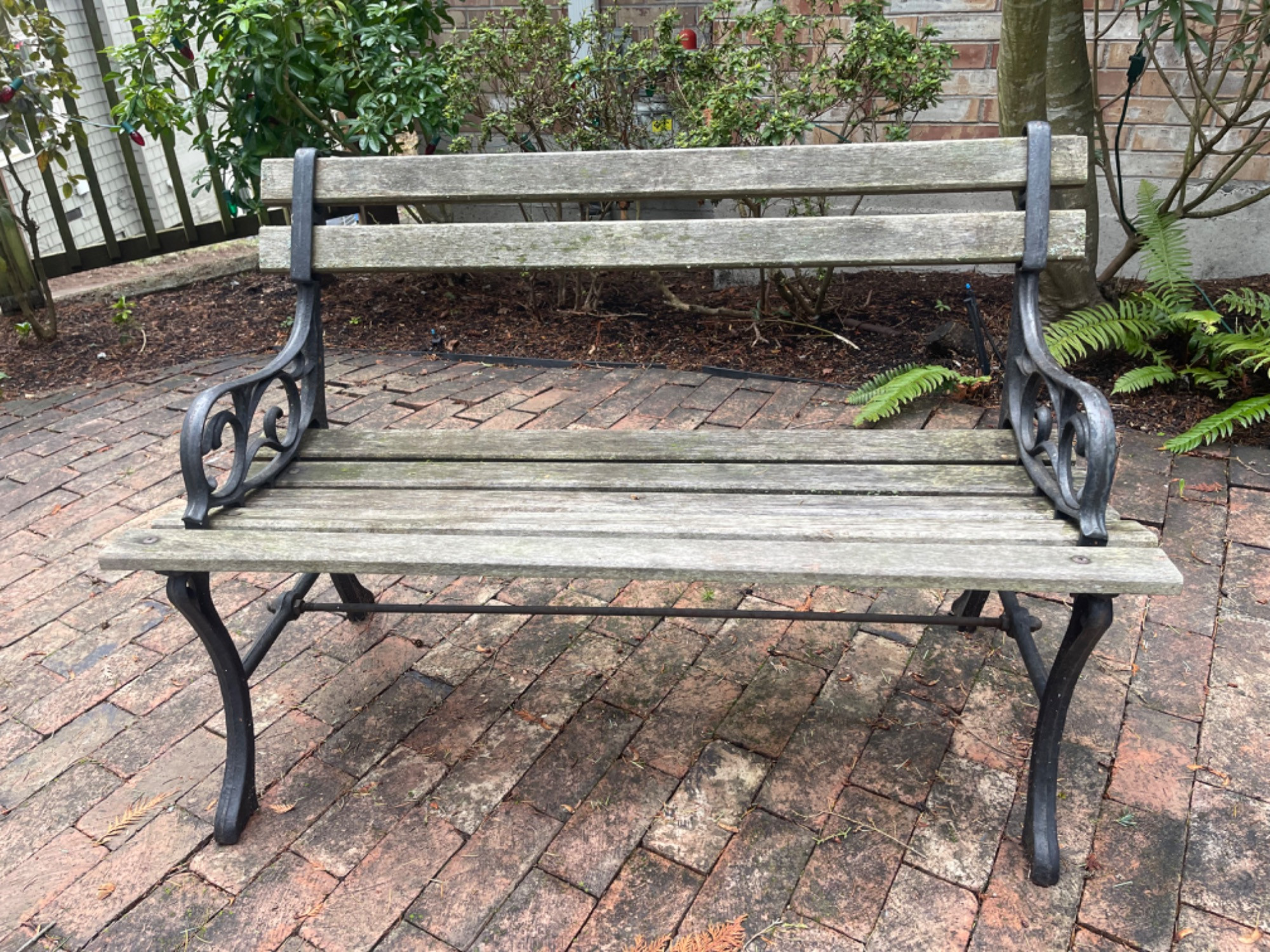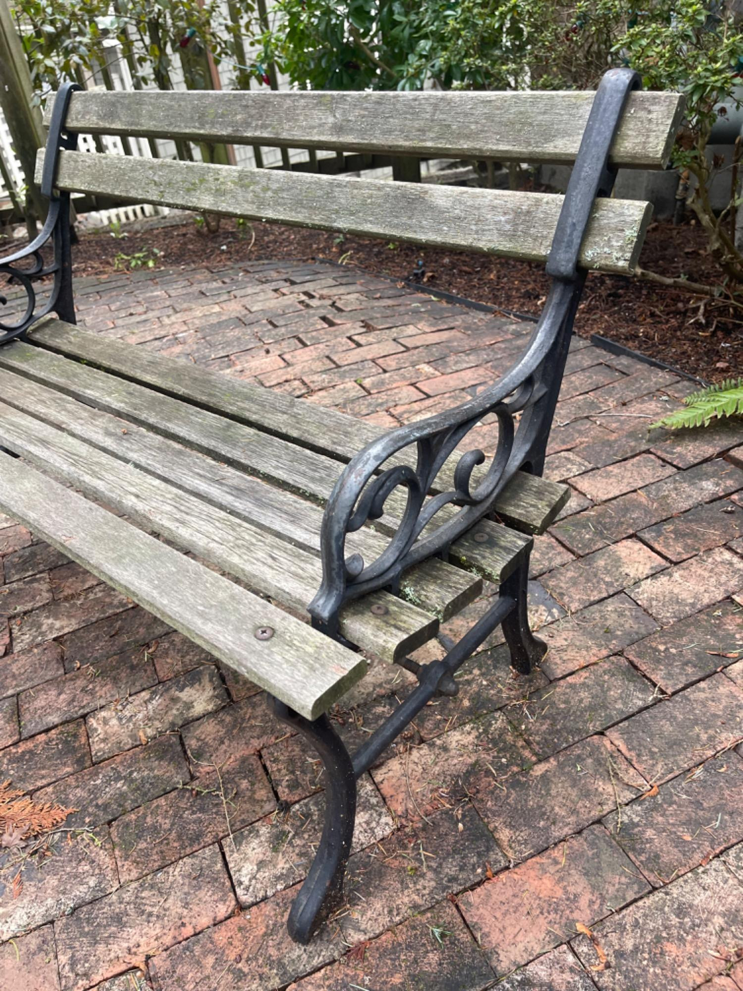 Mini Iron and Wood Outdoor Bench Very worn, but sturdy.