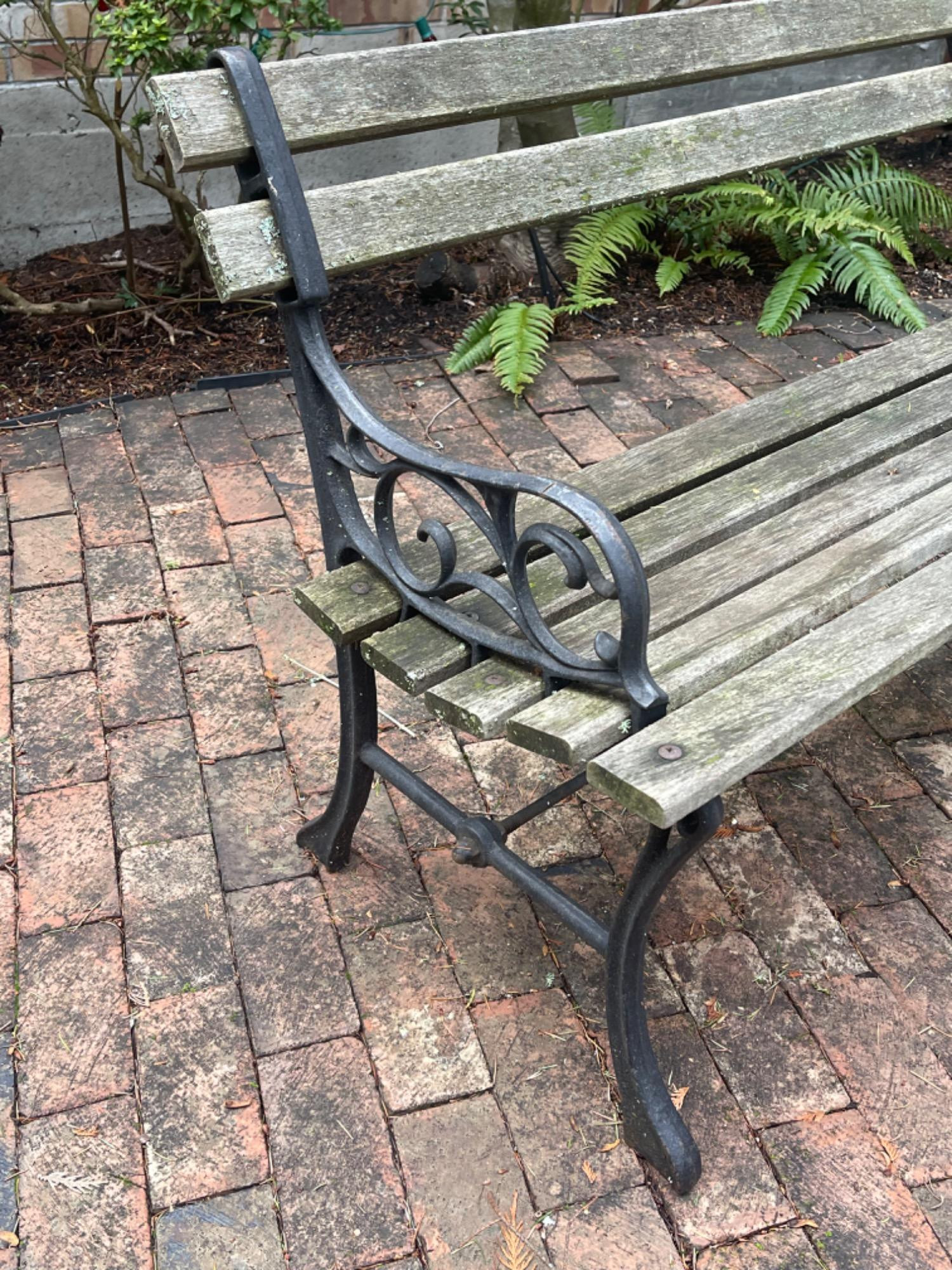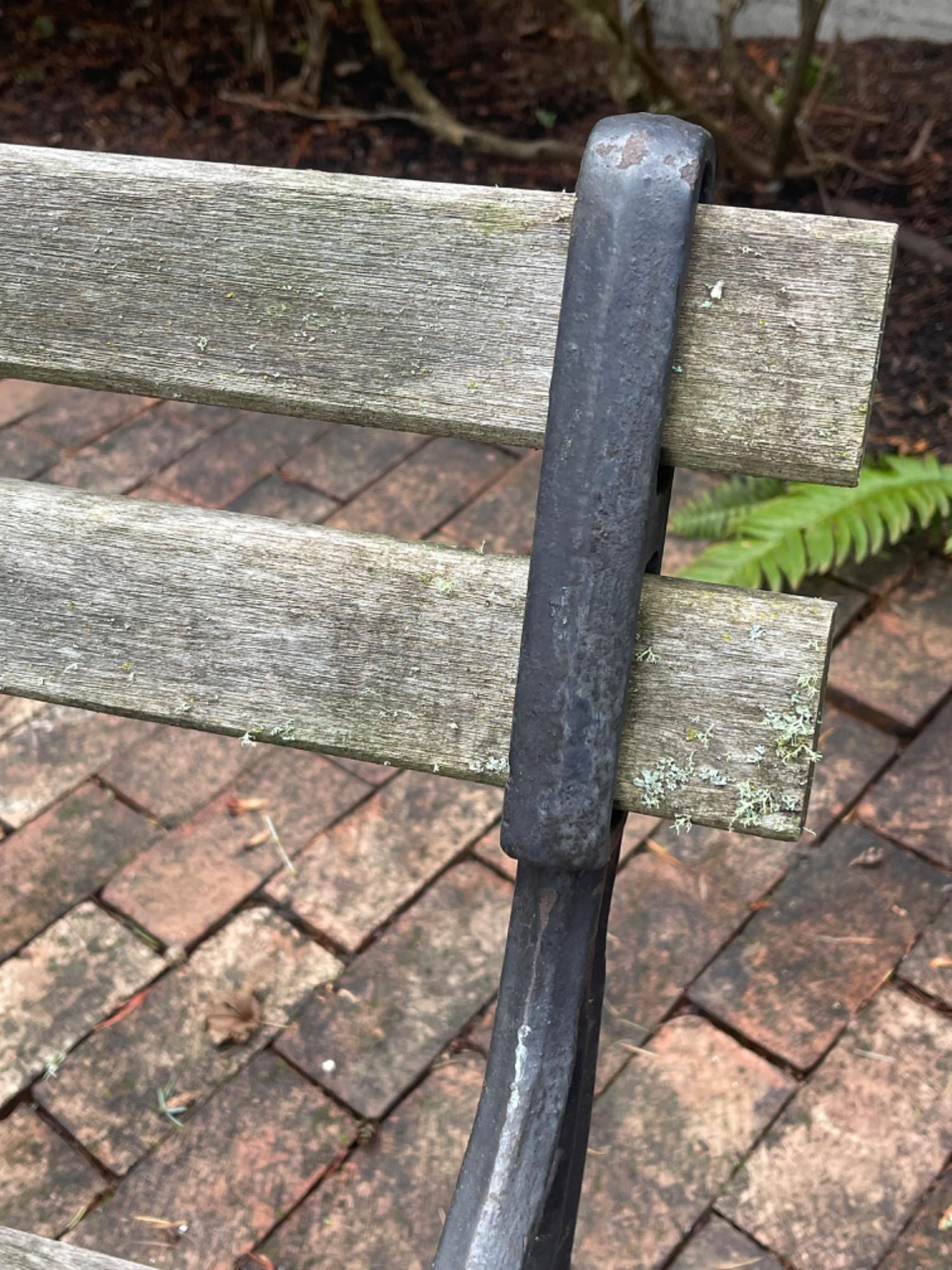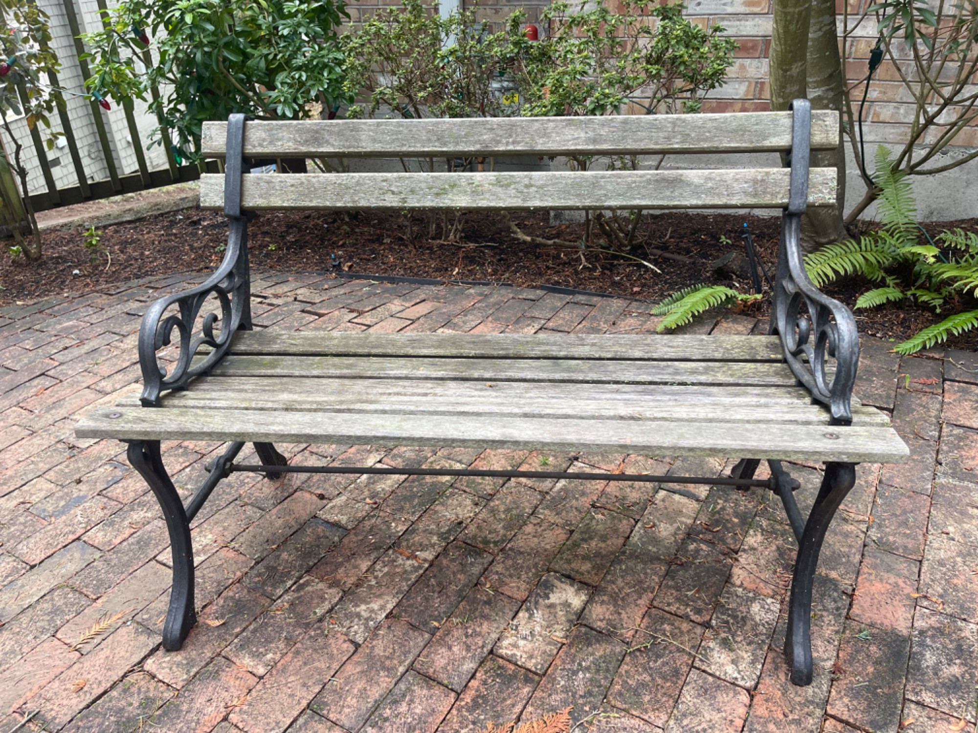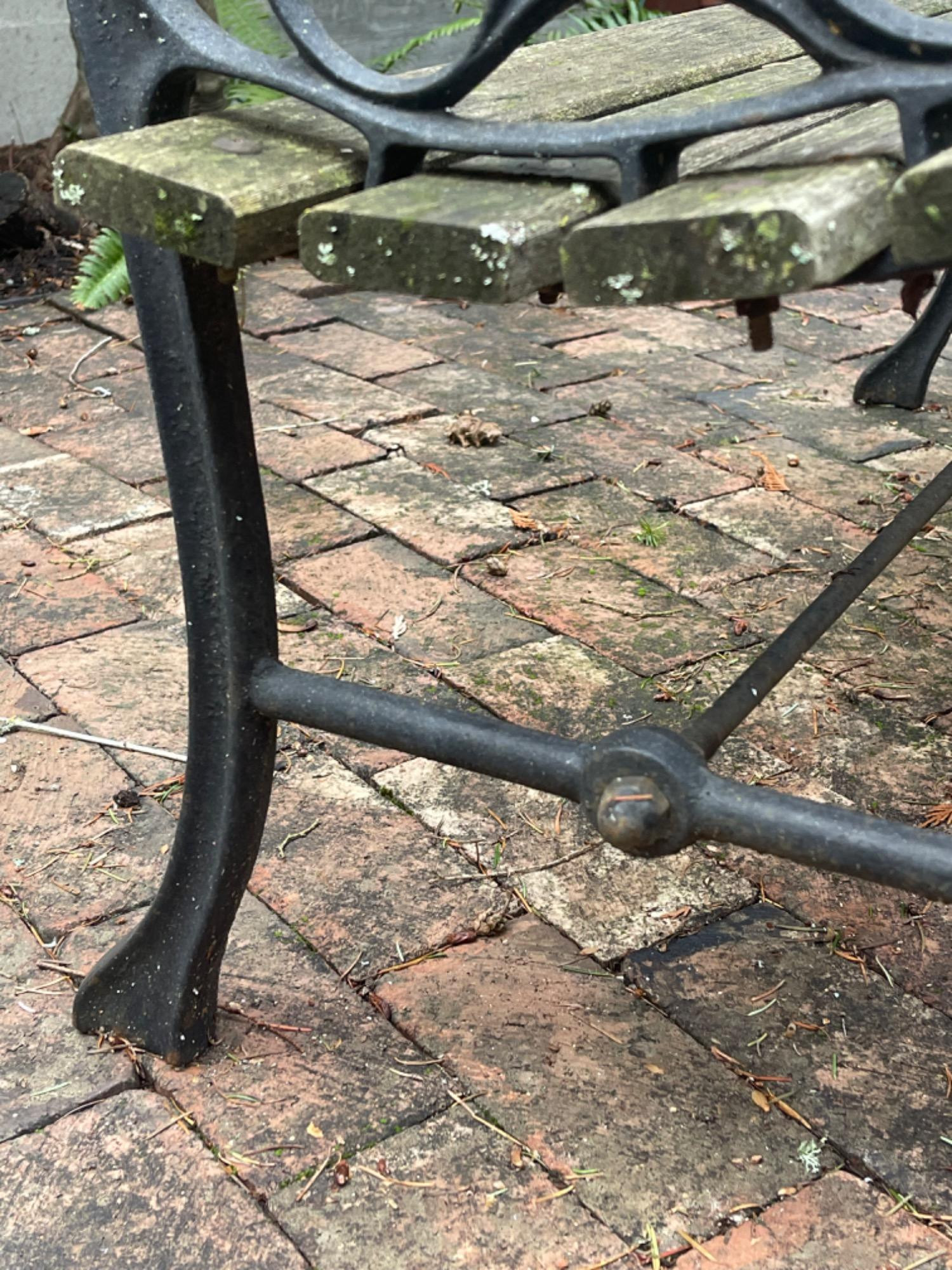 Mini Iron and Wood Outdoor Bench Very worn, but sturdy.