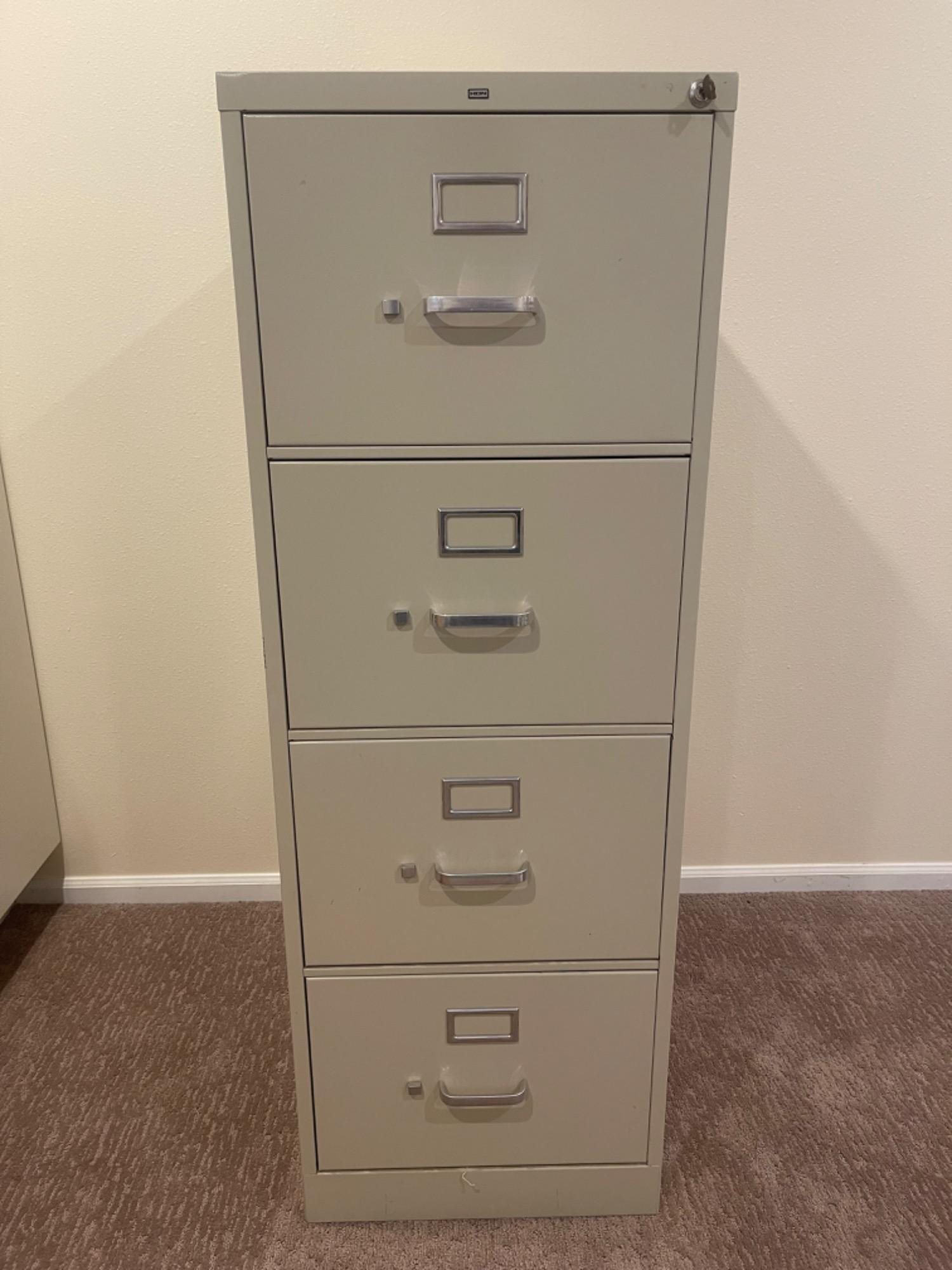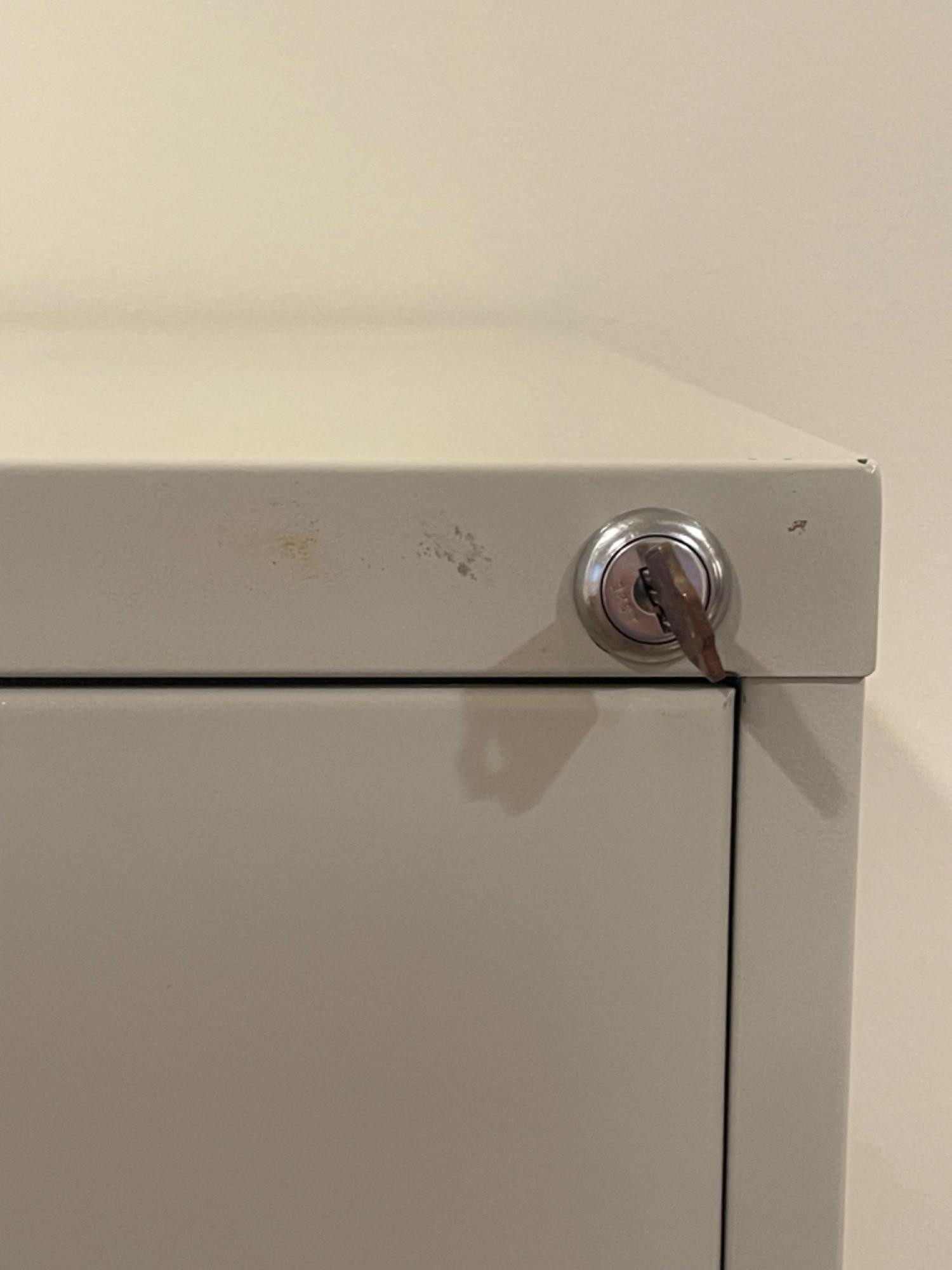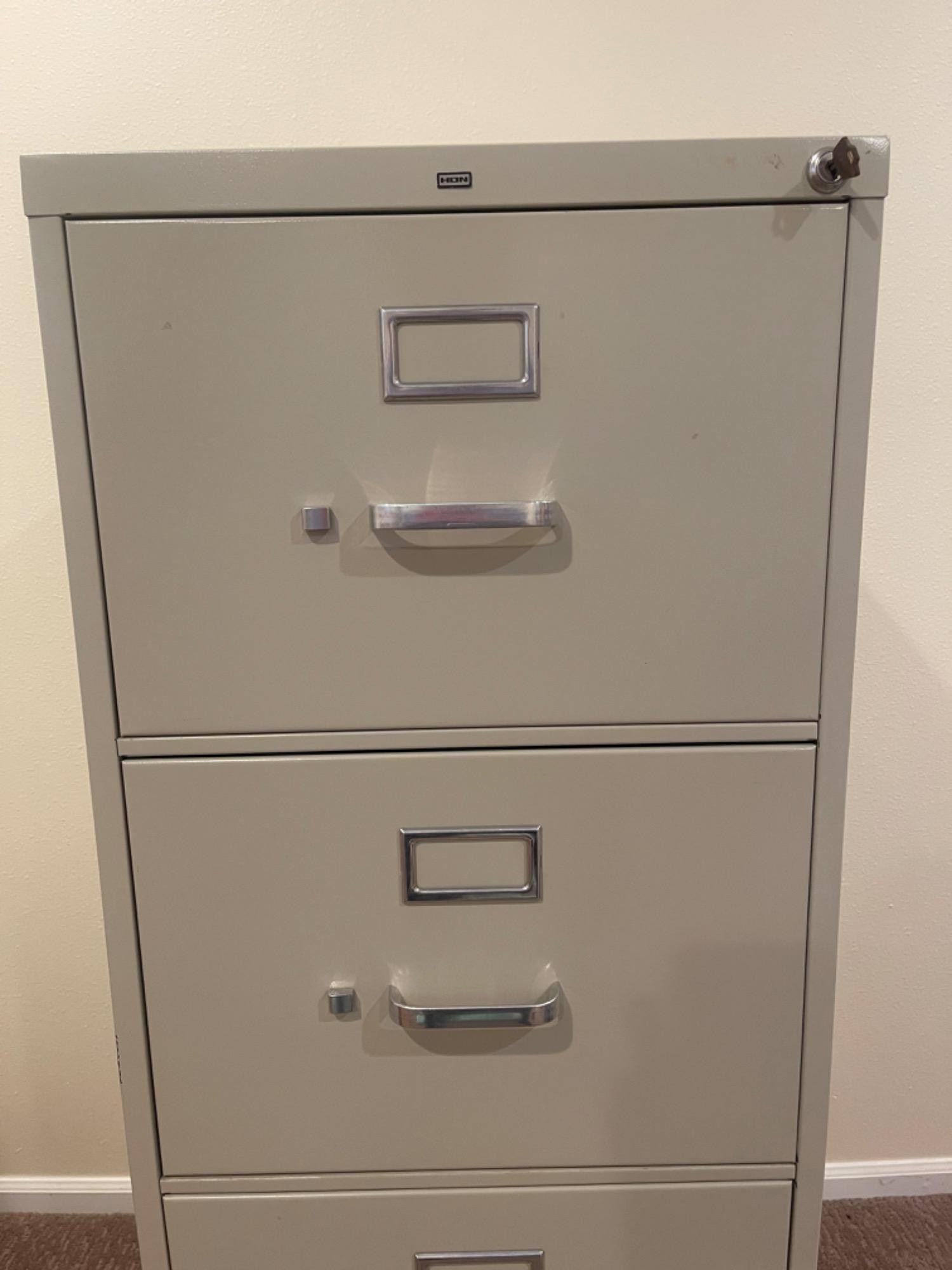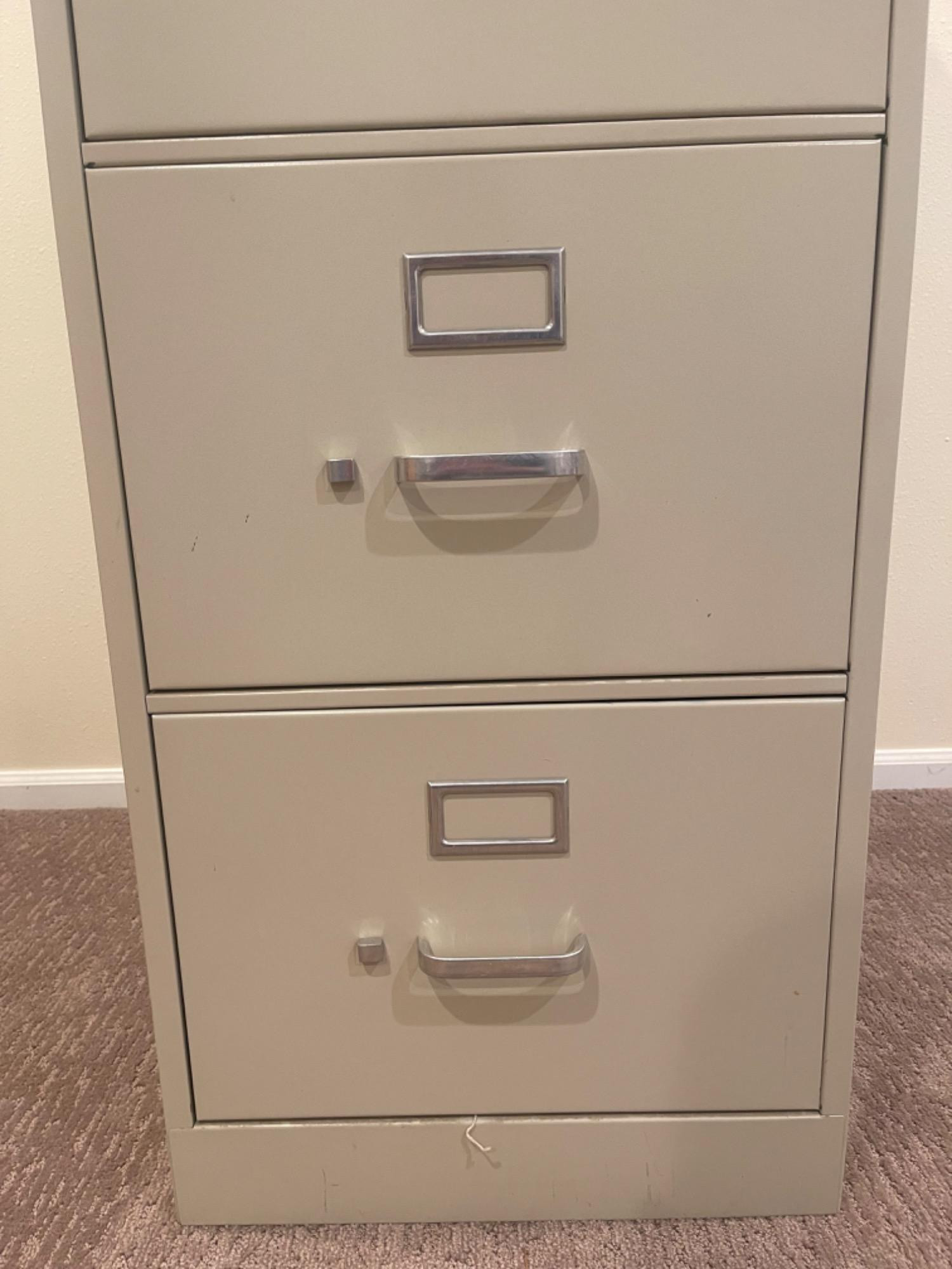 Metal Lockable File Cabinet Cabinet has some scratches, scuffs and dents, but is in good condition. Key included, lock working well.