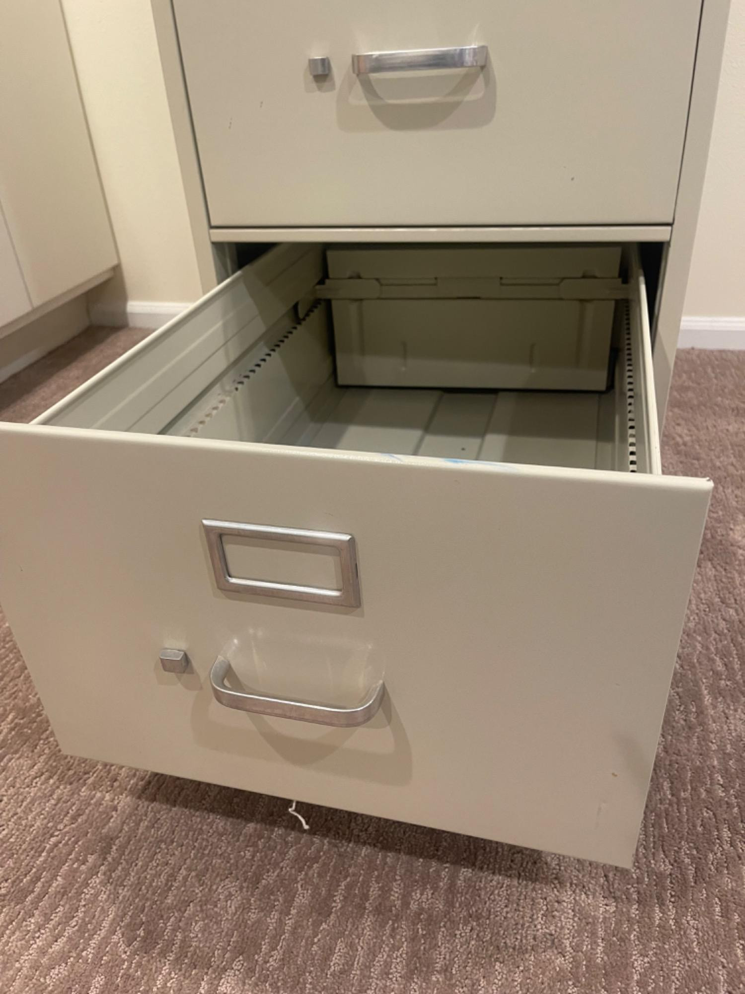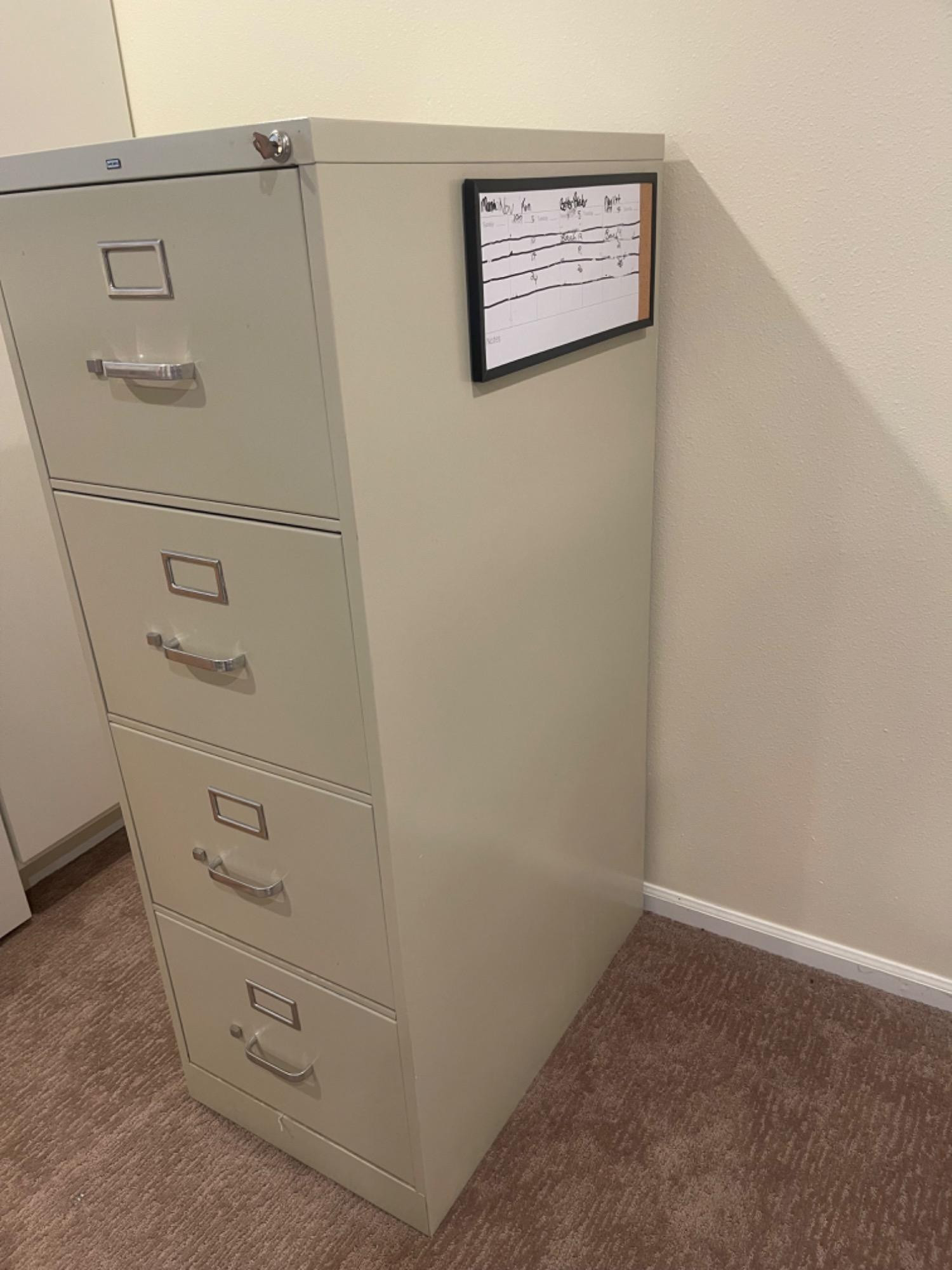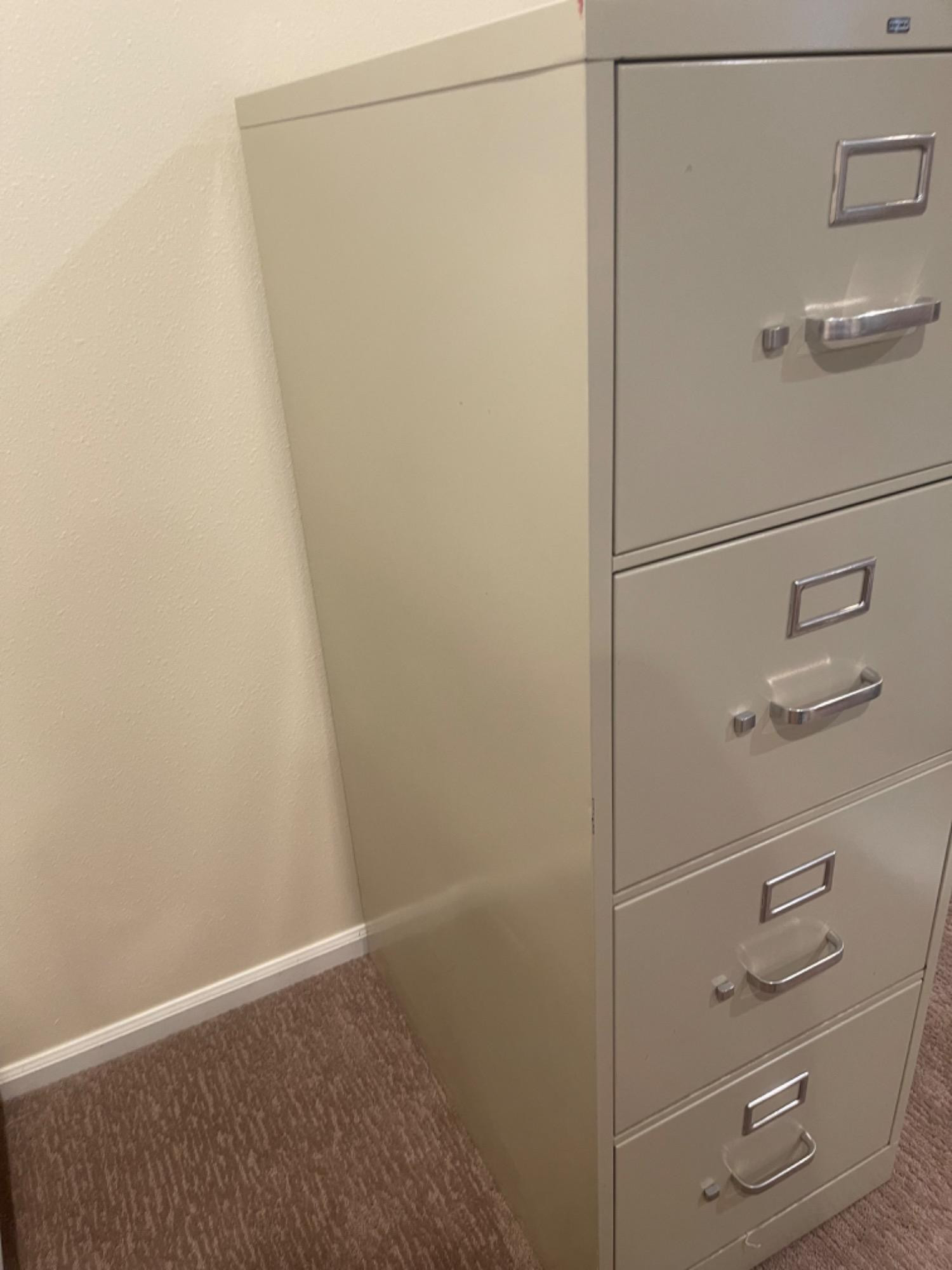 Metal Lockable File Cabinet Cabinet has some scratches, scuffs and dents, but is in good condition. Key included, lock working well.