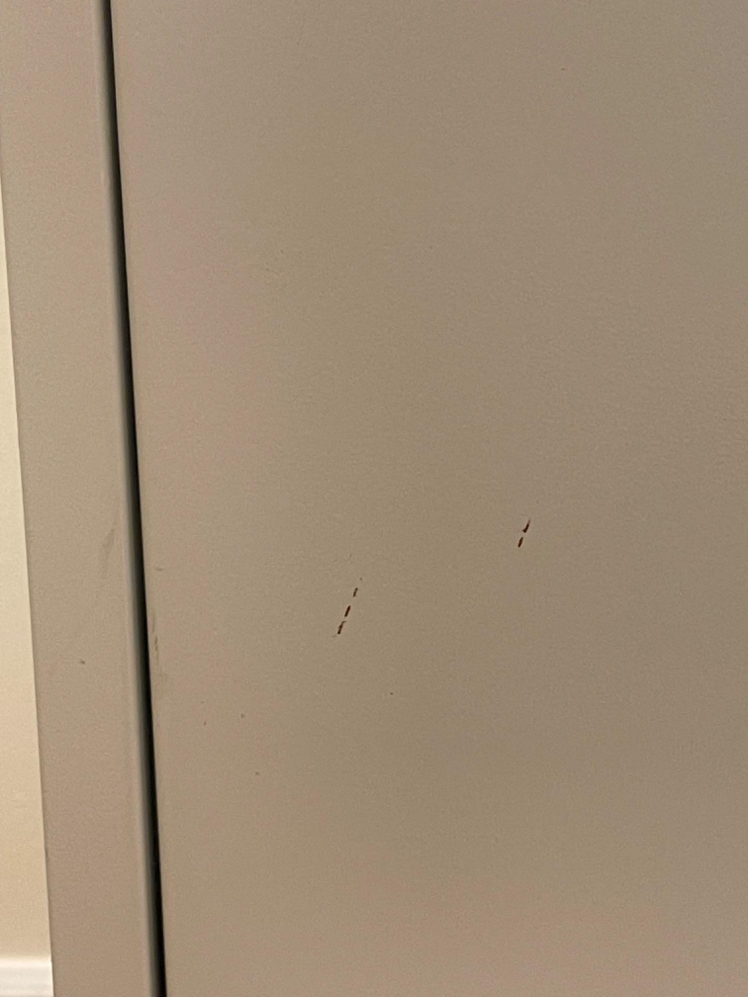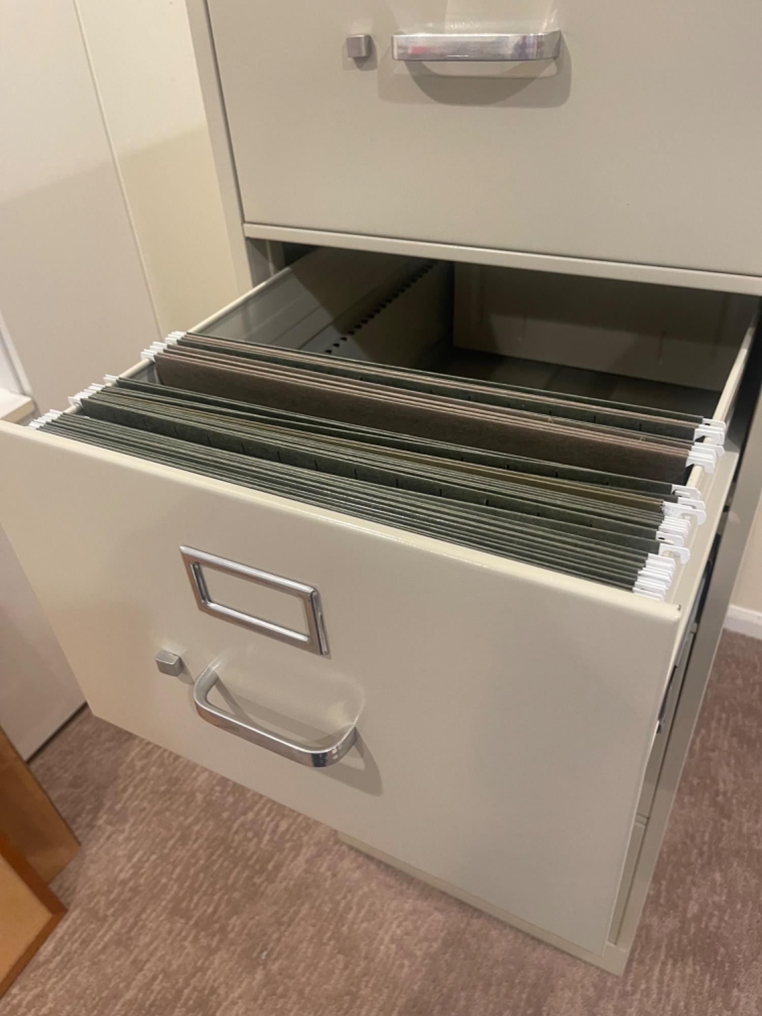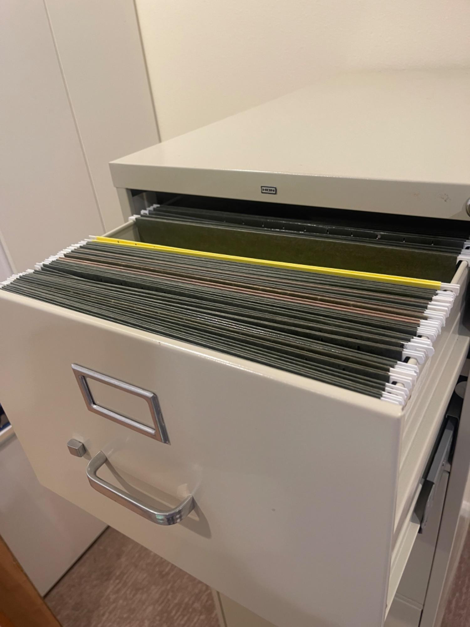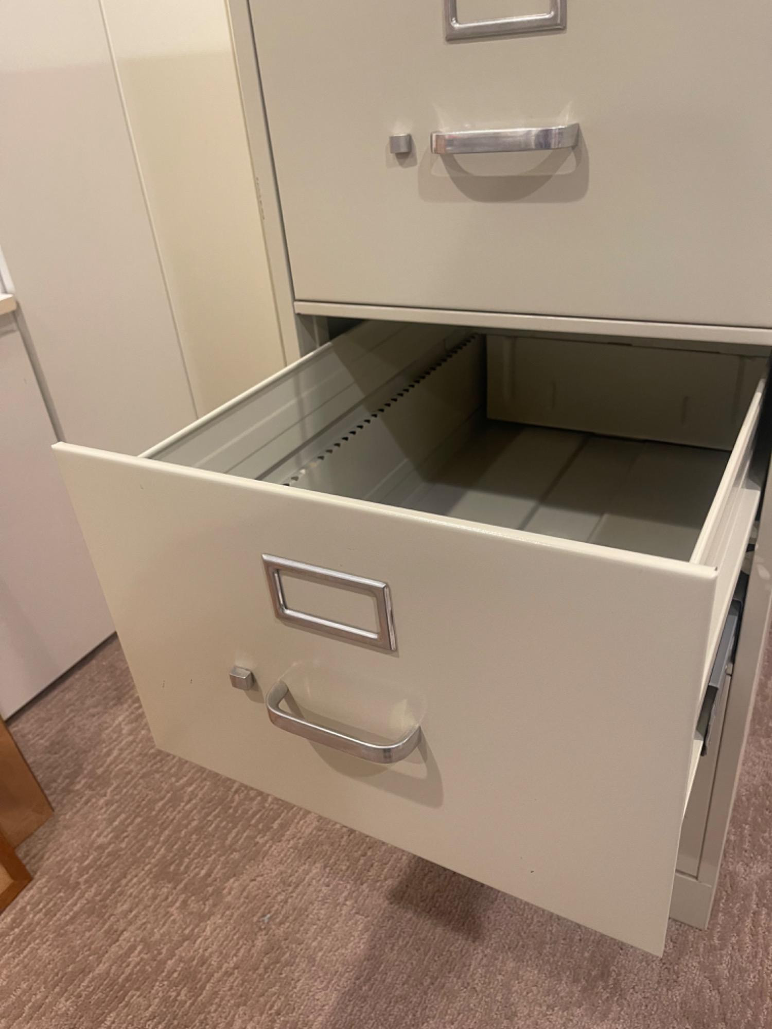 Metal Lockable File Cabinet Cabinet has some scratches, scuffs and dents, but is in good condition. Key included, lock working well.