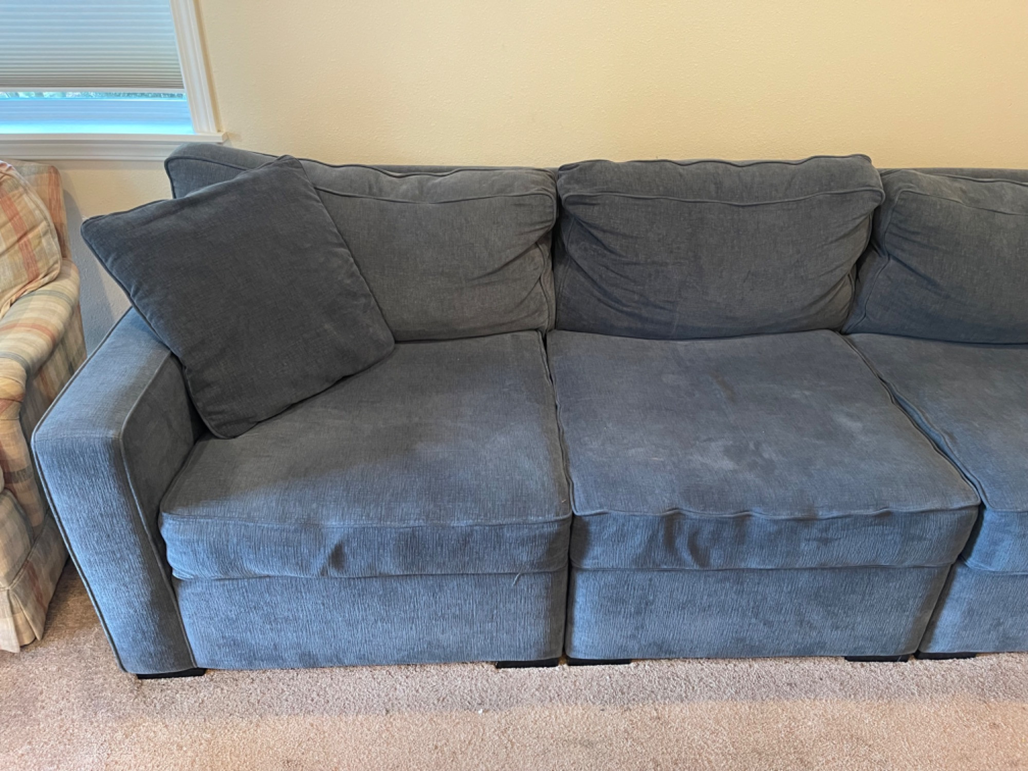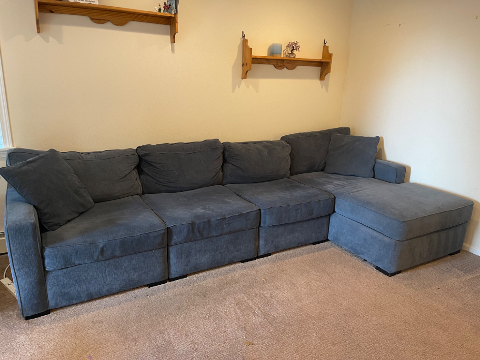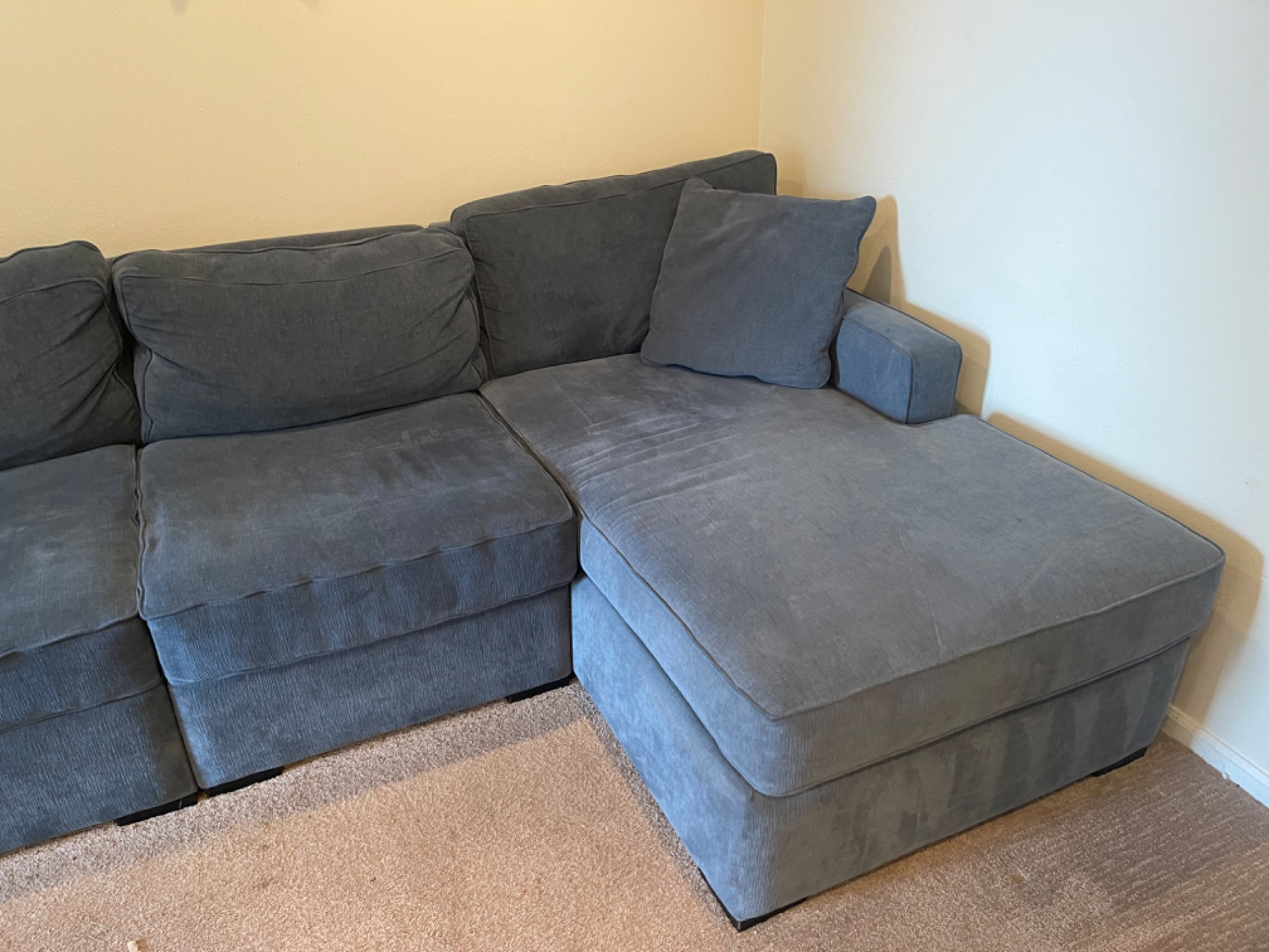 Large Jonathan Louis Blue Sectional Very used, but good condition. Some stains on undersides of cushions, but other stains are minor. Chaise: 65" L