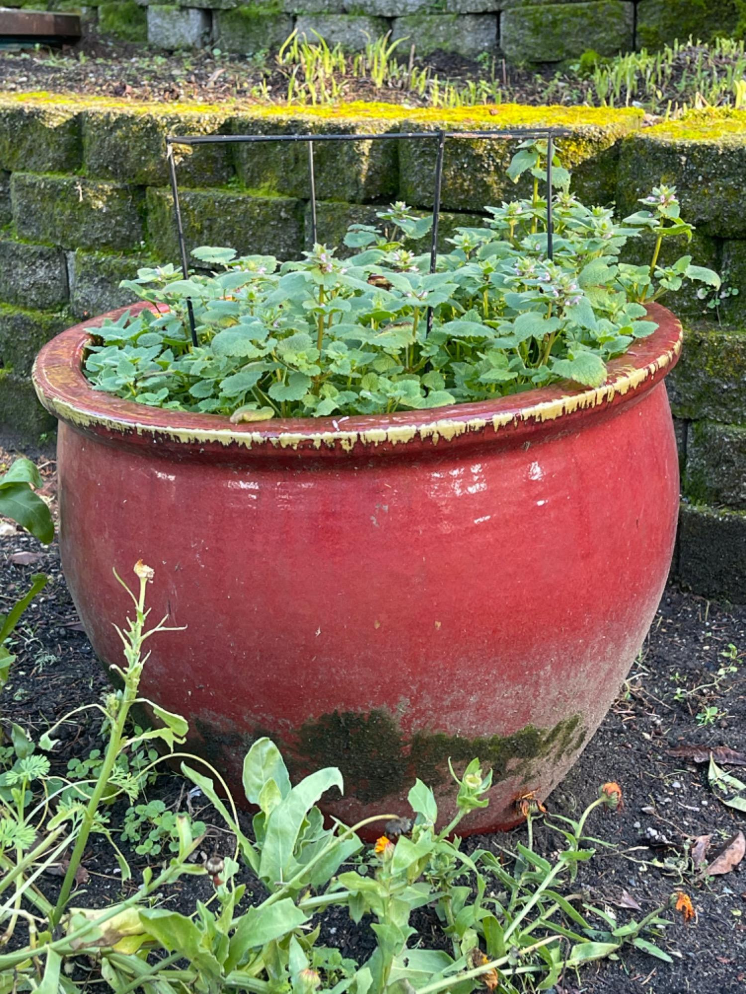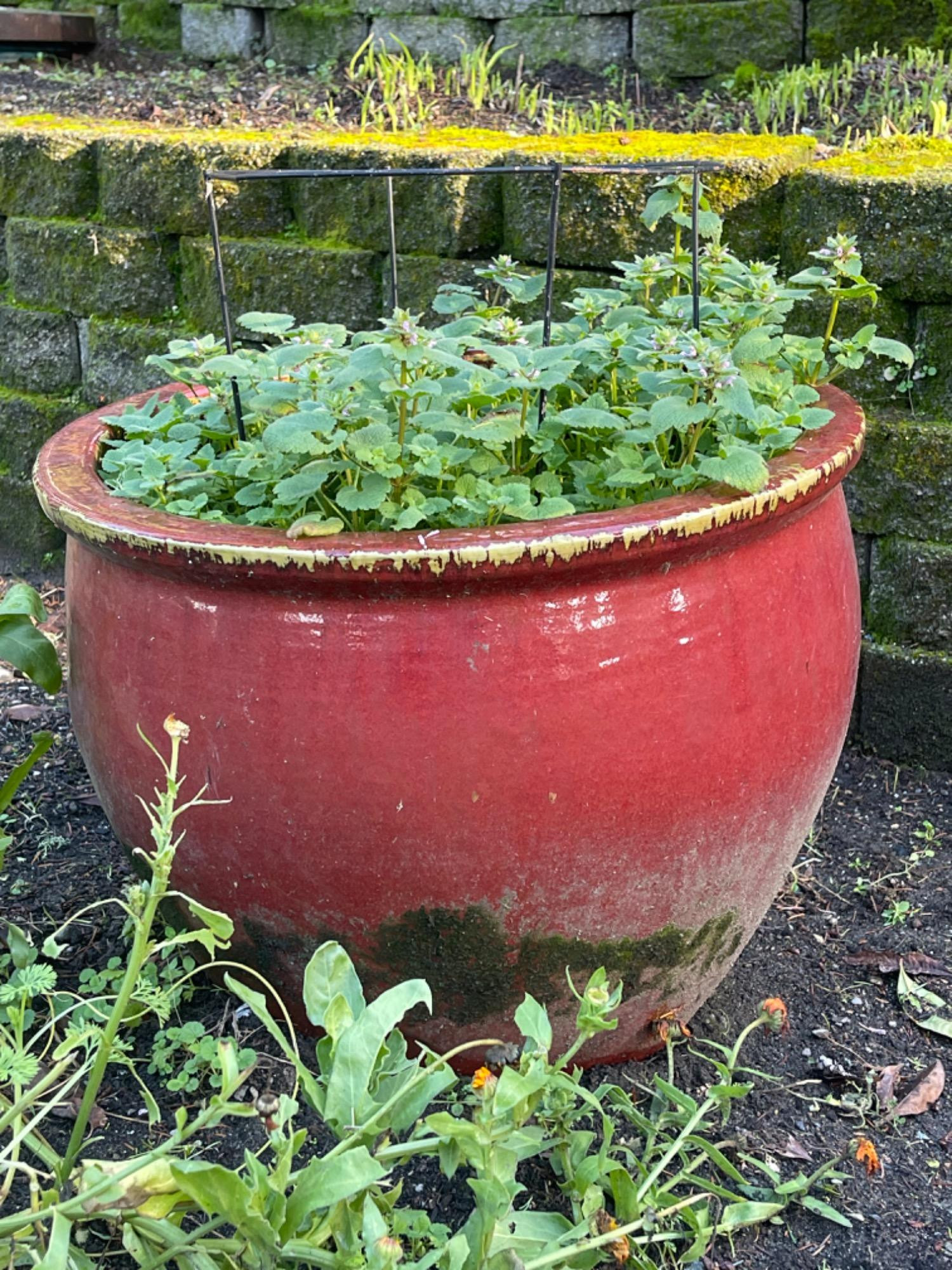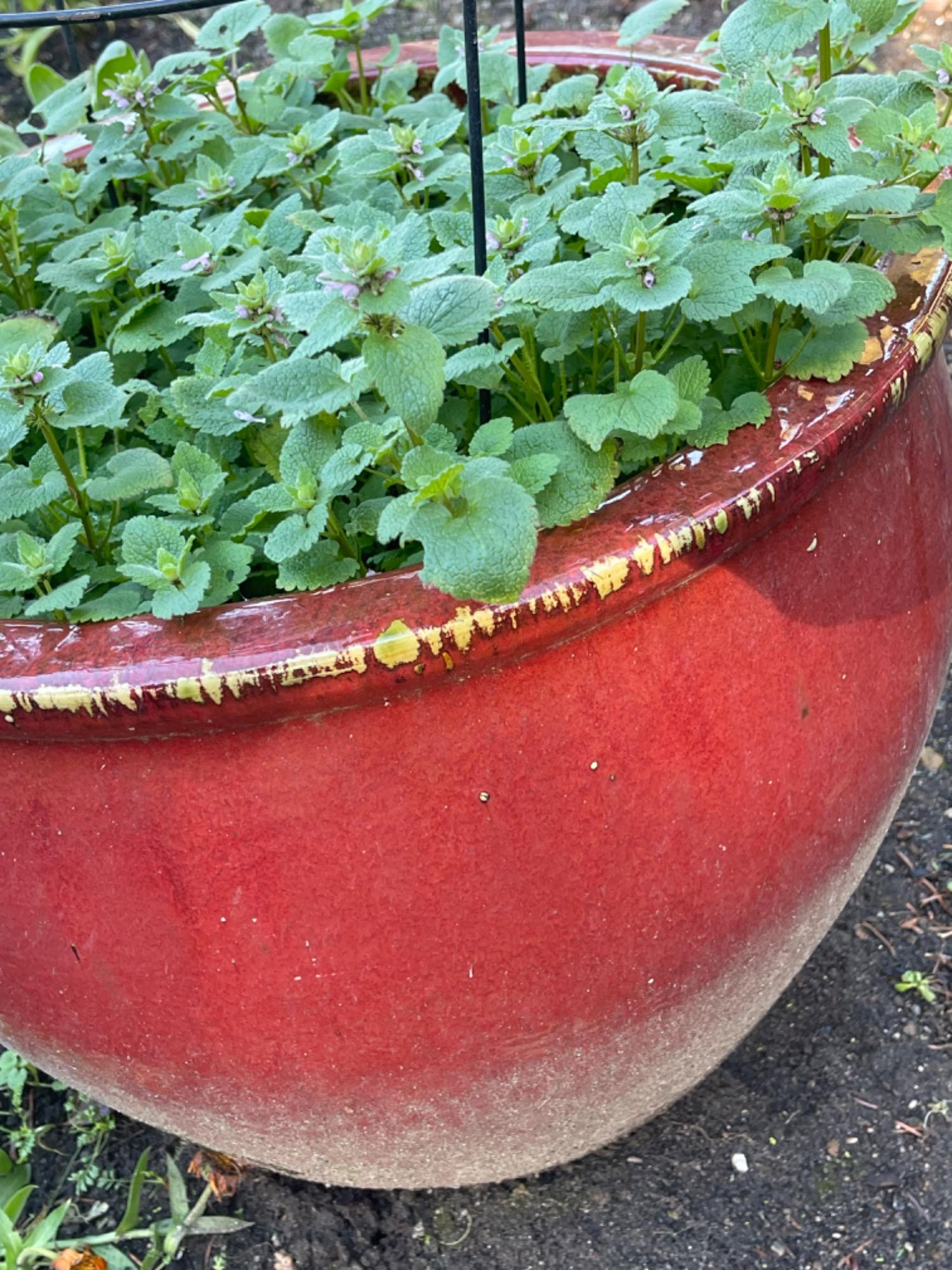 Large Red Pot Good used condition. Minor scratches and scuffs. Typical wear from being outside. Unknown plant.