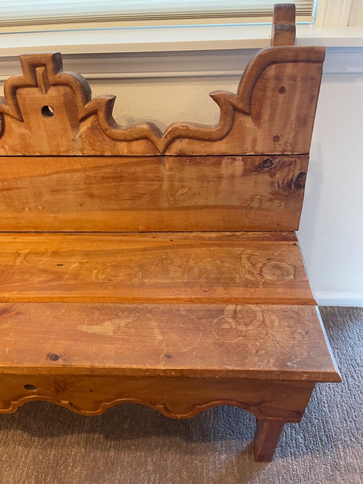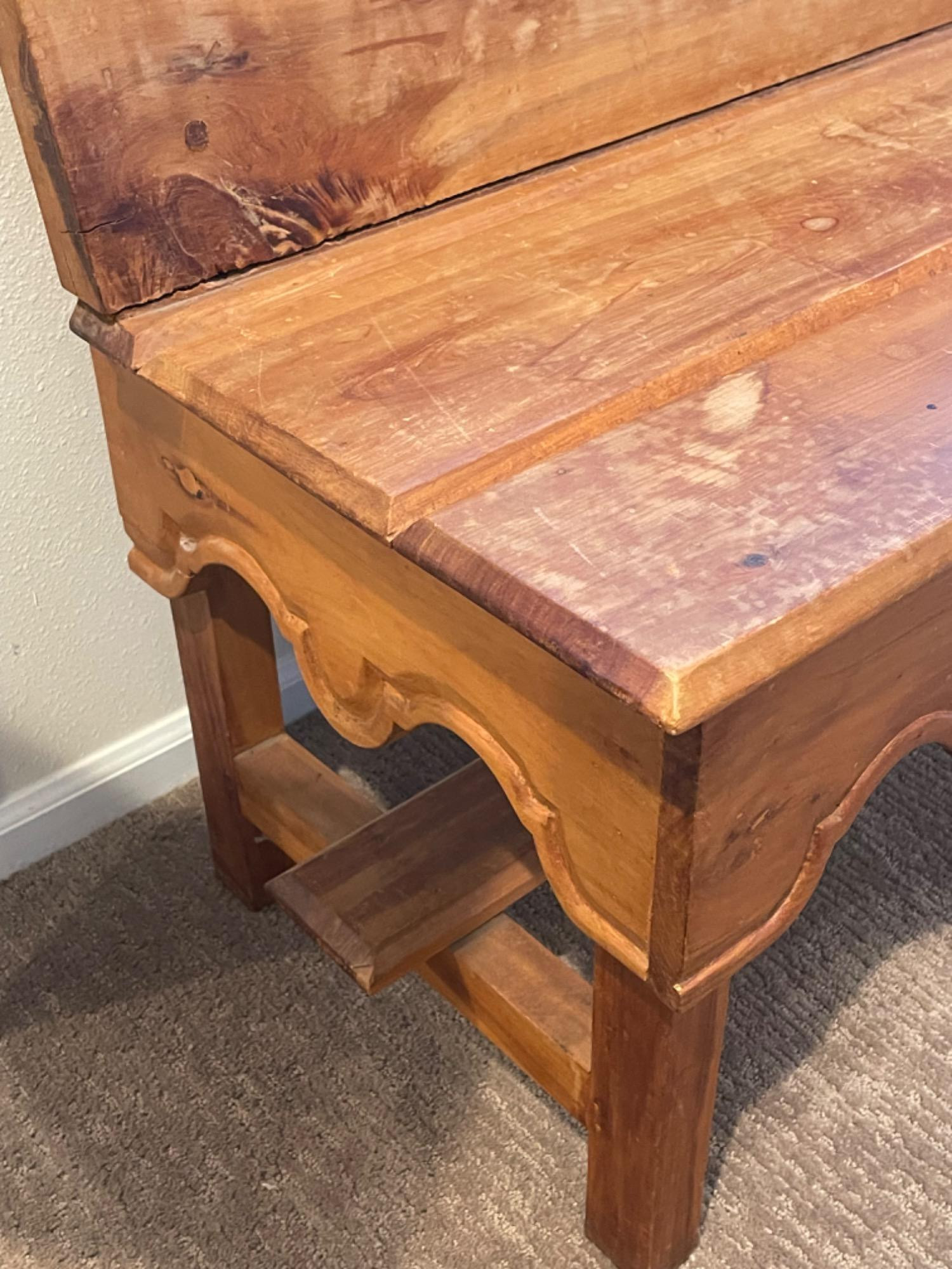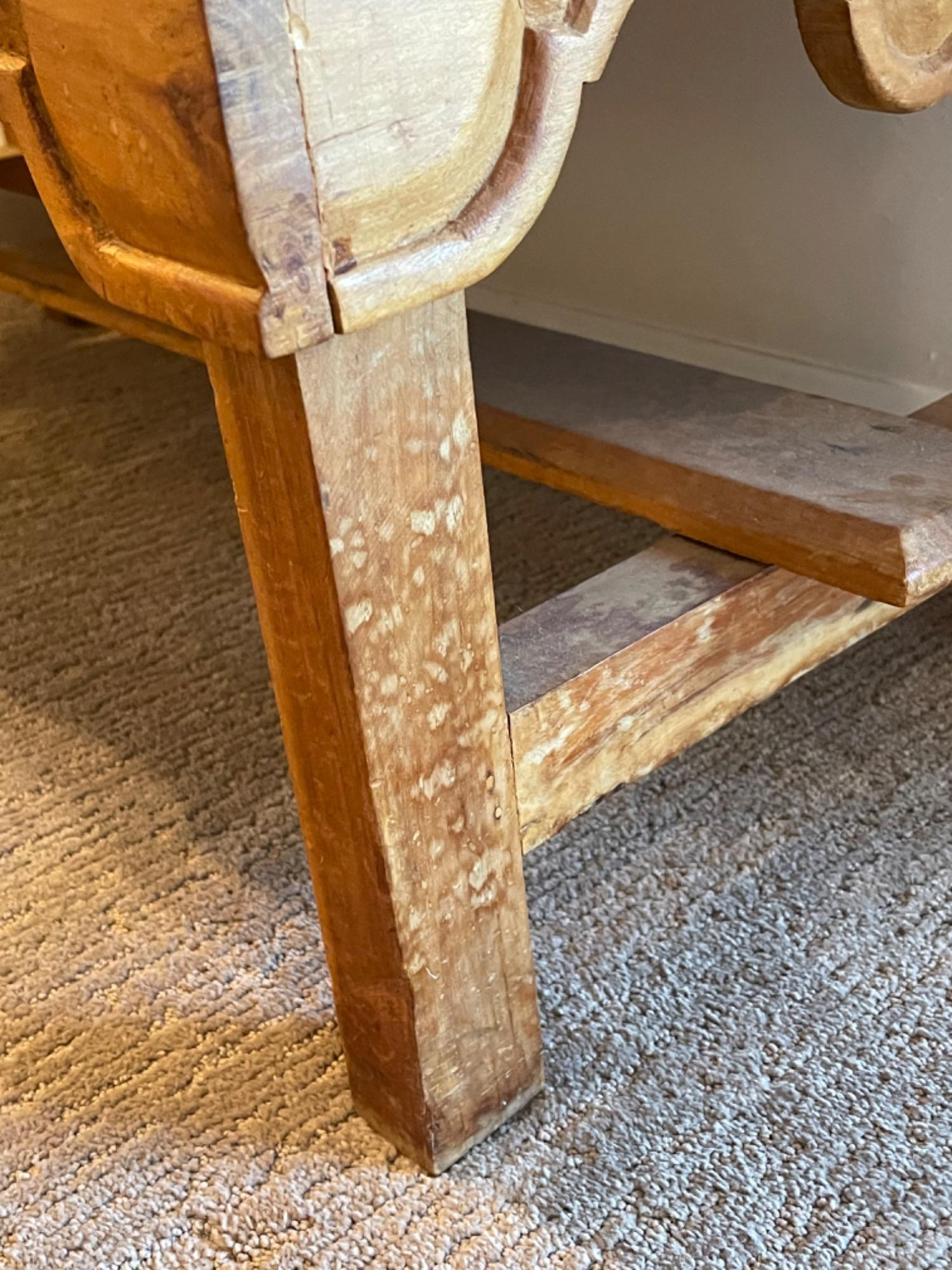 Vintage Hand Carved Solid Wood Bench From Mexico Very used and worn, but in good sturdy condition. Scuffs, scratches and stains are all present on wood. This piece was brought up from Mexico and has passed through generations!