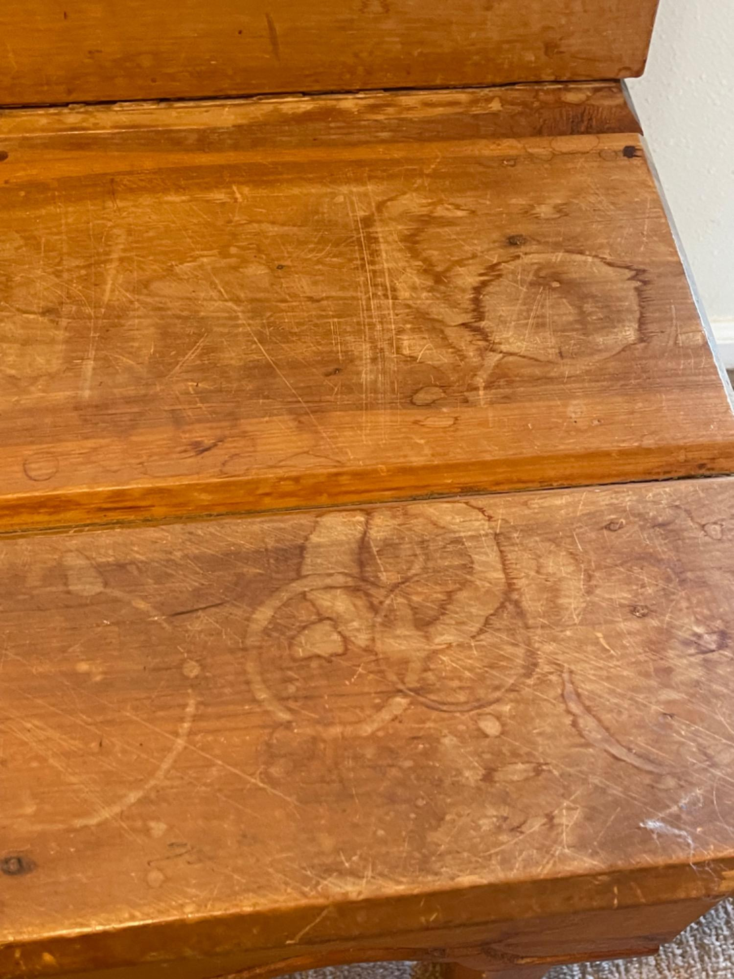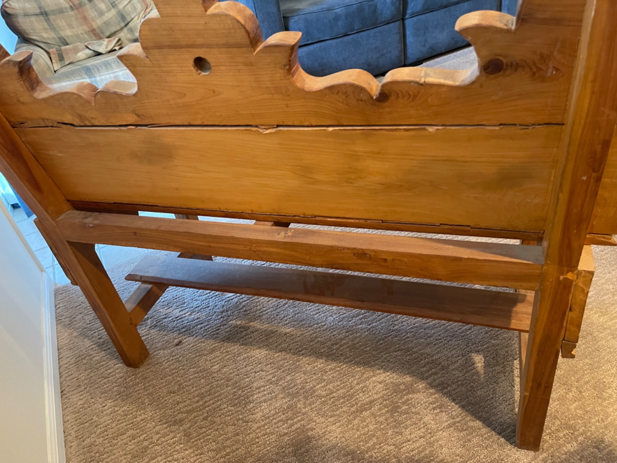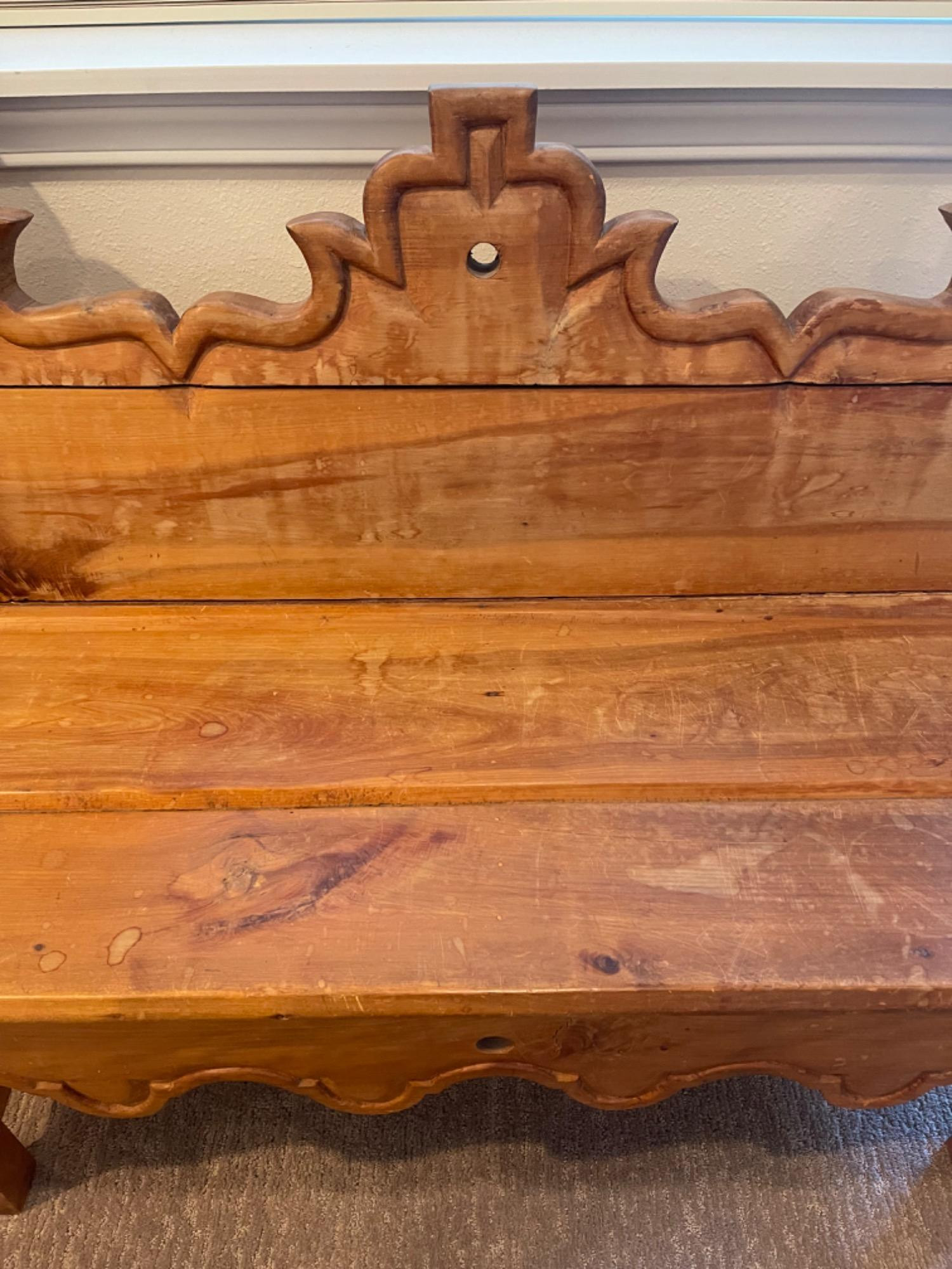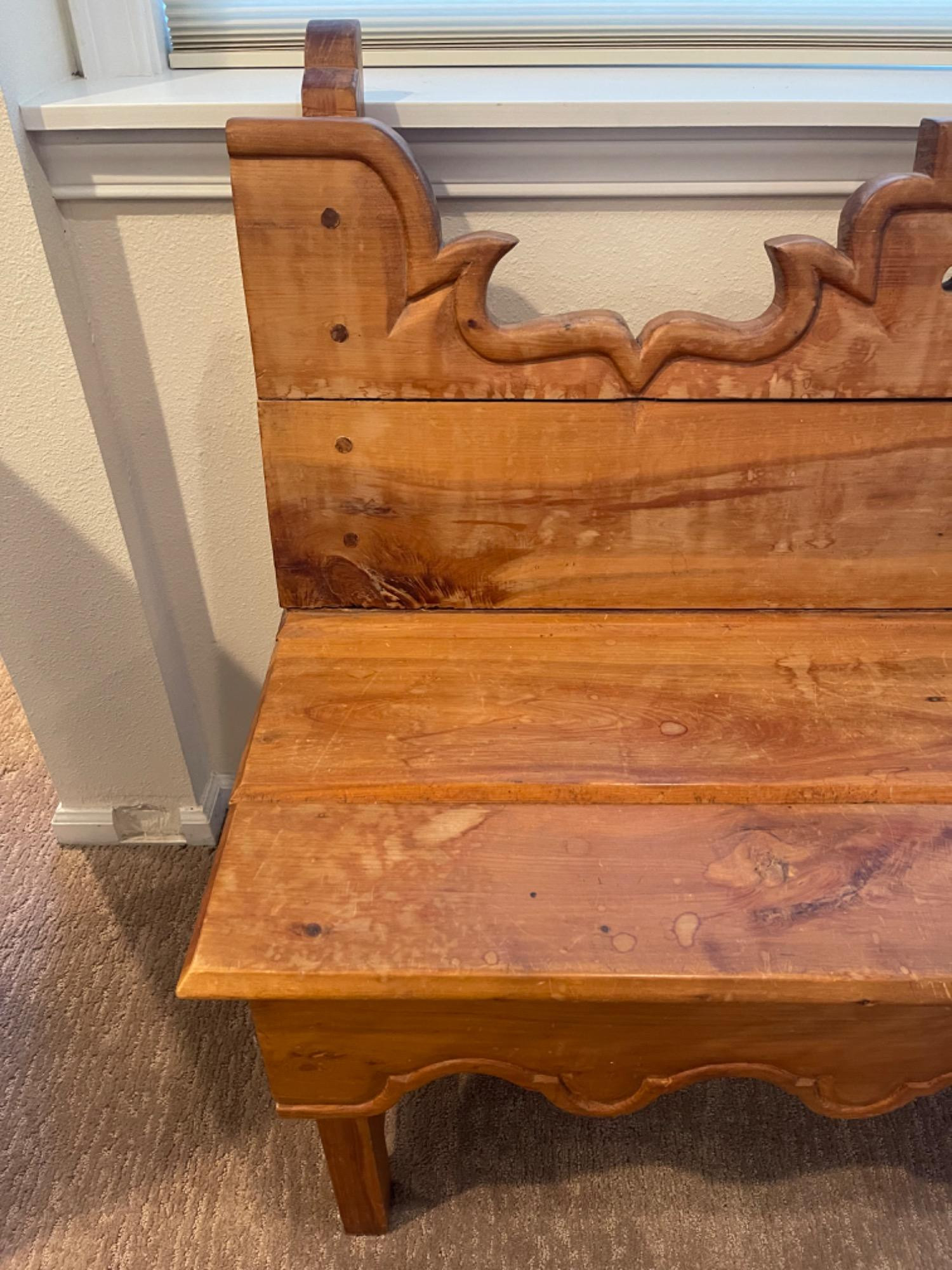 Vintage Hand Carved Solid Wood Bench From Mexico Very used and worn, but in good sturdy condition. Scuffs, scratches and stains are all present on wood. This piece was brought up from Mexico and has passed through generations!