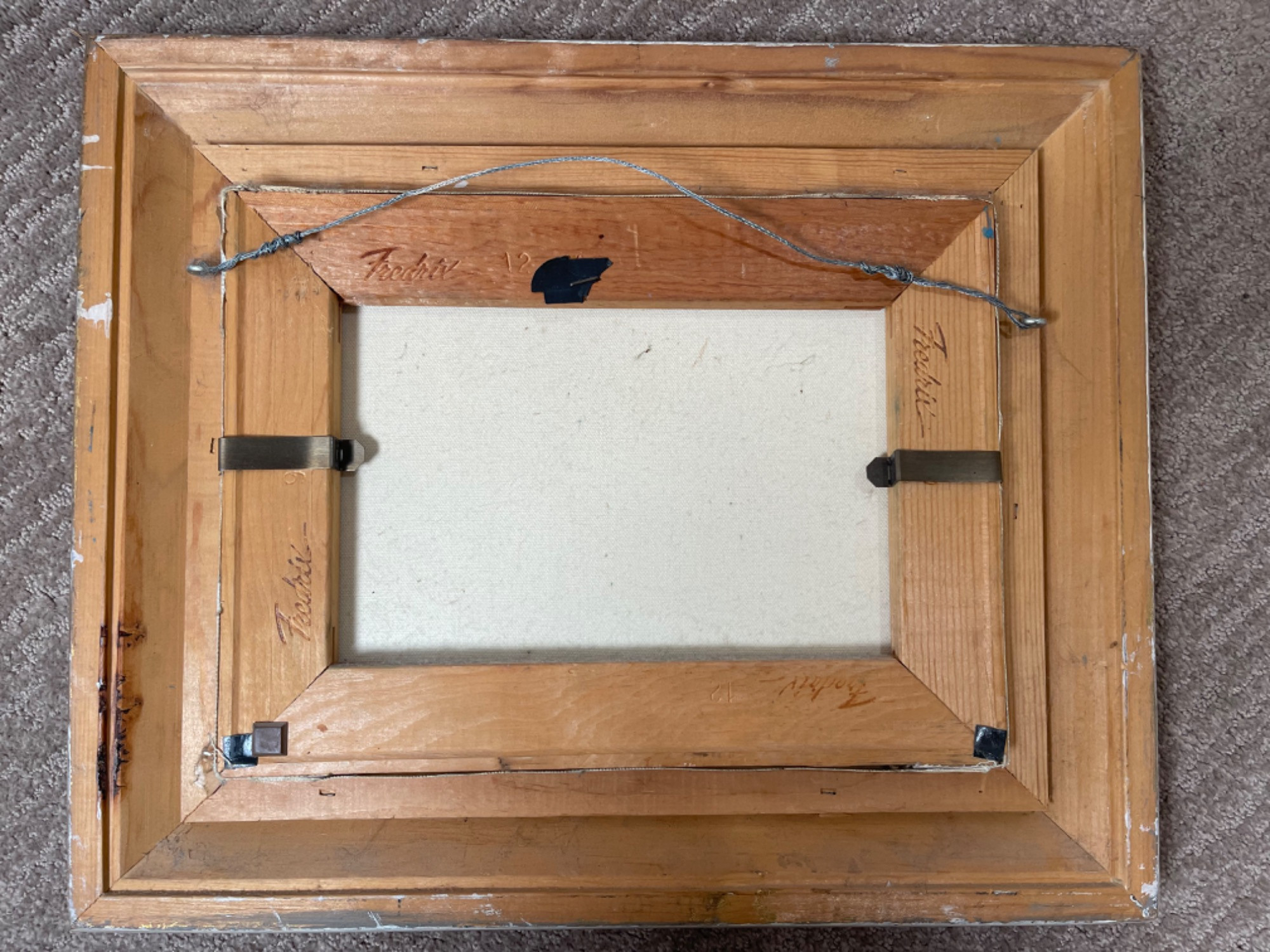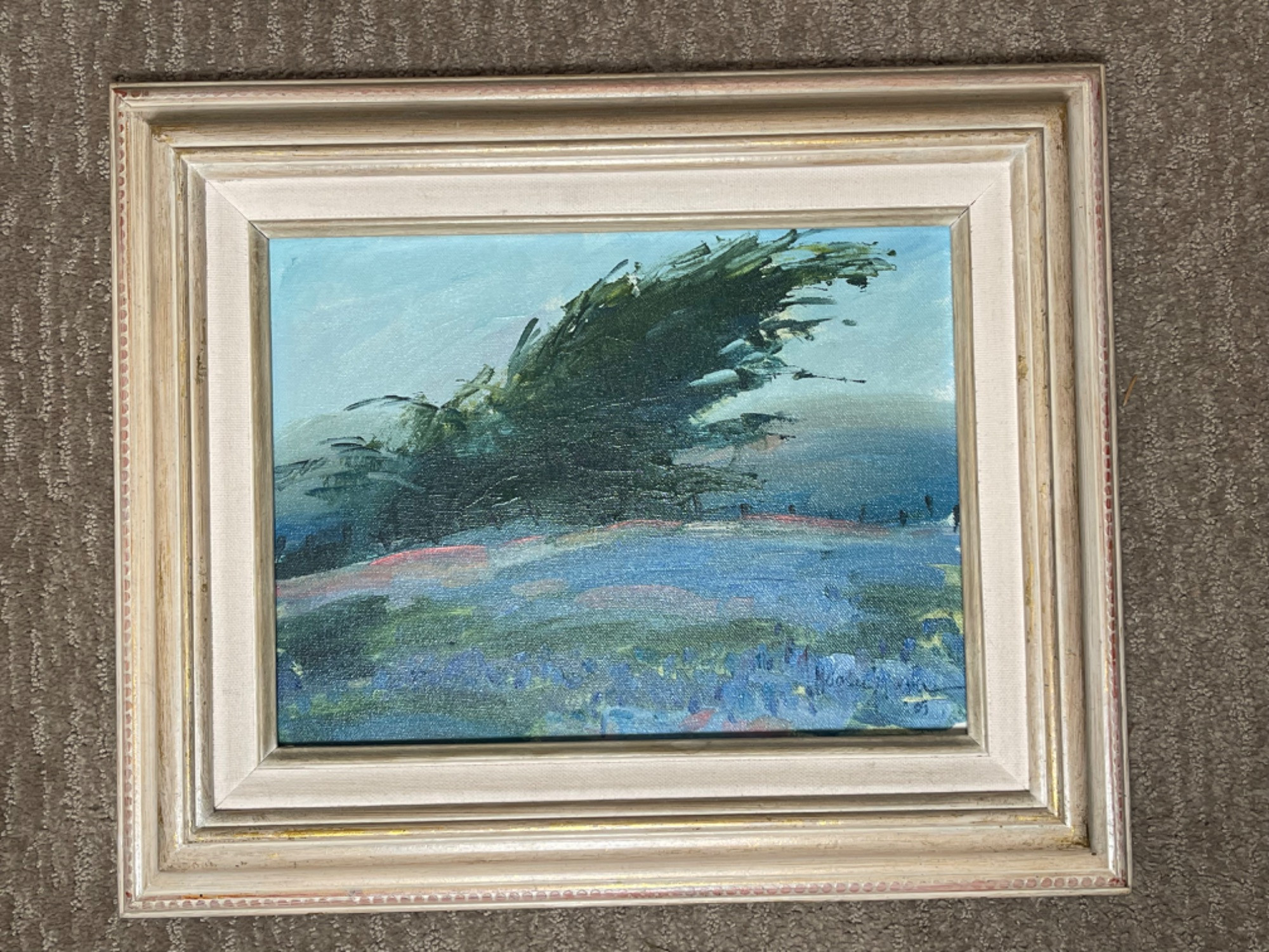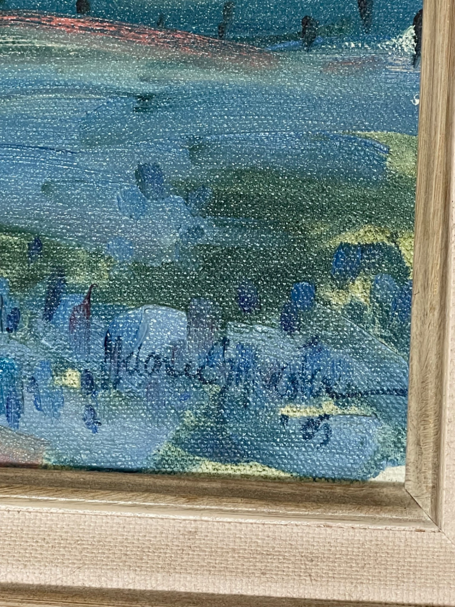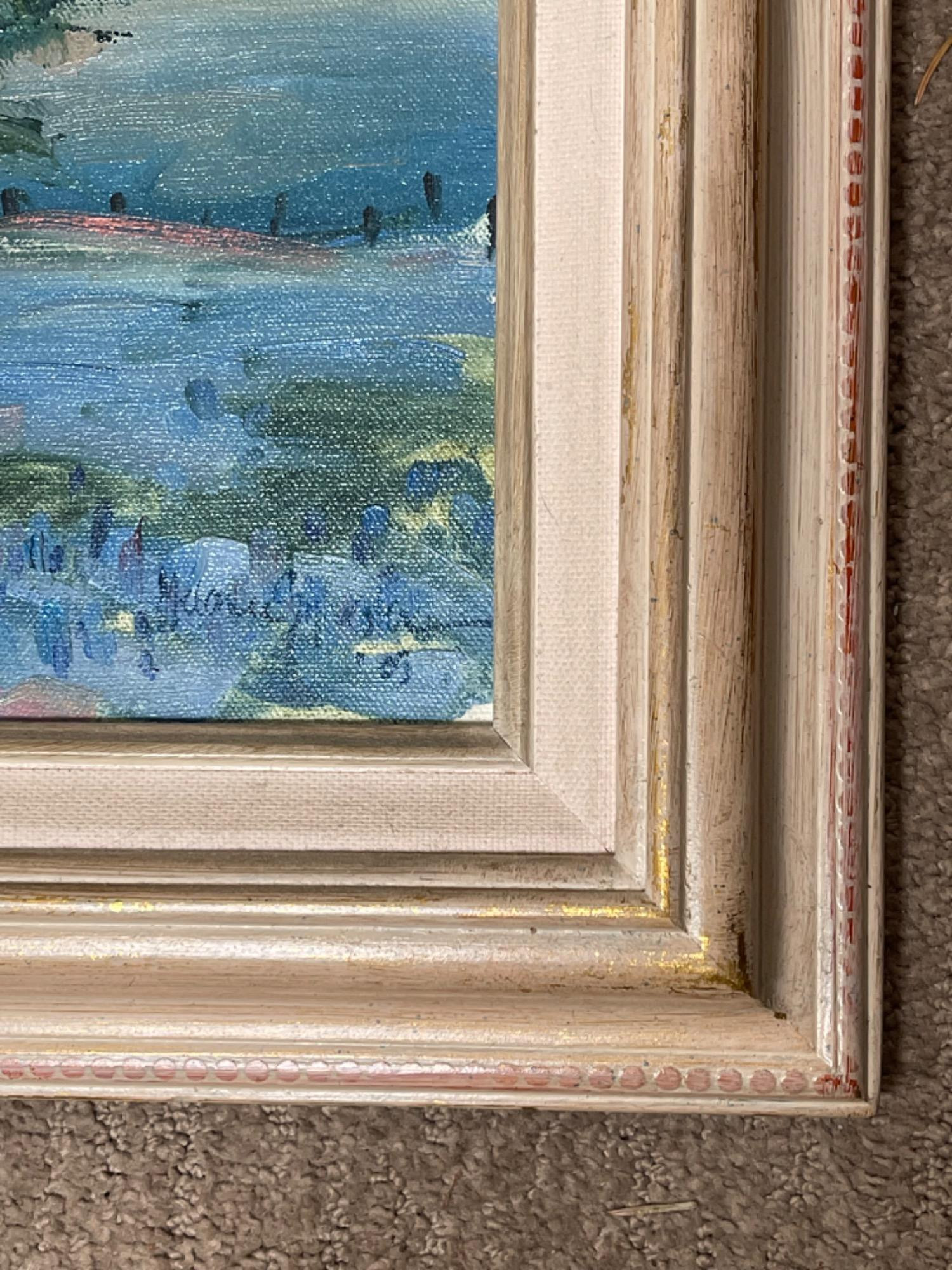 Small Melanee Sylvester Painting Painting has come out of frame on one side. Needs to be resituated in frame, or reframed. Painting in great condition otherwise.