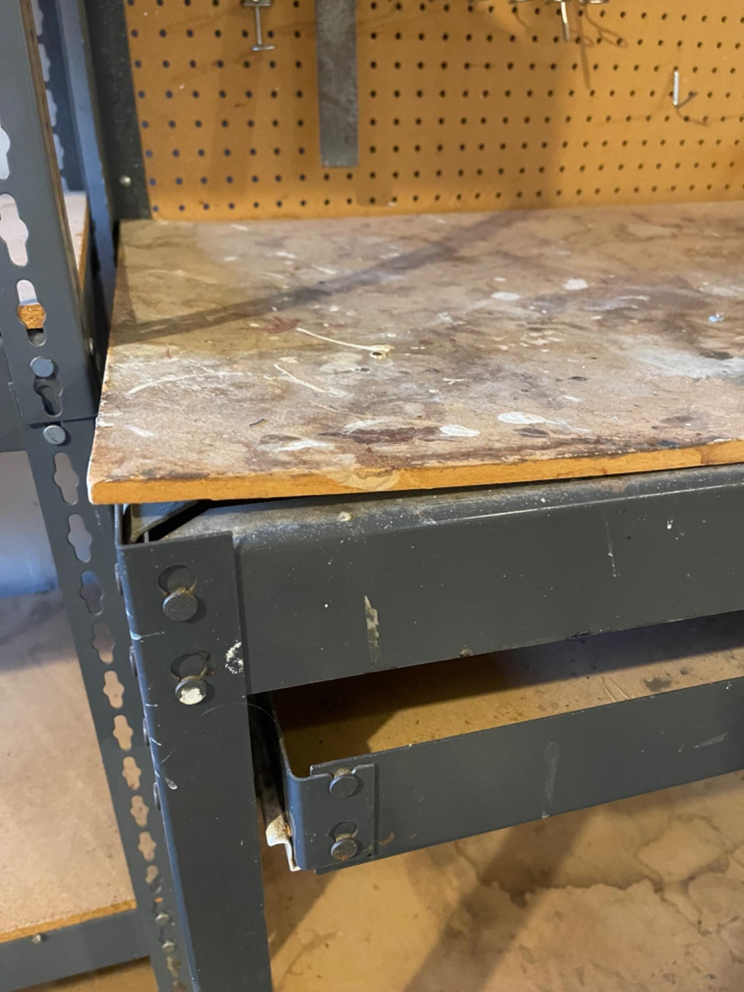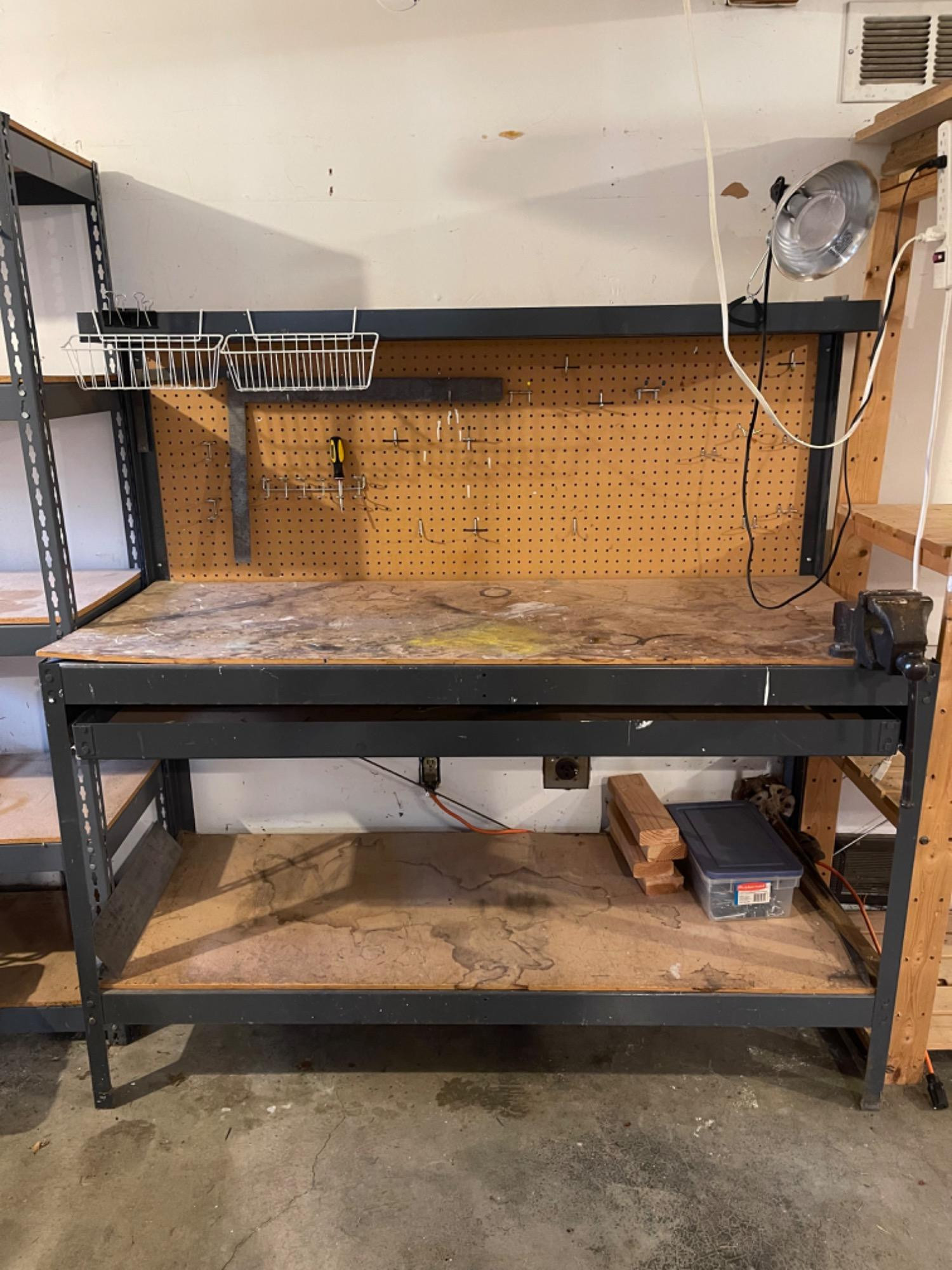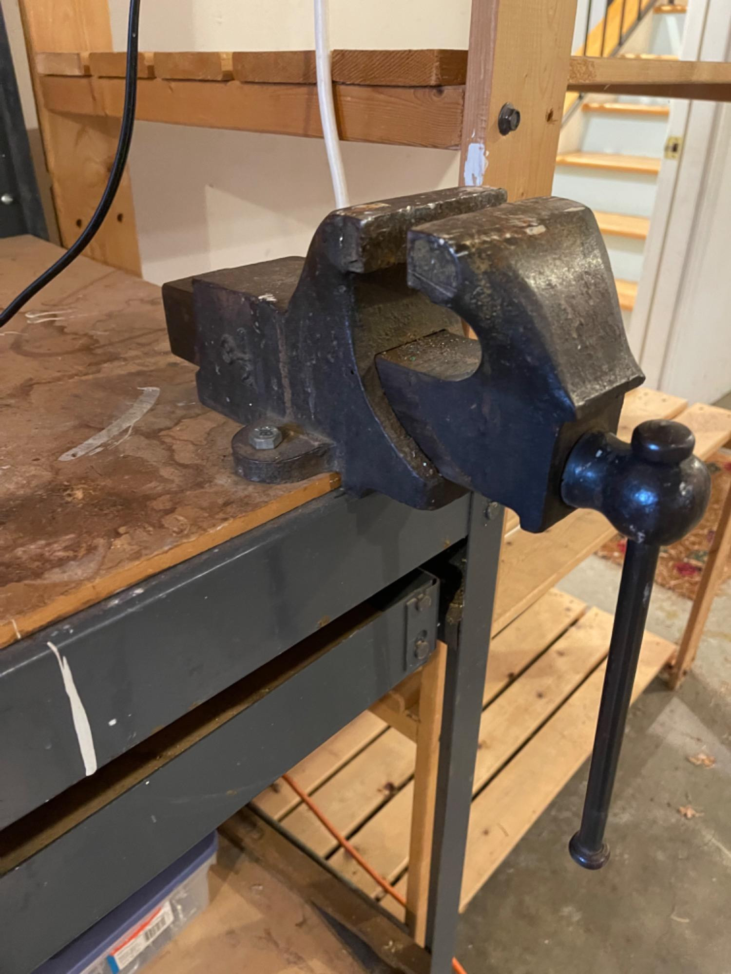 Work Bench Table With Heavy Duty Vise Table boards likely need replacing as they are very used. However, frame of table is in great condition.