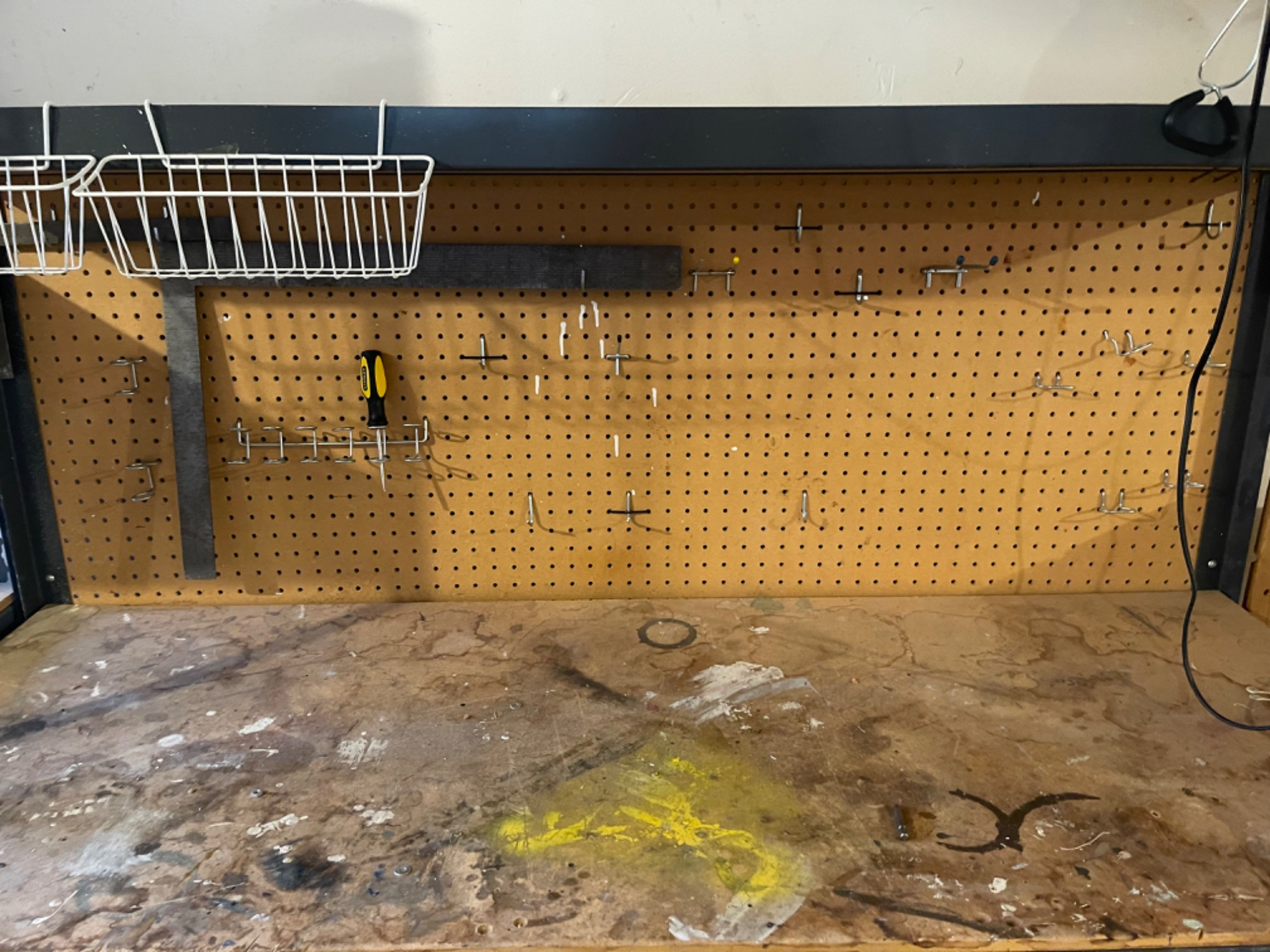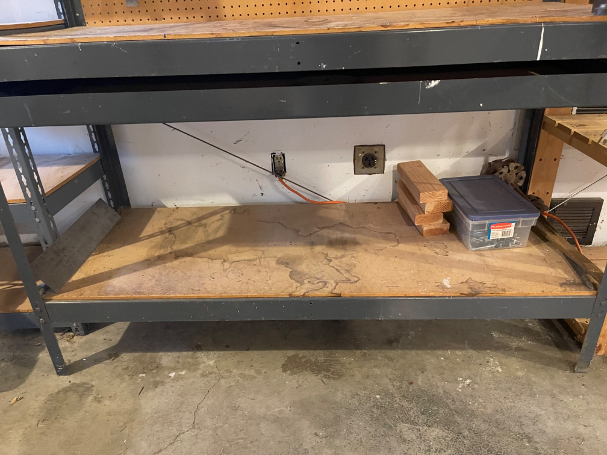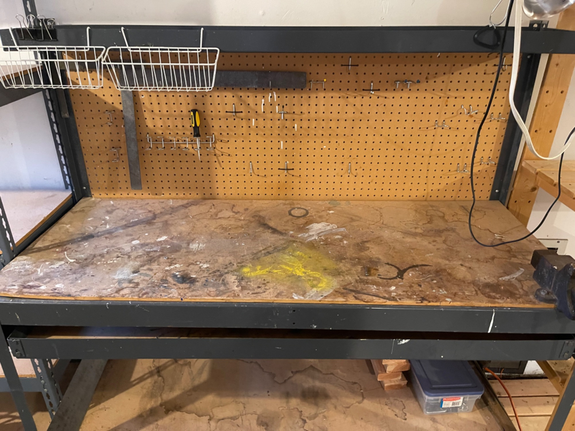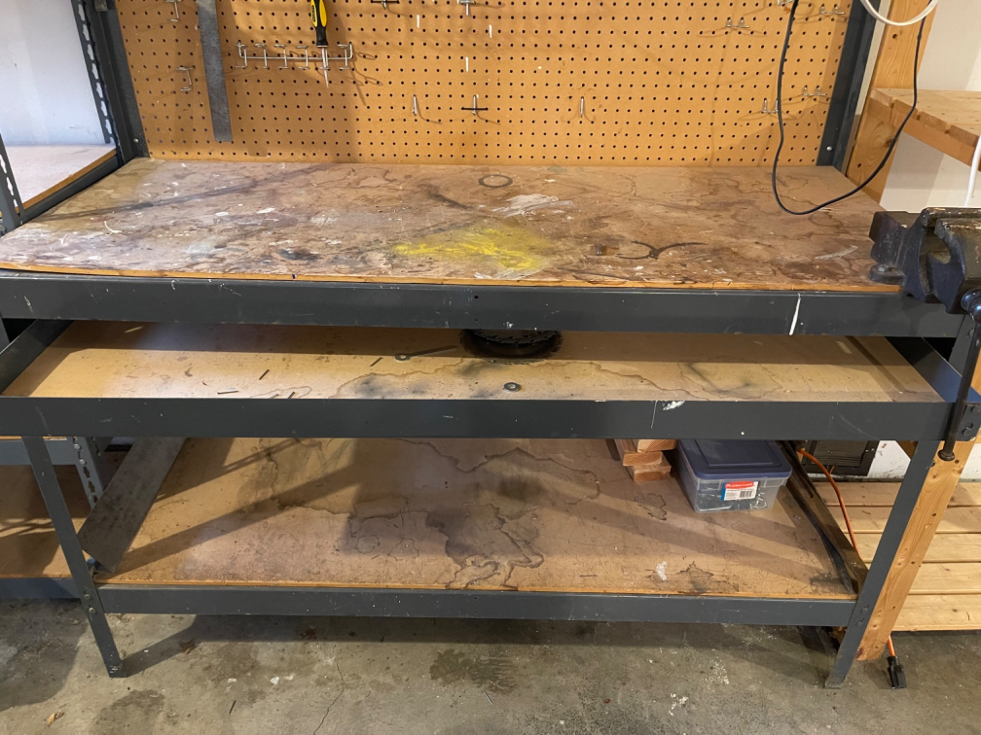 Work Bench Table With Heavy Duty Vise Table boards likely need replacing as they are very used. However, frame of table is in great condition.