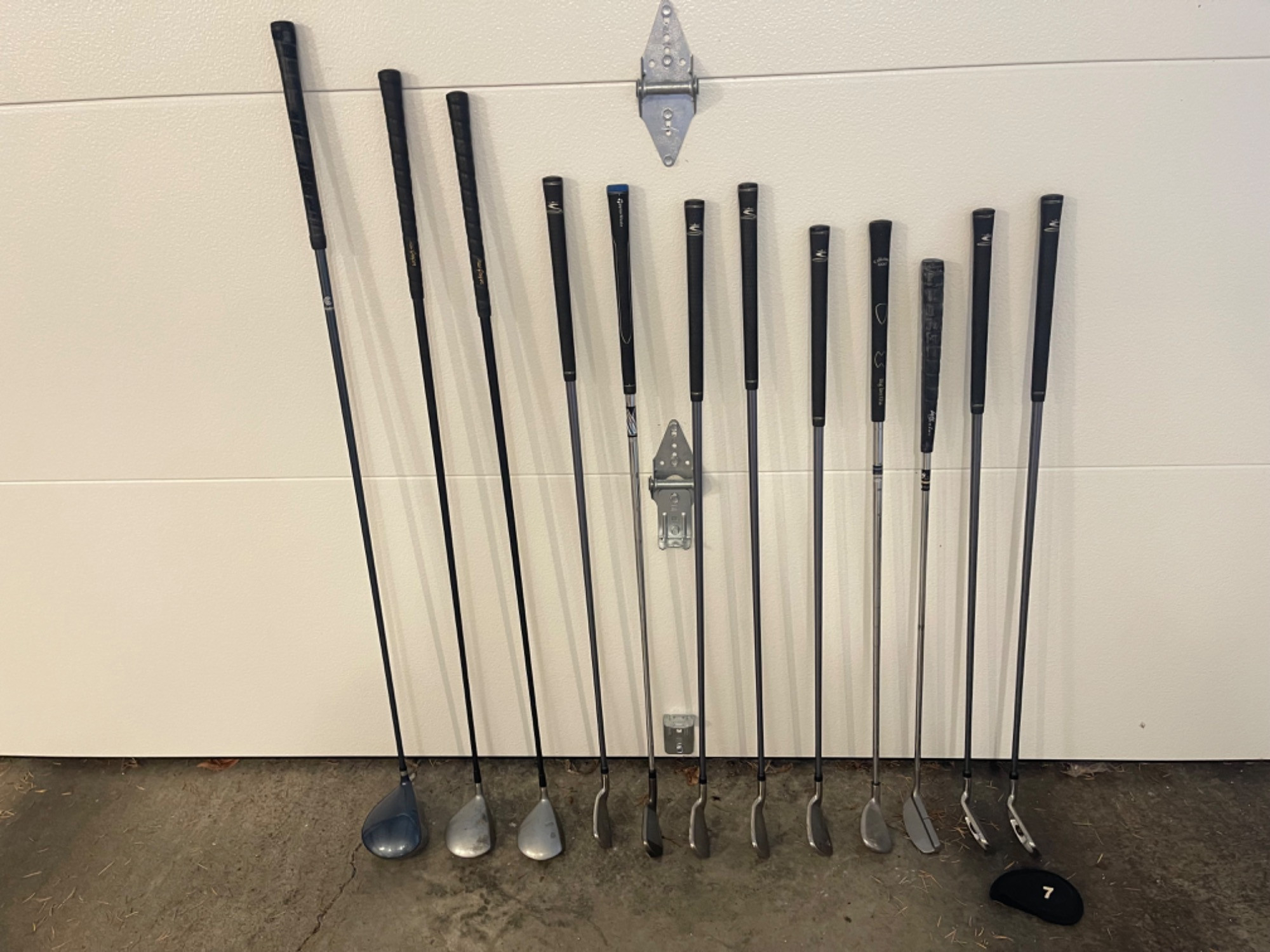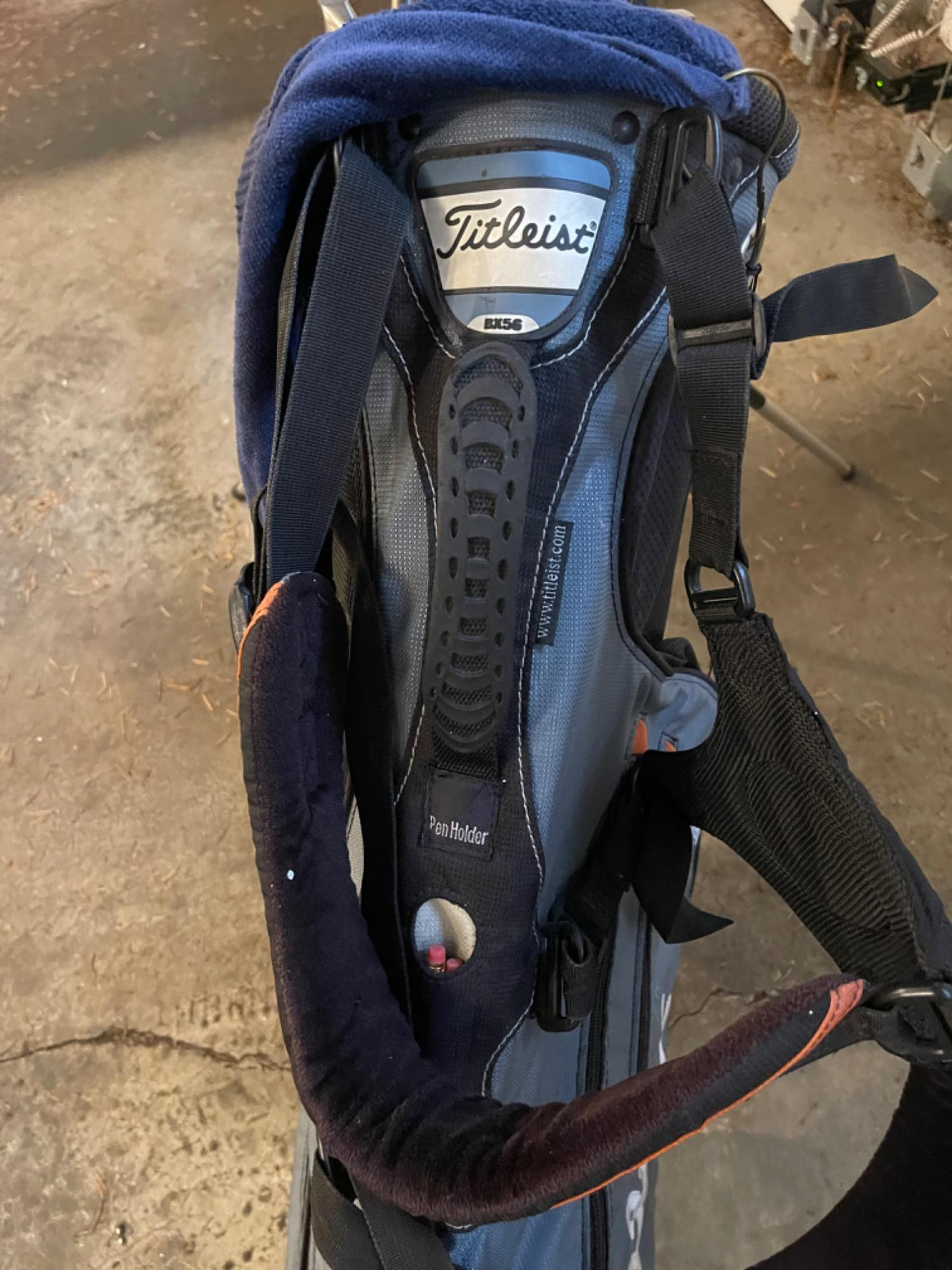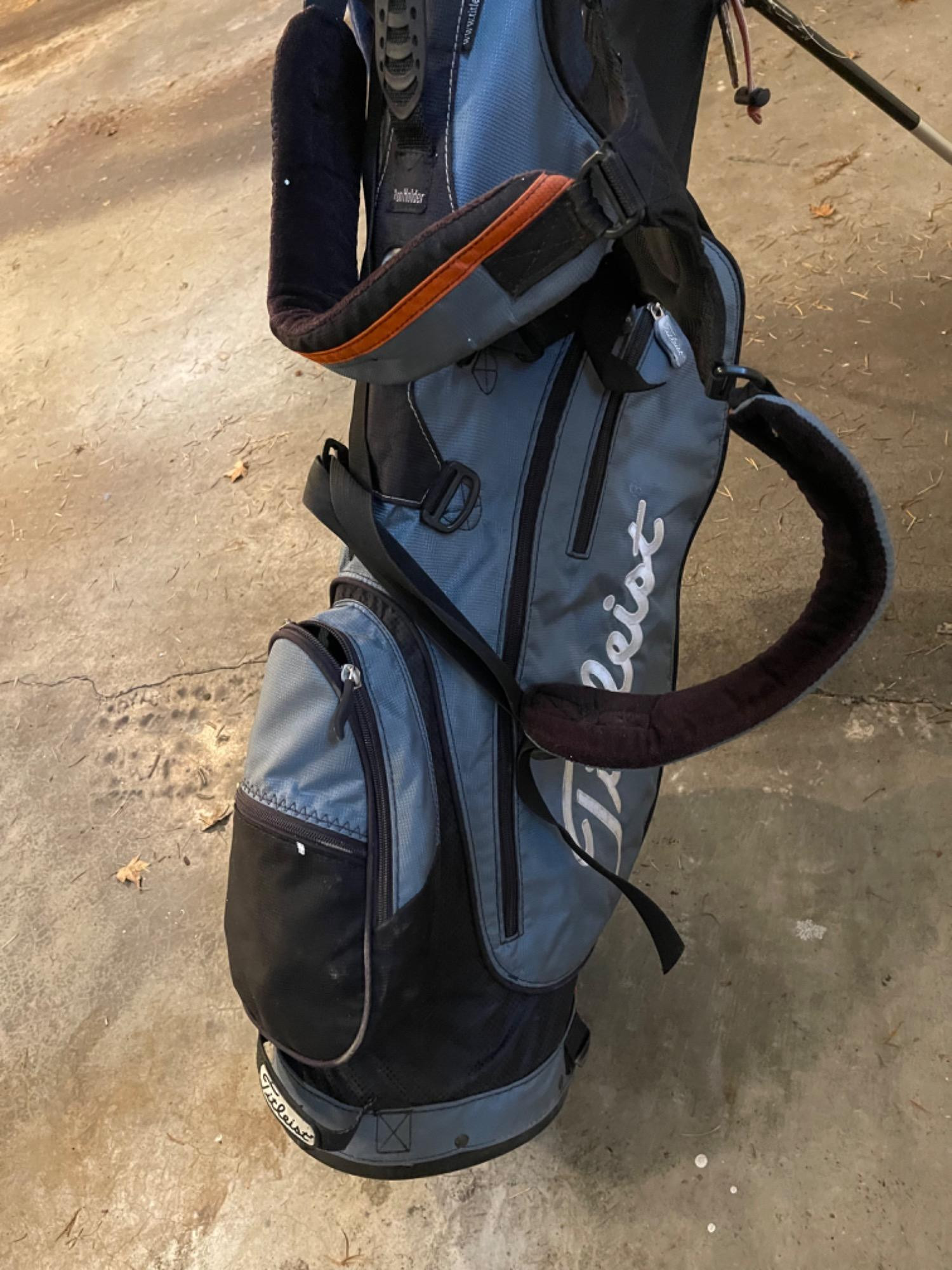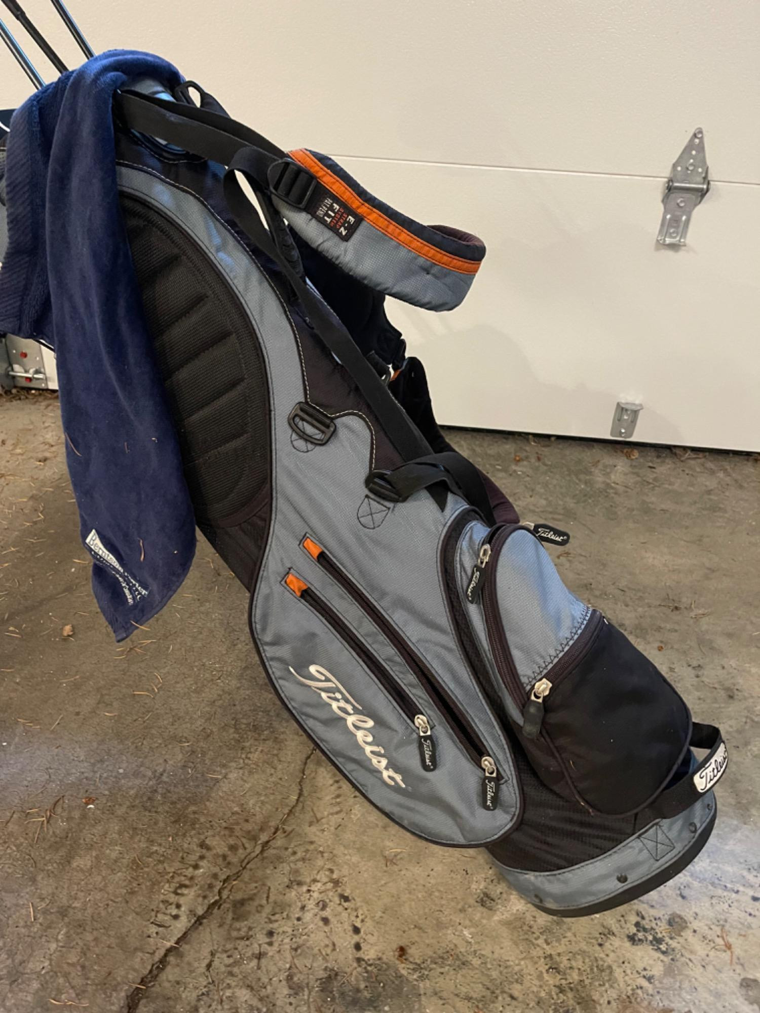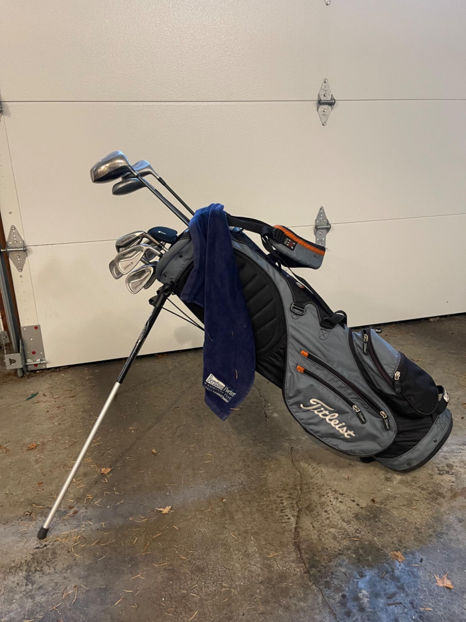 Golf Clubs and Titleist Bag All in good used condition. All have scuffs and scratches from use. Shortest: 34" L Longest: 46" L