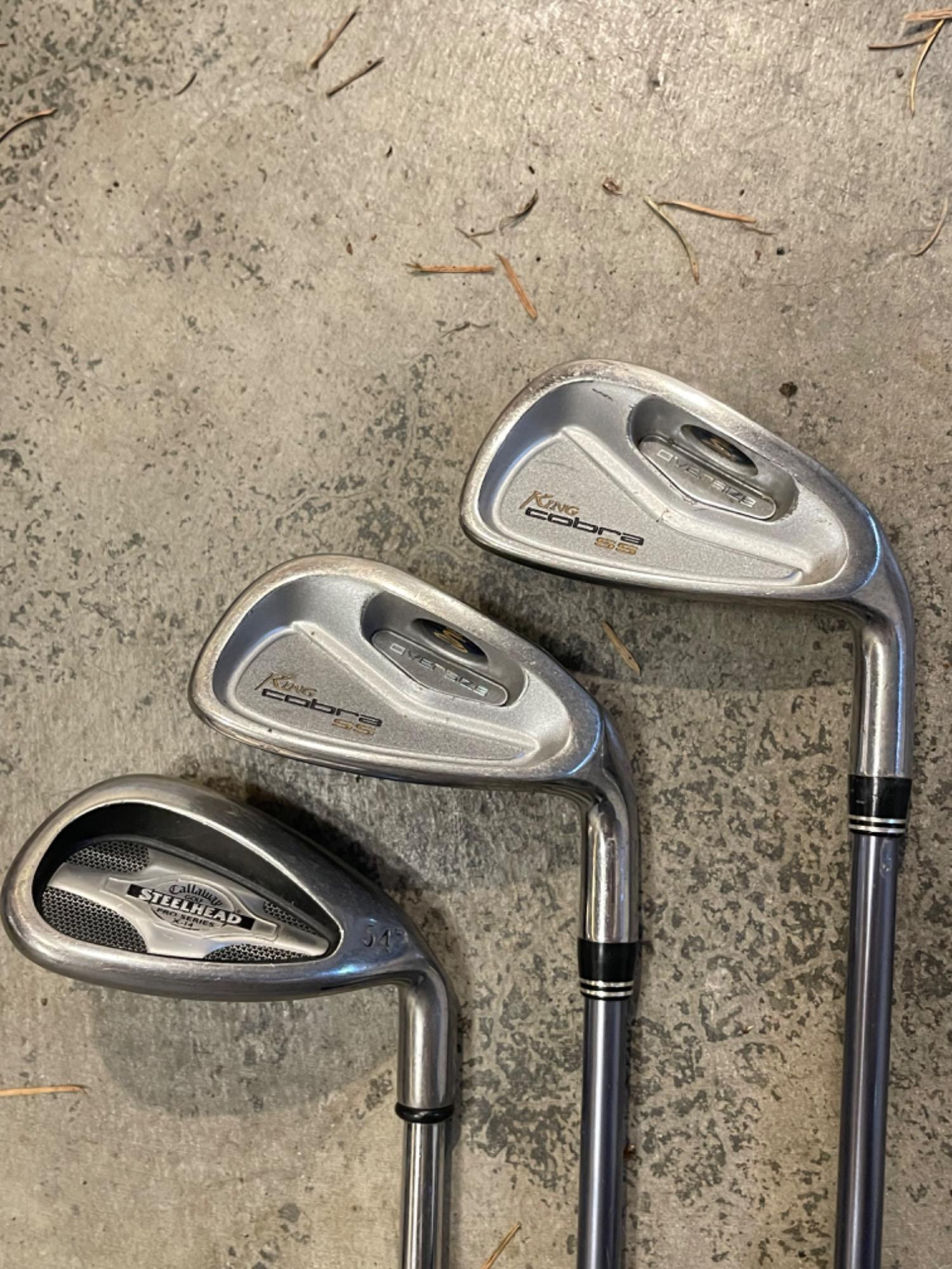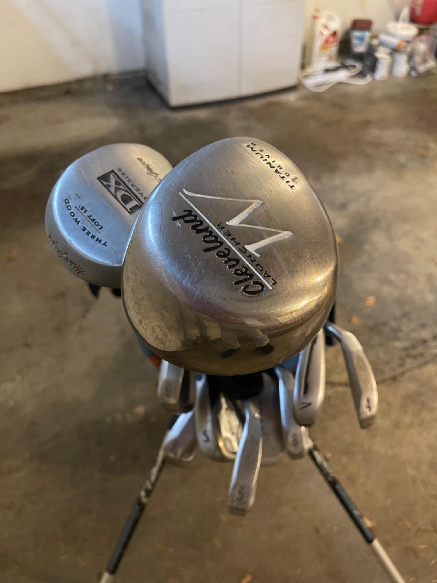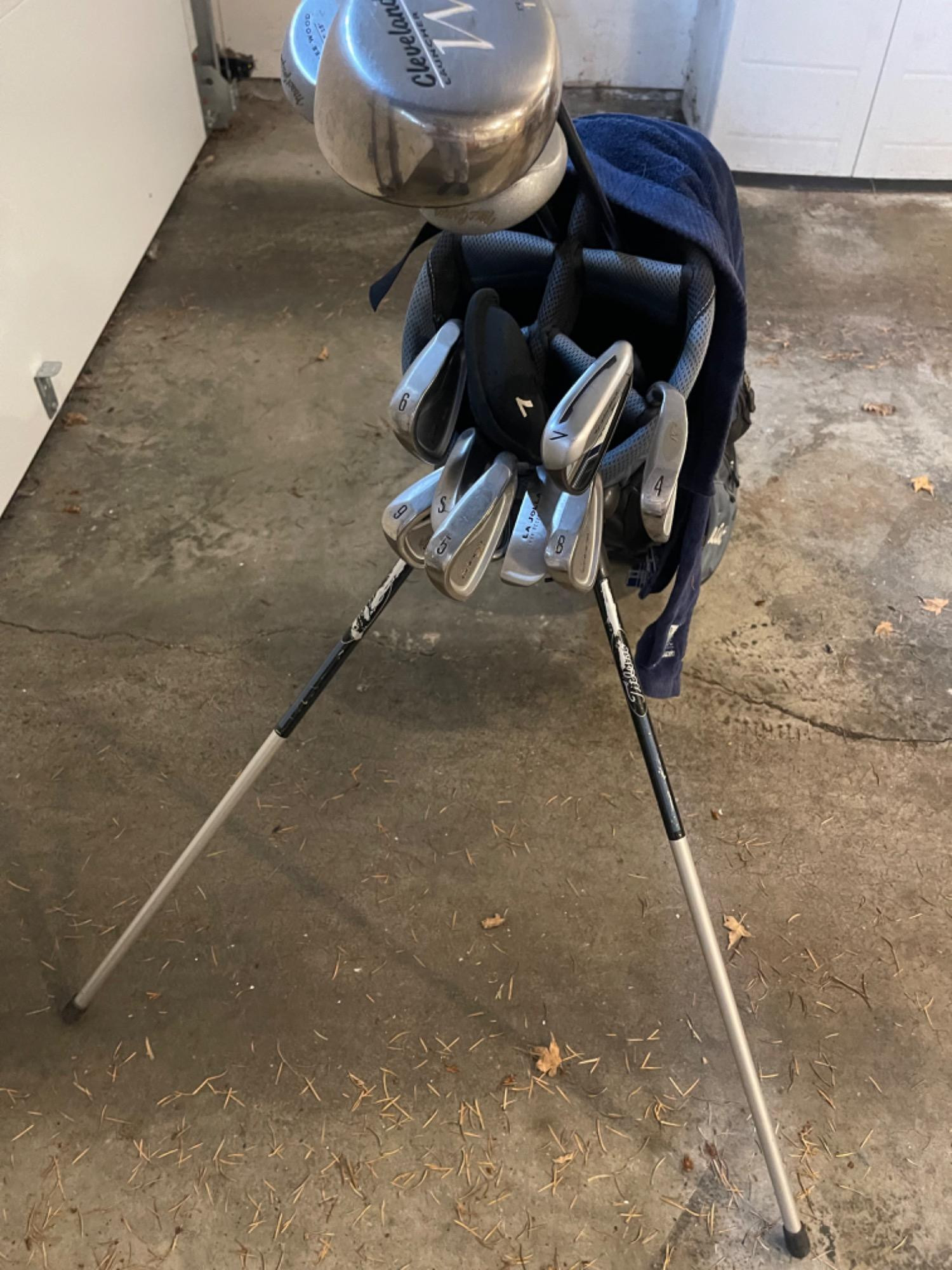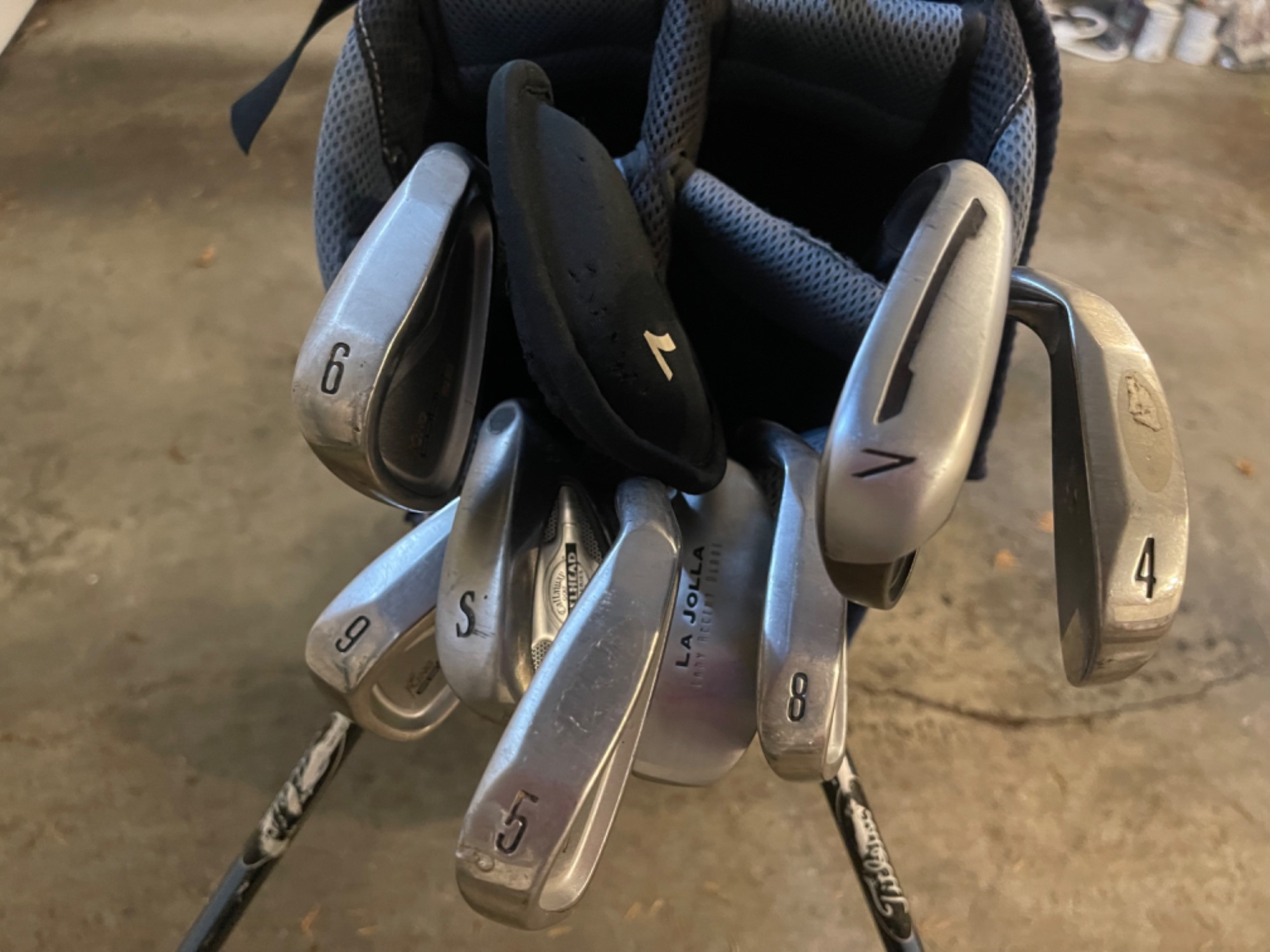 Golf Clubs and Titleist Bag All in good used condition. All have scuffs and scratches from use. Shortest: 34" L Longest: 46" L