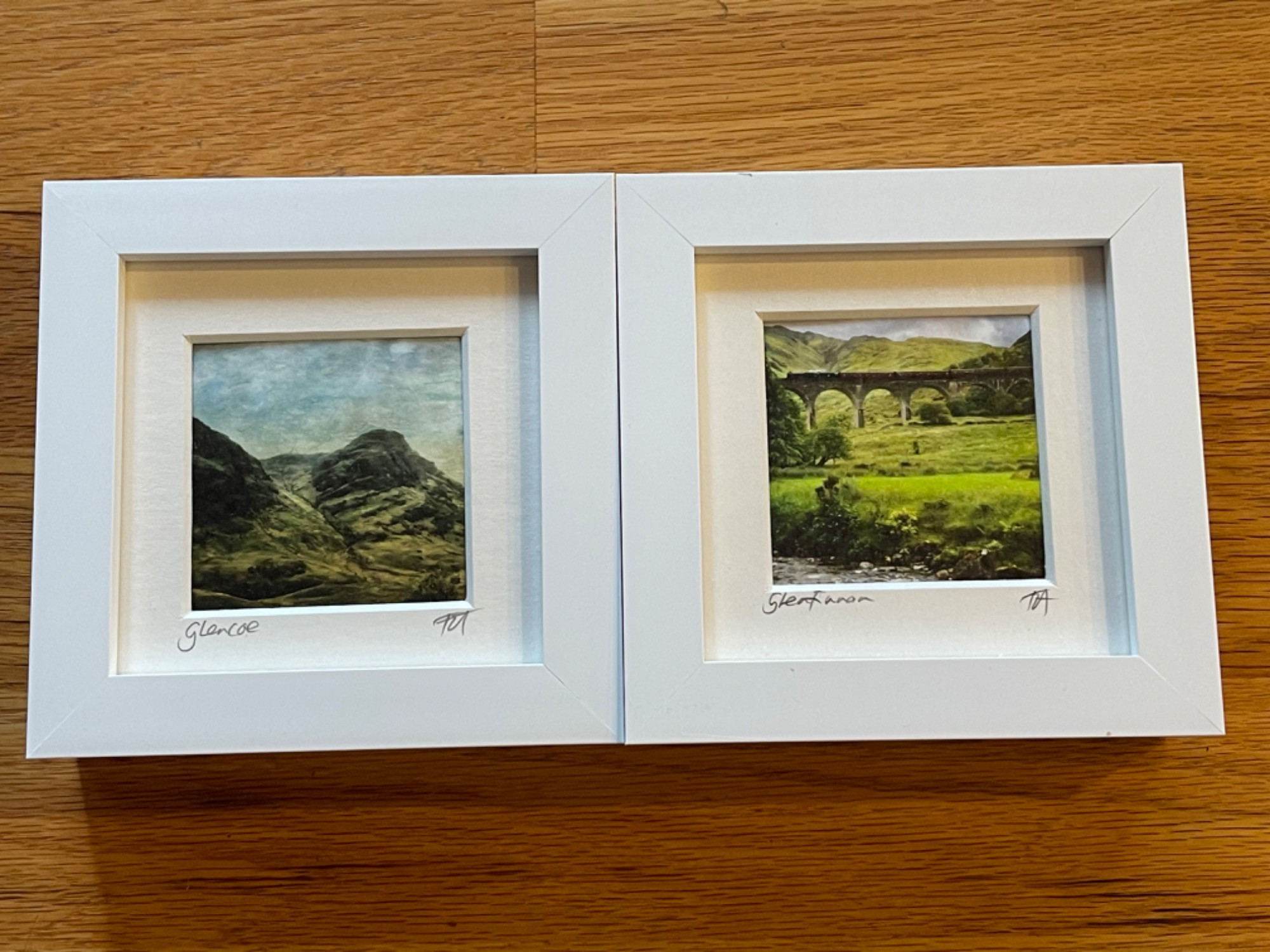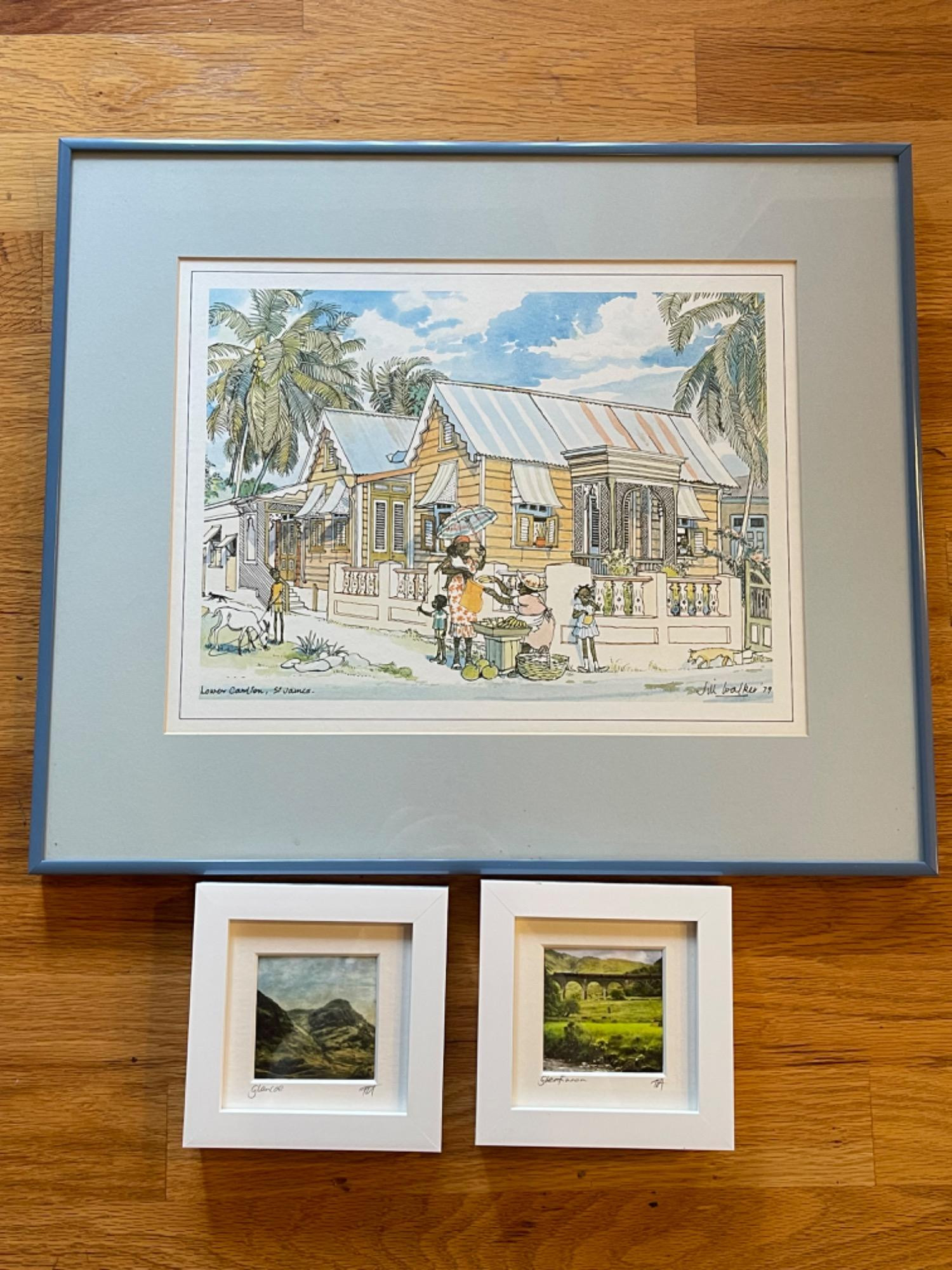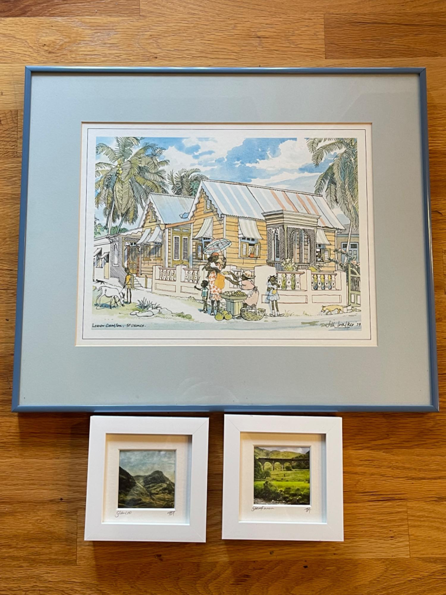 Trio of Beautiful Framed Prints - 2 Signed! Great used condition. Minor scuffs and scratches to frames. Small Prints: 5" W x 5" H Large Print: 18" W x 15.5" H