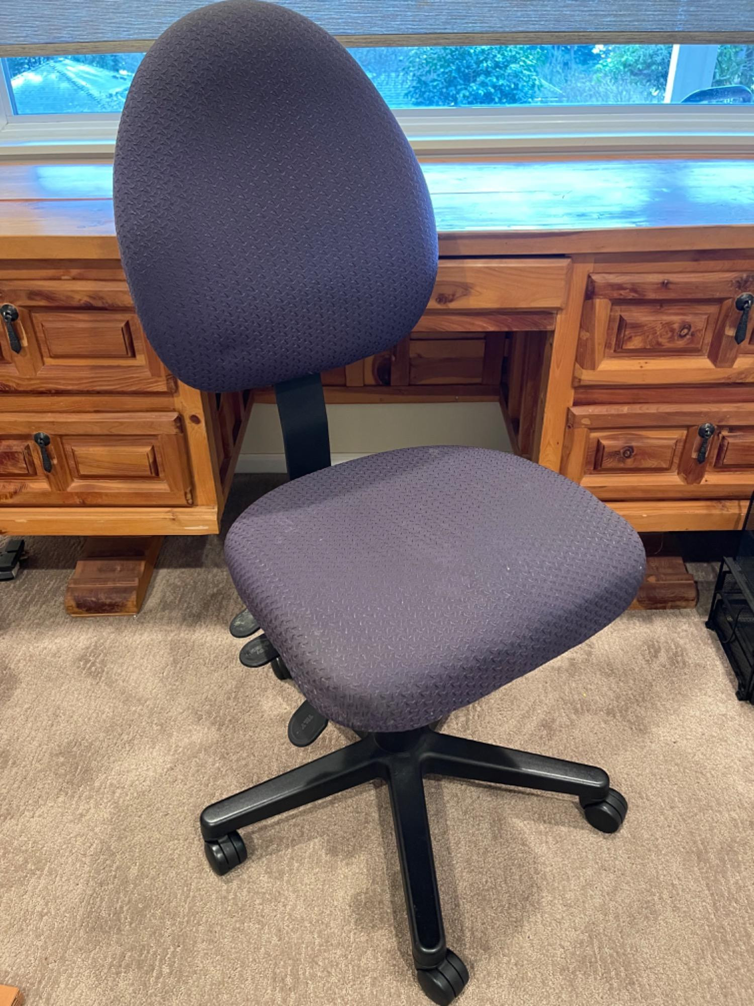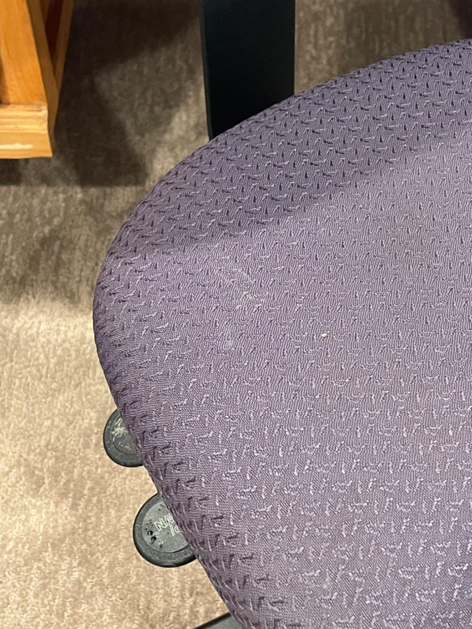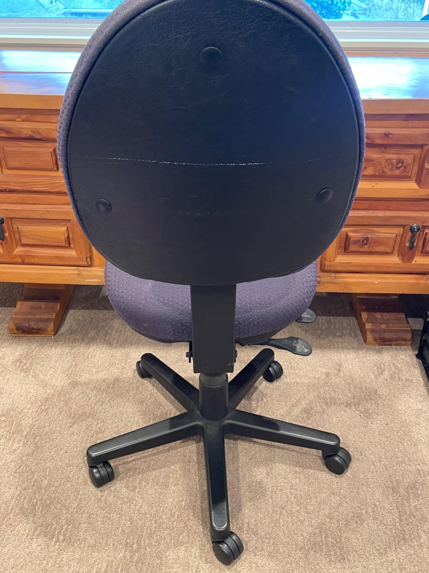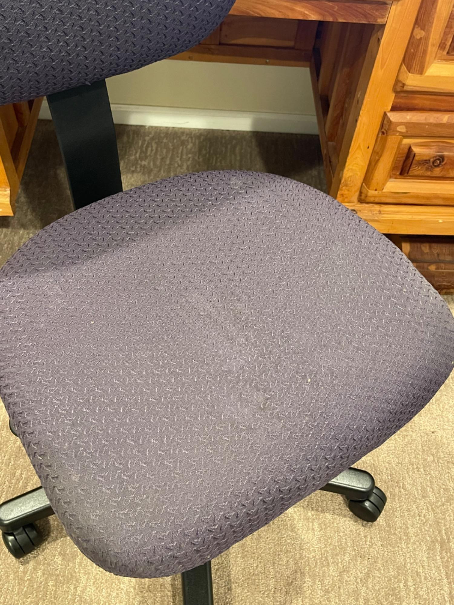 Purple Swivel Rolling Office Chair Multiple stains and scuffs. Very used. Wheels and swivel working well. Sturdy.
