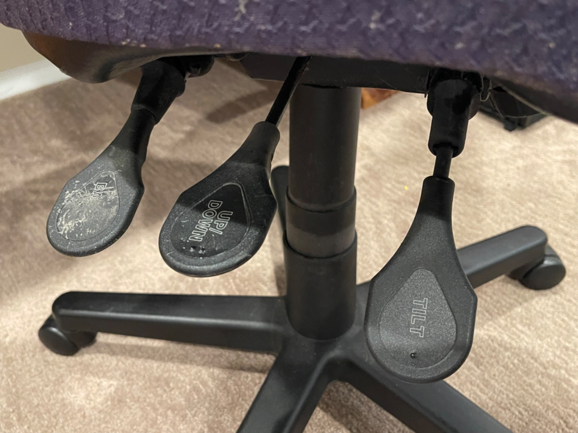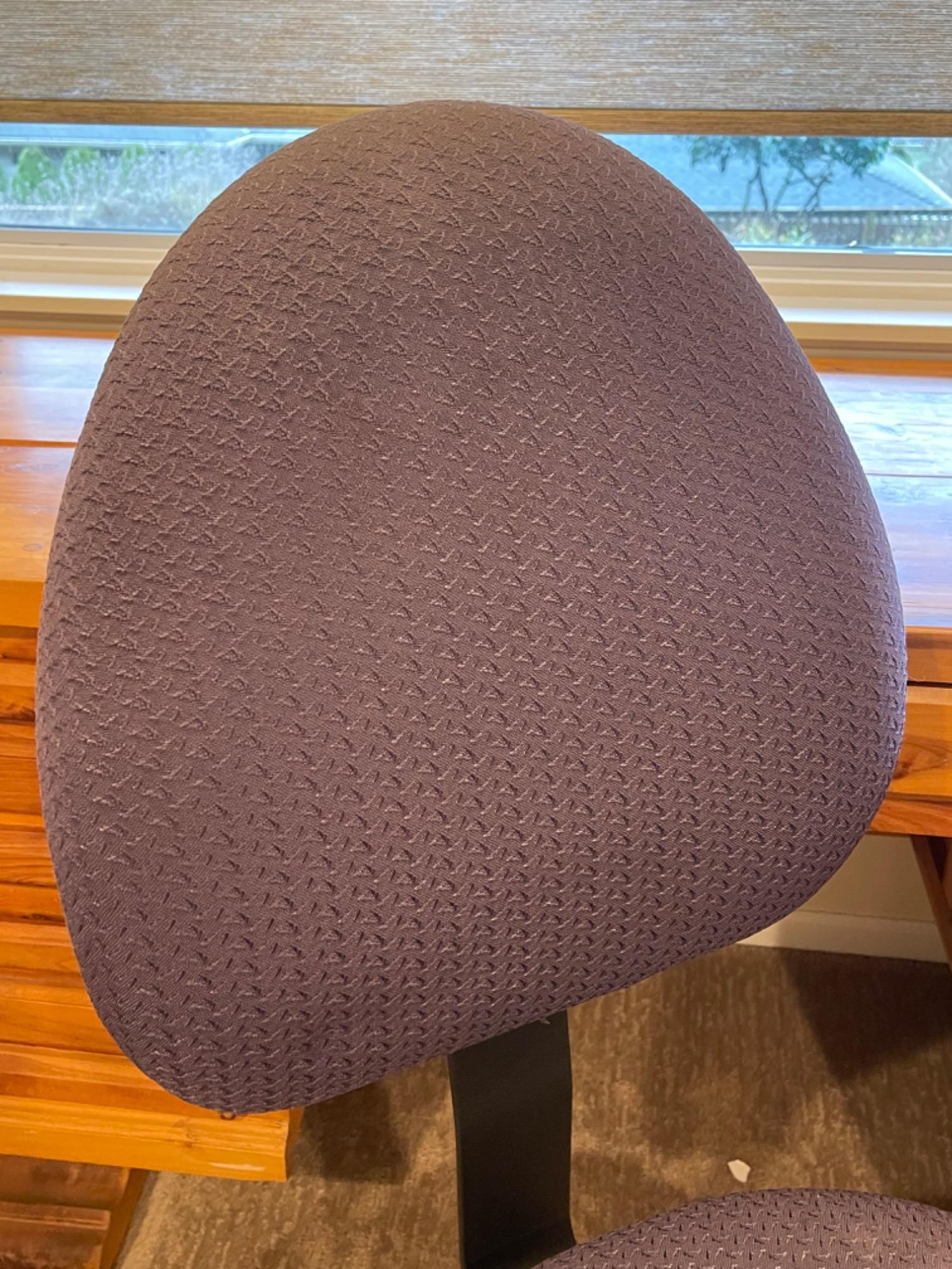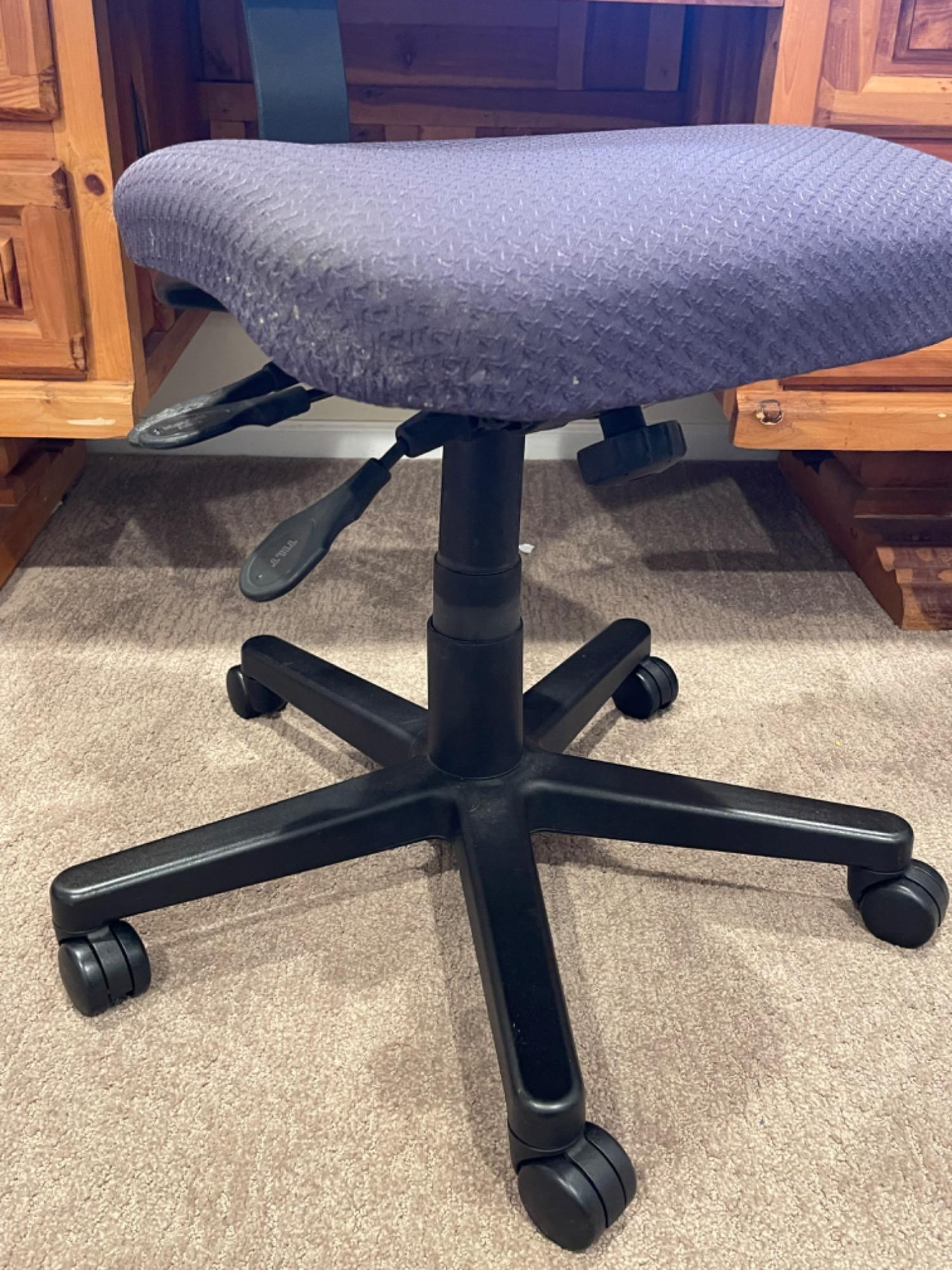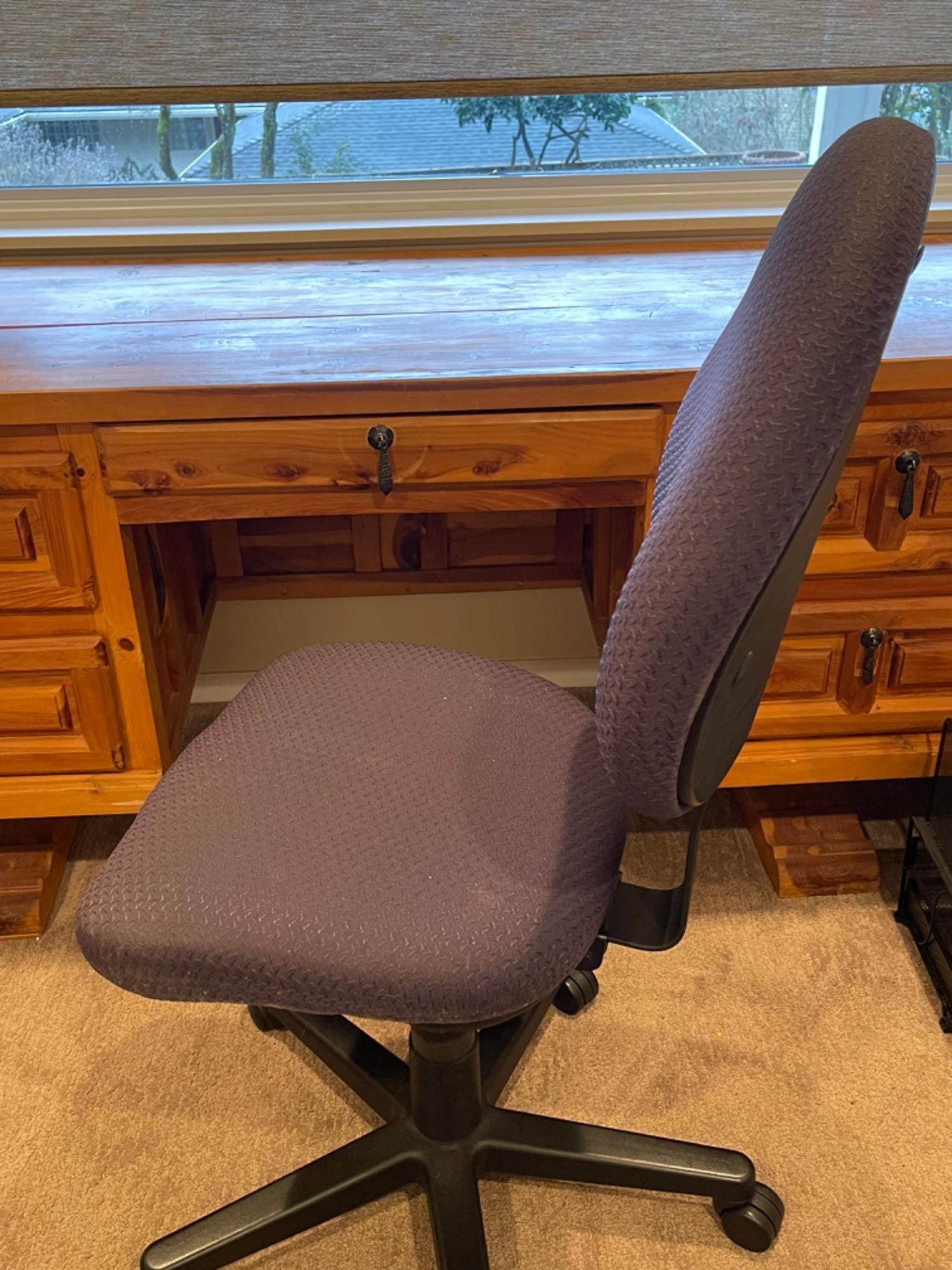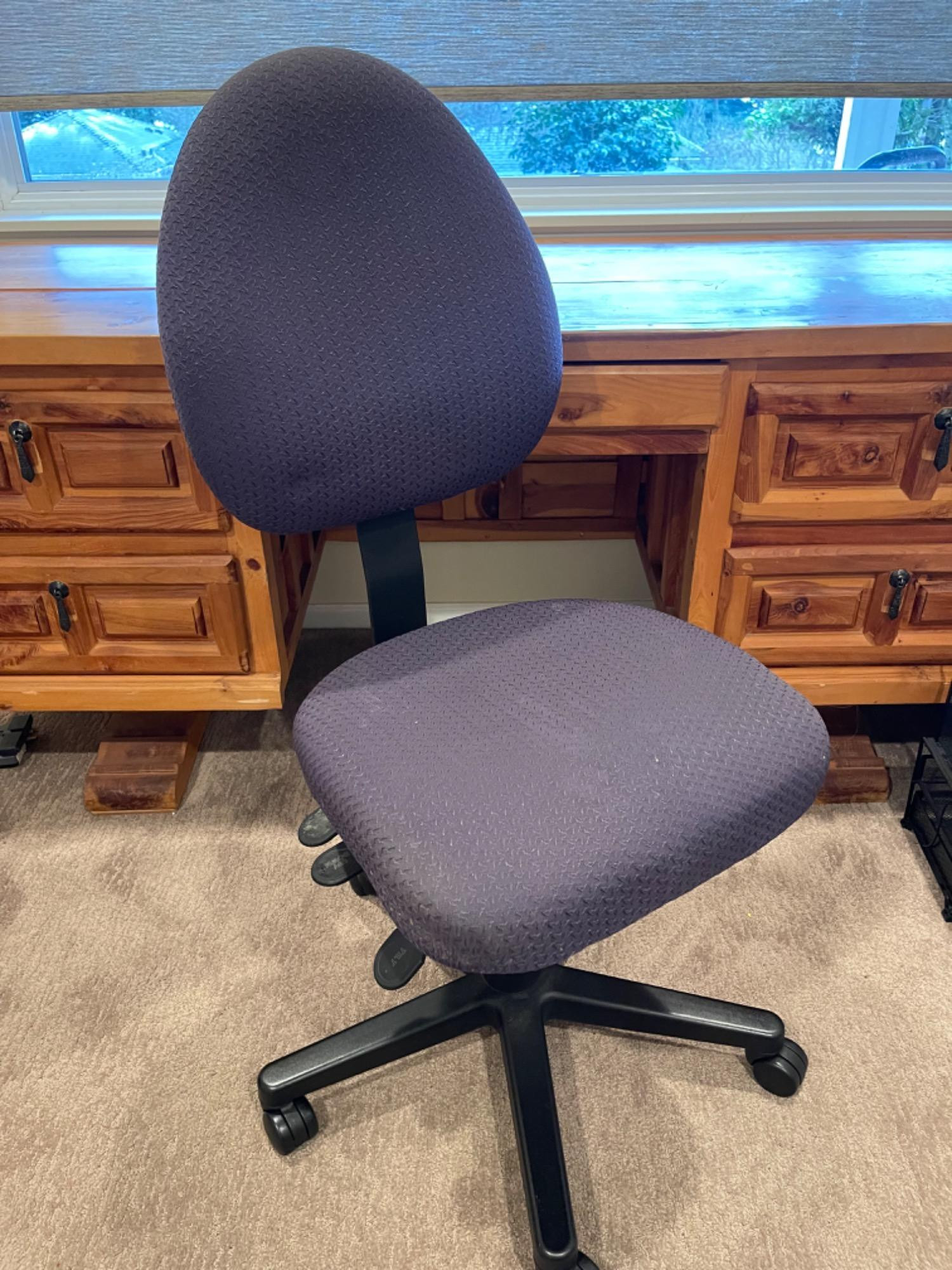 Purple Swivel Rolling Office Chair Multiple stains and scuffs. Very used. Wheels and swivel working well. Sturdy.