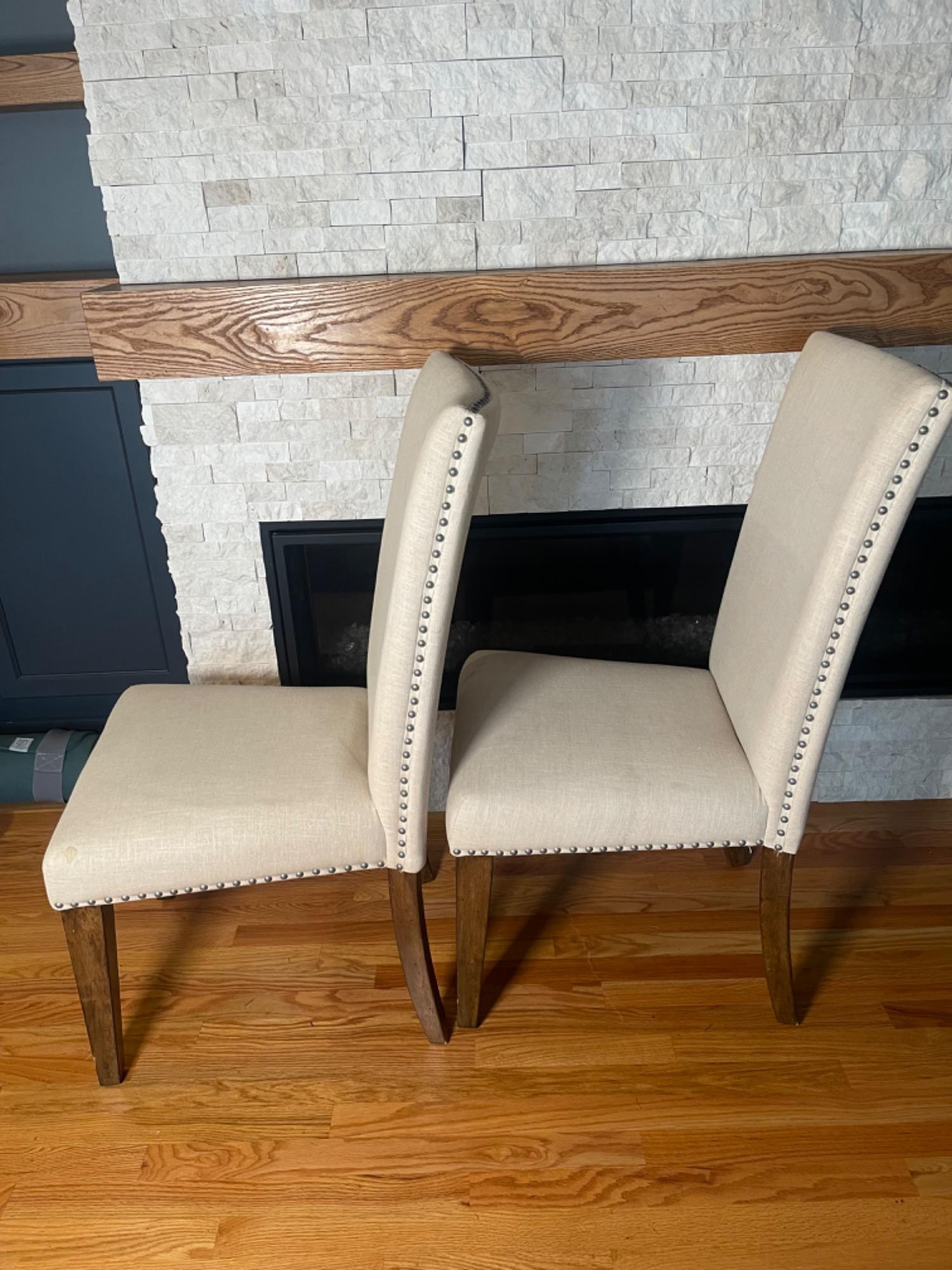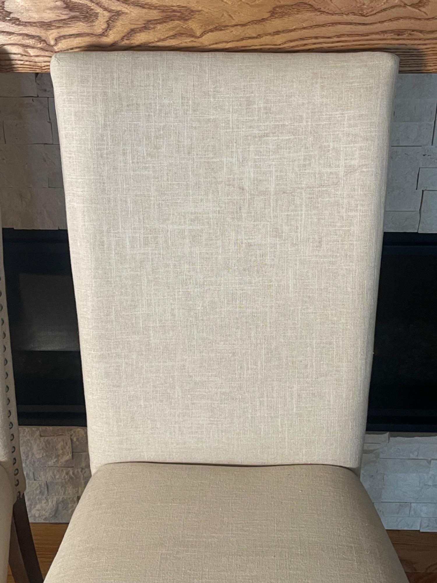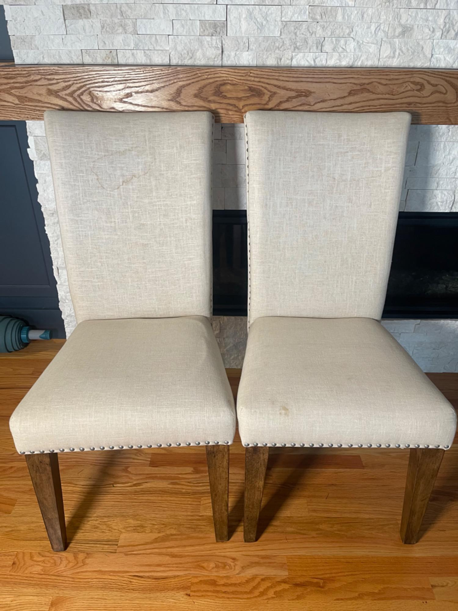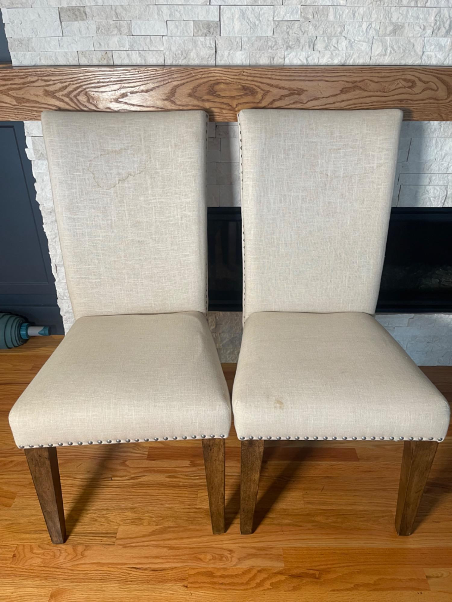 Duo of Beige Upholstered Chairs Both have multiple stains, but are sturdy. Please see photos.