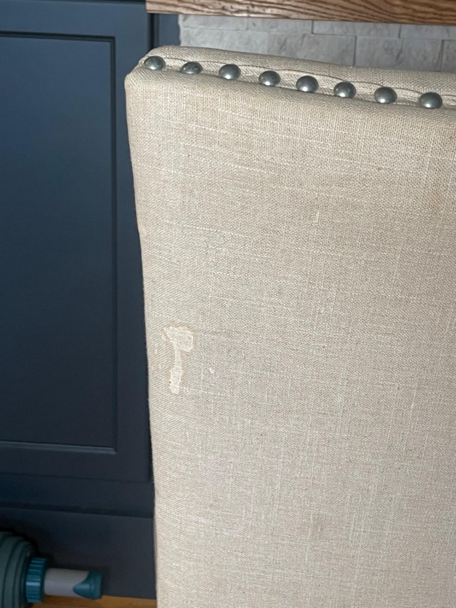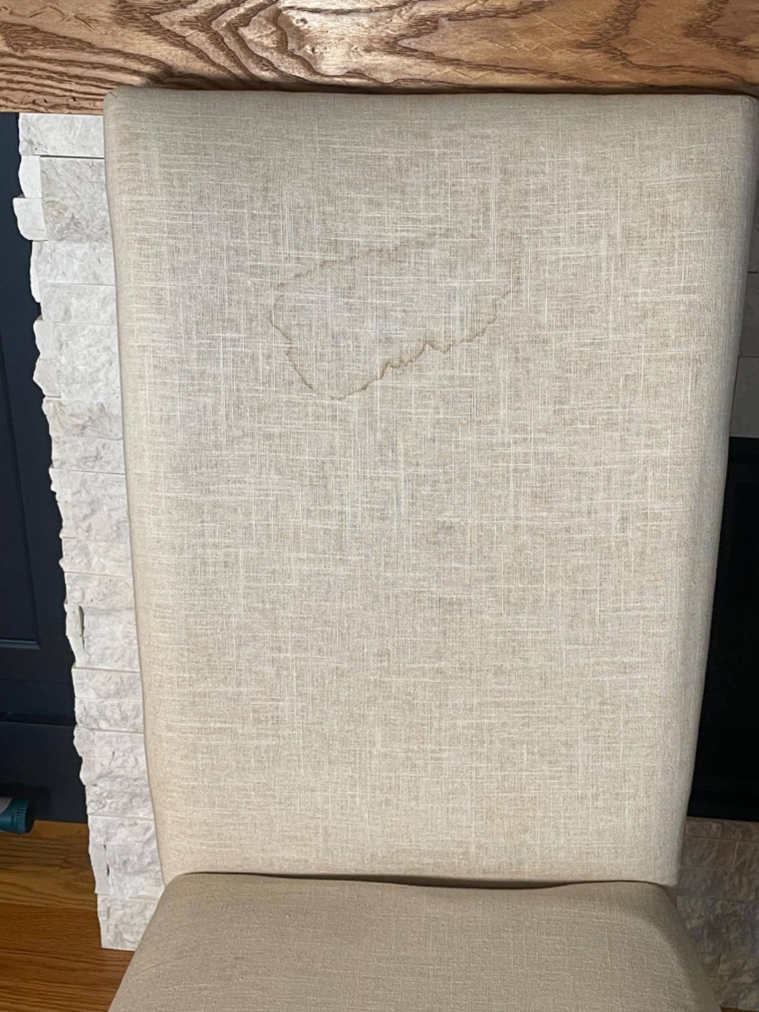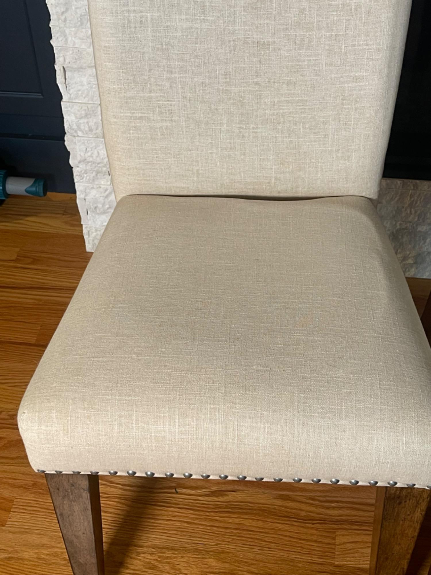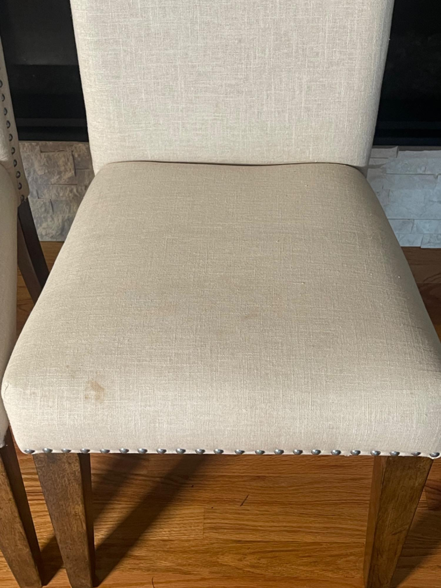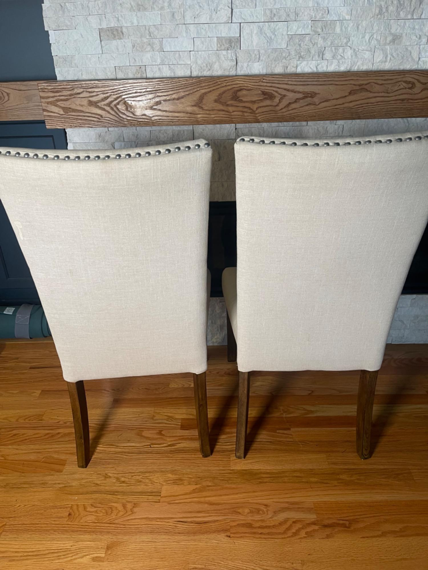 Duo of Beige Upholstered Chairs Both have multiple stains, but are sturdy. Please see photos.