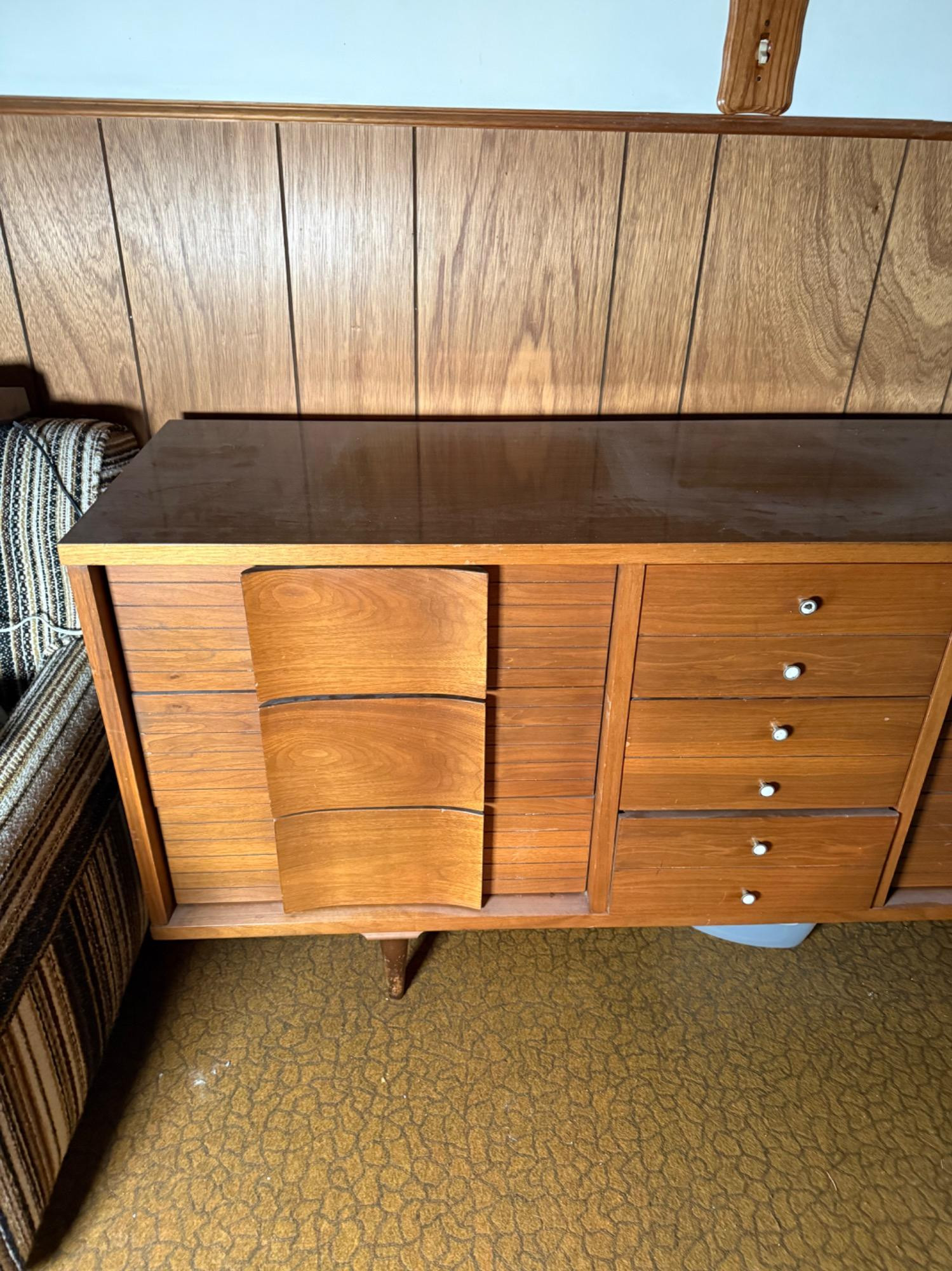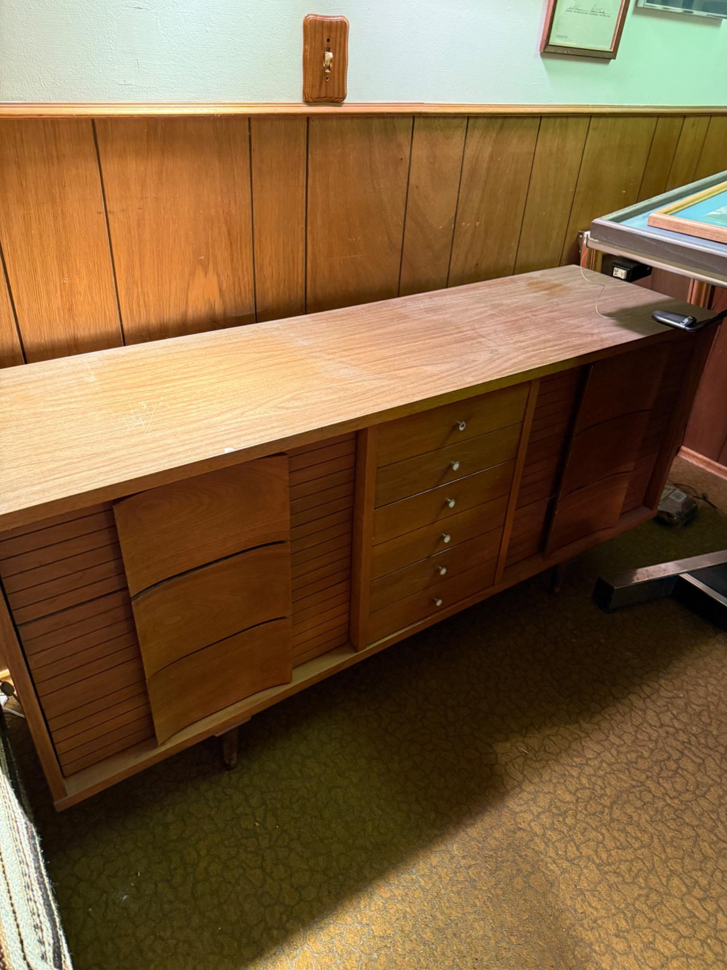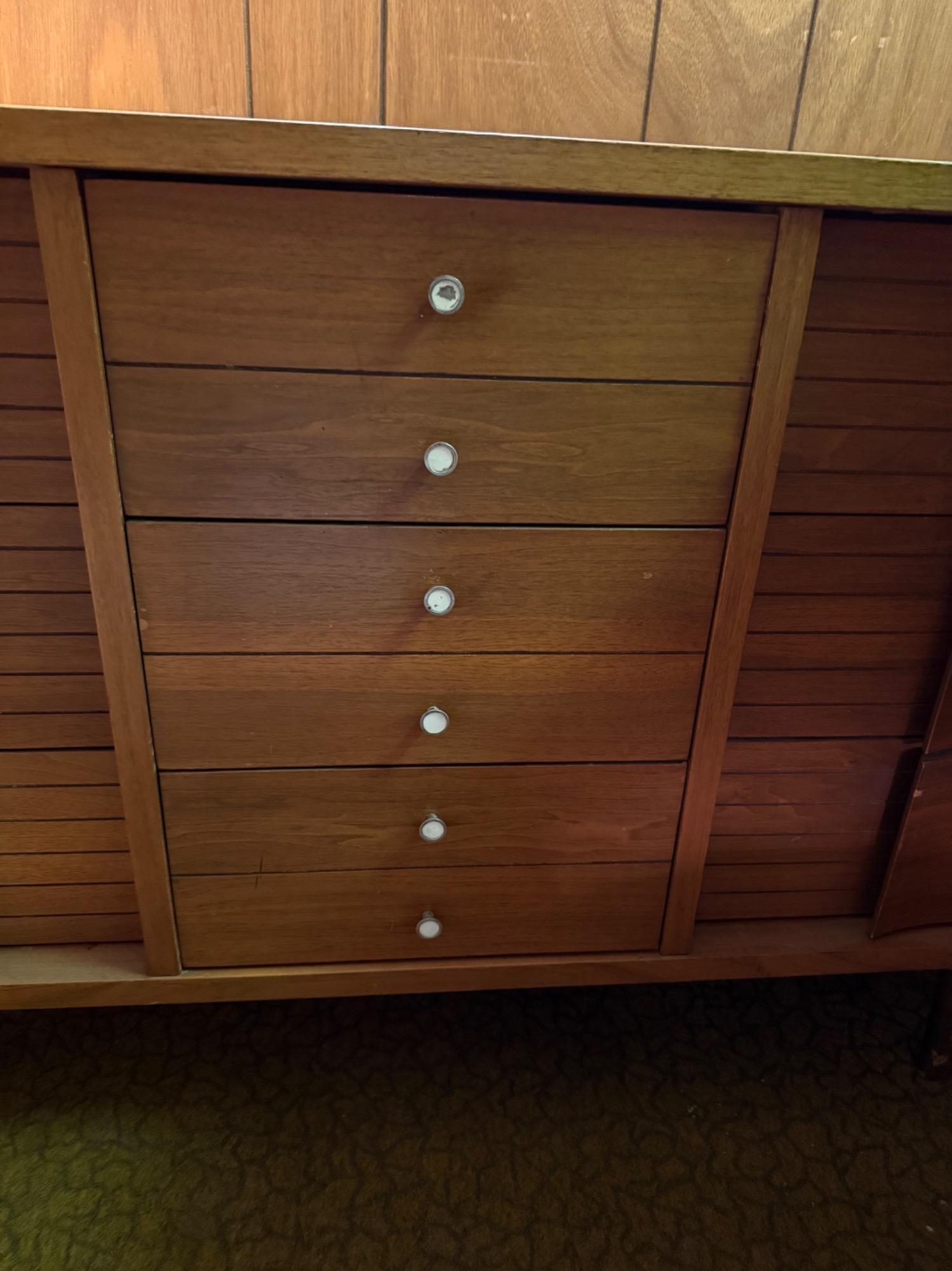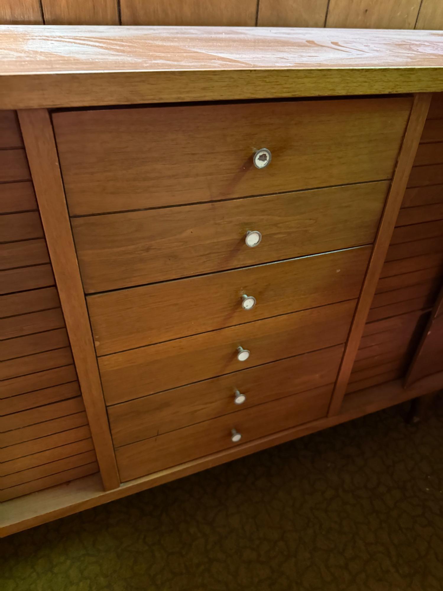 MCM Lowboy Dresser By Johnson Carper-9 Drawer This piece is all about style with sculptured lines and that cool Scandinavian flair. You'll find six roomy dovetailed drawers, each with oversized, raised concave faces that also act as curved drawer pulls. Between these drawers are three smaller drawers with unique white metal pulls, adding a decorative touch while providing ample storage. The top walnut plank boasts a laminate finish, while the rest of the dresser is embraced by a medium-toned walnut structure. It stands on classic Danish-style tapered legs, and four tapered feet lift the dresser 7 1/8" above the floor. This is definitely a fantastic mid-century modern piece worth checking out! Solid wood with laminate top credenza- 62.5 W x 17.5 D x 30 T There are some imperfections and scratches, please see pictures. Dove Tail Bellevue pick up only, we will call you with the address when the auction is over.
