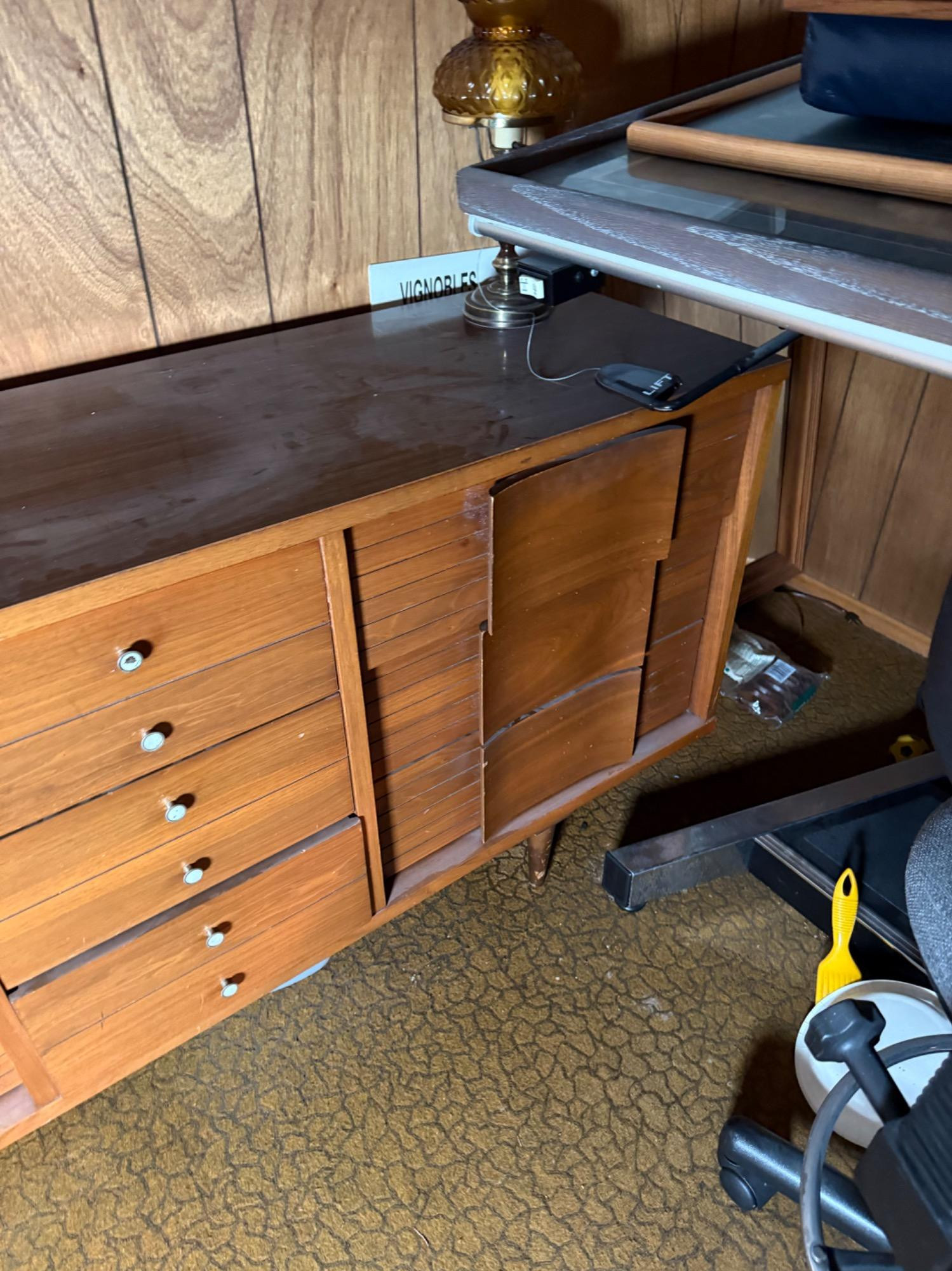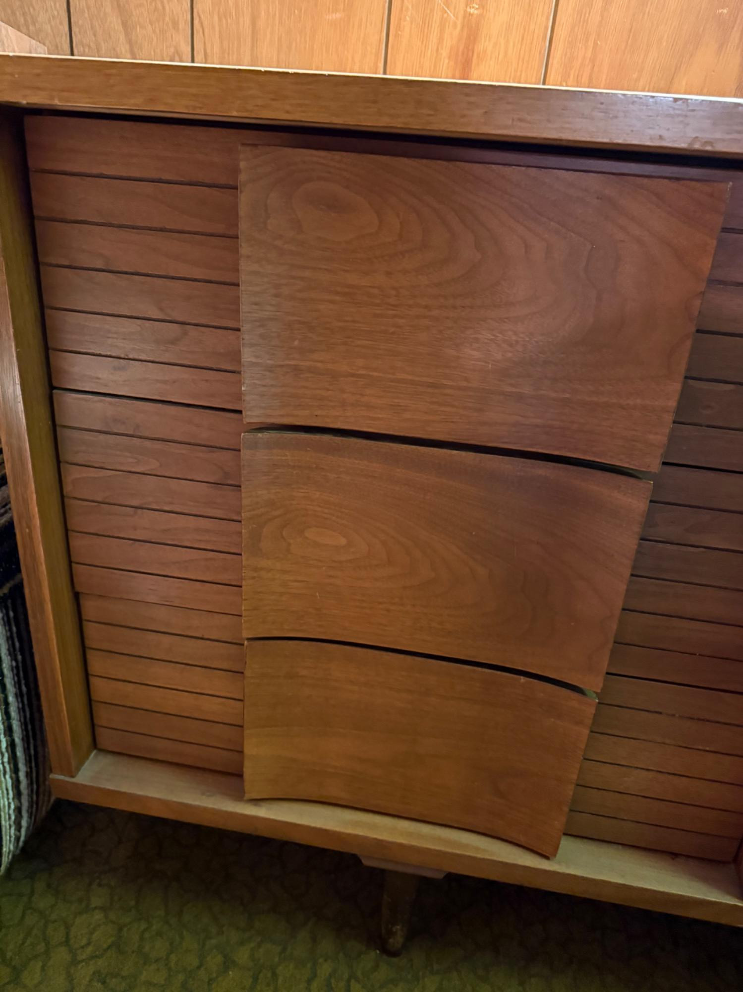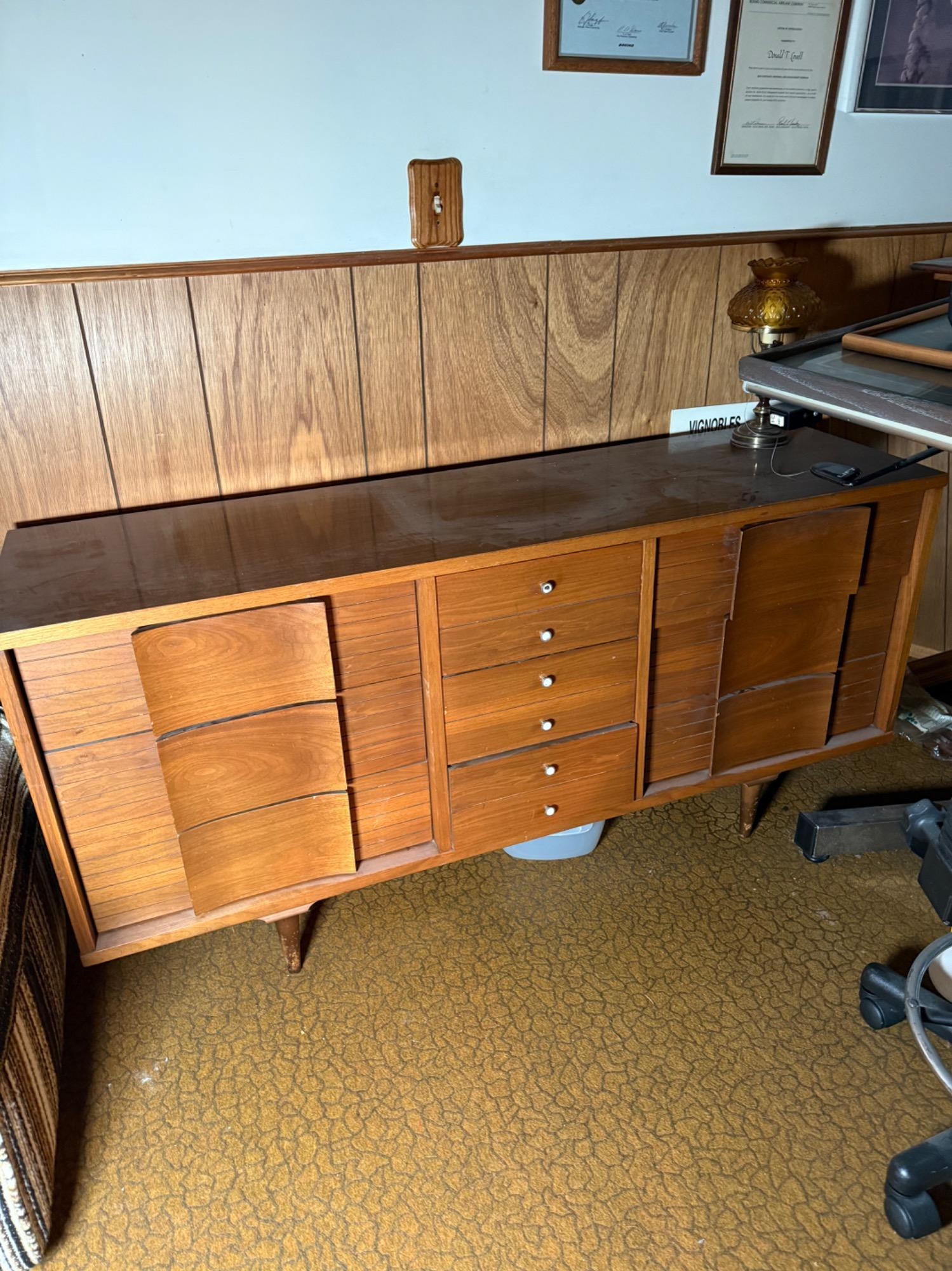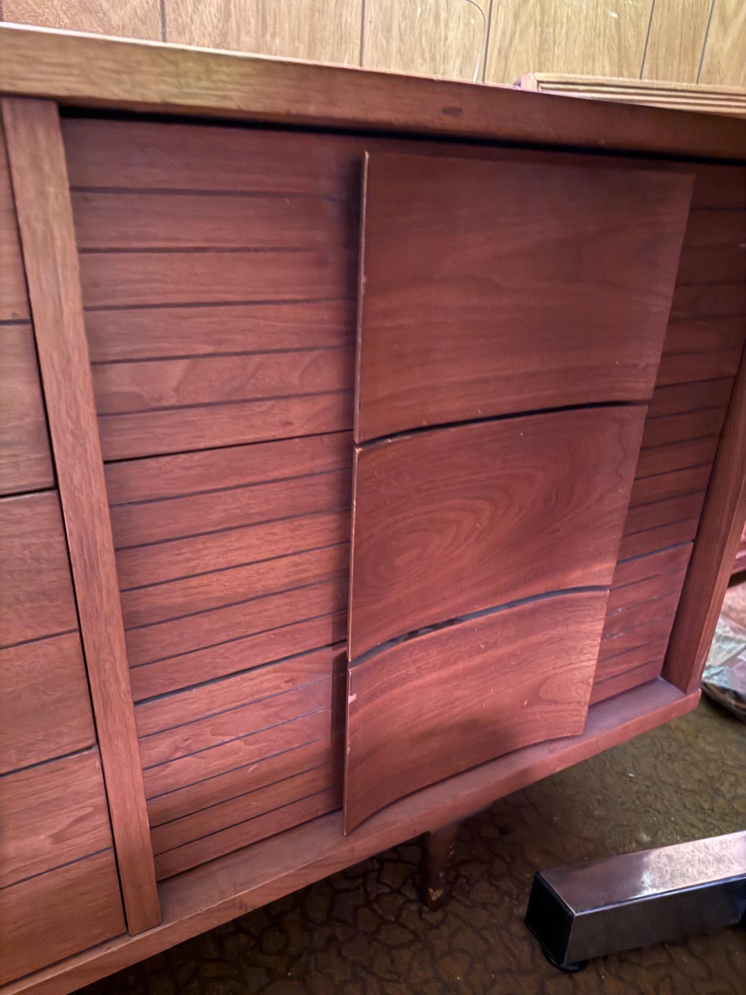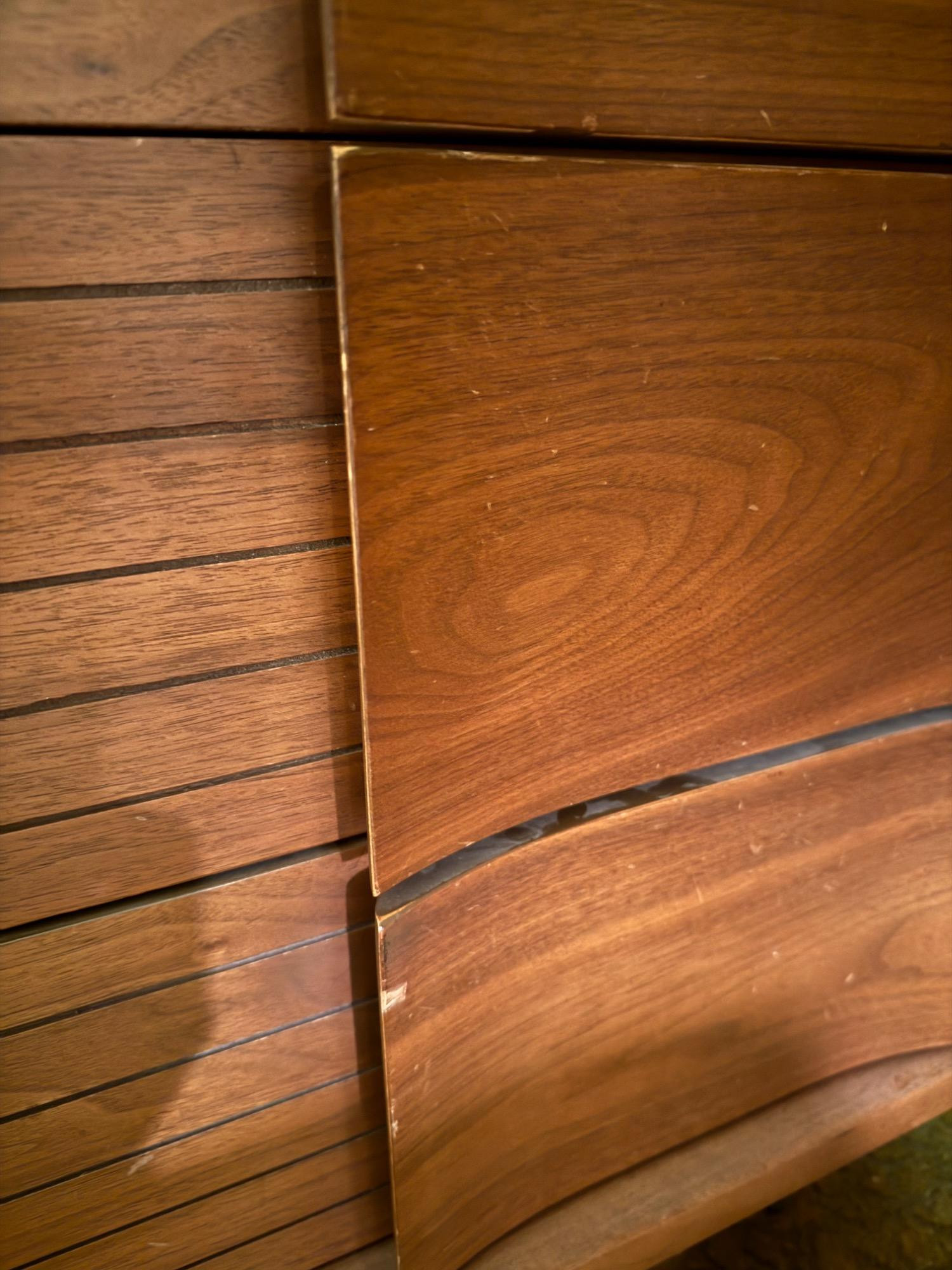 MCM Lowboy Dresser By Johnson Carper-9 Drawer This piece is all about style with sculptured lines and that cool Scandinavian flair. You'll find six roomy dovetailed drawers, each with oversized, raised concave faces that also act as curved drawer pulls. Between these drawers are three smaller drawers with unique white metal pulls, adding a decorative touch while providing ample storage. The top walnut plank boasts a laminate finish, while the rest of the dresser is embraced by a medium-toned walnut structure. It stands on classic Danish-style tapered legs, and four tapered feet lift the dresser 7 1/8" above the floor. This is definitely a fantastic mid-century modern piece worth checking out! Solid wood with laminate top credenza- 62.5 W x 17.5 D x 30 T There are some imperfections and scratches, please see pictures. Dove Tail Bellevue pick up only, we will call you with the address when the auction is over.
