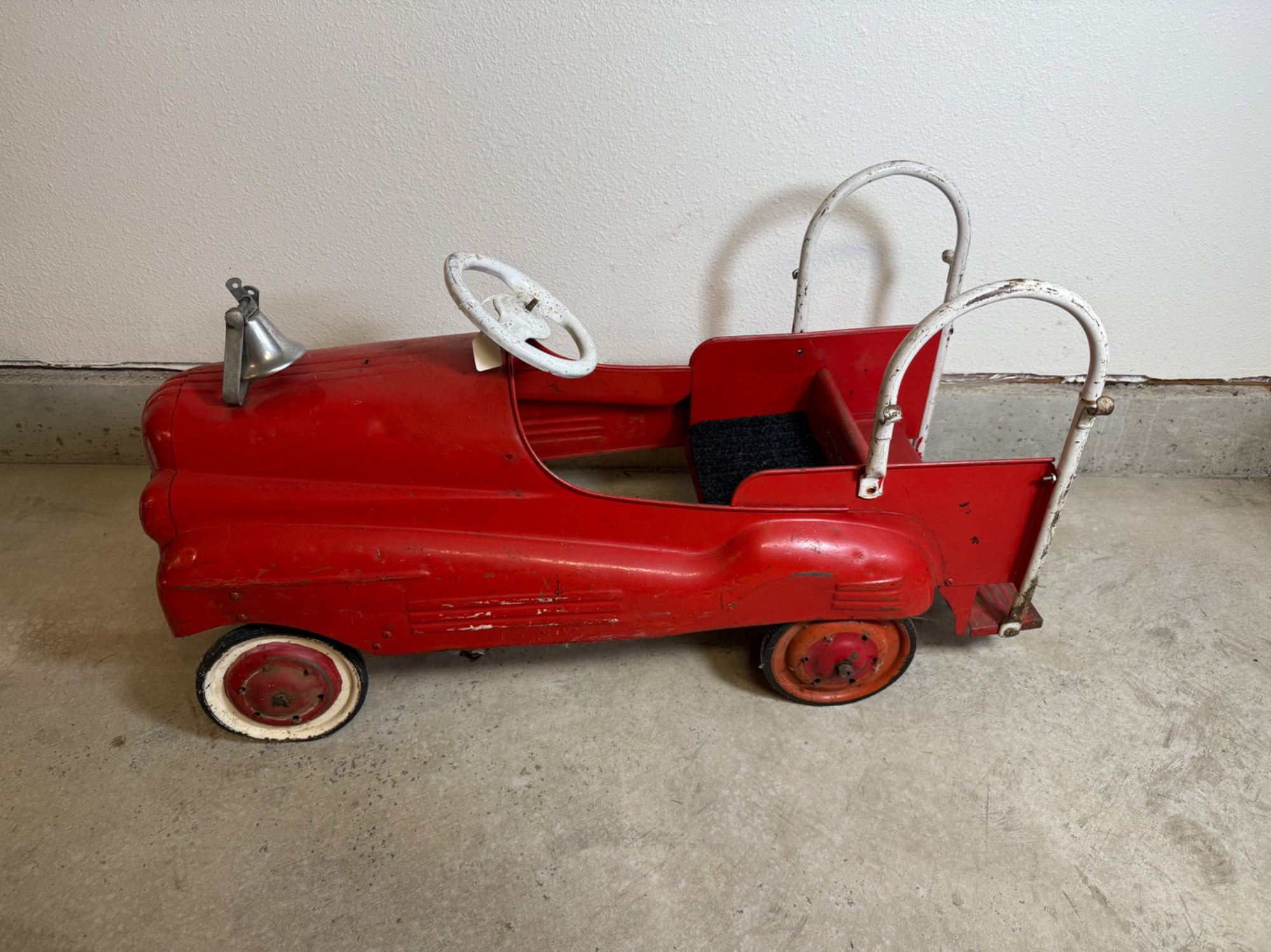 Vintage Murray pedal car. Child size fire truck. Some age and wear. Metal frame and rubber wheels. Missing ladder. Fire truck red paint is in pretty good condition considering age.