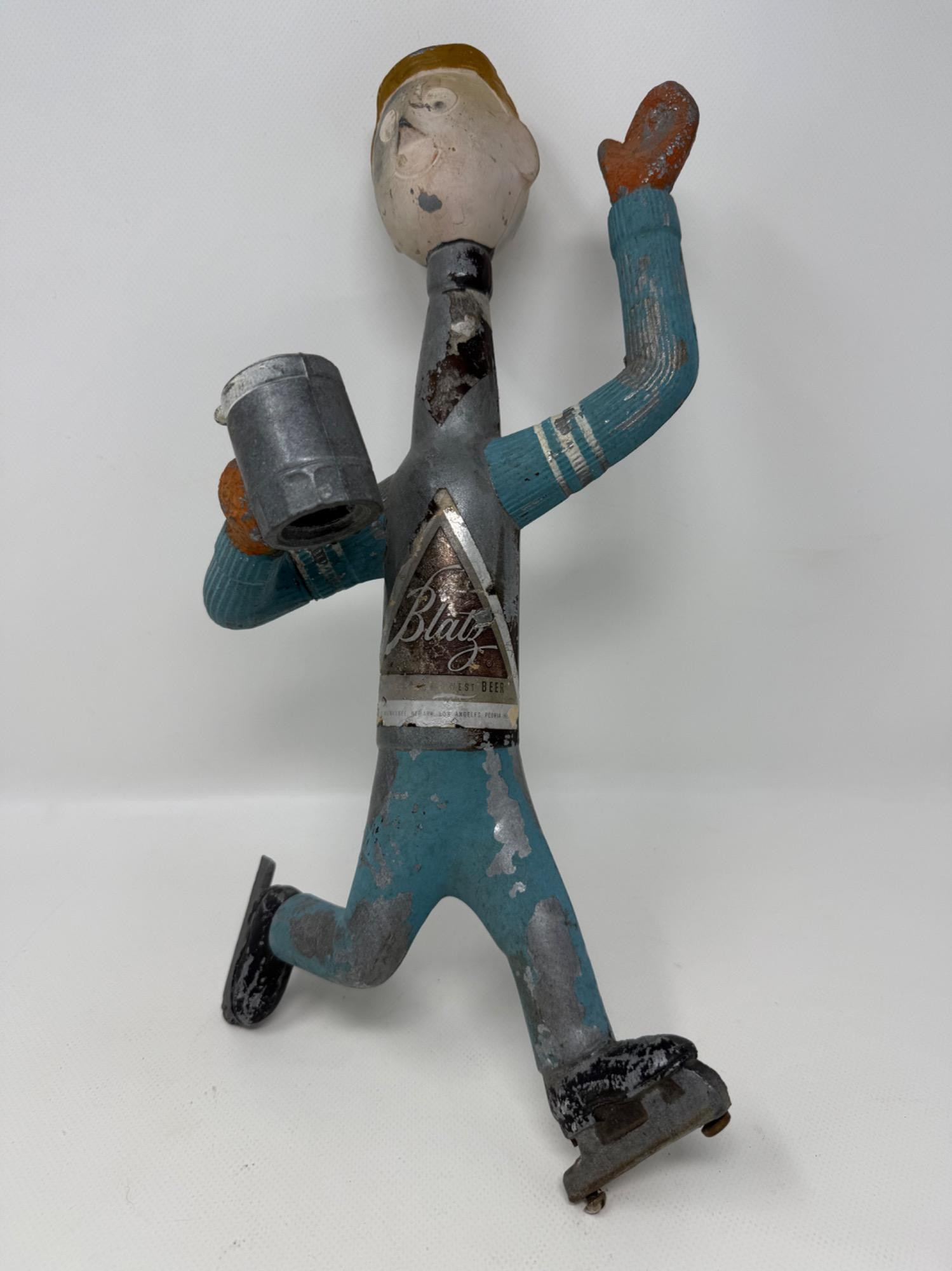 Heavy cast metal trademark character. Beer Blatz waiter on skates.