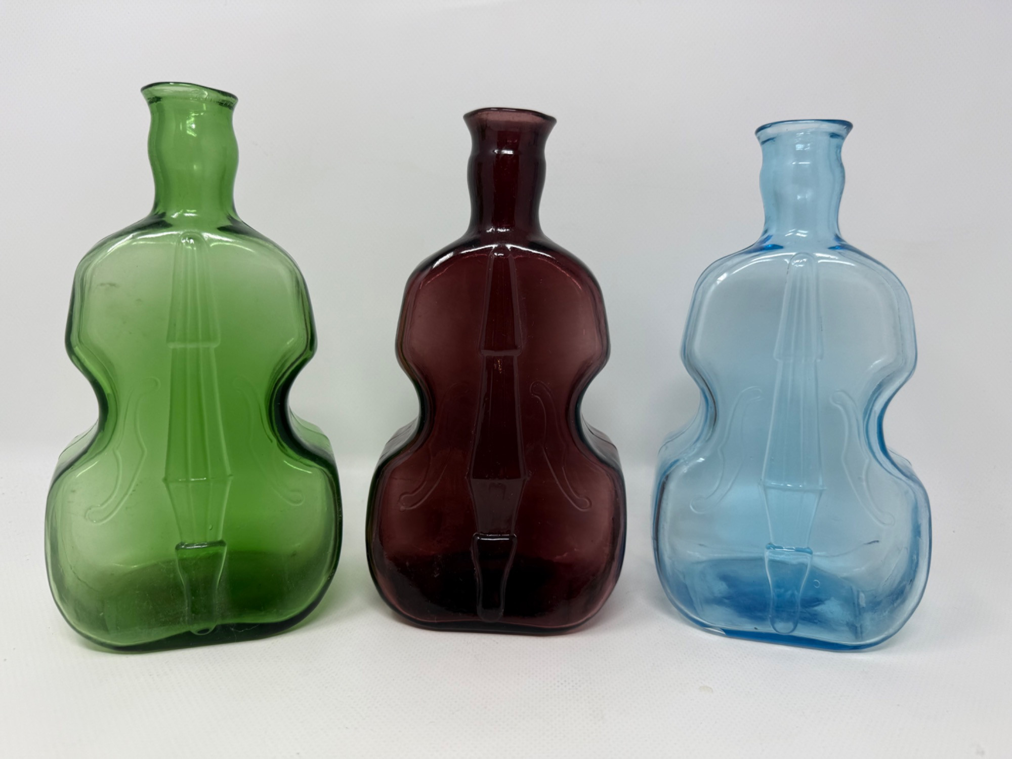 Large purple, green and Blue Violin Bottles. These are thick bodied bottles. Relief violin detail.