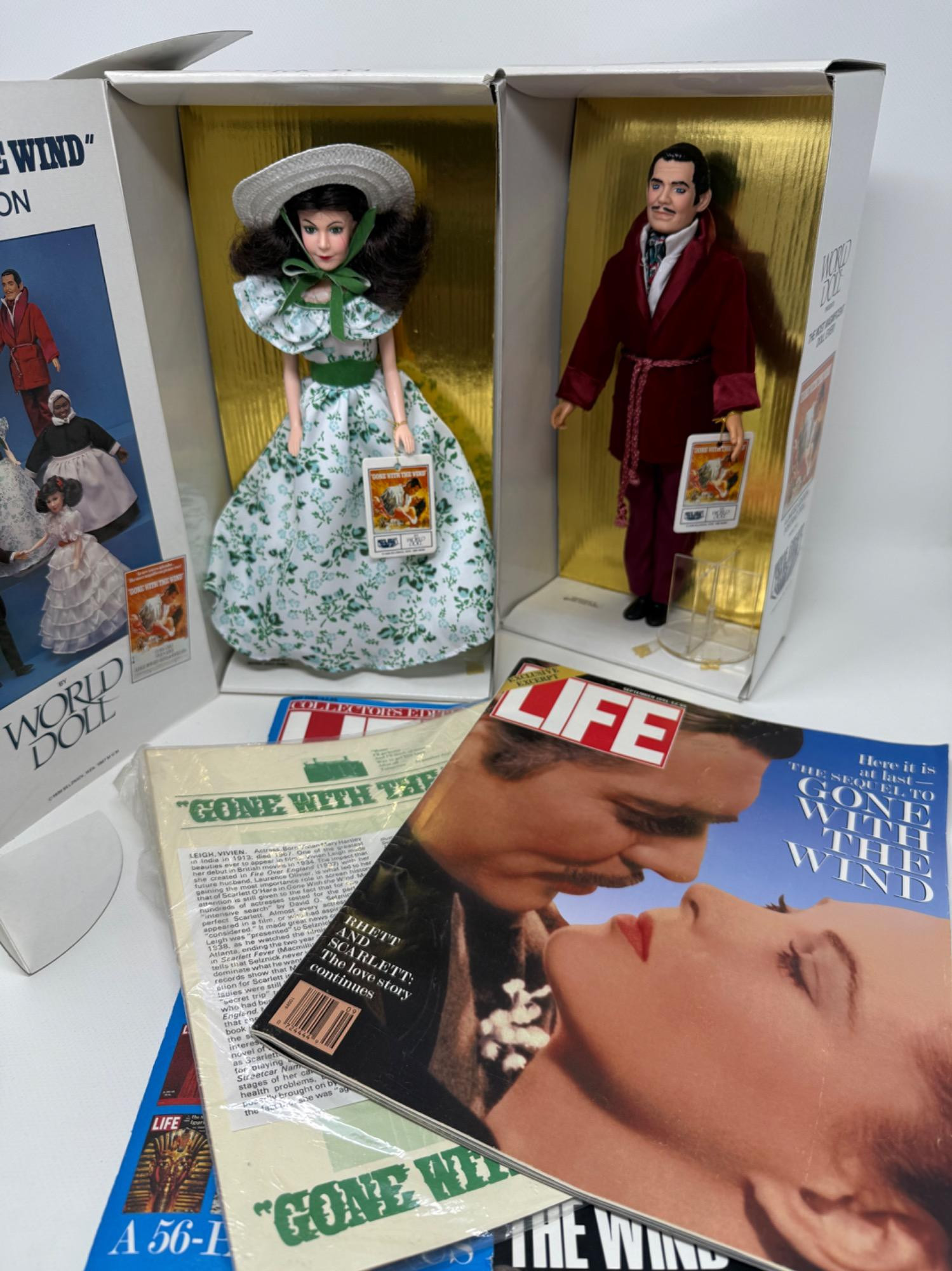 NIB-Gone With the Wind iconic characters Rhett and Scarlet Dolls. Boxes are in good condition. Life magazines with covers. Stationary sheets Includes stands